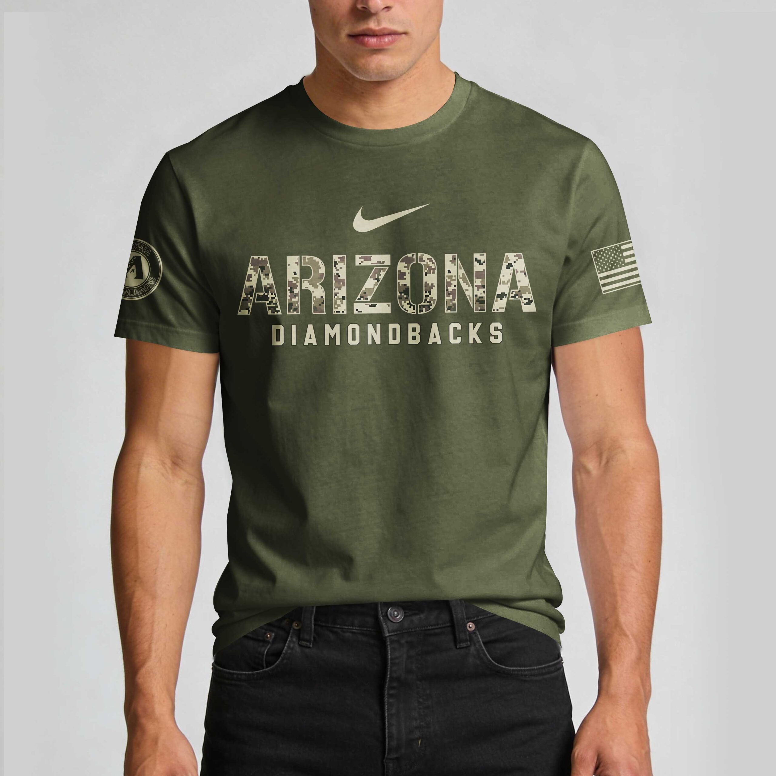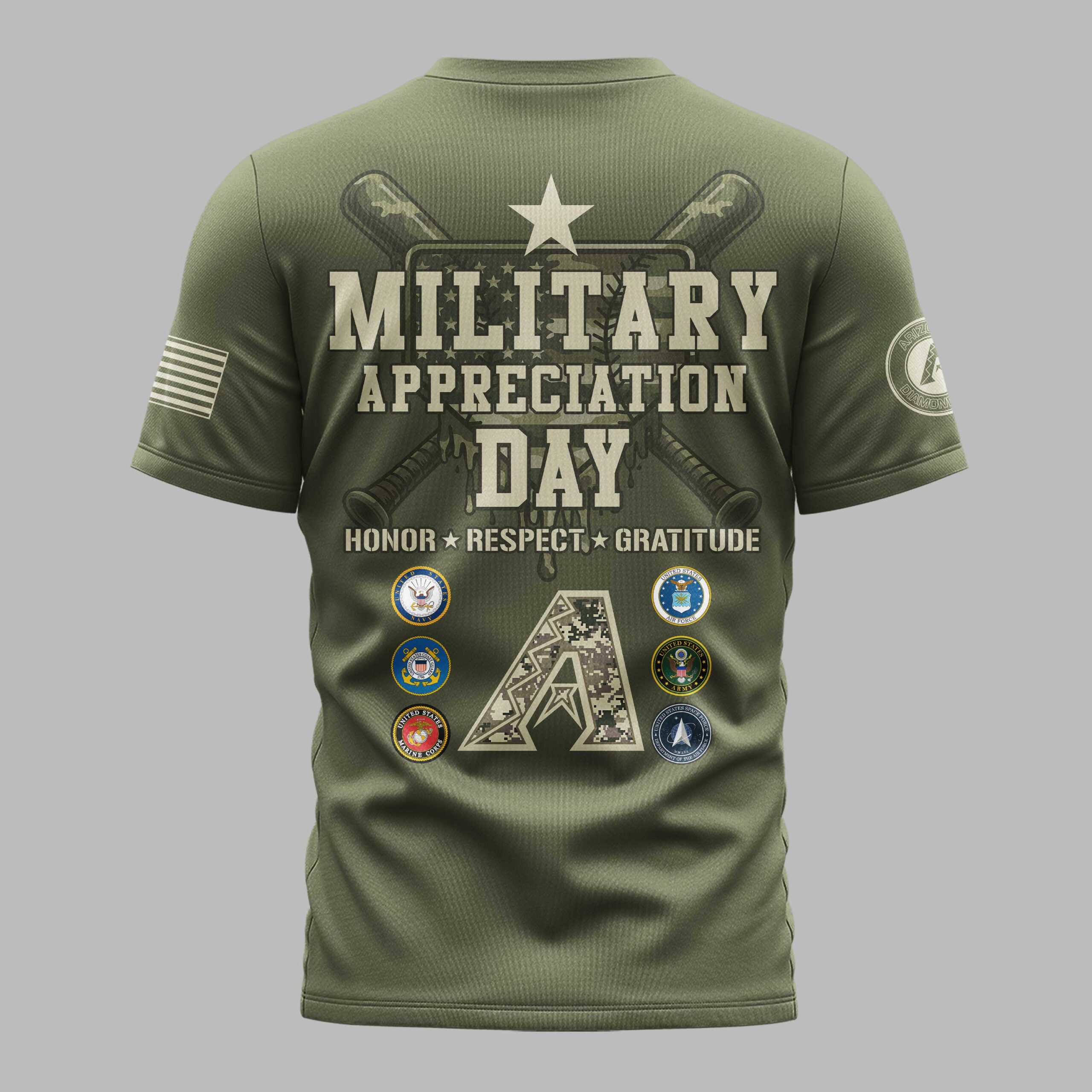 Show your unwavering support for both the Arizona Diamondbacks and our brave service members with this special Military Appreciation Day shirt. This unique design blends your love for baseball with a profound respect for those who defend our freedom, making a powerful statement on game day and beyond. The front proudly displays ARIZONA in a striking digital camouflage pattern, with DIAMONDBACKS below, alongside a bold American flag on the sleeve. Turn around to reveal an inspiring tribute on the back: MILITARY APPRECIATION DAY prominently featured with crossed baseball bats and a proud star. Below, HONOR * RESPECT * GRATITUDE is emblazoned above a large camouflage A logo, surrounded by the emblems of all six branches of the US Armed Forces. Perfect for cheering on the D-backs at the ballpark, attending patriotic events, or simply showcasing your dual pride in your team and country. Wear it to Memorial Day gatherings, Veterans Day celebrations, or any casual outing where you want to express your gratitude and team spirit.