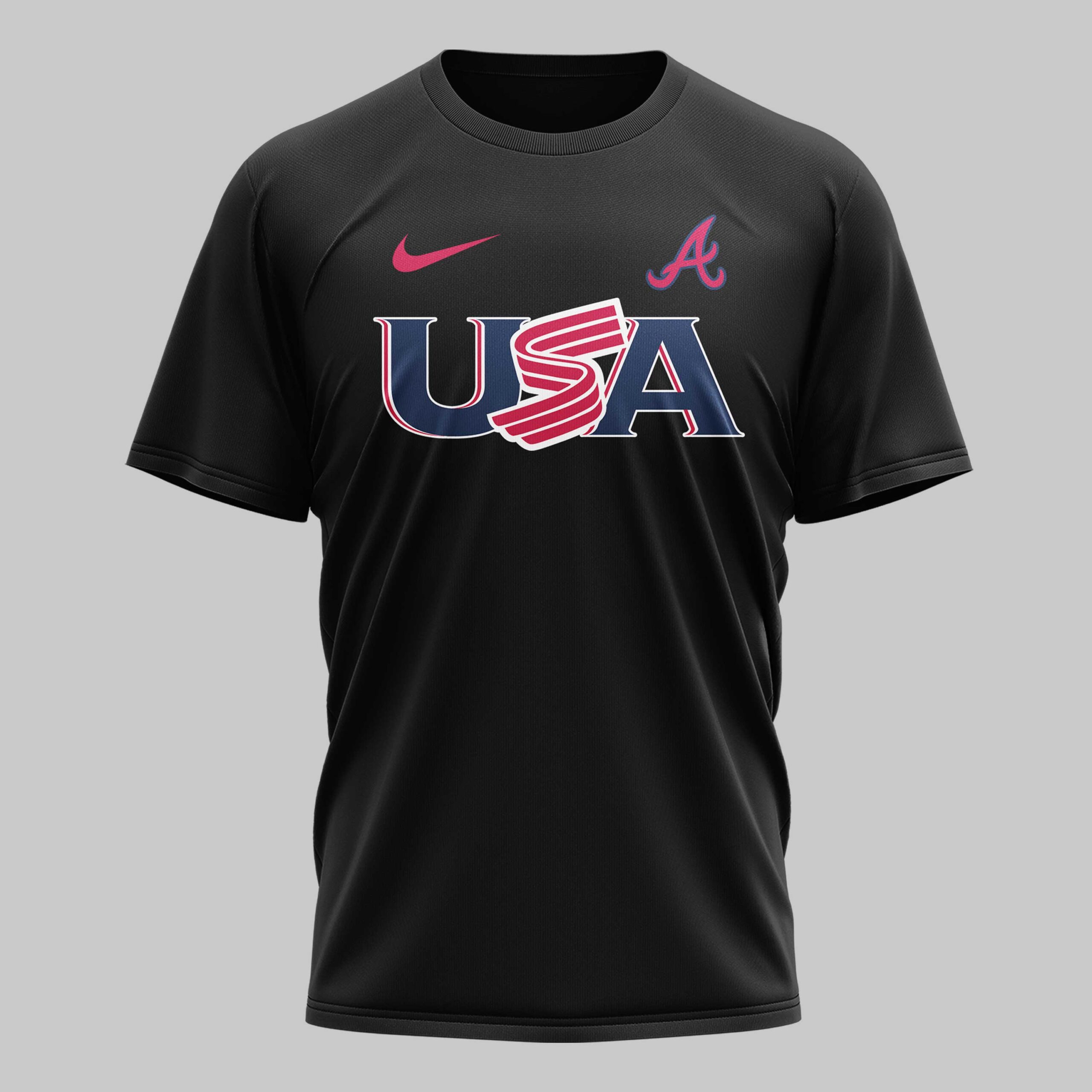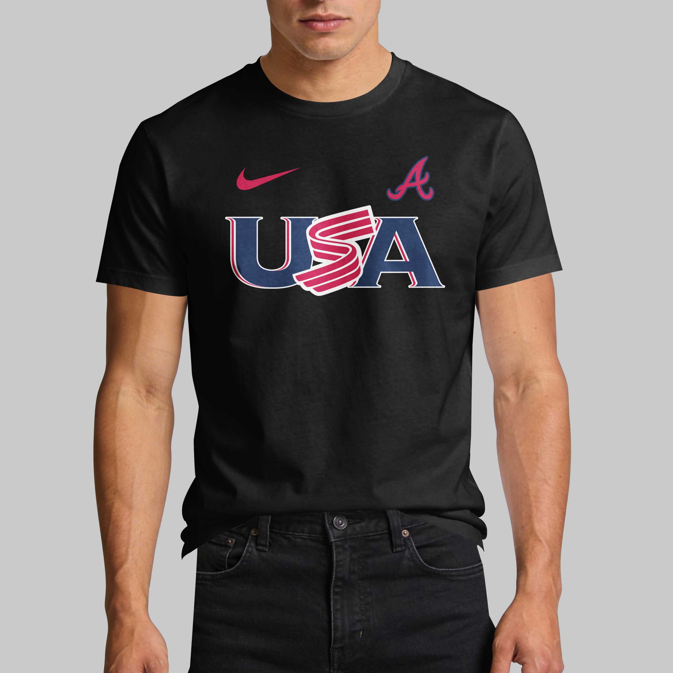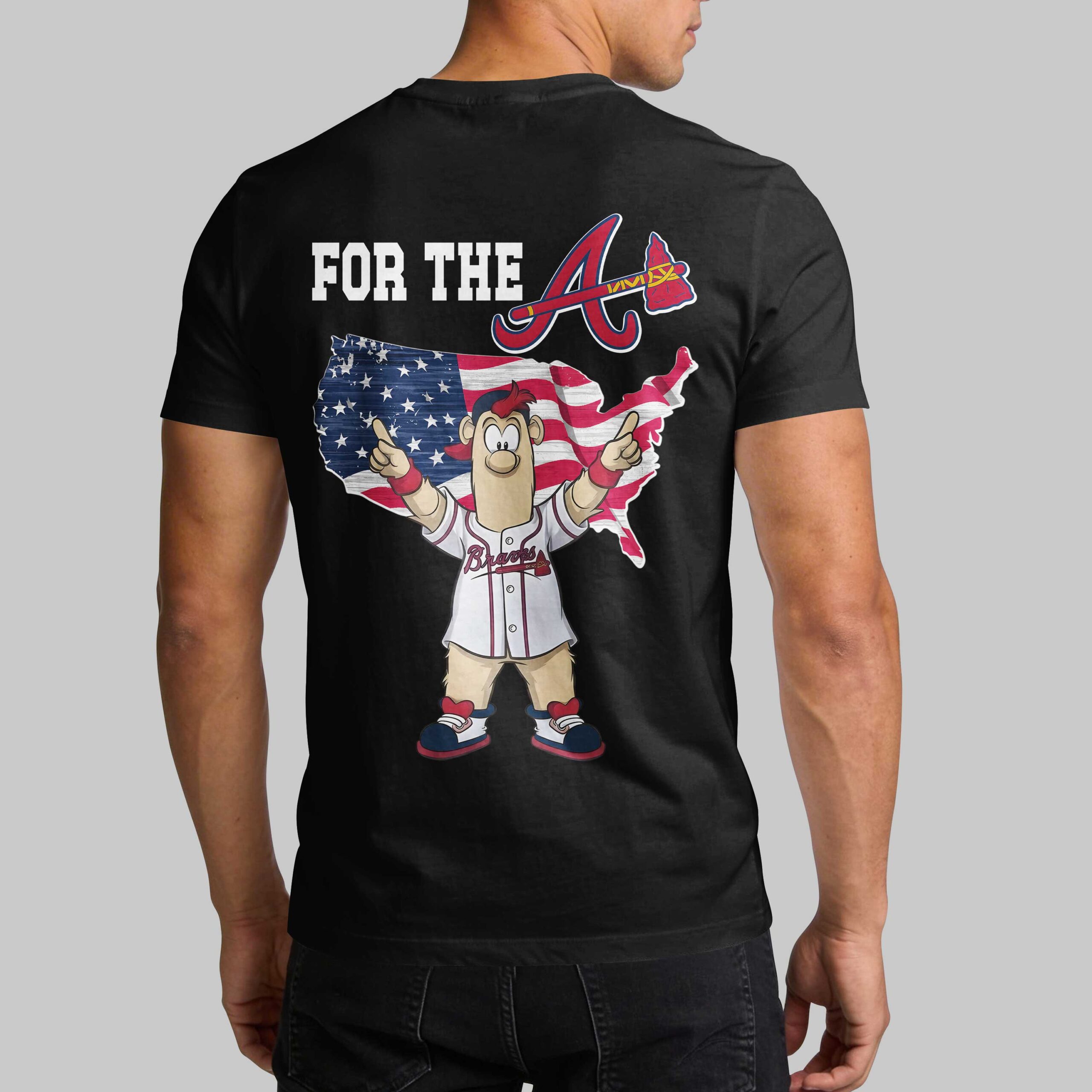 Celebrate your unwavering loyalty to the Atlanta Braves while honoring the American spirit. This striking black t-shirt is the ultimate way to showcase your dual pride for your favorite team and your country. Designed for the dedicated fan who lives for home runs and Independence Day celebrations, it captures the energetic pulse of Braves Country. The front features a bold USA graphic across the chest, complemented by the iconic Braves A logo and a sleek athletic swoosh. Turn it around to reveal a stunning back design headlined by the For the A slogan. A detailed map of the United States, filled with stars and stripes, serves as the backdrop for a spirited mascot character decked out in Braves gear, creating a truly unique visual statement. Whether you are cheering from the stands at the ballpark, hosting a summer cookout, or just hitting the streets, this shirt is your go-to gear. It’s a must-have piece for every fan looking to represent Atlanta with a patriotic twist.