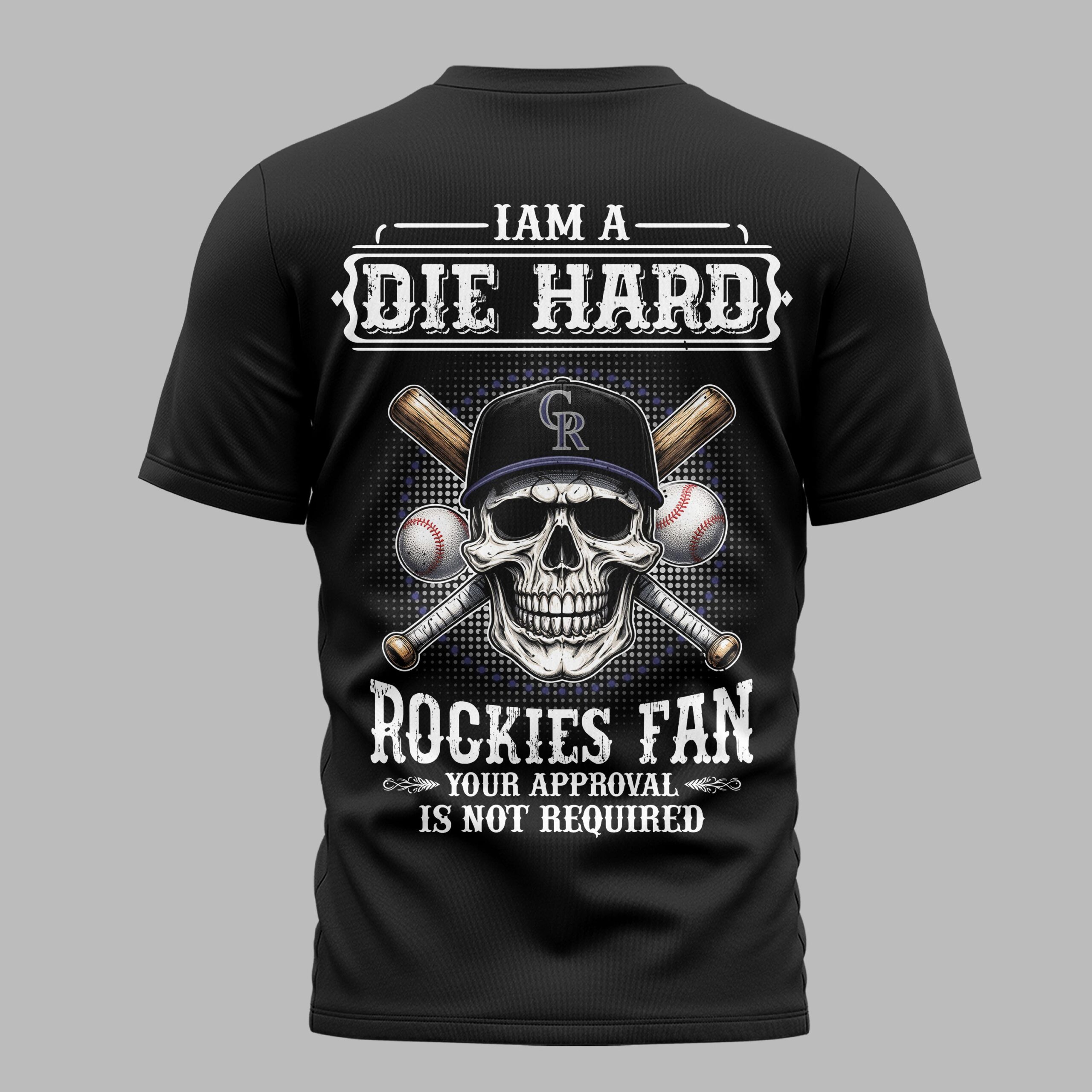 Show your unwavering devotion to the Colorado Rockies with this bold Die Hard fan tee! This shirt is for those who live and breathe Rockies baseball, cheering them on through every pitch and every inning. It’s more than just apparel; it’s a declaration of your steadfast loyalty to your favorite MLB team, a true testament to your spirit as a dedicated fan. The design features a fierce skull sporting a classic baseball cap with the iconic CR logo, flanked by crossed bats and baseballs, proudly displayed on the back. The powerful message I AM A DIE HARD ROCKIES FAN – YOUR APPROVAL IS NOT REQUIRED leaves no doubt about your allegiance. A smaller, equally striking version of the skull and crossed bats graphic adorns the front, completing this assertive fan statement. Perfect for game days at Coors Field, watch parties with fellow fans, or just showing off your team pride around town. This tee is your go-to choice for making a statement about your love for the Colorado Rockies, anytime and anywhere. Wear it loud and wear it proud, because true fandom needs no permission.