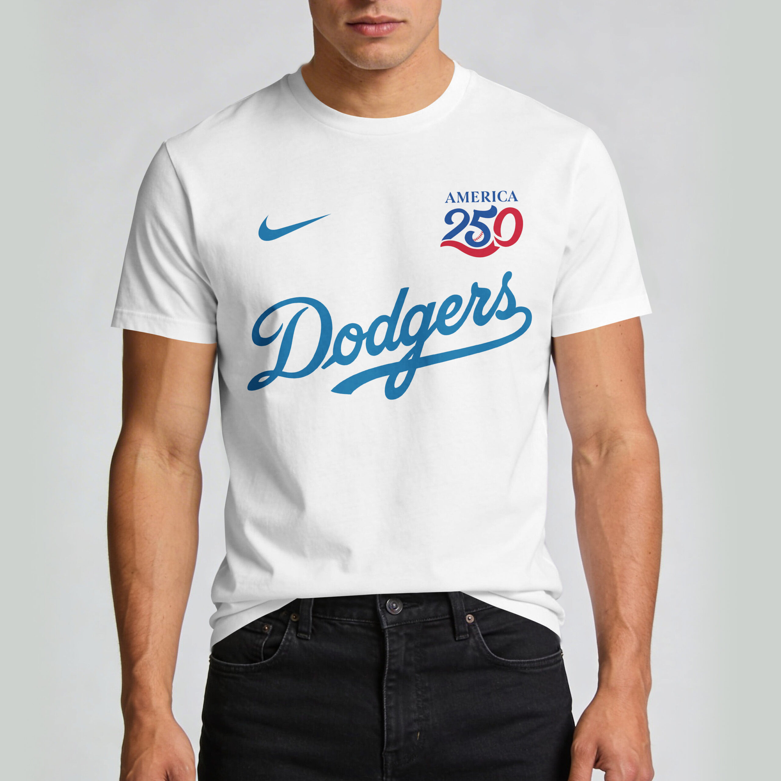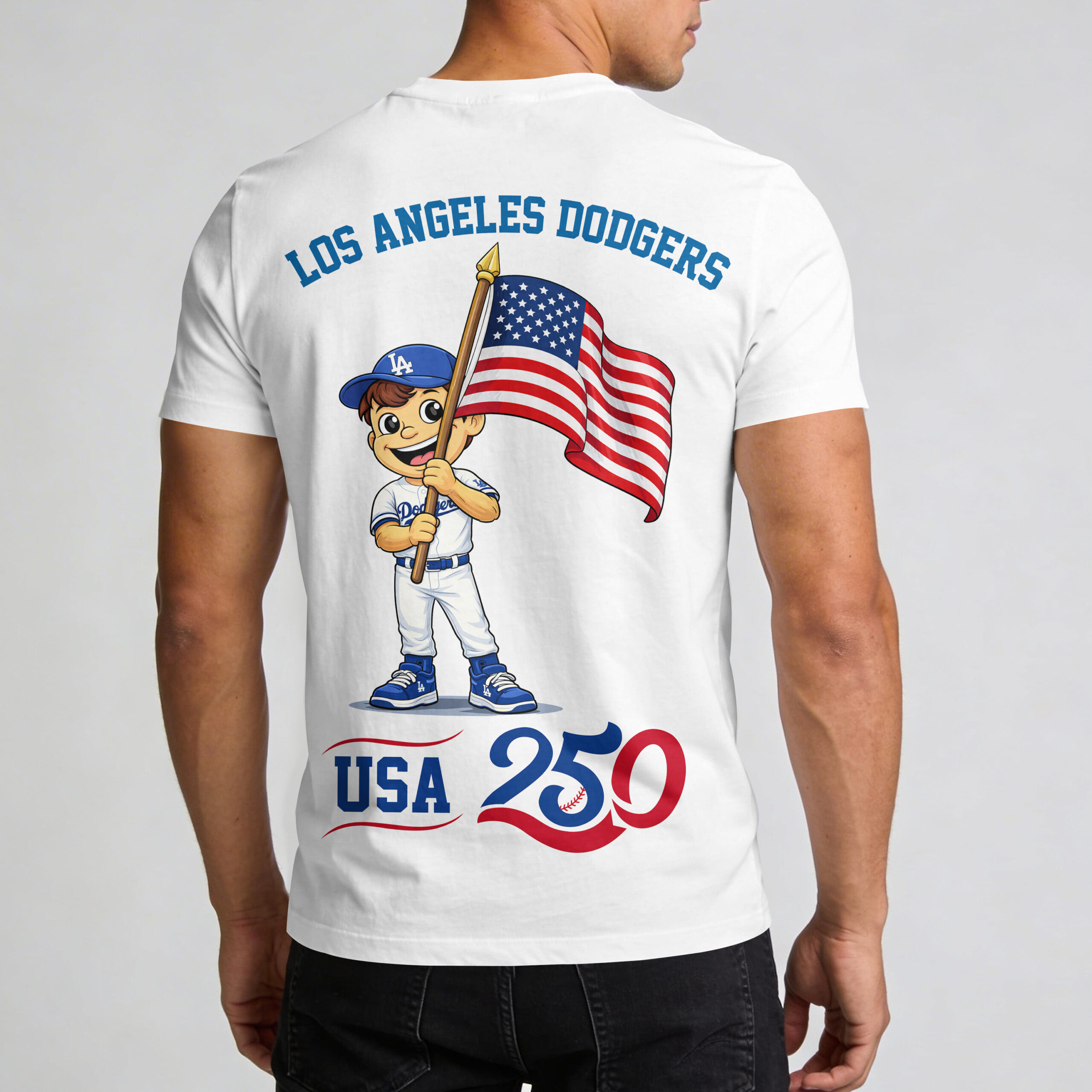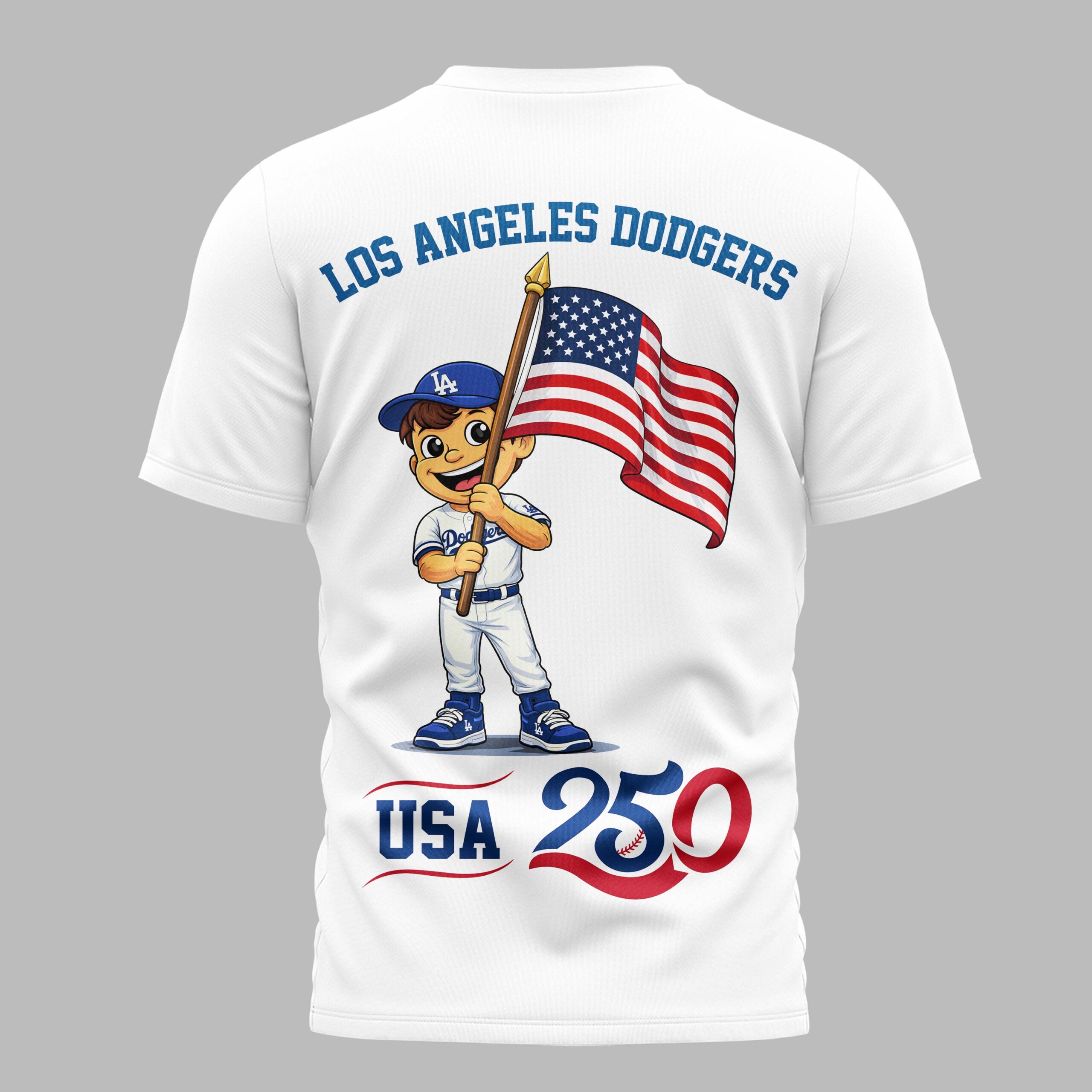 Unleash your Los Angeles Dodgers pride and patriotic spirit with this exclusive USA 250 Independence T-shirt! It’s the ultimate way to celebrate your favorite team and America’s 250th anniversary. Proudly display your deep American roots and unwavering baseball devotion. The front spotlights the iconic Dodgers script logo in bold blue, paired with the special AMERICA 250 design, subtly integrating a baseball seam. The back boasts an energetic cartoon Dodgers mascot, in full team gear, proudly waving the American flag. LOS ANGELES DODGERS arches above, with a vibrant USA 250 graphic completing the patriotic baseball theme. Perfect for Dodger Stadium game days, Independence Day celebrations, or casual wear, this T-shirt is a must-have for every dedicated fan. Represent your team and country with pride, anytime and anywhere.