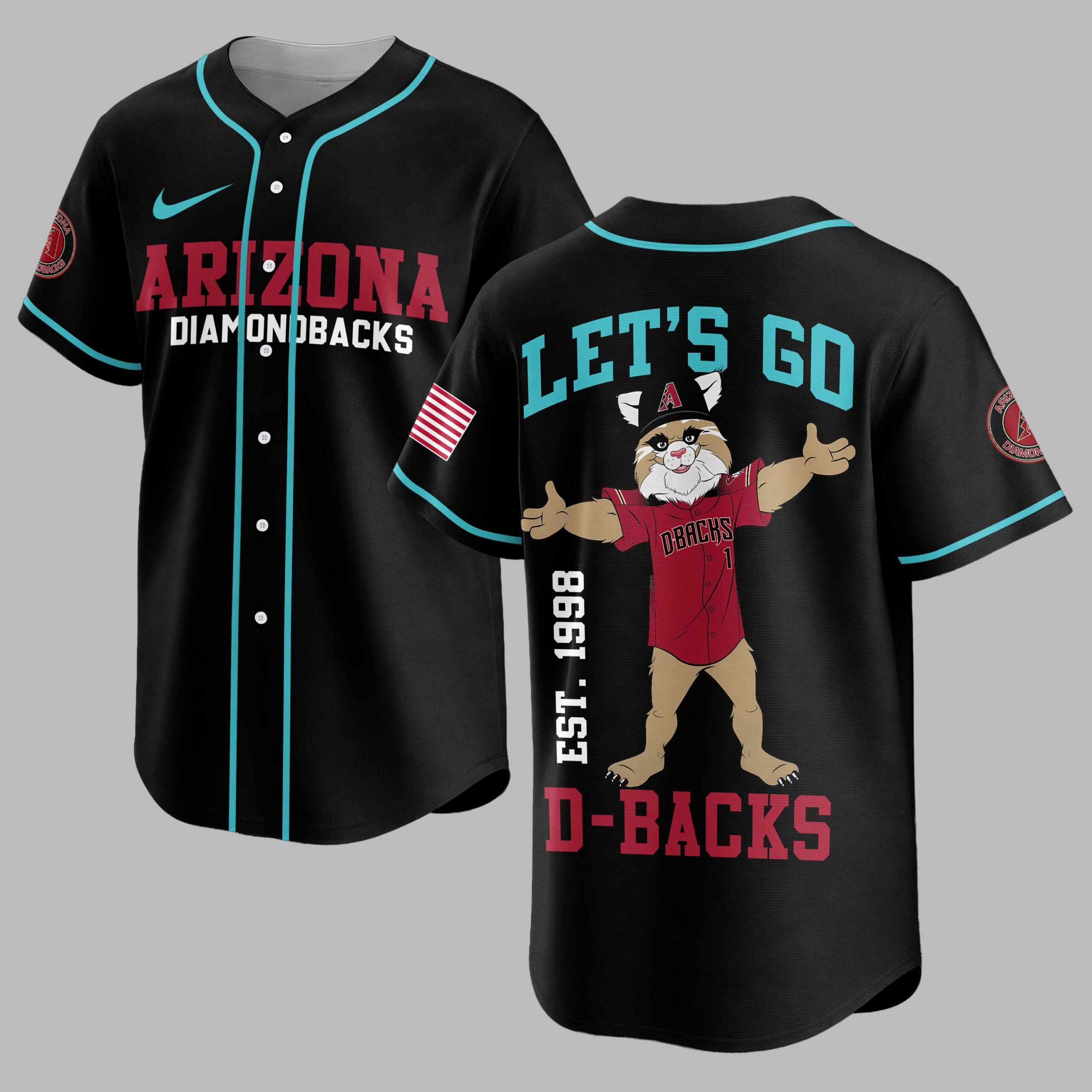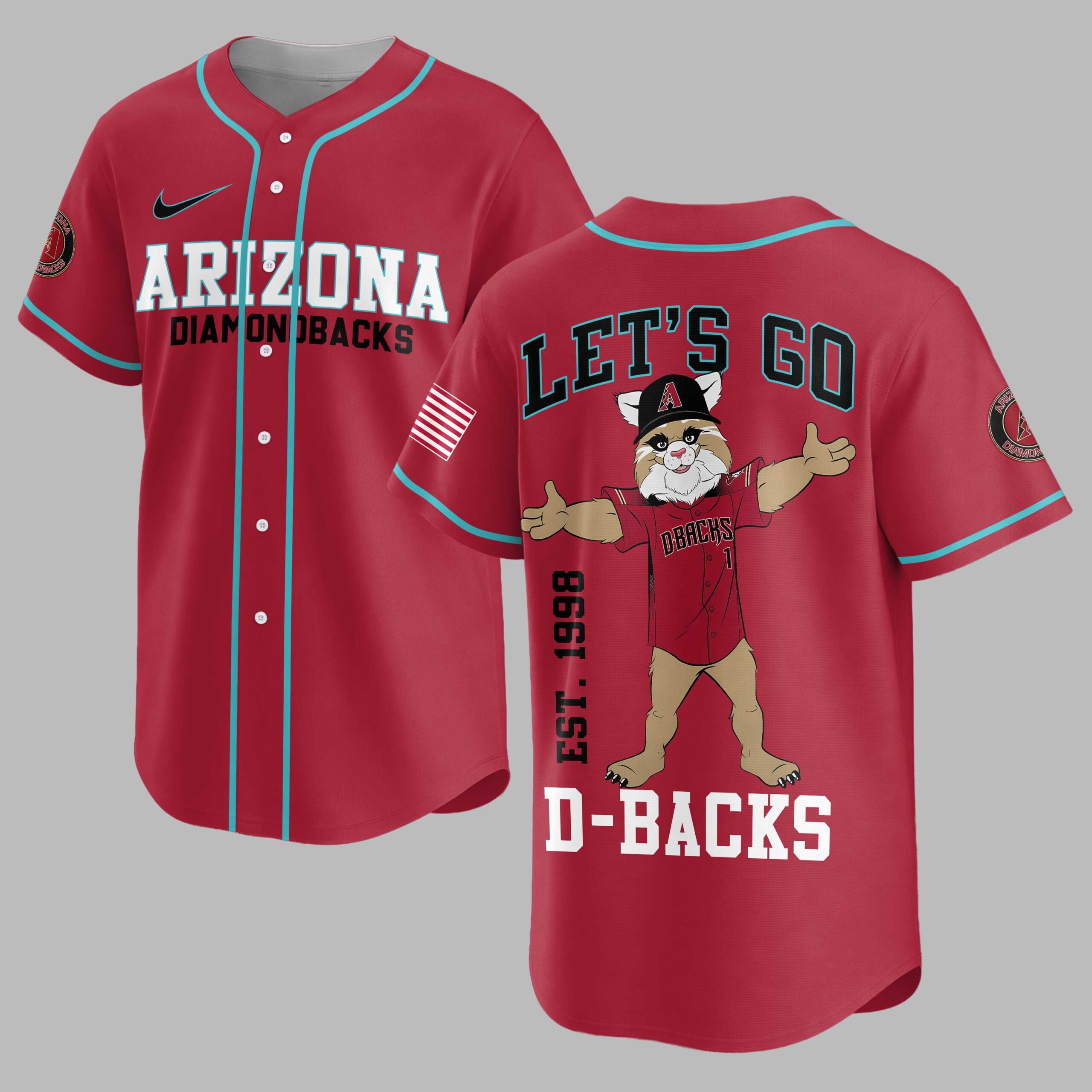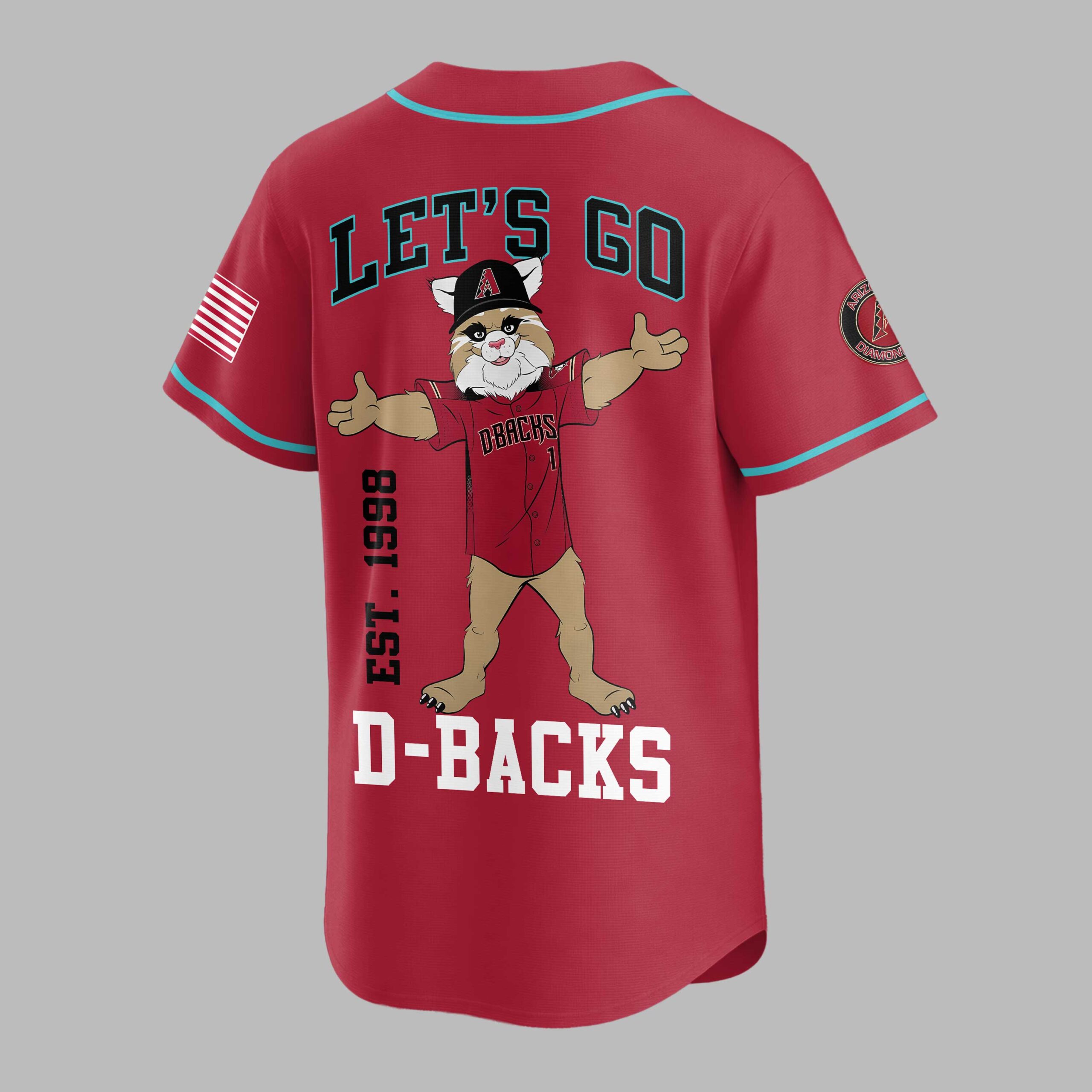 Rally behind your favorite team with this vibrant Arizona Diamondbacks fan jersey, designed for true D-Backs faithful! Celebrate every hit, run, and win with a shirt that screams team pride. This spirited jersey embodies the energetic atmosphere of game day and the enduring legacy of the Arizona Diamondbacks. The front of the jersey boldly features ARIZONA DIAMONDBACKS in distinctive red and black lettering, highlighted with cool teal accents. A proud team logo patch adorns the left sleeve, complemented by an American flag design on the right. The back makes a powerful statement with a lively graphic of the D-Backs mascot, D. Baxter, arms outstretched, beneath the enthusiastic LET’S GO message. EST. 1998 runs vertically alongside, with D-BACKS prominently displayed below. Whether you’re catching a game at Chase Field, hosting a watch party, or just heading out for the day, this jersey is the perfect way to display your loyalty. It’s an essential piece for any fan looking to show their support and cheer on the Diamondbacks with passion and style.