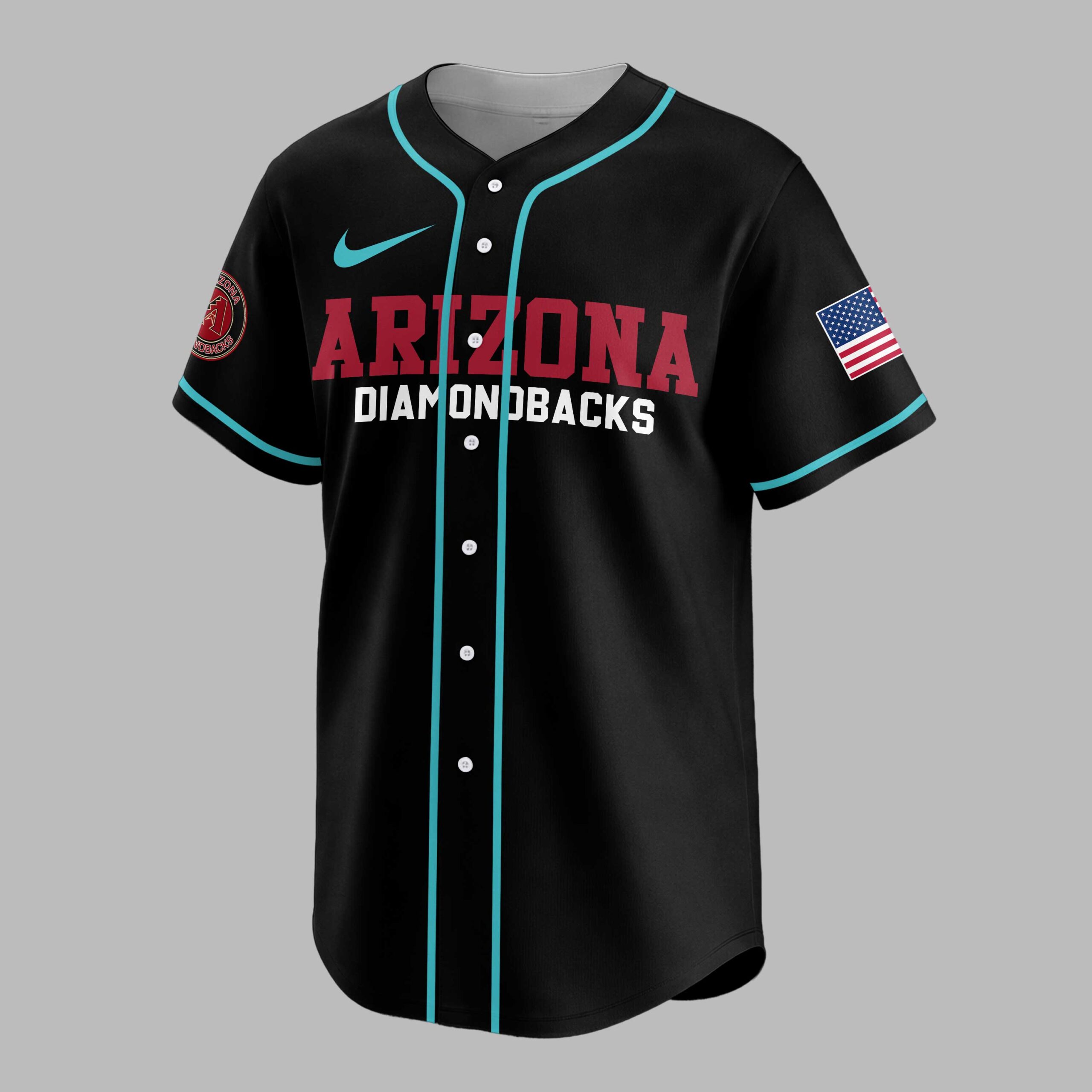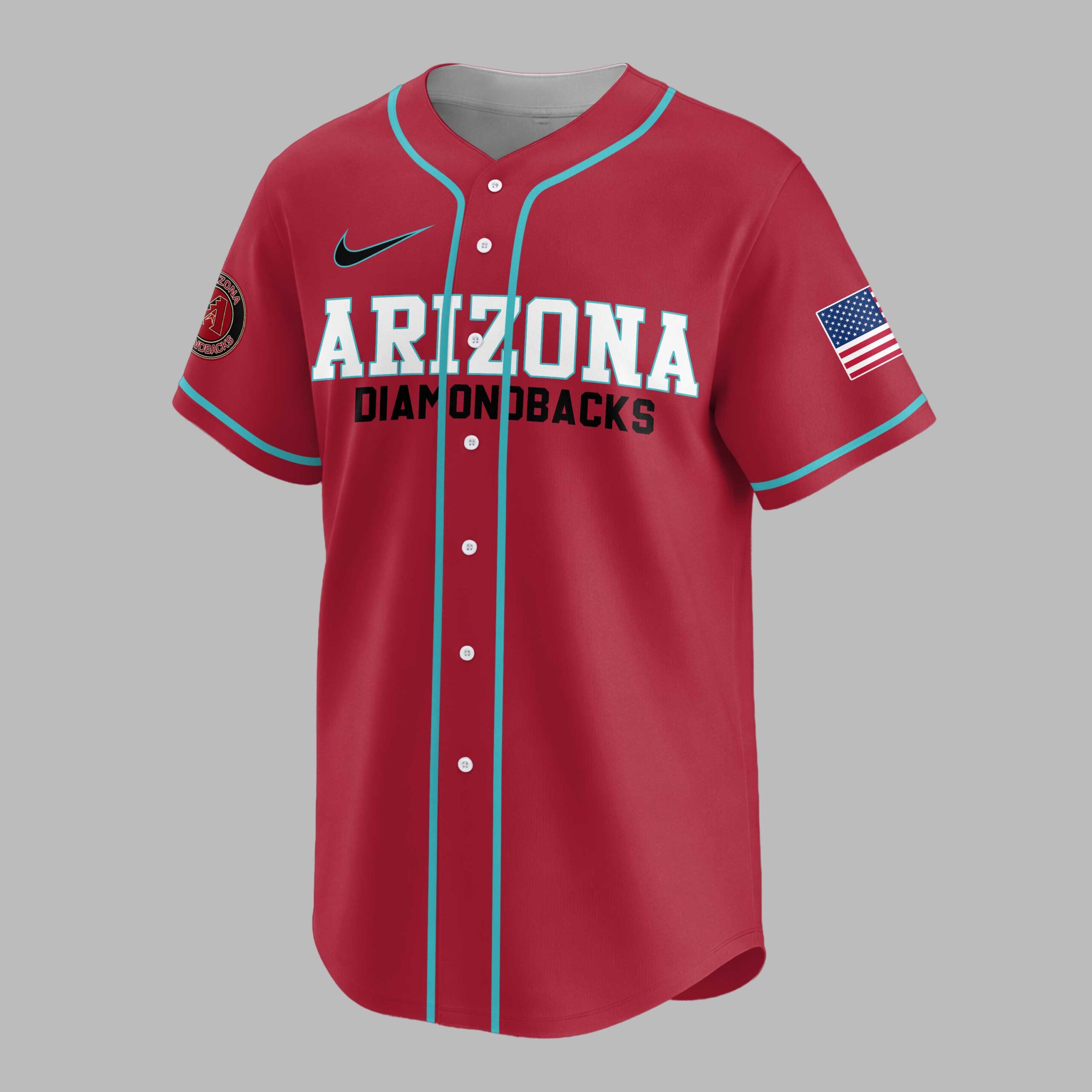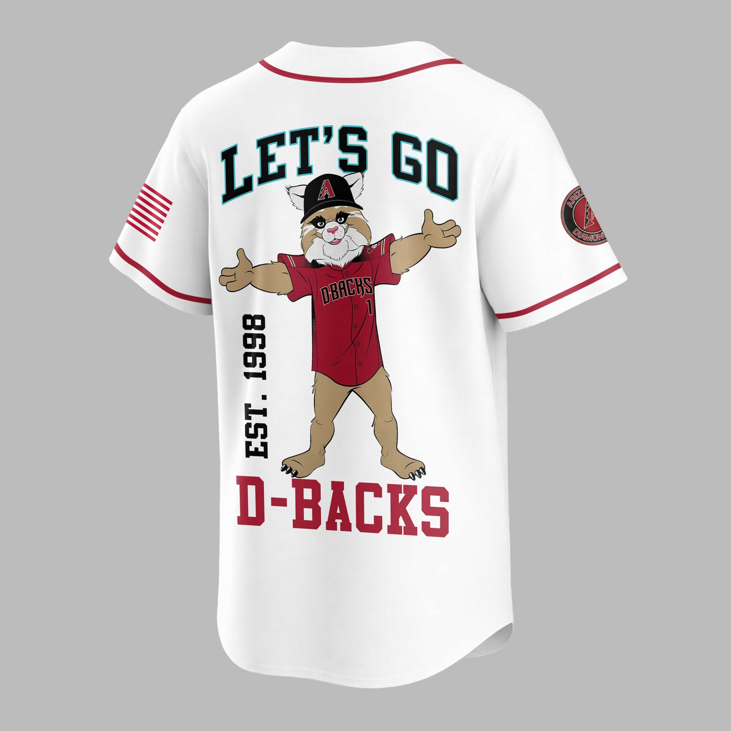 Rally behind your favorite team with this vibrant Arizona Diamondbacks fan jersey, designed for true D-Backs faithful! Celebrate every hit, run, and win with a shirt that screams team pride. This spirited jersey embodies the energetic atmosphere of game day and the enduring legacy of the Arizona Diamondbacks. The front of the jersey boldly features ARIZONA DIAMONDBACKS in distinctive red and black lettering, highlighted with cool teal accents. A proud team logo patch adorns the left sleeve, complemented by an American flag design on the right. The back makes a powerful statement with a lively graphic of the D-Backs mascot, D. Baxter, arms outstretched, beneath the enthusiastic LET’S GO message. EST. 1998 runs vertically alongside, with D-BACKS prominently displayed below. Whether you’re catching a game at Chase Field, hosting a watch party, or just heading out for the day, this jersey is the perfect way to display your loyalty. It’s an essential piece for any fan looking to show their support and cheer on the Diamondbacks with passion and style.