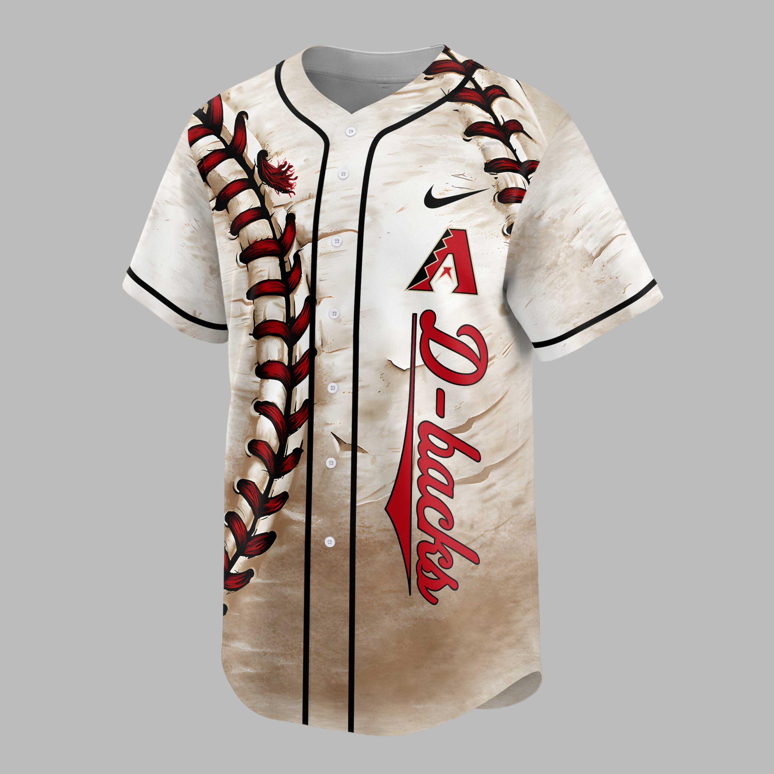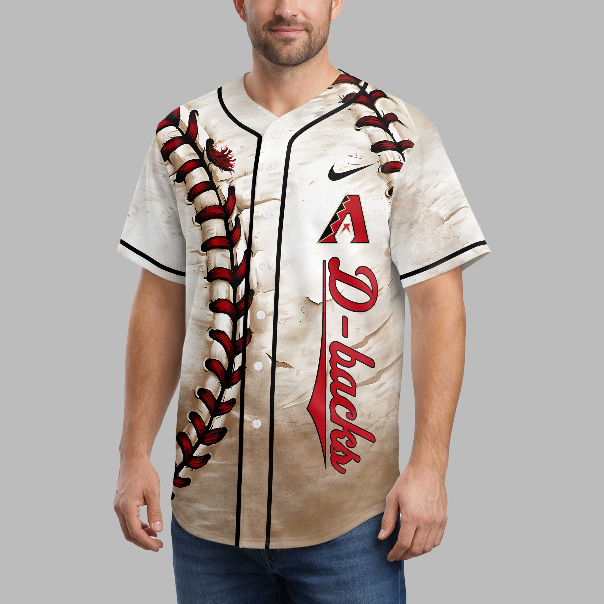 Step up to the plate in style with this personalized Arizona D-backs baseball jersey, designed for the fan who truly embodies team spirit. It blends classic baseball aesthetics with a personal touch, making it the ultimate way to showcase your unwavering support. The front features striking red baseball lacing artwork down the side, perfectly complementing the bold, distressed D-backs lettering. The back allows for full personalization with Your Name in an elegant script above your chosen numbers, each designed with authentic baseball stitching, all against a weathered, vintage-inspired backdrop. Perfect for cheering from the stands, hosting a game day, or enjoying a casual day out, this custom D-backs jersey is a grand slam. It’s a stylish statement of your dedication to the game and your favorite team.