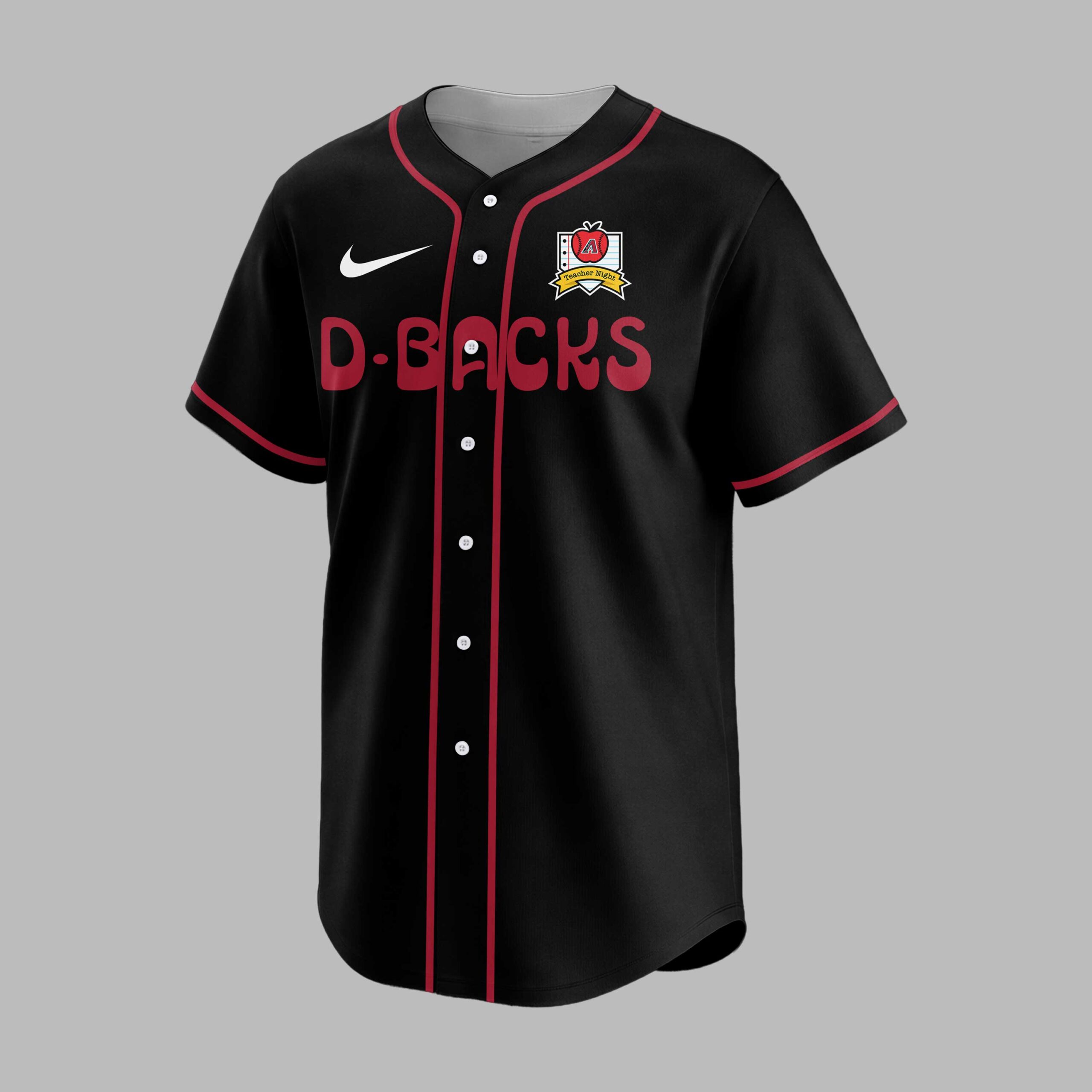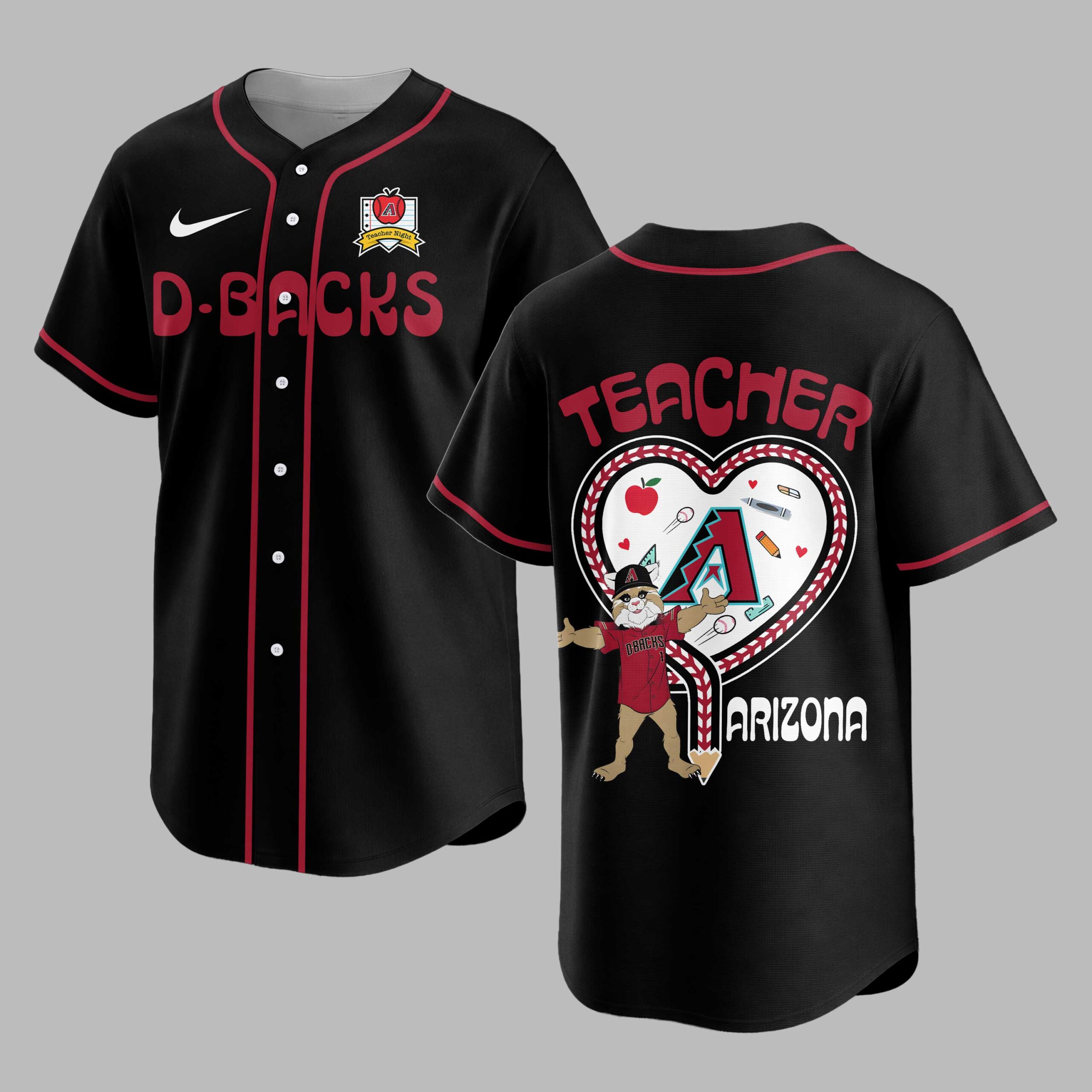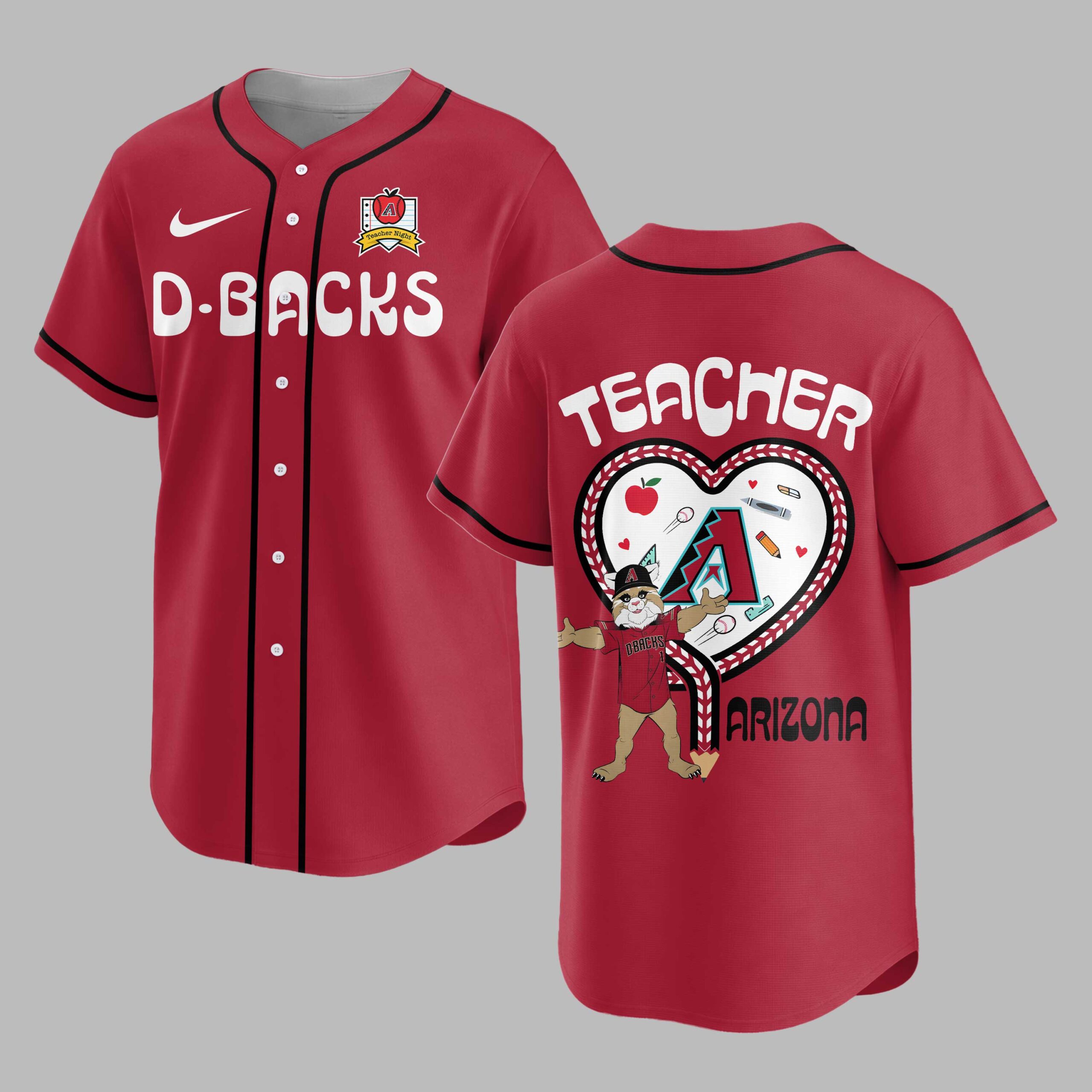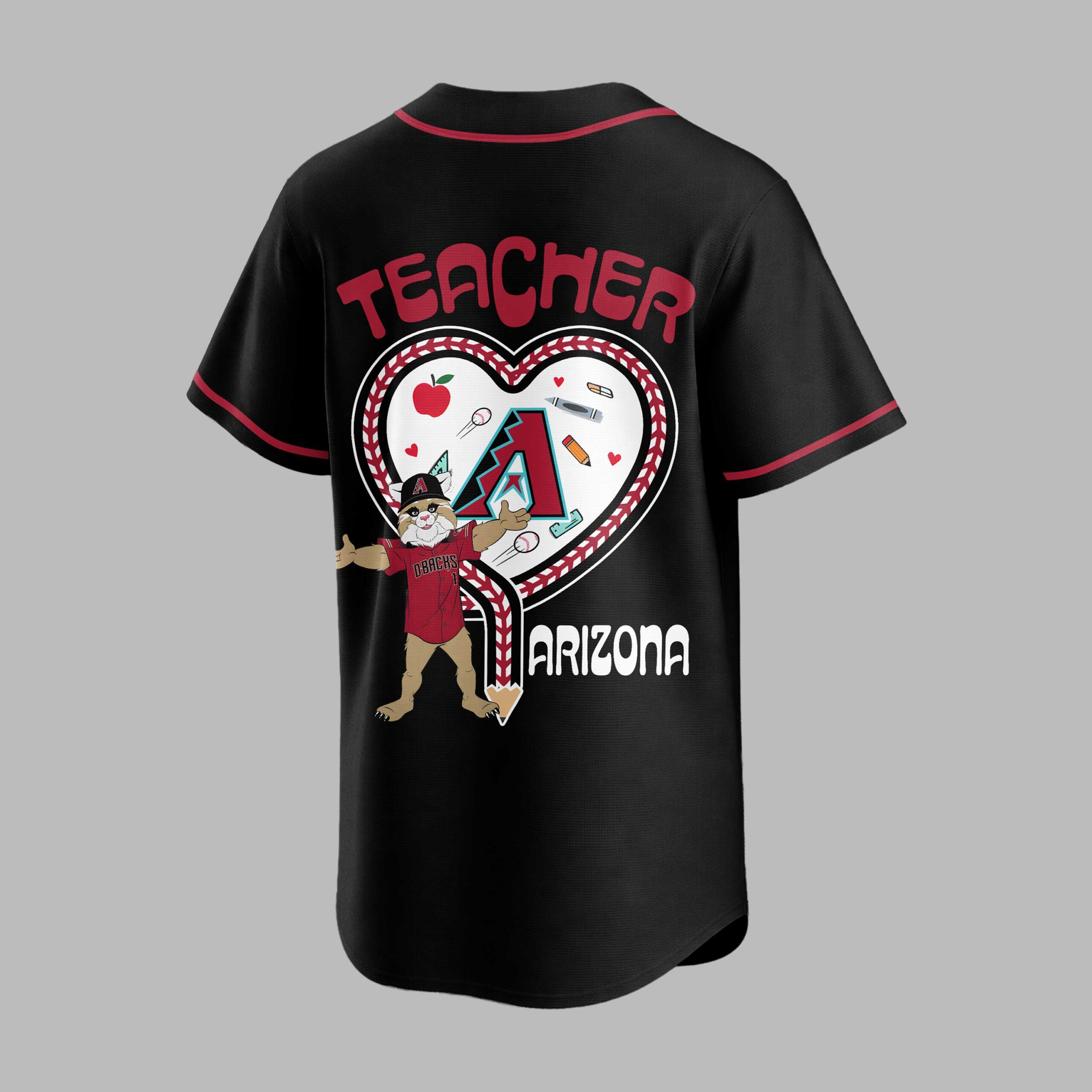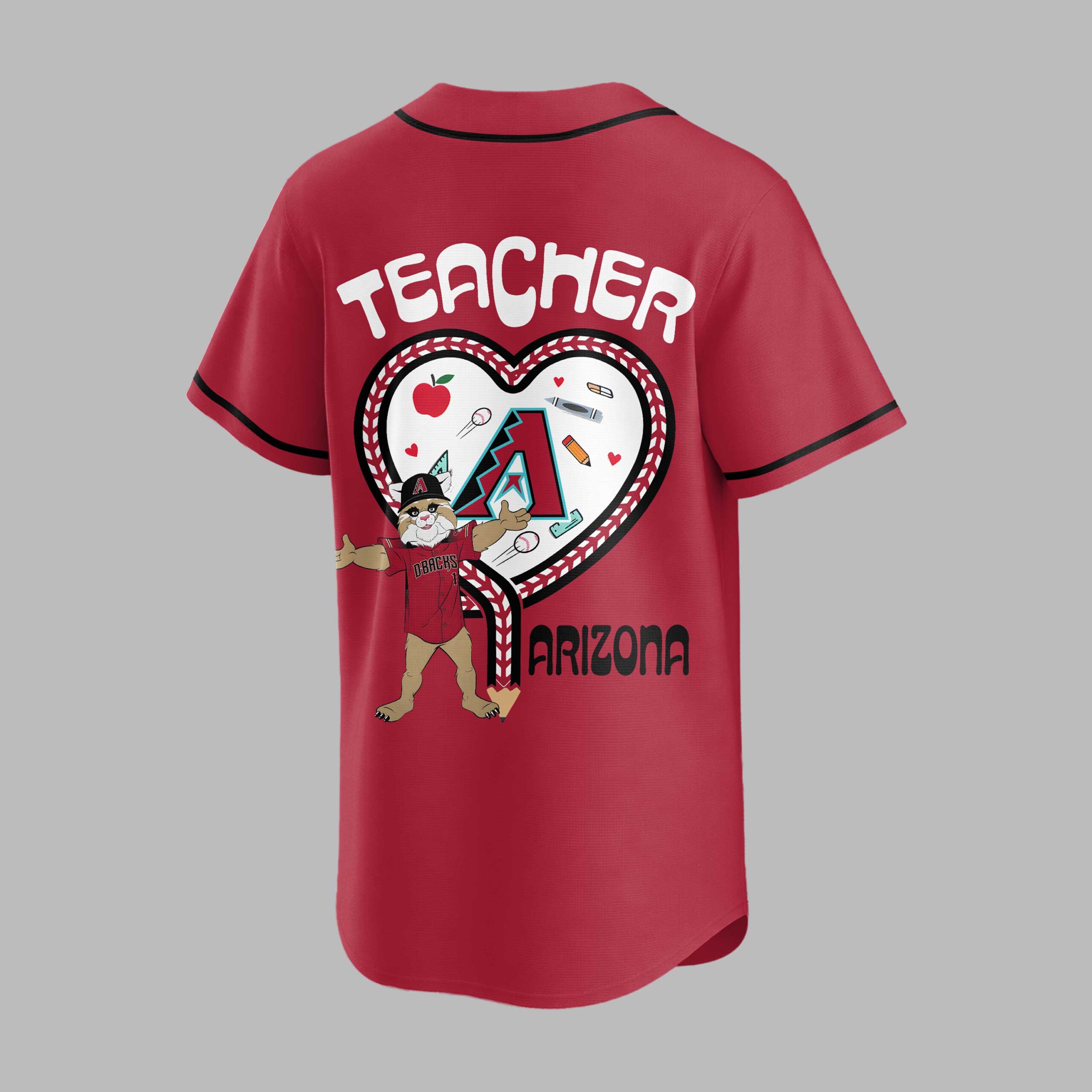 Show your Arizona Diamondbacks pride and honor educators with this special baseball jersey! Perfect for teachers and fans, this shirt blends team loyalty with a heartfelt tribute to the teaching profession, a unique way to celebrate both passions. The front proudly displays D-BACKS in bold red, accompanied by a Teacher Night emblem. The back features TEACHER above a large heart, outlined with baseball stitching. Inside, the D-backs mascot stands among school supplies like apples and pencils, with ARIZONA displayed below. This jersey is ideal for game nights, especially during teacher appreciation events. It’s also great for casual wear or school functions. Express your D-backs devotion and respect for teachers, from the stands to the classroom!