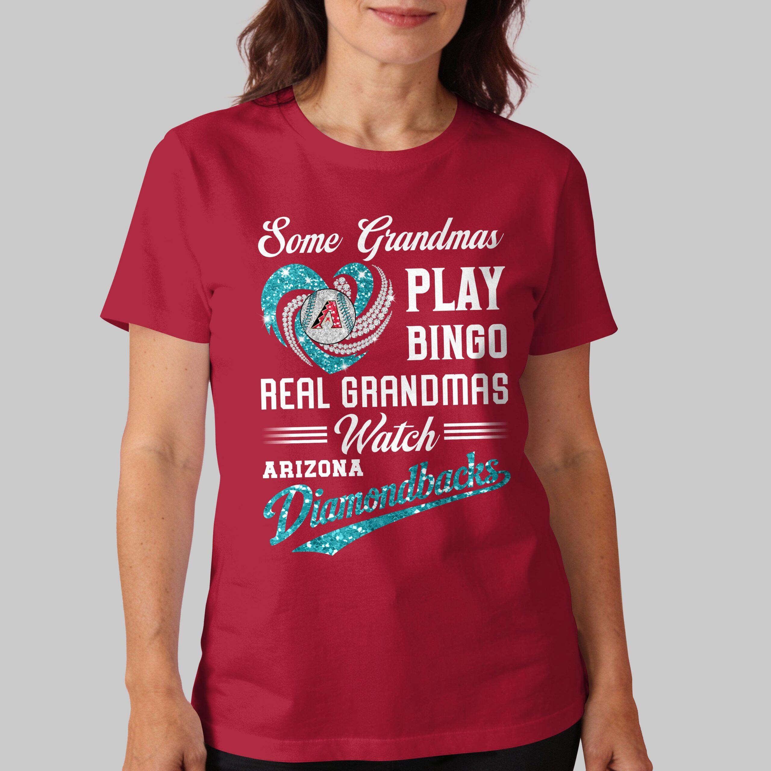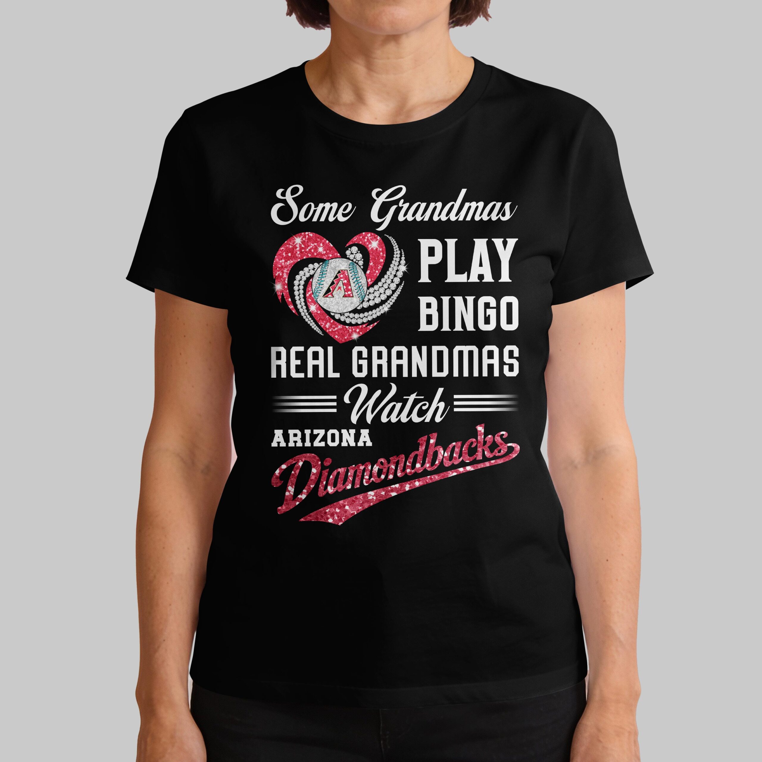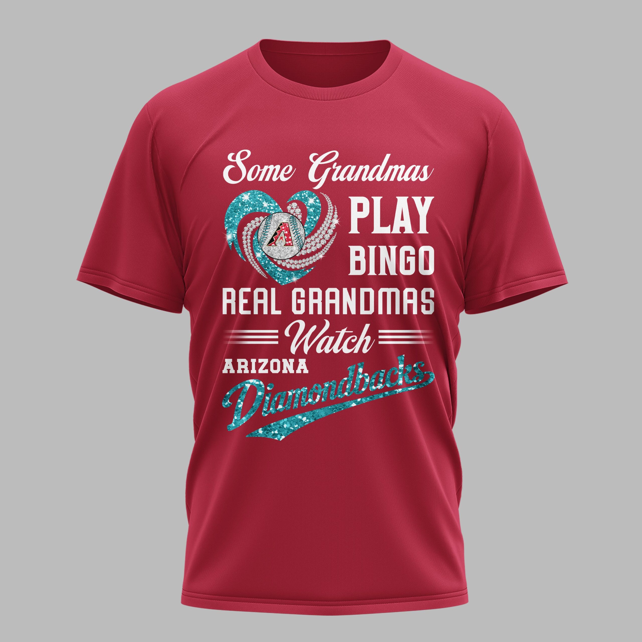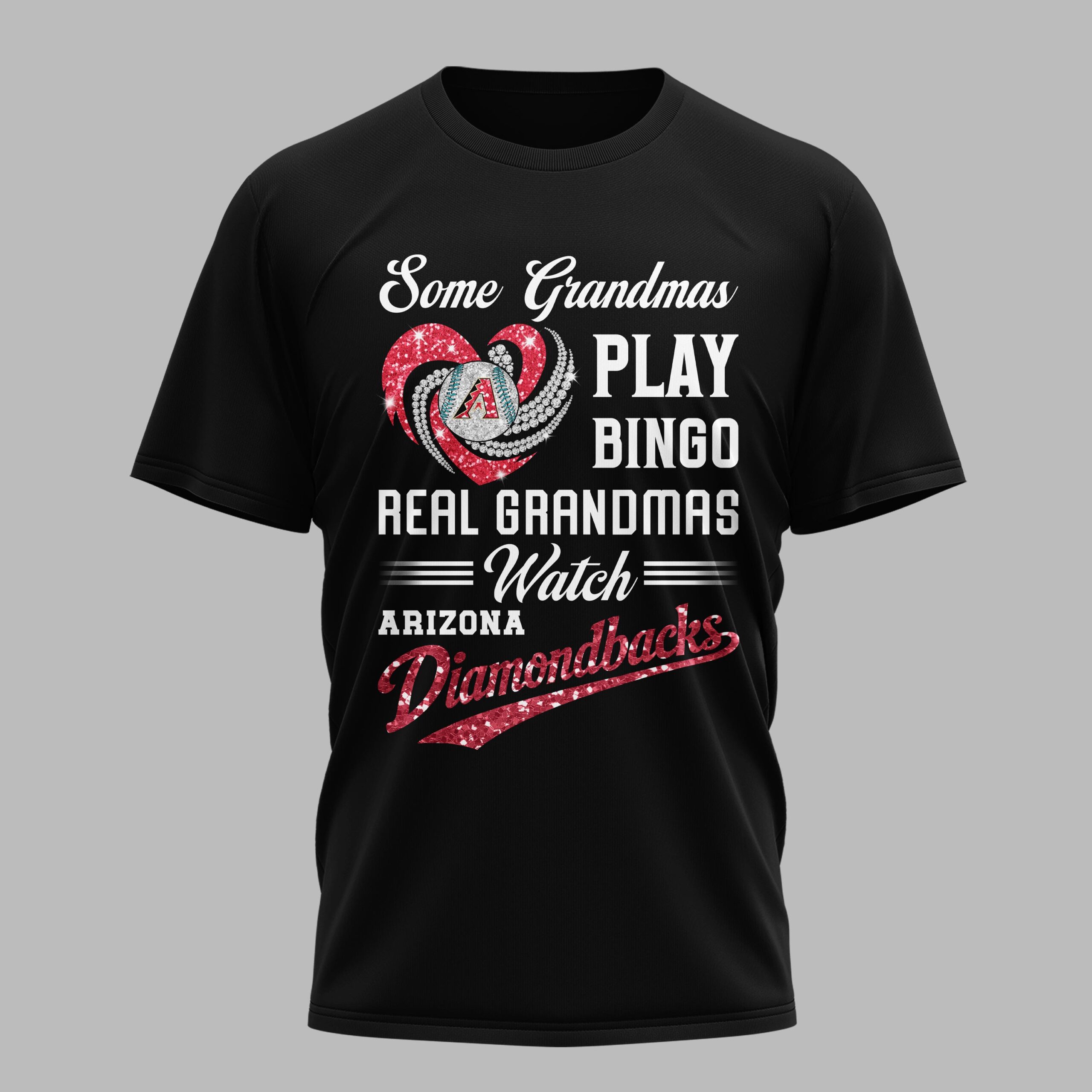 Show off your unshakeable team spirit with this fun Arizona Diamondbacks Real Grandmas Watch T-shirt! Perfect for the grandma who knows that game day is for cheering on her favorite team, not for bingo. This tee is a heartwarming and spirited way to celebrate your love for baseball and your beloved D-backs. The design proudly declares Some Grandmas PLAY BINGO REAL GRANDMAS = Watch = ARIZONA Diamondbacks. It features a vibrant, glittery red heart intertwined with dazzling diamond swirls, centered around a baseball emblazoned with the iconic Arizona Diamondbacks A logo. The sparkling Diamondbacks script in red glitter adds an extra touch of flair, ensuring your team pride truly shines. Whether you’re at Chase Field, hosting a game day watch party, or simply running errands around town, this shirt is ideal for any proud Diamondbacks grandma. It’s a fantastic way to connect with fellow fans and let everyone know where your loyalties lie, making every day feel like a home run.