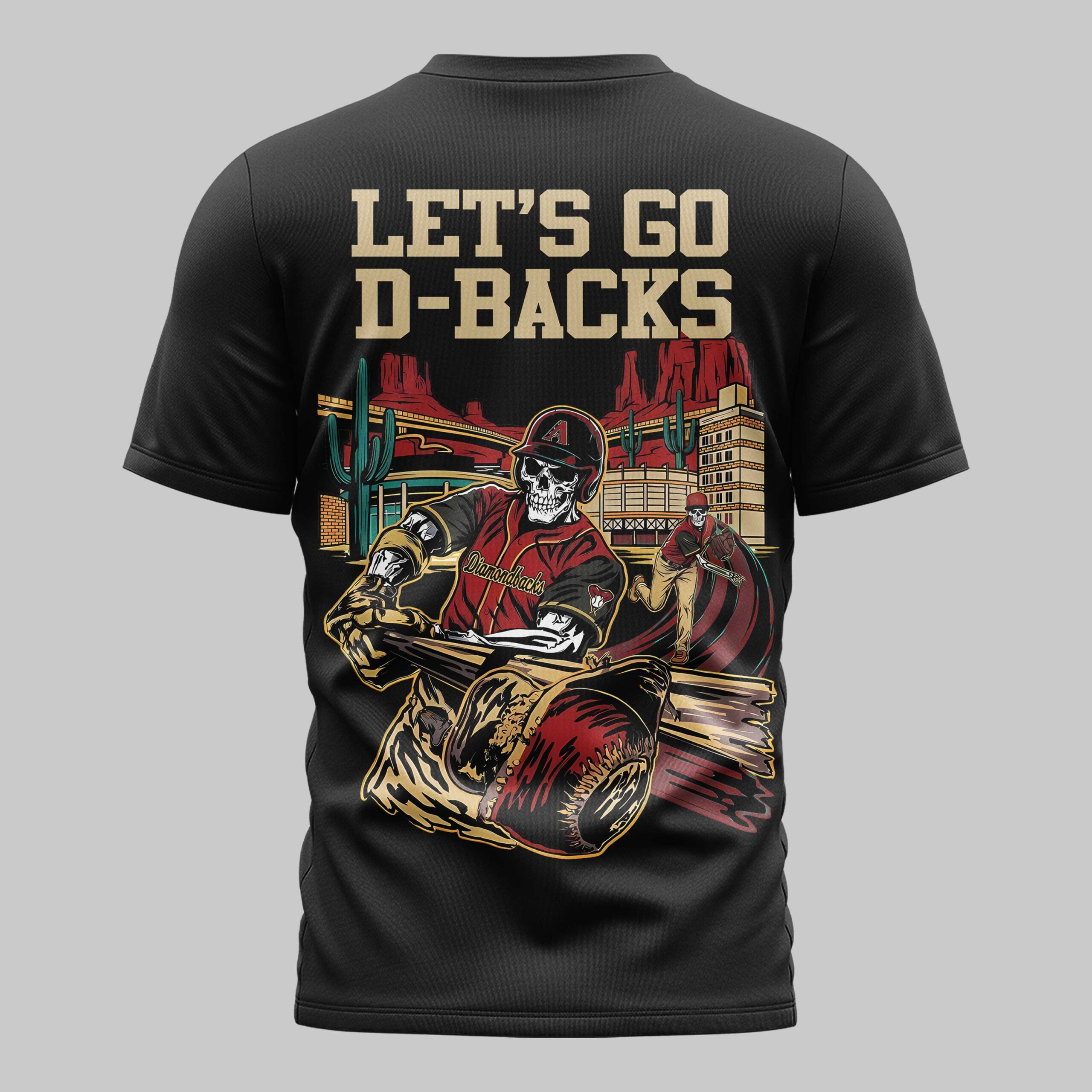 Ignite your D-Backs spirit with this captivating tee, perfect for every Arizona Diamondbacks fanatic. It’s more than just a shirt; it’s a powerful declaration of your loyalty, blending fierce team pride with a unique desert-inspired baseball aesthetic. The front proudly displays ‘D-BACKS’ in a bold, vintage-style font, complemented by the iconic team logo. Turn heads with the back’s electrifying artwork: ‘LET’S GO D-BACKS’ towers over a dramatic scene. A skeleton batter, clad in team colors, delivers a powerful swing against a backdrop of a bustling stadium, towering saguaros, and majestic desert mountains. Another skeleton pitcher completes this spirited gameday tableau. This shirt is engineered for the ultimate fan experience. Wear it loud and proud at Chase Field, during lively watch parties with friends, or simply as a statement piece in your everyday wardrobe. It’s the perfect way to showcase your unwavering support for the Diamondbacks, making every day feel like game day.