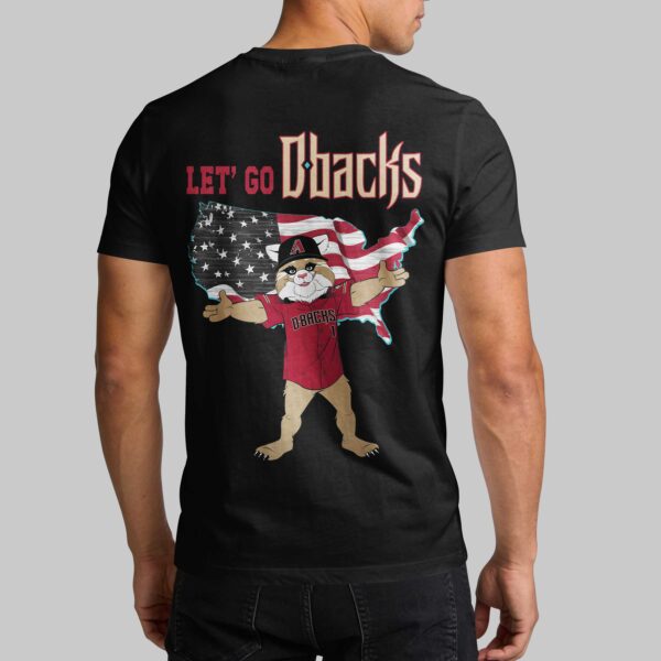 Show your unwavering pride for the Arizona Diamondbacks and the USA with this dynamic fan tee! It’s the perfect way to blend your love for baseball and country, making a bold statement whether you’re at the stadium or celebrating a national holiday. Feel the energy of game day combined with true American spirit every time you wear it. The front proudly displays USA in vibrant red with a sharp light blue outline, topped with the iconic Diamondbacks A logo, subtly showcasing your team allegiance. Flip it around, and the back features an energetic Diamondbacks mascot, sporting its DBACKS jersey and enthusiastically holding up a distressed American flag designed as the map of the United States. Above this spirited scene, the rallying cry LET’ GO Dbacks is emblazoned. This shirt is ideal for cheering on the Dbacks during baseball season, celebrating patriotic holidays like the Fourth of July or Memorial Day, or simply showcasing your American and team spirit any day of the week. It’s a versatile piece for any dedicated fan wanting to combine their passions.