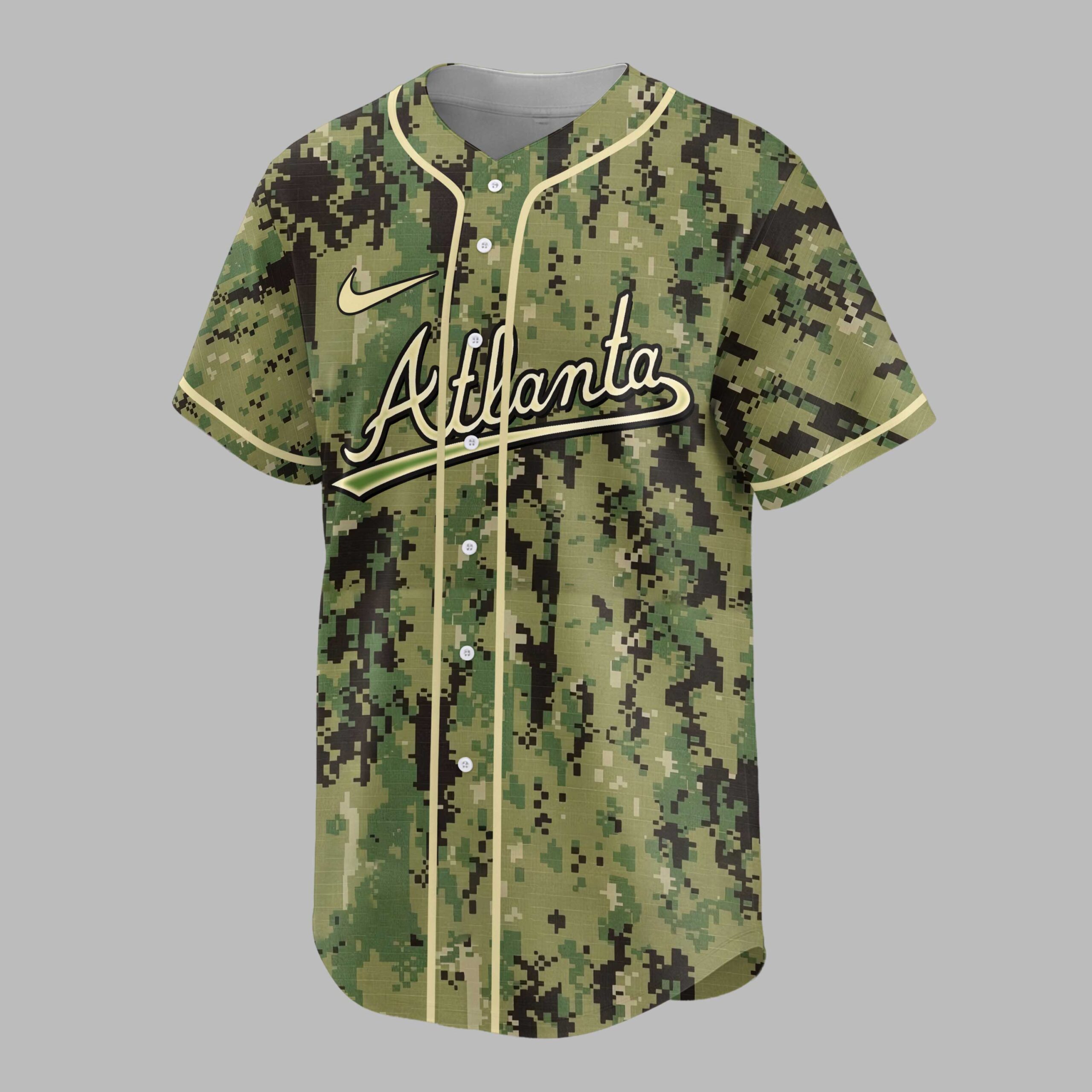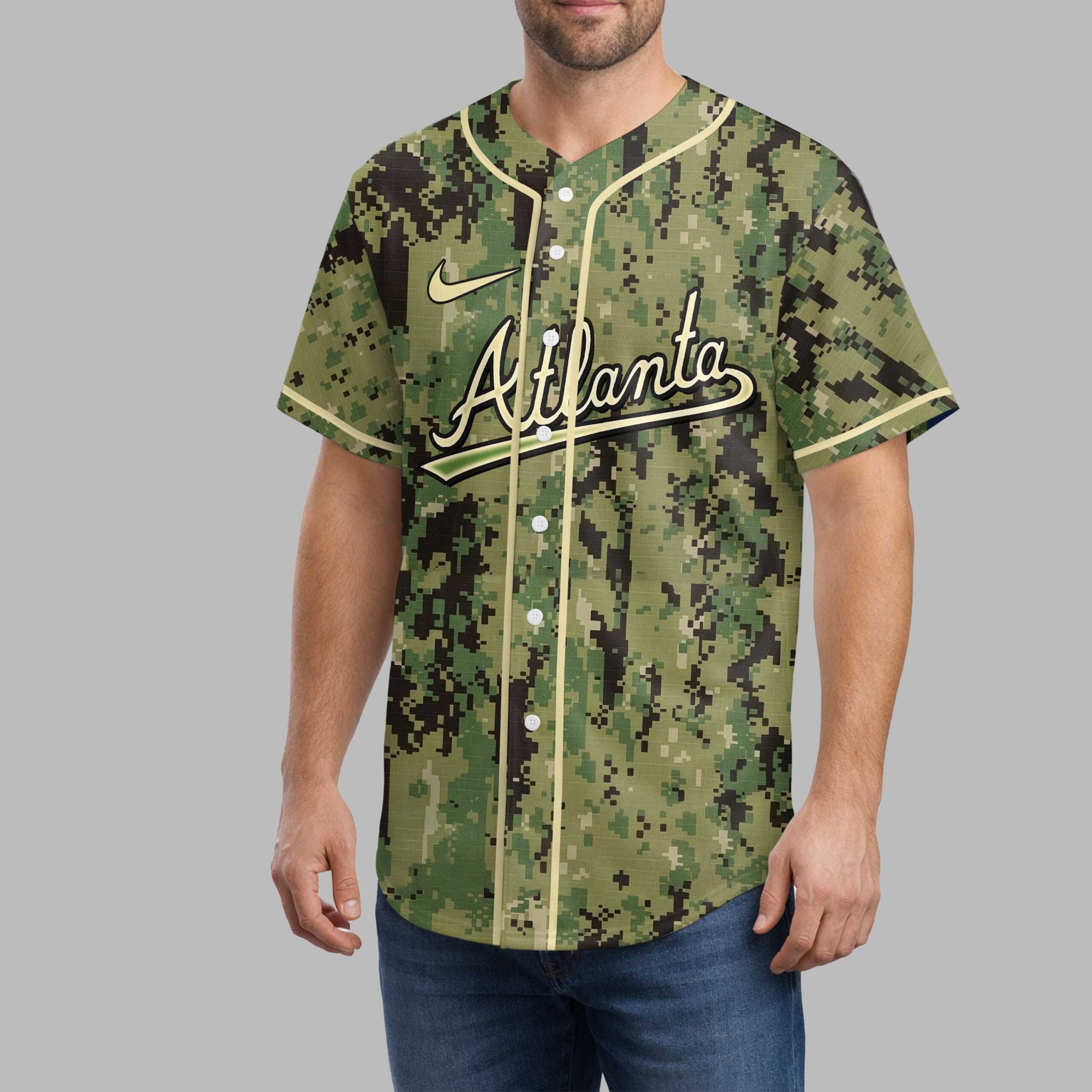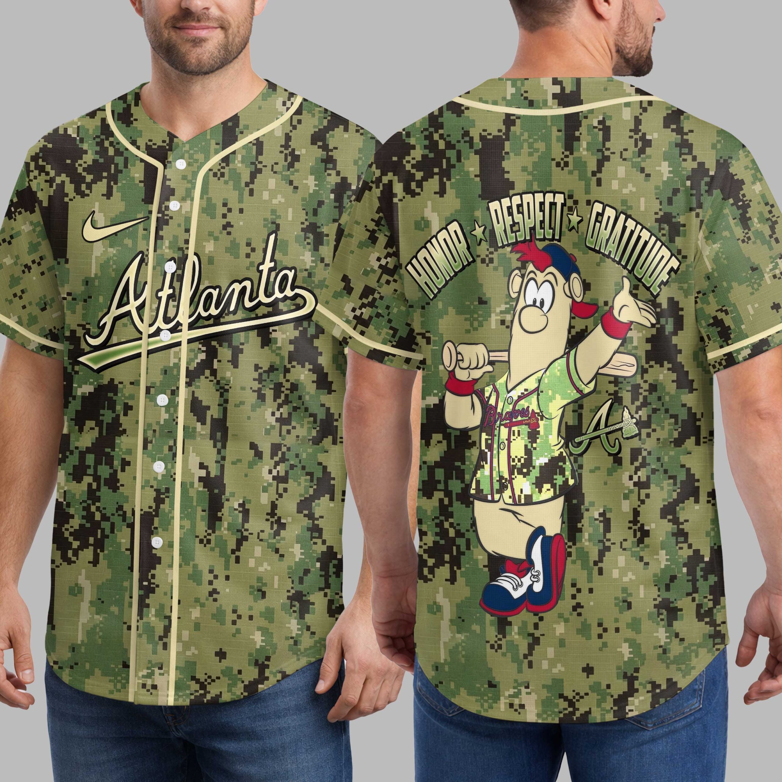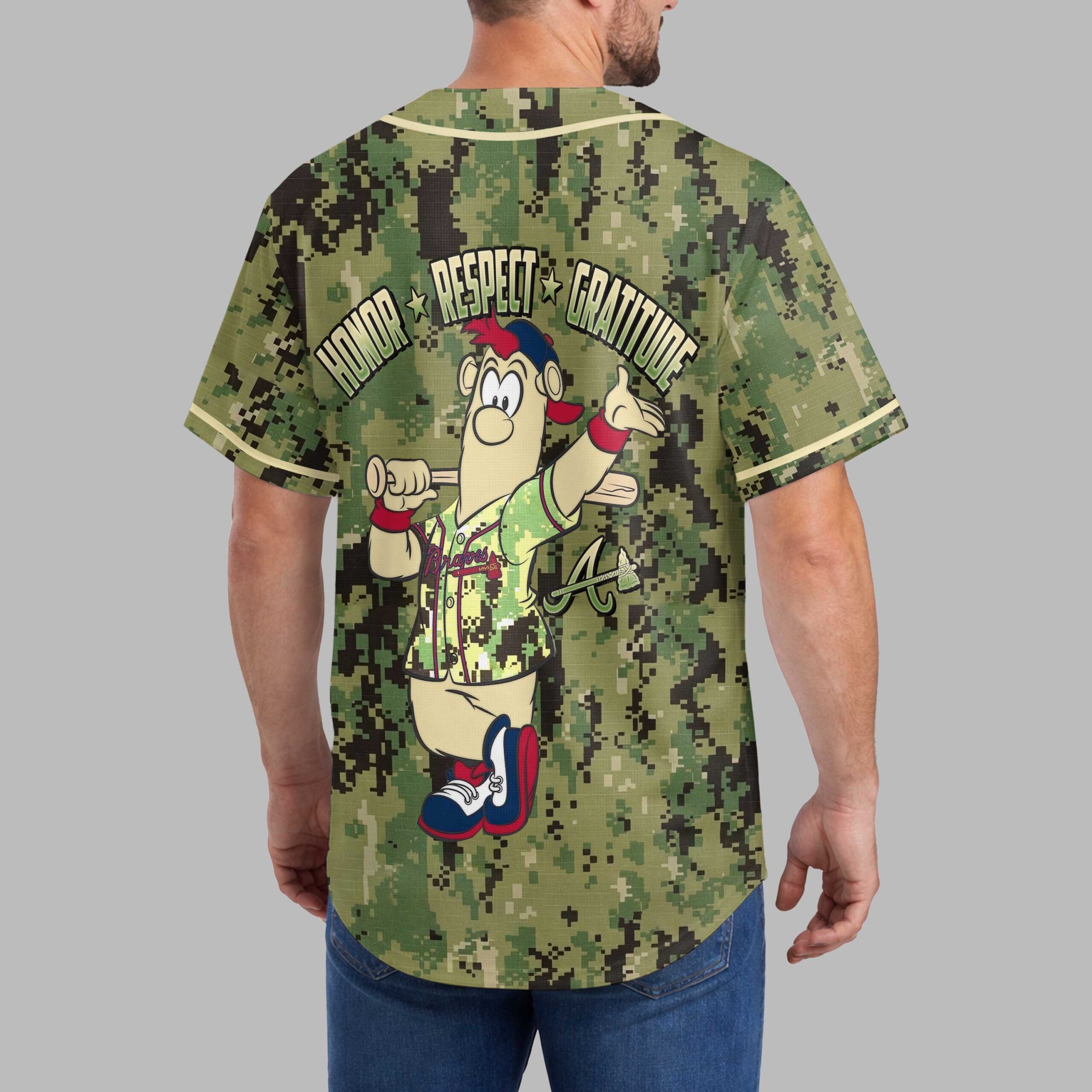 Show your unwavering support for the Atlanta Braves and salute our heroes with this unique camo baseball jersey. This shirt blends team pride with patriotic spirit, perfect for any fan wanting to honor service and dedication while cheering on their favorite team. The front proudly displays Atlanta in sleek cursive, underlined by a bold green stripe, all set against a distinctive digital camouflage pattern. The back features a spirited cartoon baseball player in a Braves uniform, accompanied by HONOR, RESPECT, and GRATITUDE. A prominent A logo with a tomahawk emphasizes team loyalty. Ideal for game days at the ballpark, military appreciation events, or casual outings. Display your allegiance and respect loudly with this meaningful tribute.