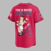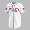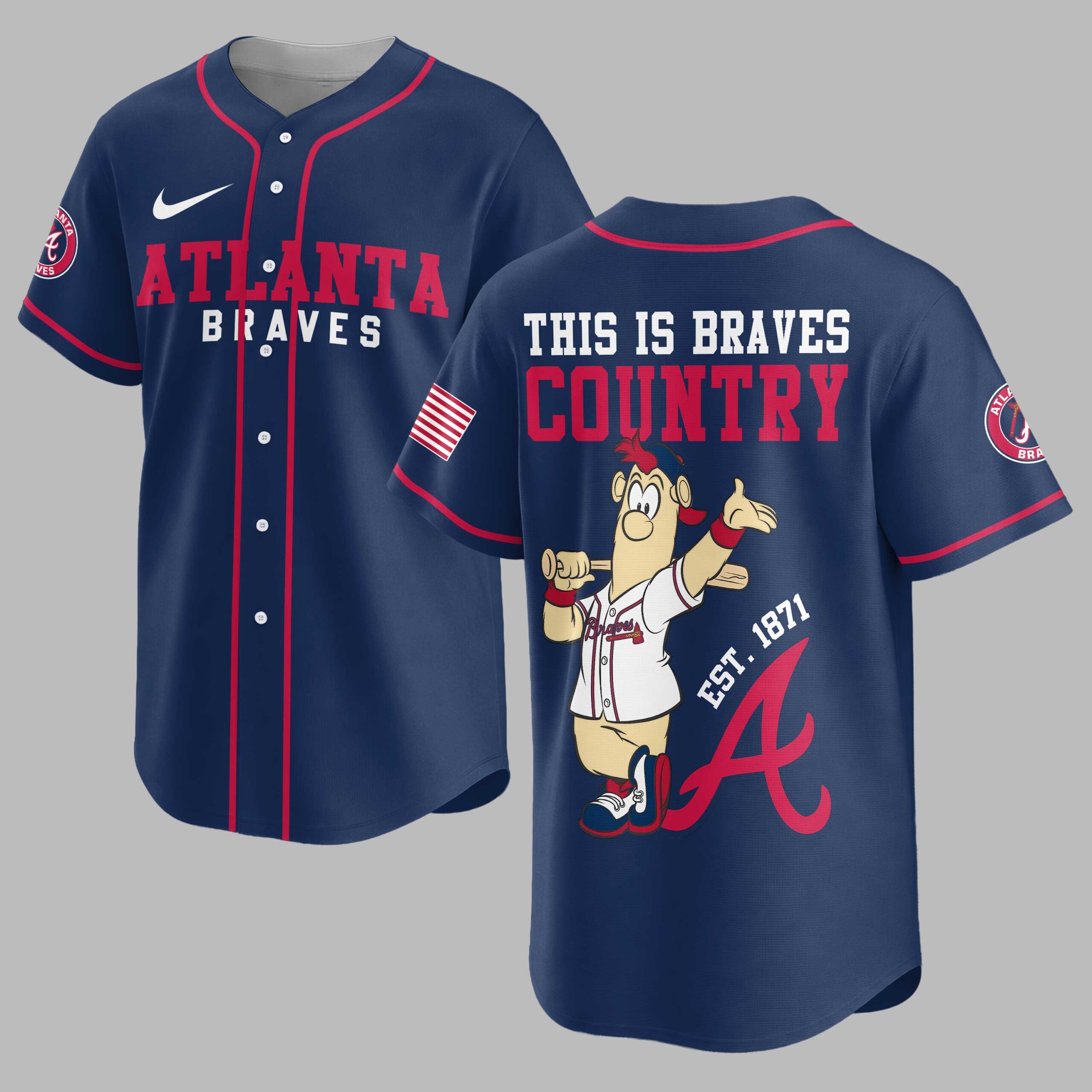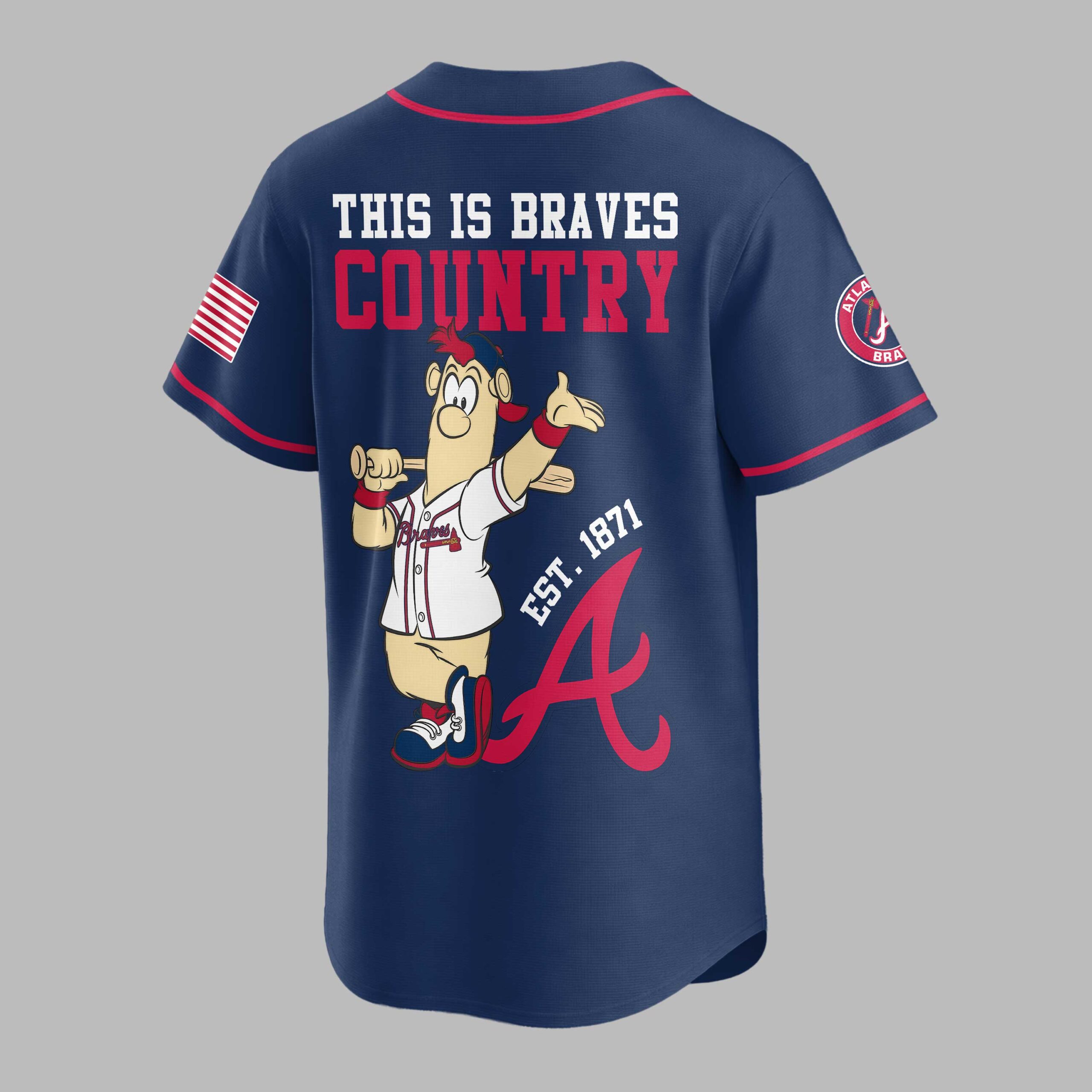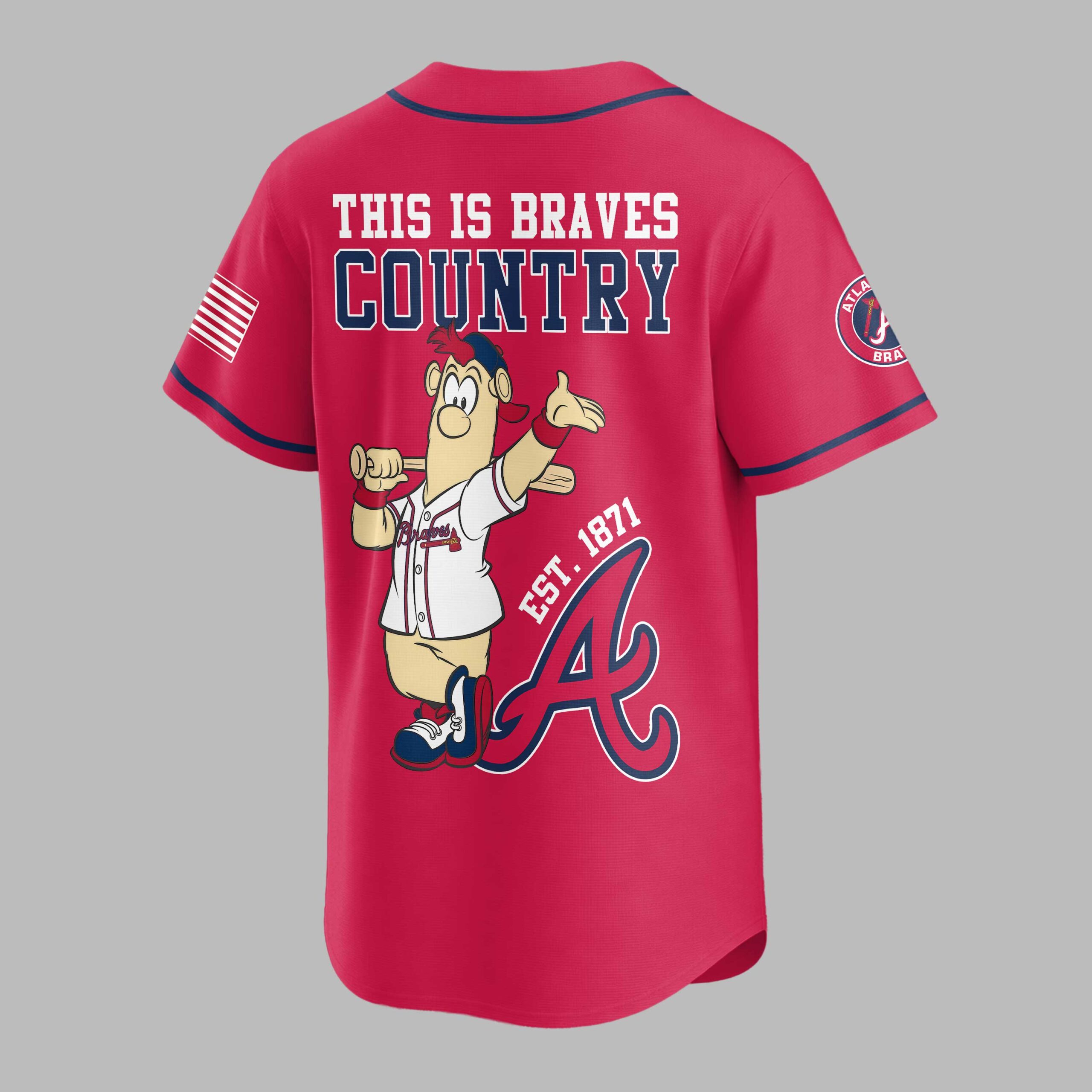 Unleash your ultimate team spirit with this dynamic Atlanta Braves This is Braves Country baseball jersey! Perfect for every devoted fan, this jersey proudly celebrates the rich history and vibrant energy of your favorite team. Show the world where your loyalties lie and join the chorus of fans declaring their dedication to the Braves. The front of this crisp white jersey boldly displays ATLANTA BRAVES in classic red and blue lettering, complemented by the iconic Braves logo on the left sleeve and a patriotic American flag graphic on the right. Turn around to reveal THIS IS BRAVES COUNTRY in striking red and blue, featuring a fun, spirited hot dog mascot ready for action, complete with EST. 1871 and a large, proud A that anchors the design. Whether you’re cheering from the stands at Truist Park, hosting a game day BBQ, or simply showcasing your team pride around town, this jersey is your go-to gear. It’s ideal for baseball season, casual outings, or any occasion where you want to represent the Braves with undeniable enthusiasm and style.