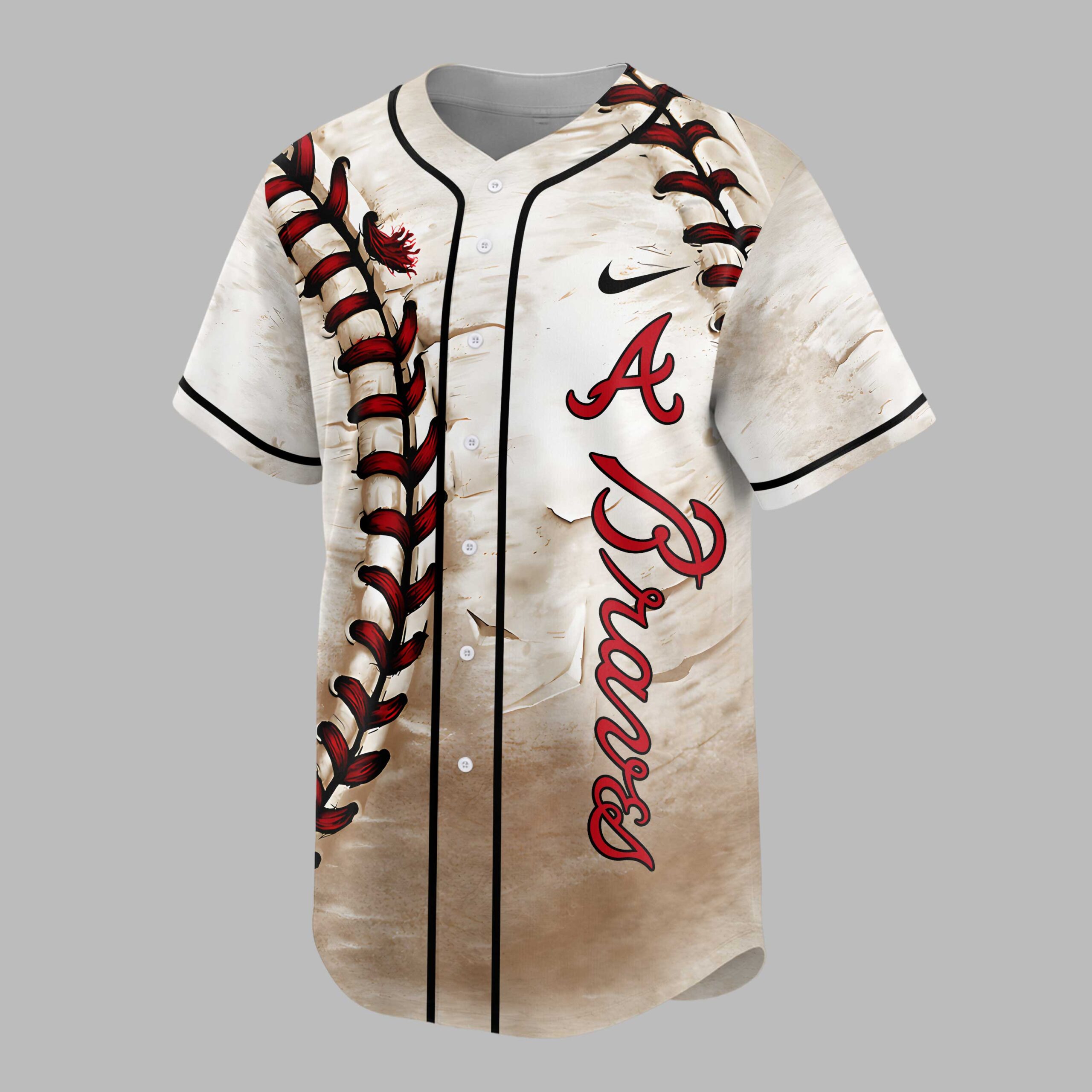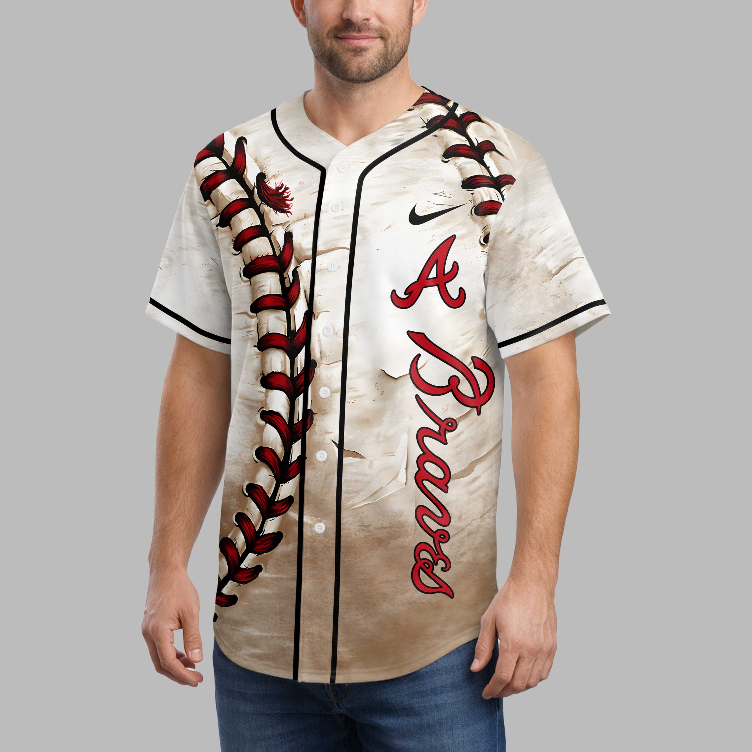 Hit a home run with your style in this vintage-inspired baseball jersey, crafted for every devoted Braves fan. It’s a powerful statement of loyalty and passion, bringing the spirit of America’s pastime to your wardrobe with authentic, retro flair. The design showcases a unique distressed background, mimicking a cherished, game-worn look, perfectly paired with a bold, vertical baseball stitching graphic on the front. The iconic ‘A Braves’ script takes center stage on the chest. On the back, proudly display your personalized ‘Your Name’ above large ’00’ numbers, each featuring subtle baseball stitch details, ensuring your fan identity shines bright. Perfect for electric game days, lively watch parties, or simply celebrating your team pride anywhere. This jersey lets you wear your heart on your sleeve, making every moment feel like a grand slam for your favorite team.