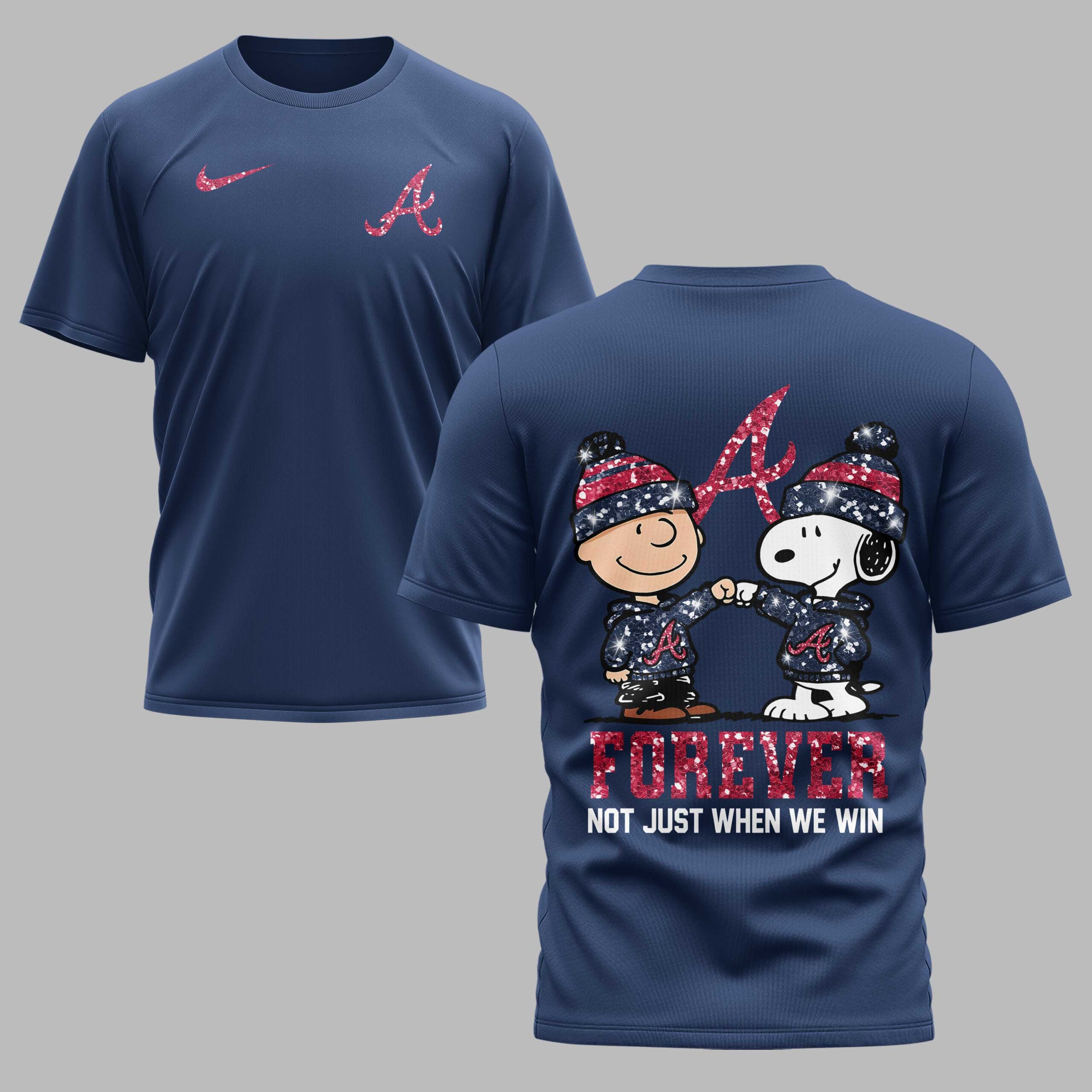 Show your unwavering loyalty to the Atlanta Braves with this spirited fan tee, perfect for every game day. Featuring beloved Peanuts characters, Charlie Brown and Snoopy, this shirt embodies true fandom, reminding everyone your support for the Braves runs deep, win or lose. The front proudly displays a glittery red A logo. The back captures Braves devotion: Charlie Brown and Snoopy, dressed in festive red, white, and blue, glitter-speckled Braves gear, share a fist bump. Above them, a large, sparkling A reinforces the bold declaration: FOREVER NOT JUST WHEN WE WIN. This unique tee is ideal for rocking at Truist Park, during watch parties, or as a comfortable statement of your Braves pride. It’s the perfect way to share your love for baseball and these classic characters, a home run for any devoted Atlanta fan.