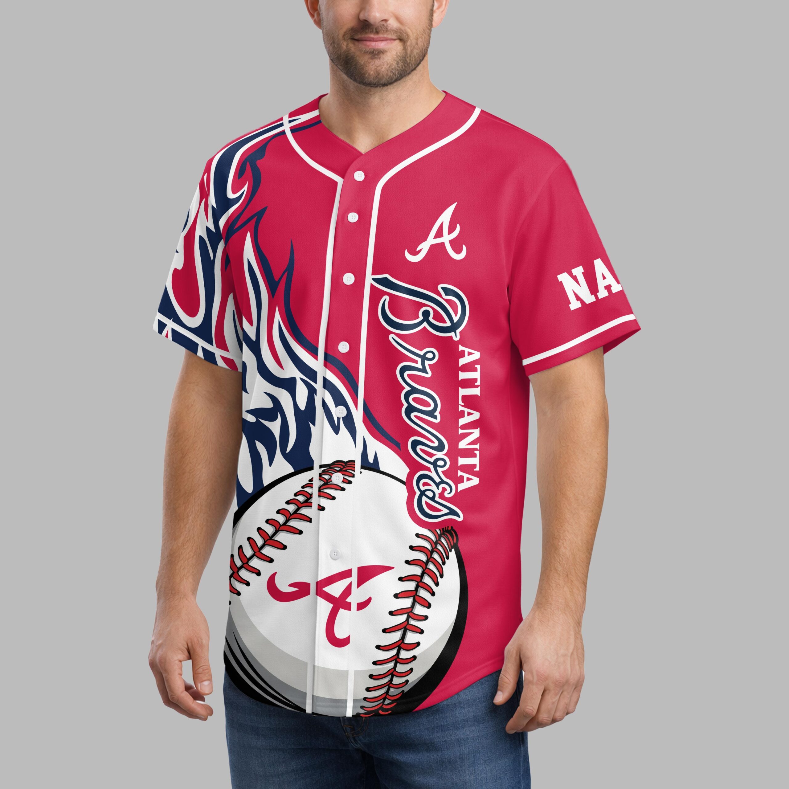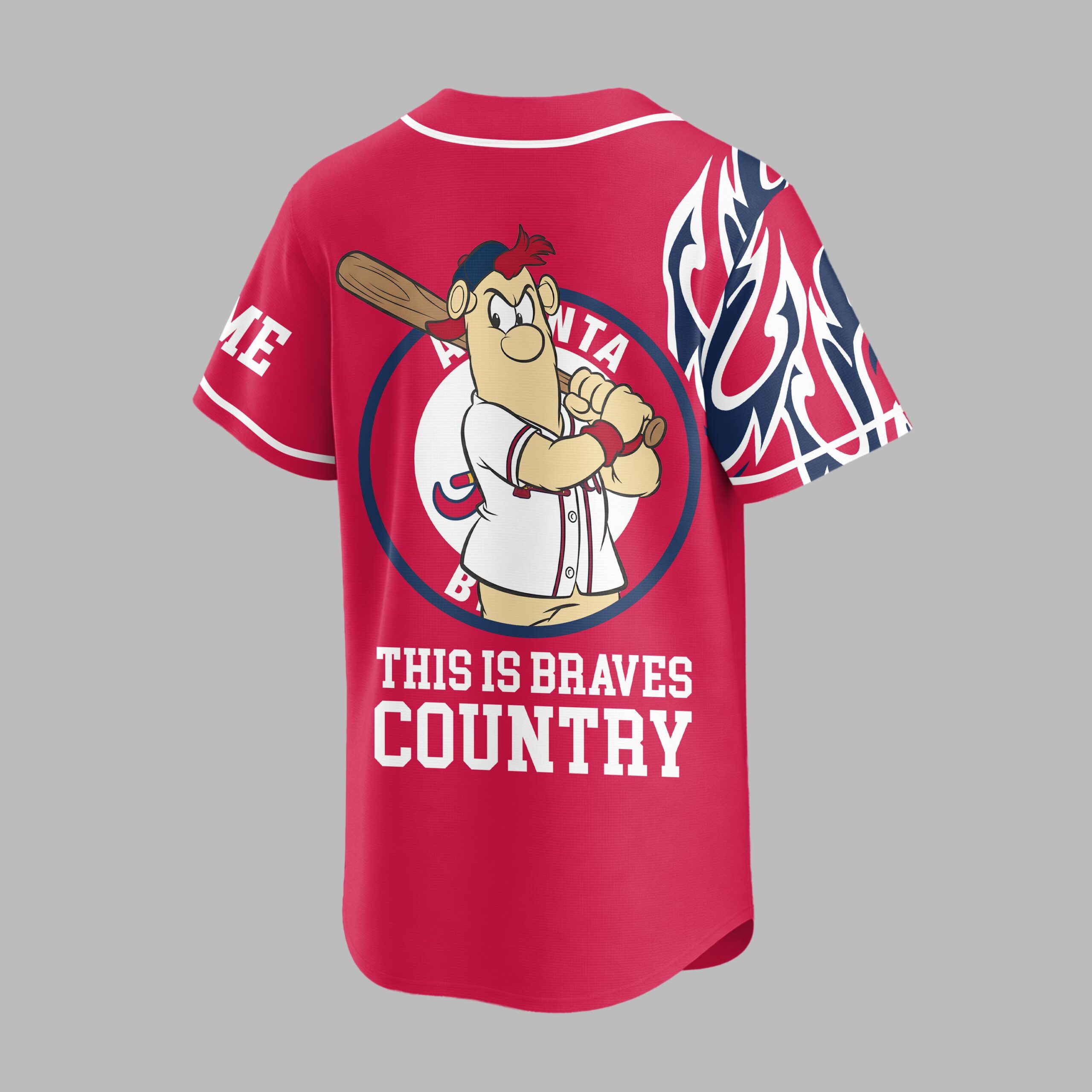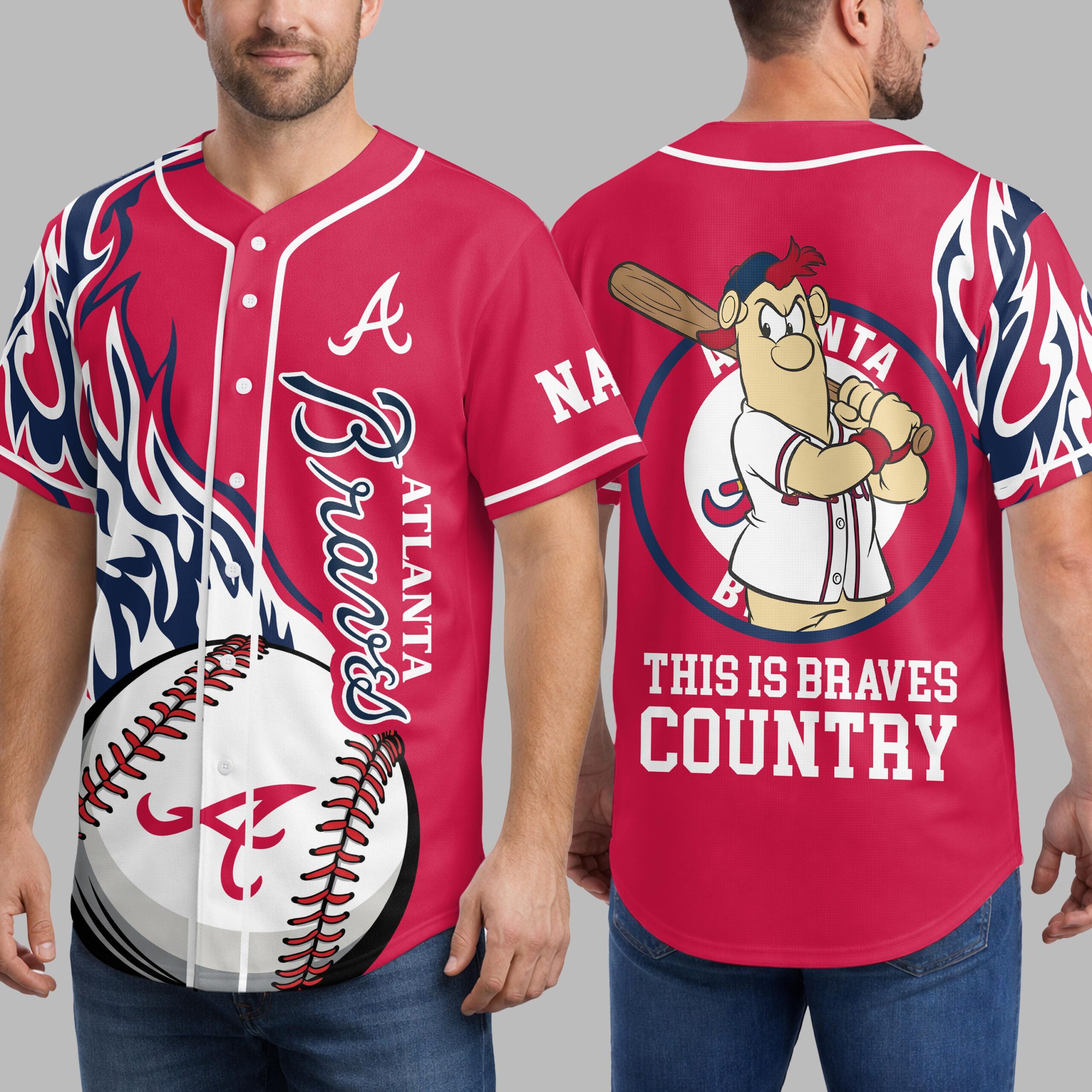 Unleash your ultimate team spirit with this vibrant Atlanta Braves fan jersey! Perfect for dedicated followers, this shirt lets you boldly declare your loyalty and passion. Get ready to cheer on the Braves in style, showcasing your pride wherever you go. The dynamic design features a bold A Braves ATLANTA logo across the front, complemented by an eye-catching baseball graphic with iconic red stitching and the classic A emblem. Both sleeves and sides are adorned with an energetic blue and white flame-like pattern. The back proudly displays a fun cartoon baseball player holding a bat, encircled by ATLANTA text and the powerful declaration, THIS IS BRAVES COUNTRY. This jersey is your perfect companion for exhilarating game days at the ballpark, lively watch parties with fellow fans, or simply showing off your Braves pride in your everyday life. It’s more than just apparel; it’s a statement of unwavering support for Atlanta baseball. Wear it loud, wear it proud!