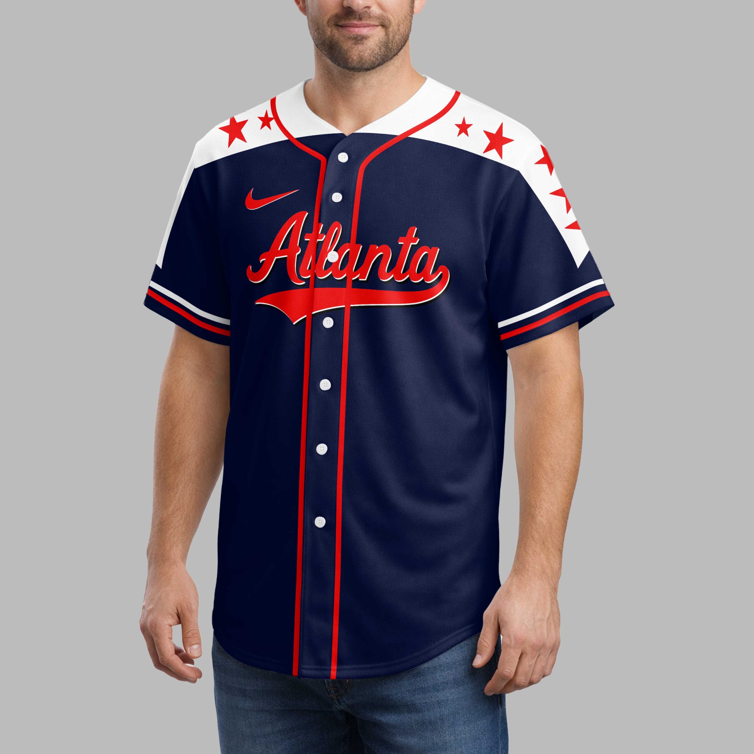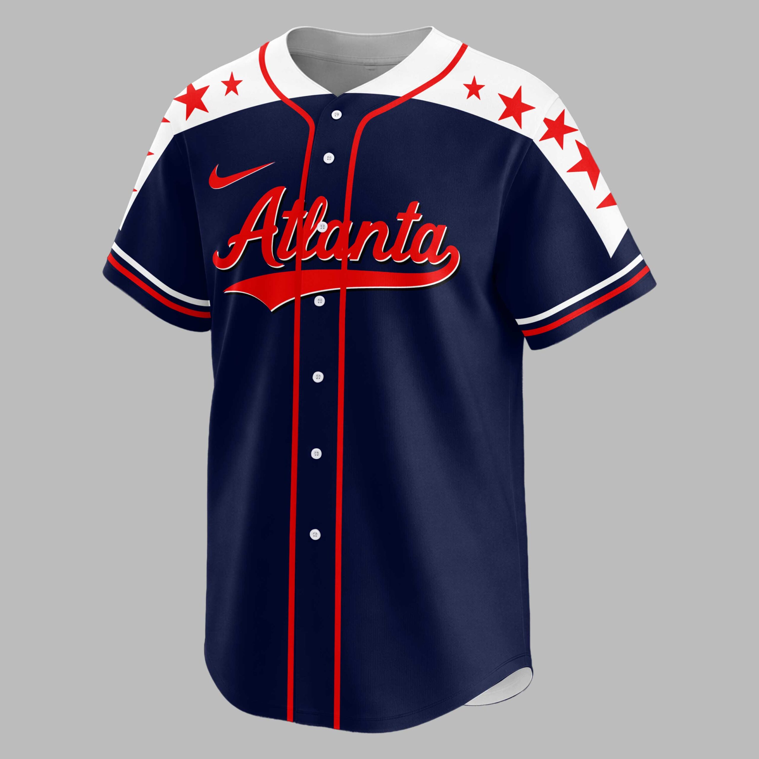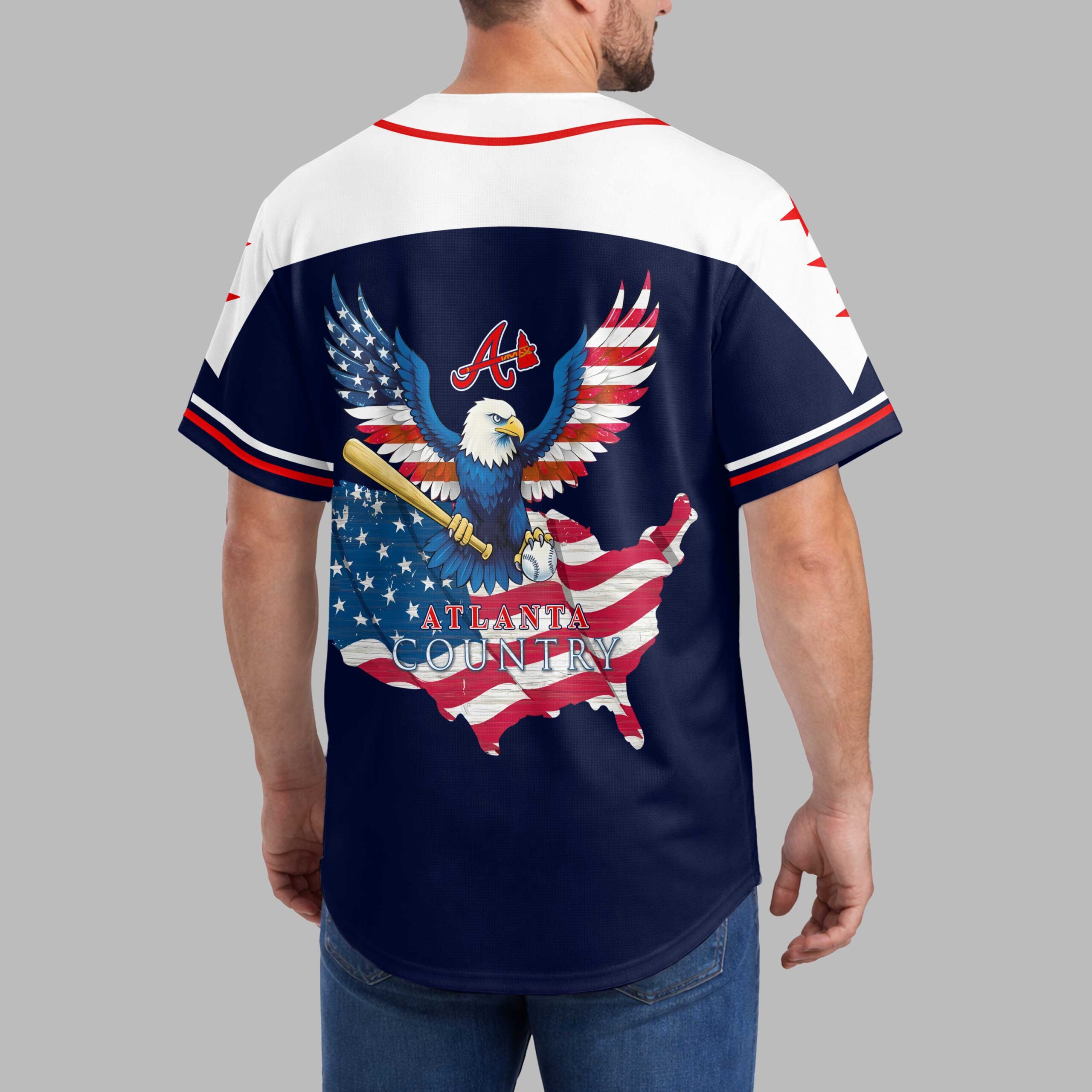 Show your unwavering pride for Atlanta baseball and your country with this striking patriotic jersey! Perfect for any devoted fan, this design powerfully combines your love for the game with a deep sense of American spirit. Gear up to cheer on your team with a bold statement that truly stands out. The front features Atlanta in a classic red script, accented by sporty white shoulders adorned with vibrant red stars and crisp red piping. The back makes an even grander declaration with a majestic bald eagle, wings spread wide in an American flag design, clutching a baseball bat and ball. This powerful symbol soars above a distressed USA map, also featuring a flag pattern, with Atlanta Country proudly displayed and the iconic A with tomahawk logo. This dynamic jersey is ideal for game days at the ballpark, Fourth of July celebrations, patriotic events, or simply everyday wear to showcase your unique team and national allegiance. It’s a spirited way to celebrate your favorite team and your American roots.