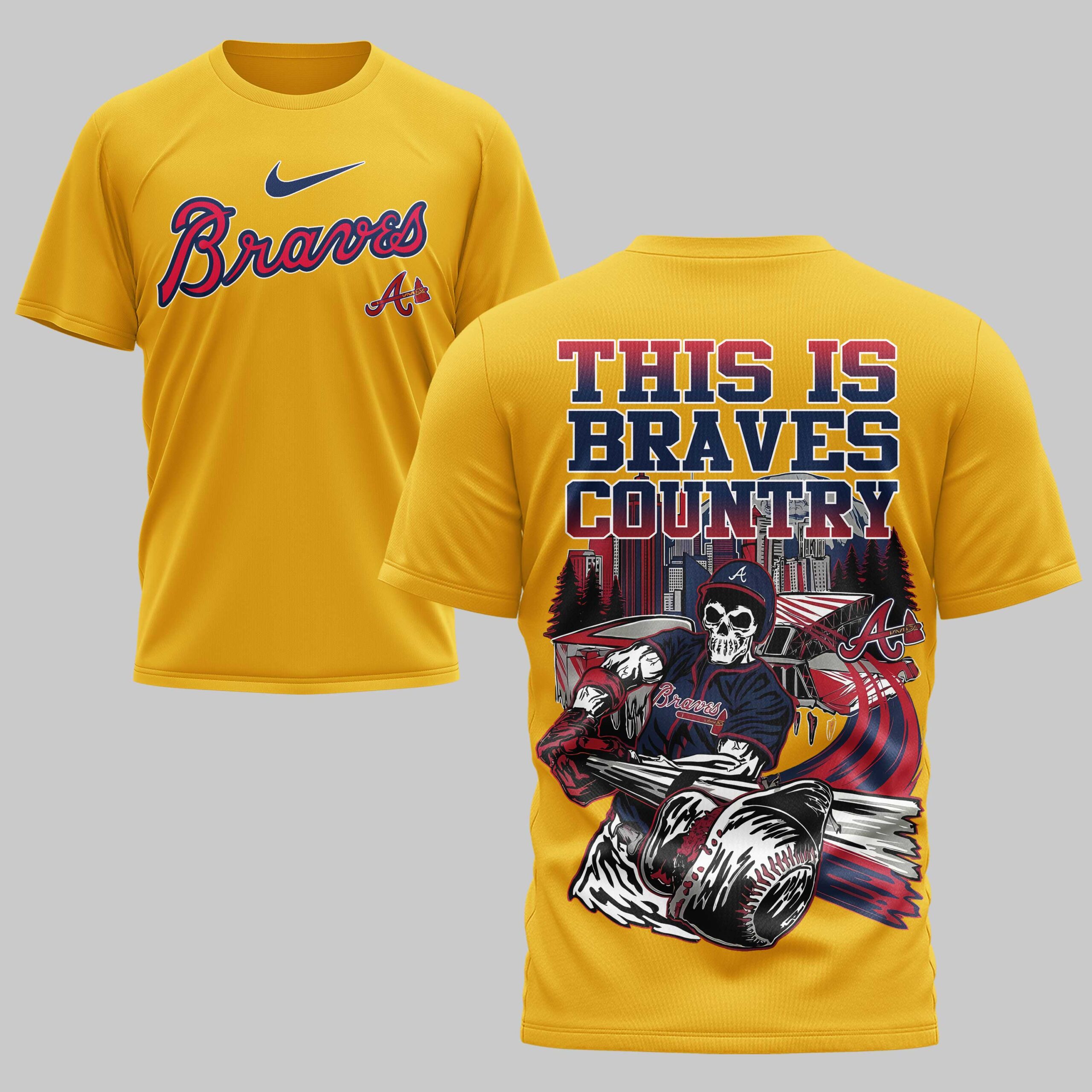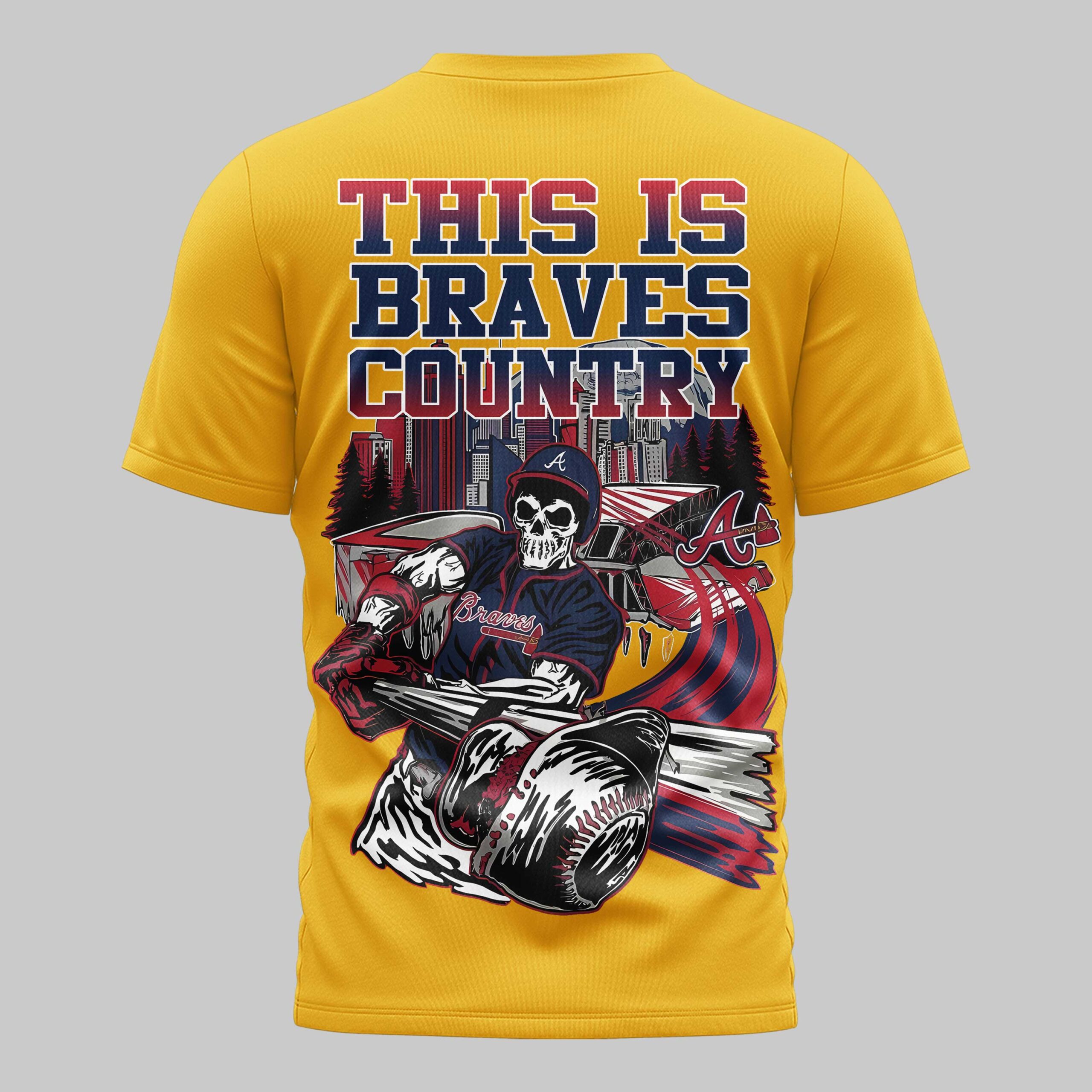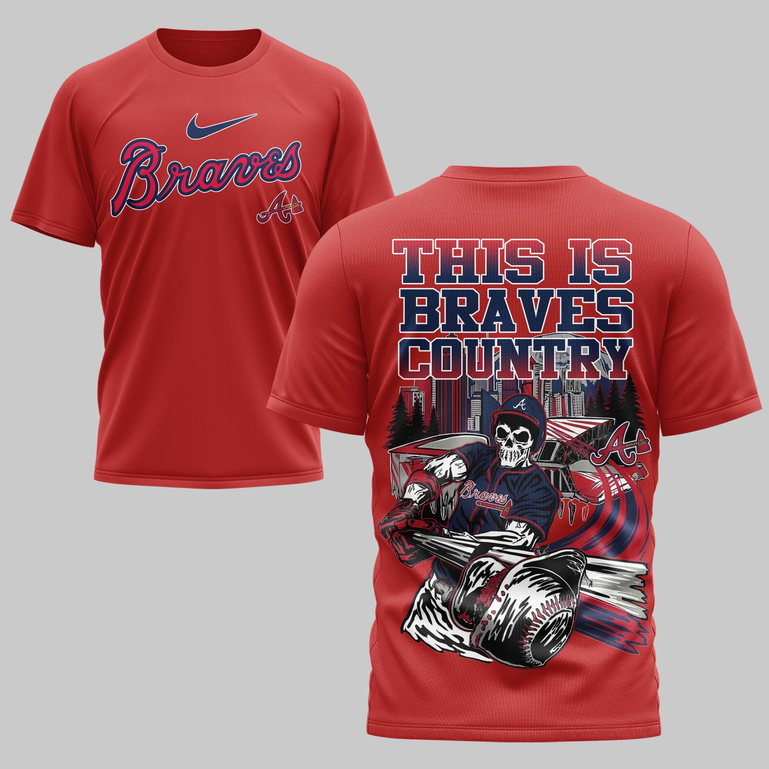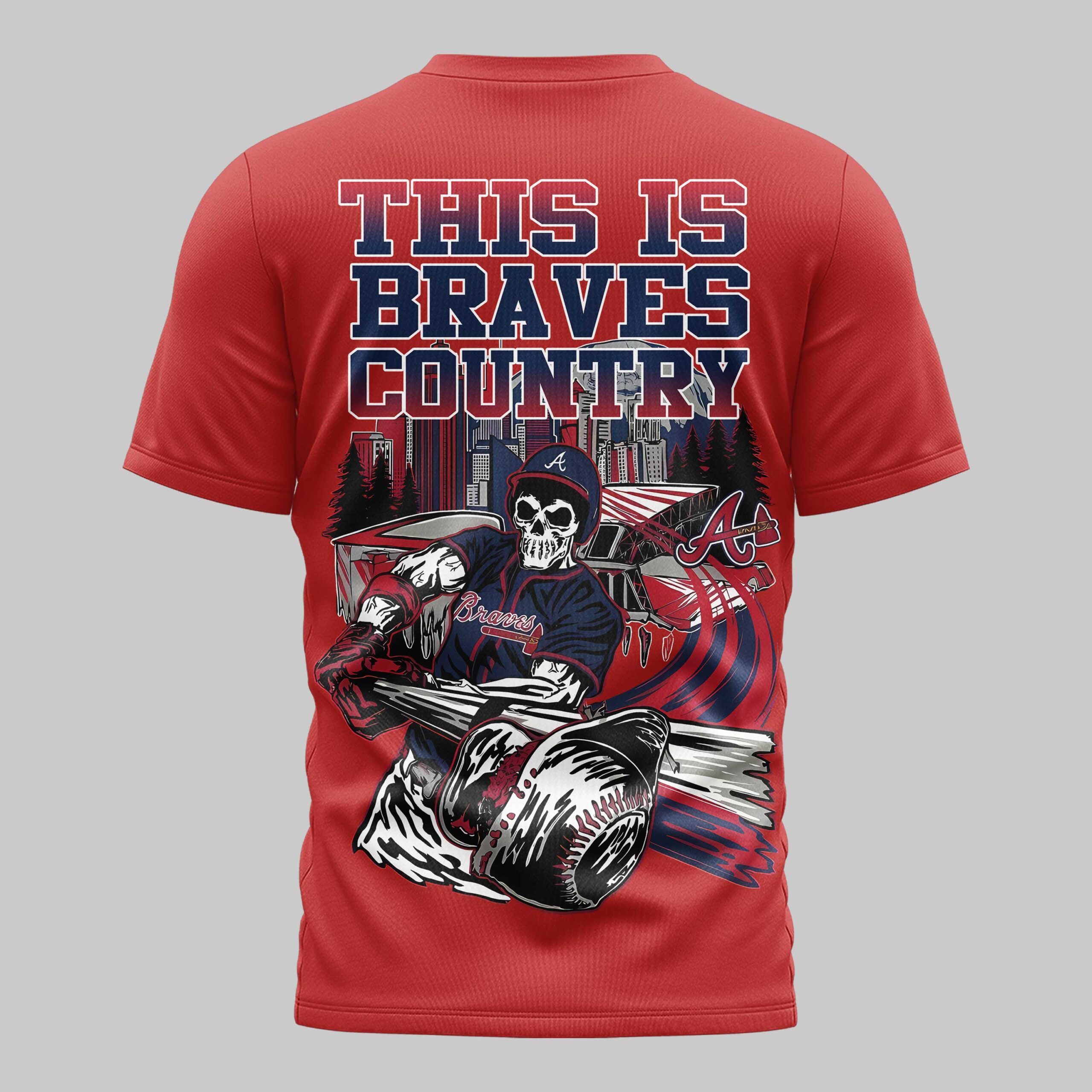 Declare your ultimate loyalty to the Atlanta Braves with this bold and spirited fan t-shirt. Perfect for die-hard supporters, this tee embodies the passion and pride of being part of Braves Country. Let your true colors shine and show your dedication to America’s favorite pastime, Atlanta style. The front of the shirt features the classic Braves script logo in vibrant red and blue, a timeless symbol of your favorite team. The back erupts with an intense design, showcasing a determined skeleton mascot in a Braves uniform, bat in hand, poised against a backdrop of the city skyline and patriotic stripes. Above this powerful imagery, the declaration THIS IS BRAVES COUNTRY leaves no doubt about your allegiance. Whether you’re at the stadium roaring with the crowd, hosting a game day watch party, or simply out and about, this t-shirt is your go-to for showcasing your Braves pride. It’s ideal for every fan who lives and breathes Atlanta baseball.