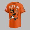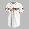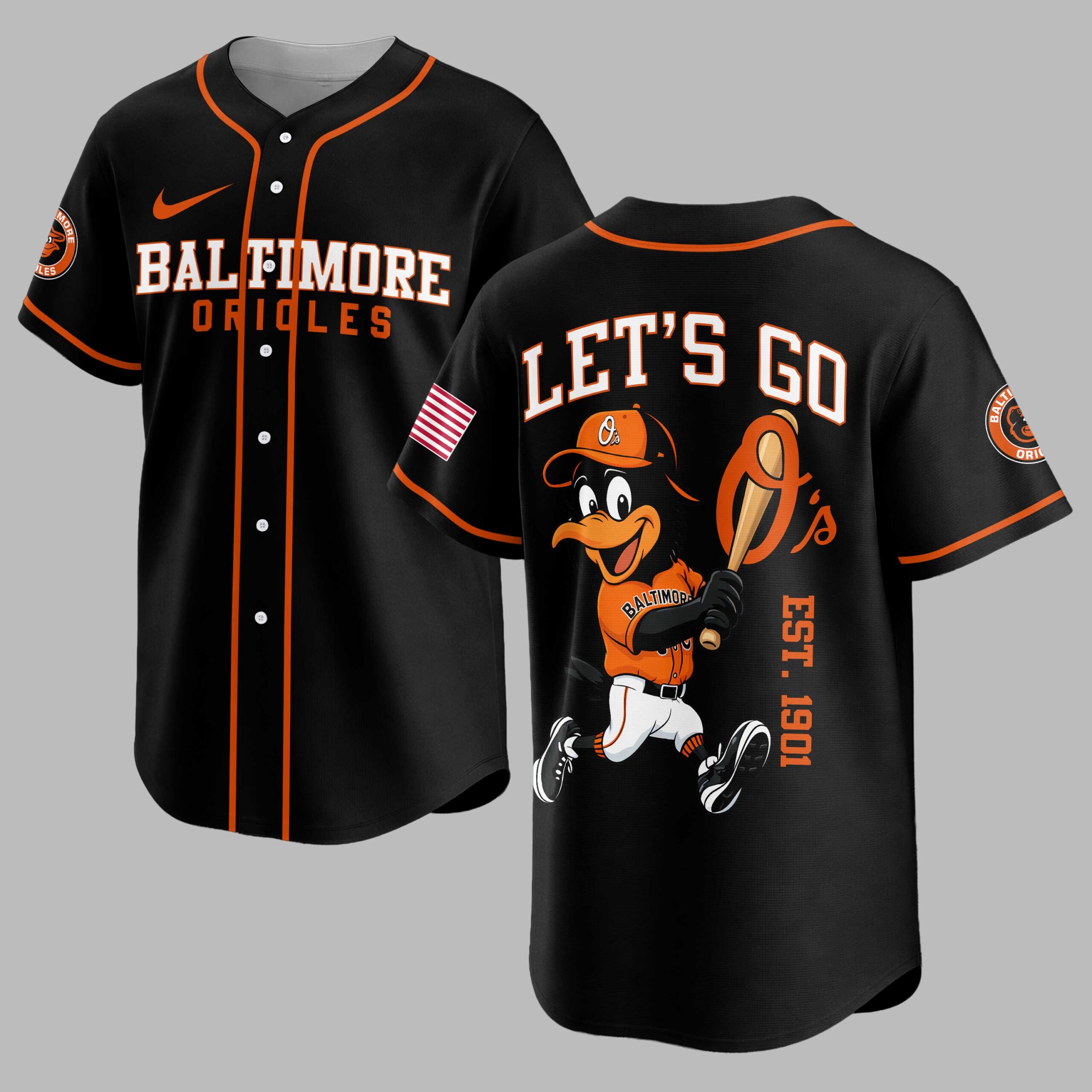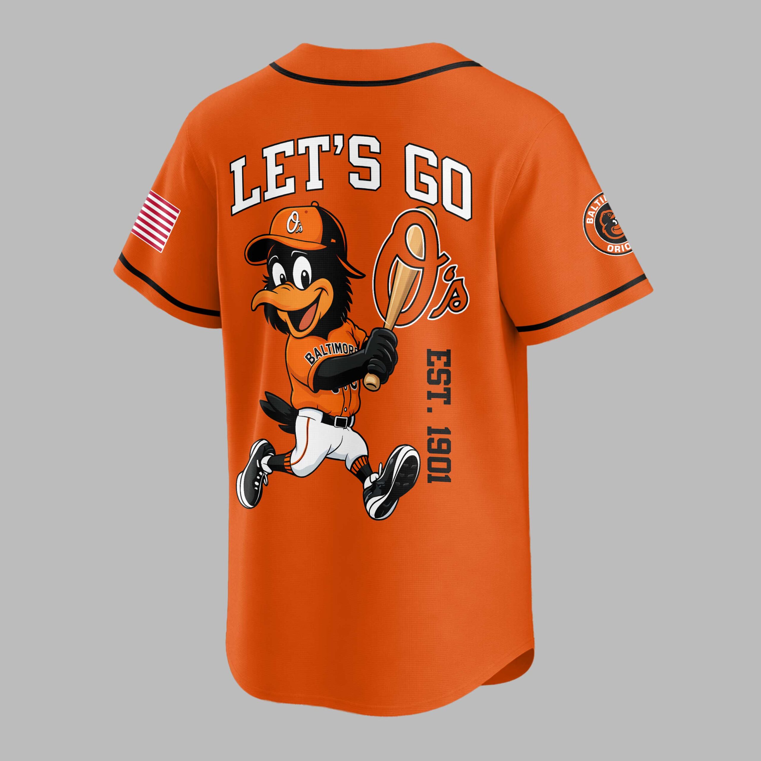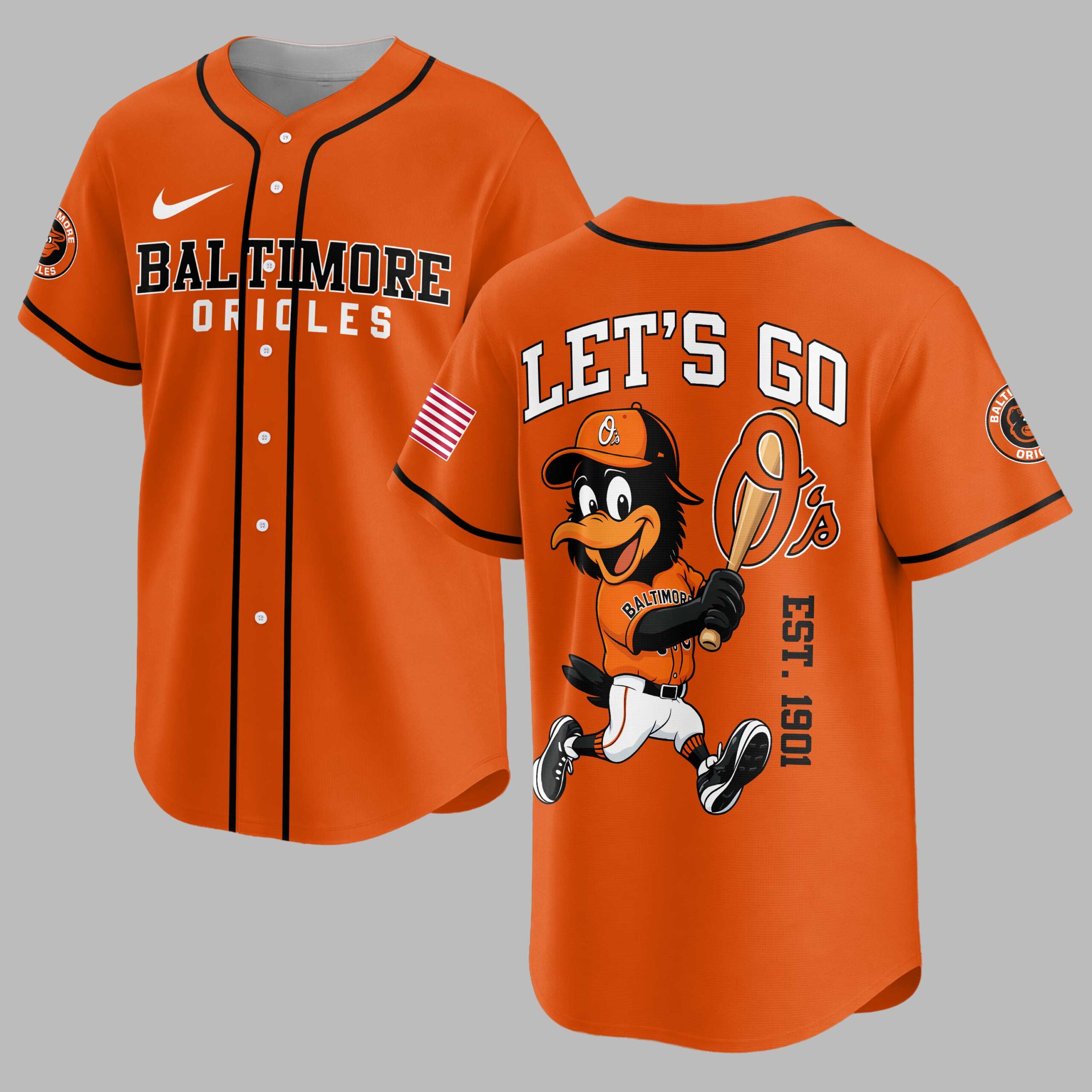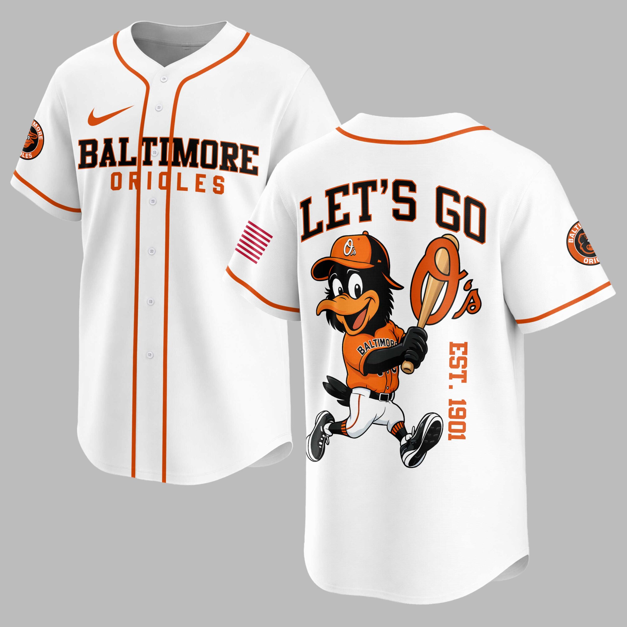 This vibrant Baltimore Orioles jersey is a grand slam for any fan looking to showcase their unwavering team spirit. Celebrate the rich history and exciting future of your favorite baseball team with a design that truly captures the energy of game day. It’s the perfect way to rally behind the O’s and show your pride for Baltimore baseball. The front of this classic white jersey proudly displays BALTIMORE ORIOLES in bold black and orange lettering, accented with stylish orange piping along the placket and collar. On the back, a dynamic cartoon Oriole mascot, geared up in its baseball uniform and holding a bat, charges forward under the spirited LET’S GO slogan. The founding year EST. 1901 is also featured, highlighting the team’s long-standing legacy. An American flag patch adorns one sleeve, while a circular team logo graces the other, completing this spirited design. Whether you’re cheering from the stands at Camden Yards, hosting a watch party with friends, or simply enjoying a sunny day out, this jersey is designed for the true Orioles faithful. It’s ideal for game days, sporting events, casual outings, or anytime you want to represent Baltimore with passion and pride. Wear it loud, wear it proud, and let everyone know you’re part of the Flock!