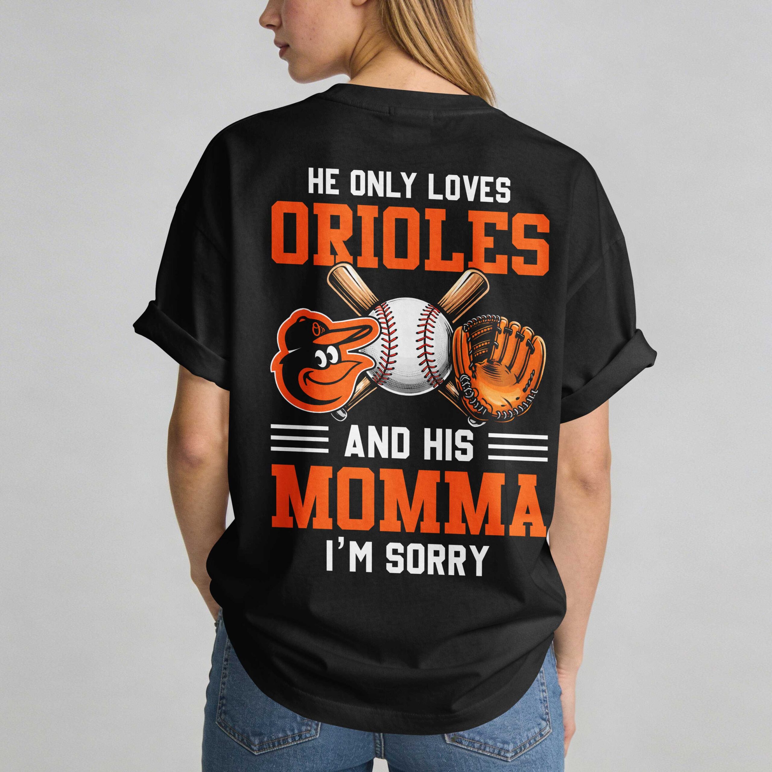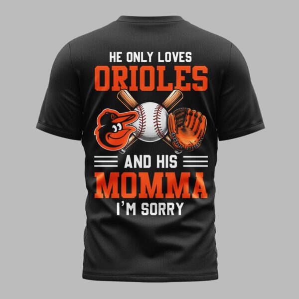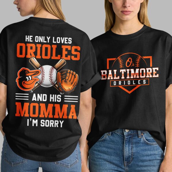 Show your ultimate loyalty to the Baltimore Orioles with this hilarious and heartfelt t-shirt! Perfect for the die-hard fan who knows where their true allegiances lie, right after mom, of course. This tee captures the fun spirit of game day and the undeniable bond with your favorite team, making it a must-have for any dedicated supporter. The front proudly displays the iconic O’s Baltimore Orioles logo, stylized with baseball stitches and set within a striking orange outline, capturing classic team pride. Turn heads as you walk away with the back design featuring the bold, witty statement HE ONLY LOVES ORIOLES AND HIS MOMMA I’M SORRY, accompanied by the spirited Orioles bird logo, crossed bats, a baseball, and a glove. This unique tee is ideal for cheering at the ballpark, family gatherings, or just showing off your baseball passion with a touch of humor. It’s the perfect conversation starter at any tailgate, a comfortable choice for everyday wear, or an unforgettable gift for the Orioles fan in your life.