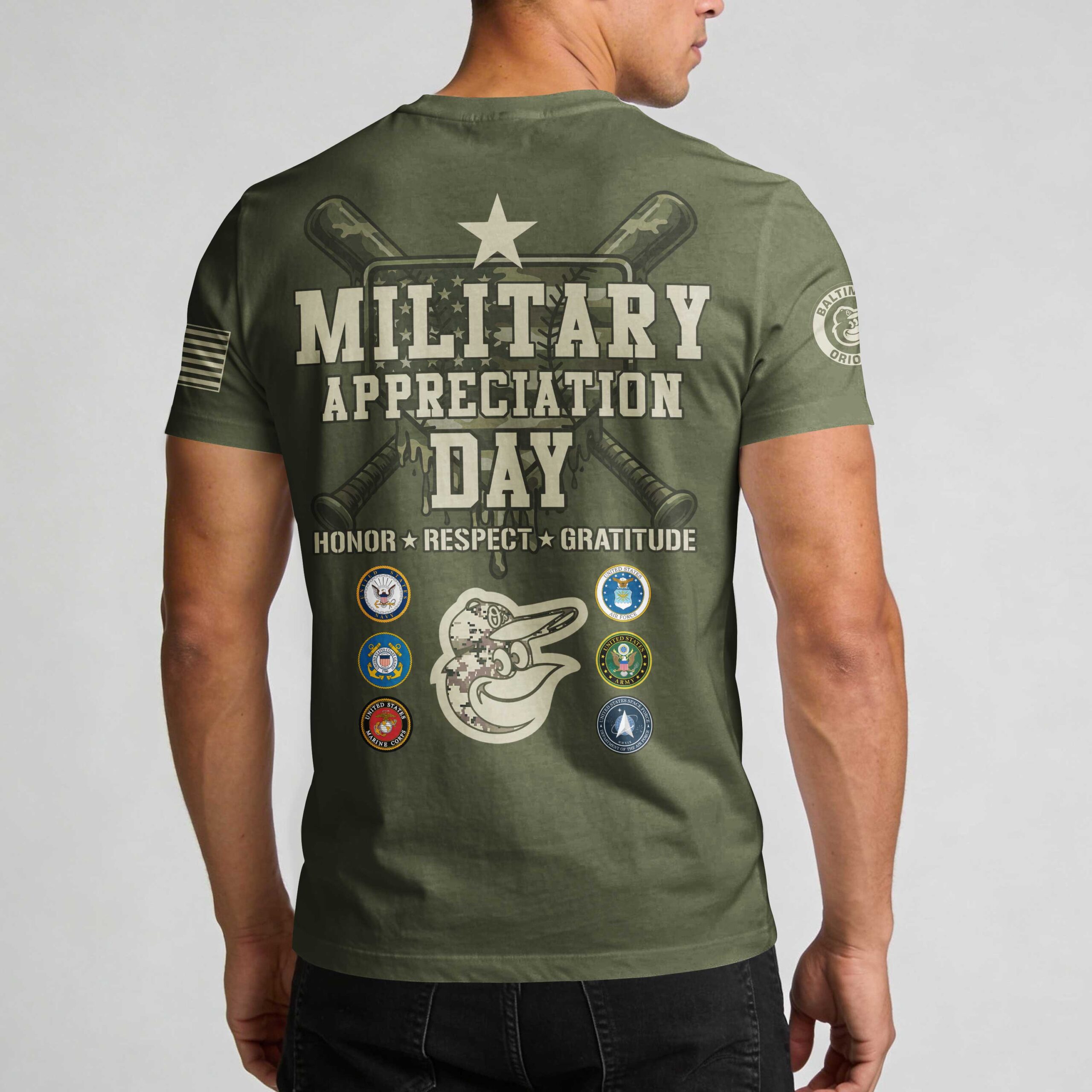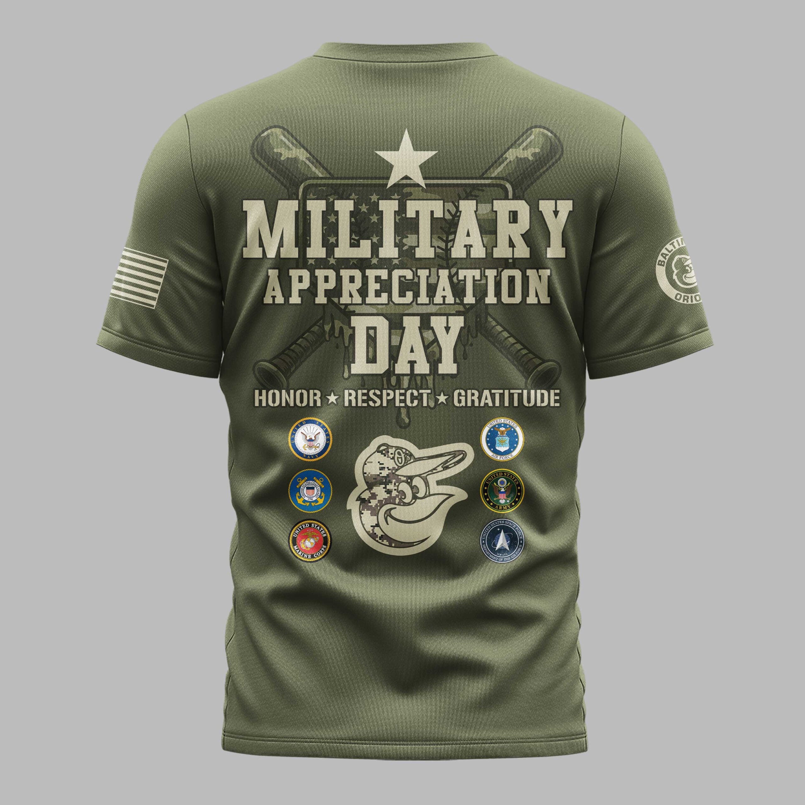 Show your unwavering support for the Baltimore Orioles and honor our nation’s heroes with this powerful Military Appreciation Day tee. It’s the perfect way to combine your love for baseball with a deep sense of national pride and gratitude for those who serve. The front proudly displays BALTIMORE ORIOLES in a striking digital camouflage print, complemented by a distressed American flag on the sleeve and the classic Orioles team logo. The back features a bold MILITARY APPRECIATION DAY message, flanked by crossed baseball bats, a star, and surrounded by the emblems of the U.S. military branches. A central Orioles bird head logo ties together this impactful design, finished with HONOR * RESPECT * GRATITUDE. Wear this distinctive shirt to the ballpark, on Veterans Day, Memorial Day, or any day you want to showcase your dual pride. It’s ideal for game days, parades, family gatherings, or simply as a daily testament to your respect for both your favorite team and the brave men and women of our armed forces.