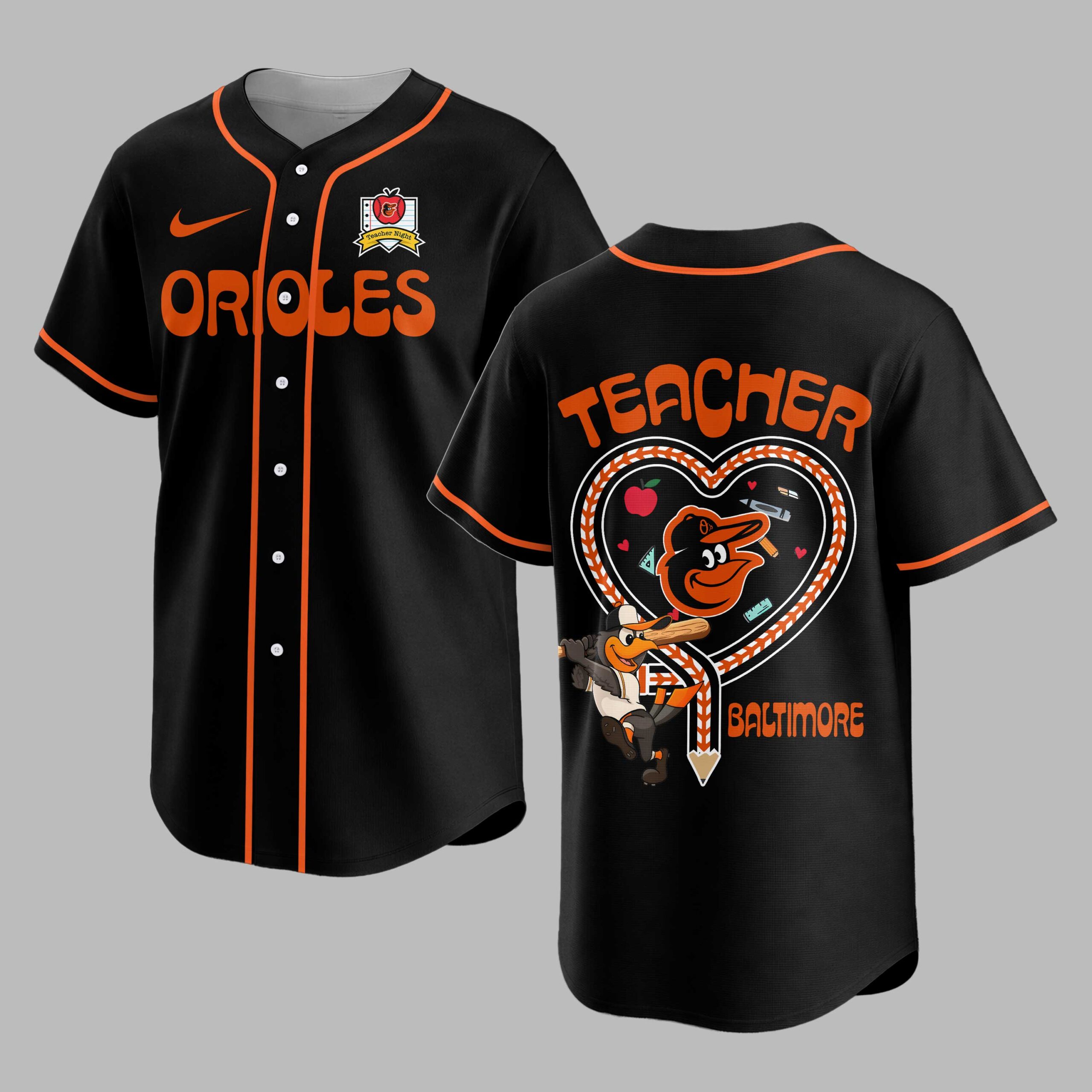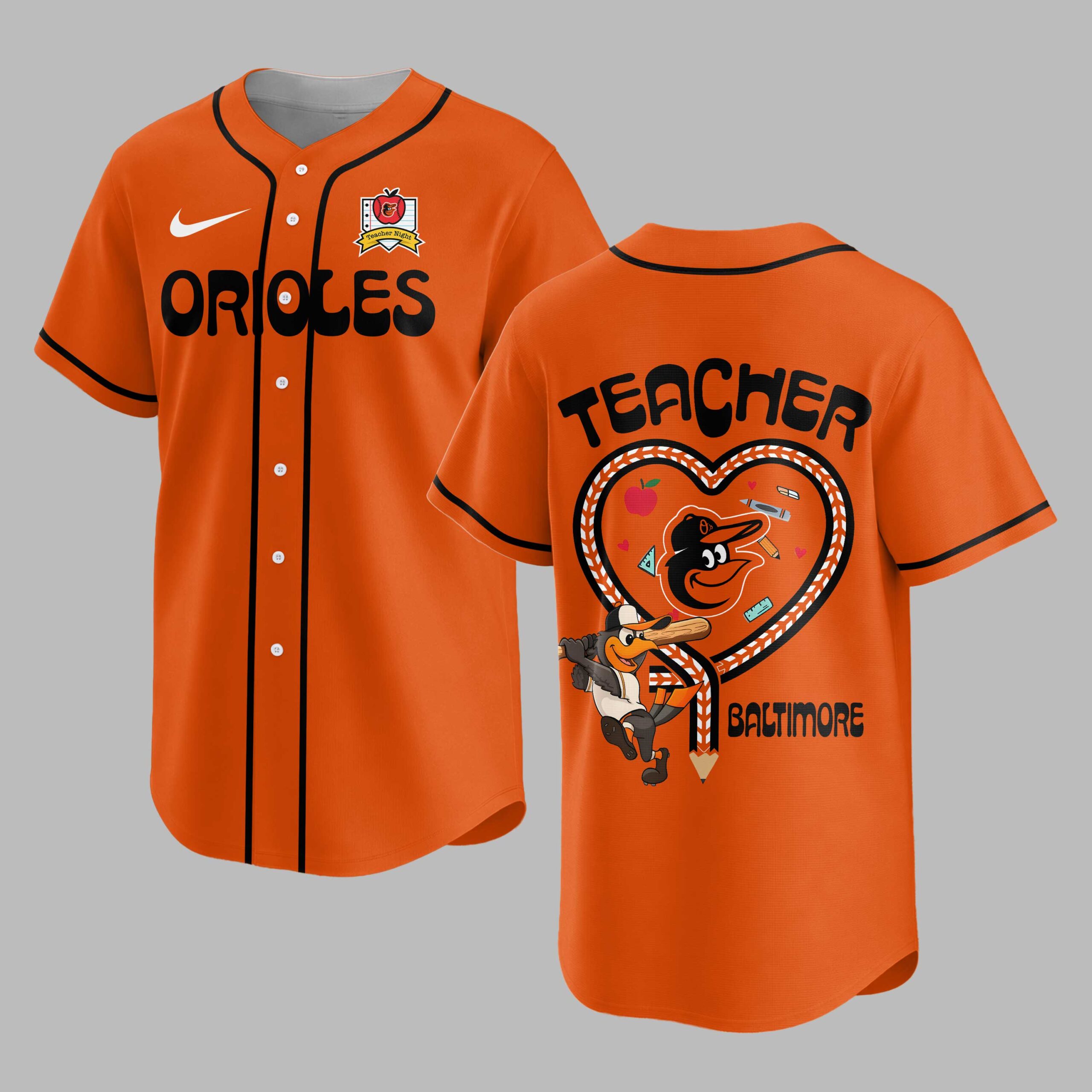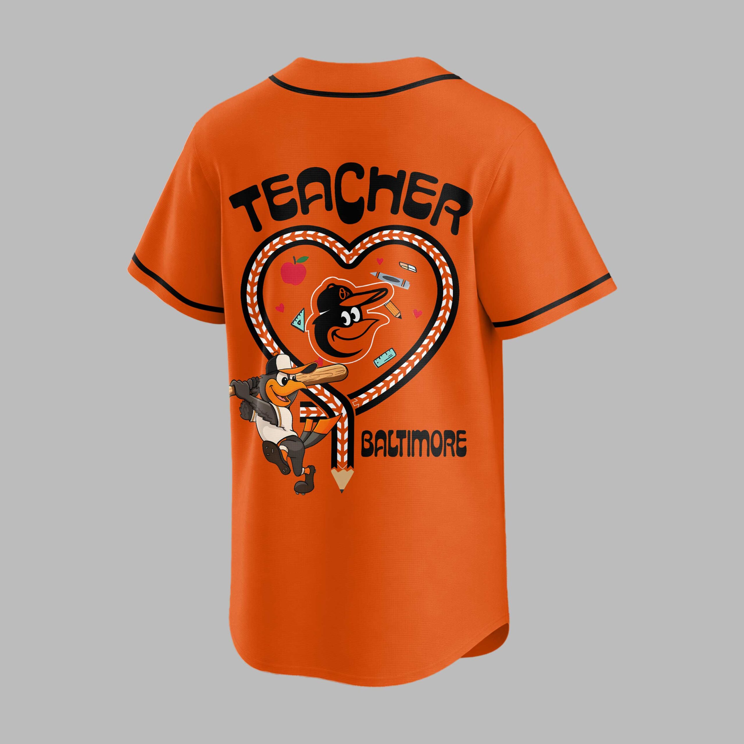 Celebrate your passion for teaching and your love for Baltimore baseball with this unique Orioles Teacher Night jersey! This special edition shirt beautifully blends your dedication to education with unwavering team spirit, making it the perfect way to show pride for your city and your profession. The front of the jersey boldly displays ORIOLES in vibrant orange, complemented by a subtle Teacher Night emblem featuring an apple and baseball. The back is a true standout, showcasing a striking TEACHER graphic above a heart outline crafted from baseball stitching, filled with fun school supply illustrations. The iconic Oriole Bird mascot, geared up with a bat, is prominently featured, with BALTIMORE proudly displayed below. Whether you’re cheering from the stands at Camden Yards, attending a school event, or simply enjoying a casual day out, this jersey is designed for the ultimate fan-educator. It’s a fantastic choice for Teacher Appreciation Day, game nights, or any occasion where you want to wear your heart (and your team spirit) on your sleeve.
