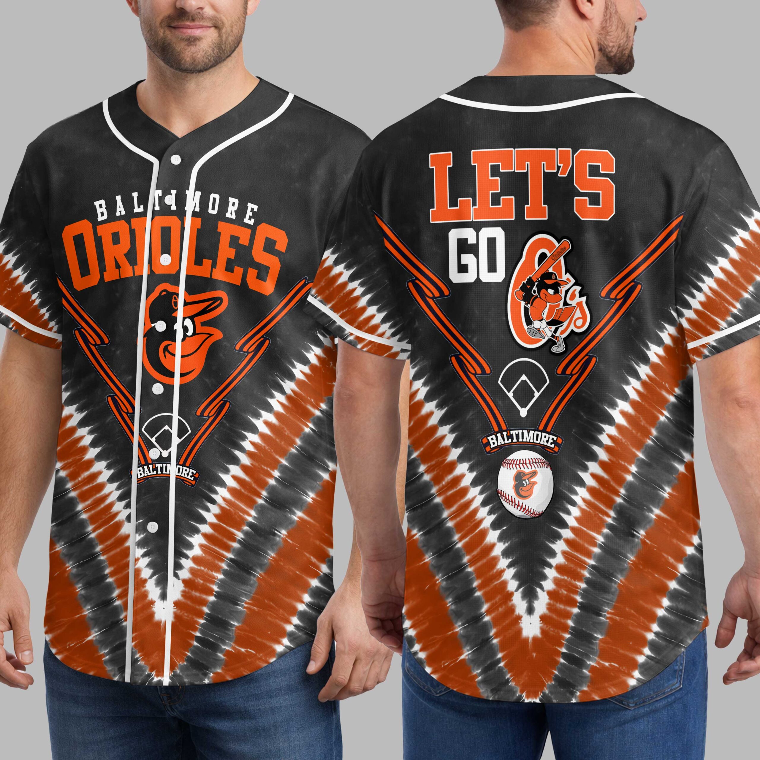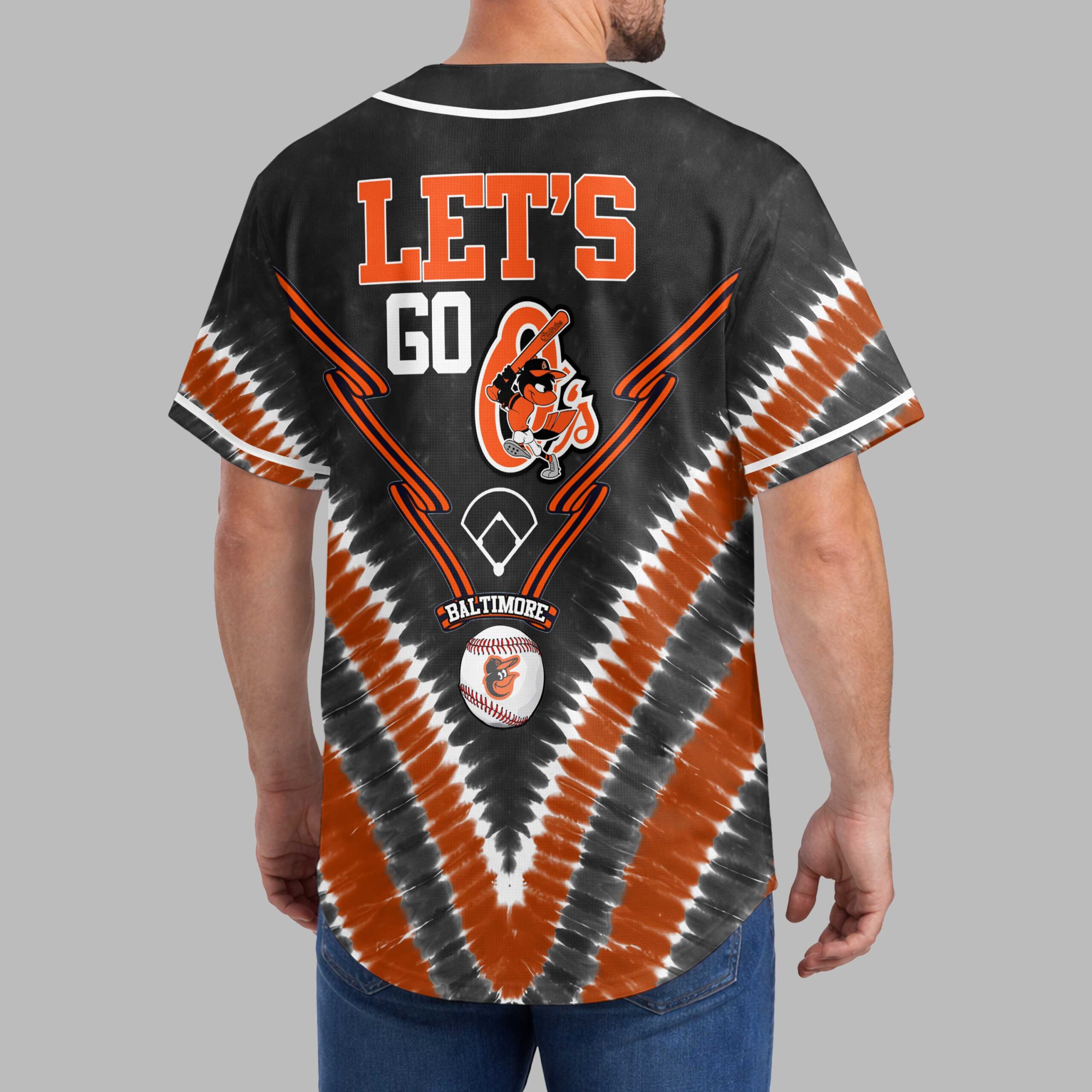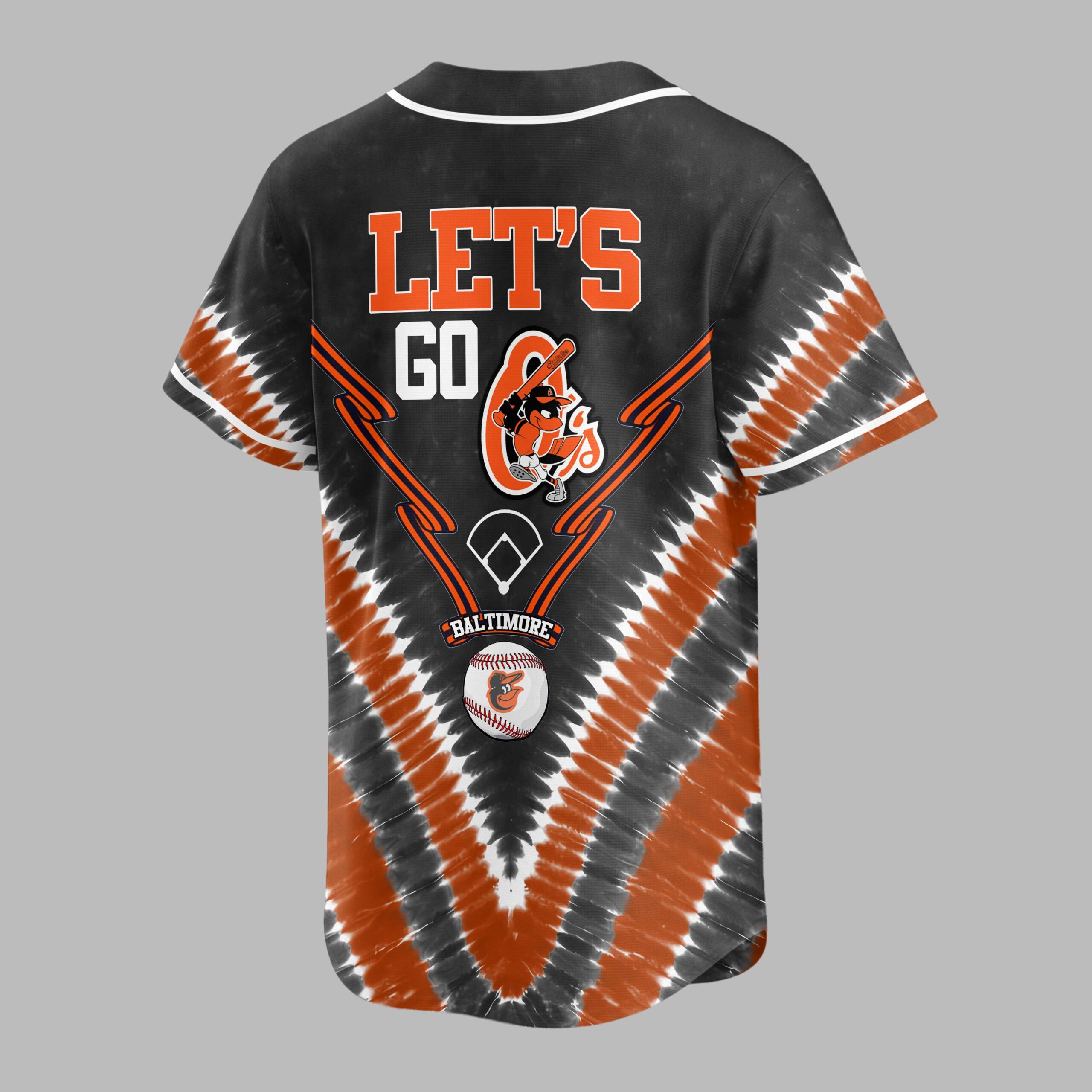 Unleash your team spirit with this dynamic Baltimore Orioles tie-dye baseball jersey! Perfect for showing your unwavering loyalty, this shirt blends classic fandom with a modern, energetic vibe. Cheer on the O’s in style and let everyone know your allegiance. The front features BALTIMORE ORIOLES in bold orange, along with the iconic bird logo and a baseball diamond. Orange and black speed lines enhance the action. The back continues the excitement with a vibrant LET’S GO declaration, showcasing the Orioles bird mascot ready to swing a bat. A distinctive black, orange, and white tie-dye pattern unifies the look. This unique jersey is ideal for game day at the ballpark, spirited watch parties, or any casual outing where you want to represent your favorite team. It’s more than a shirt; it’s a statement of pride, perfect for celebrating every hit, catch, and victory with your fellow Baltimore fans.