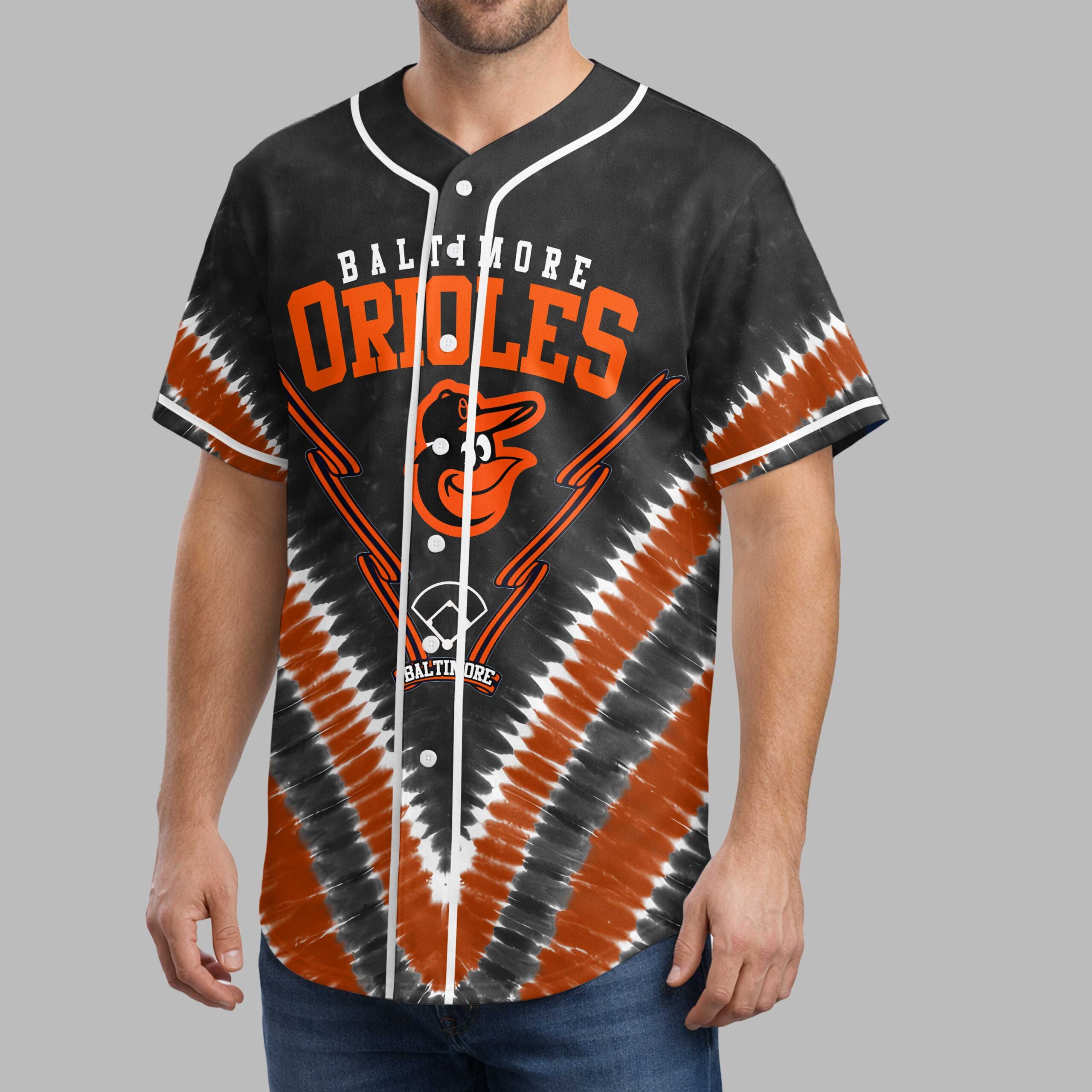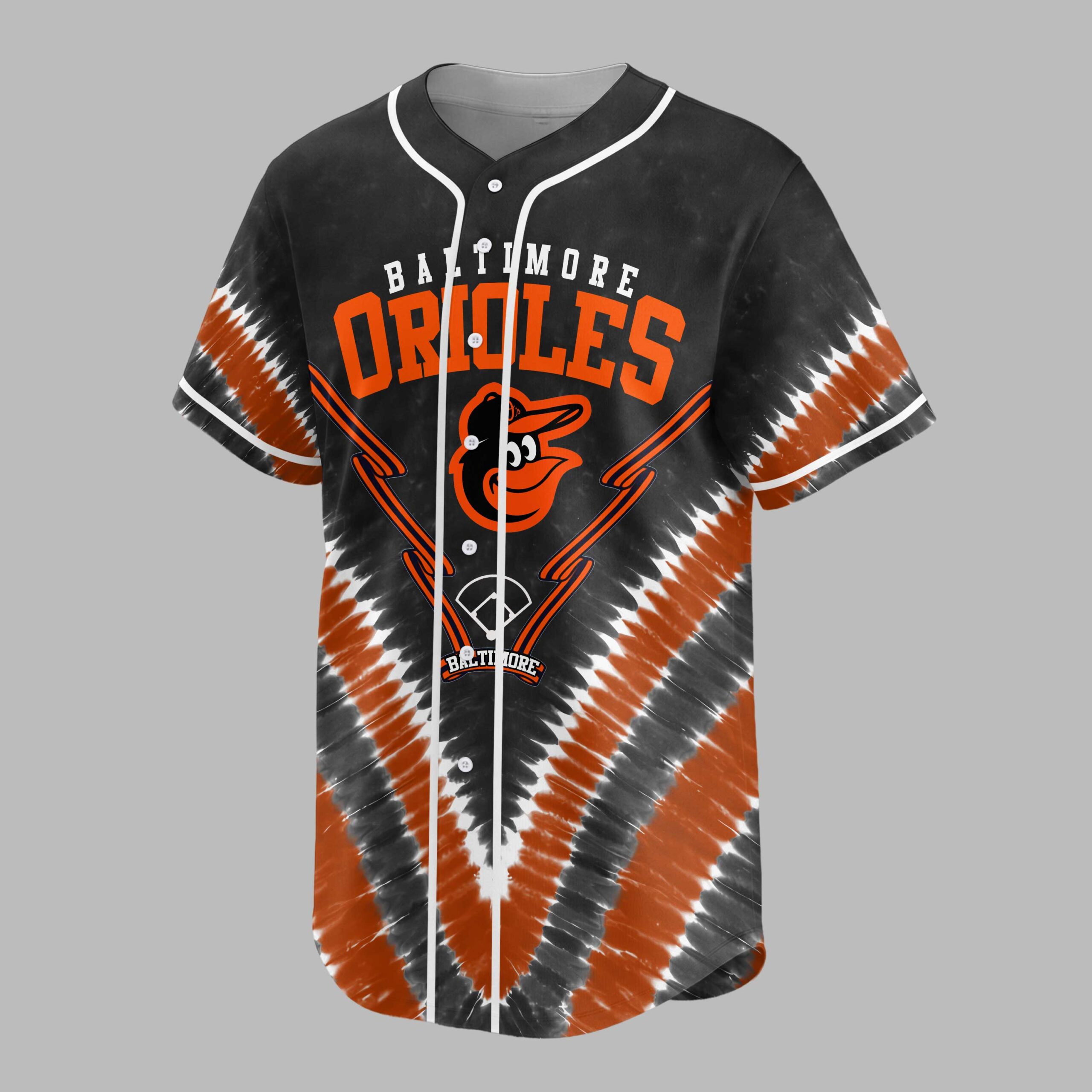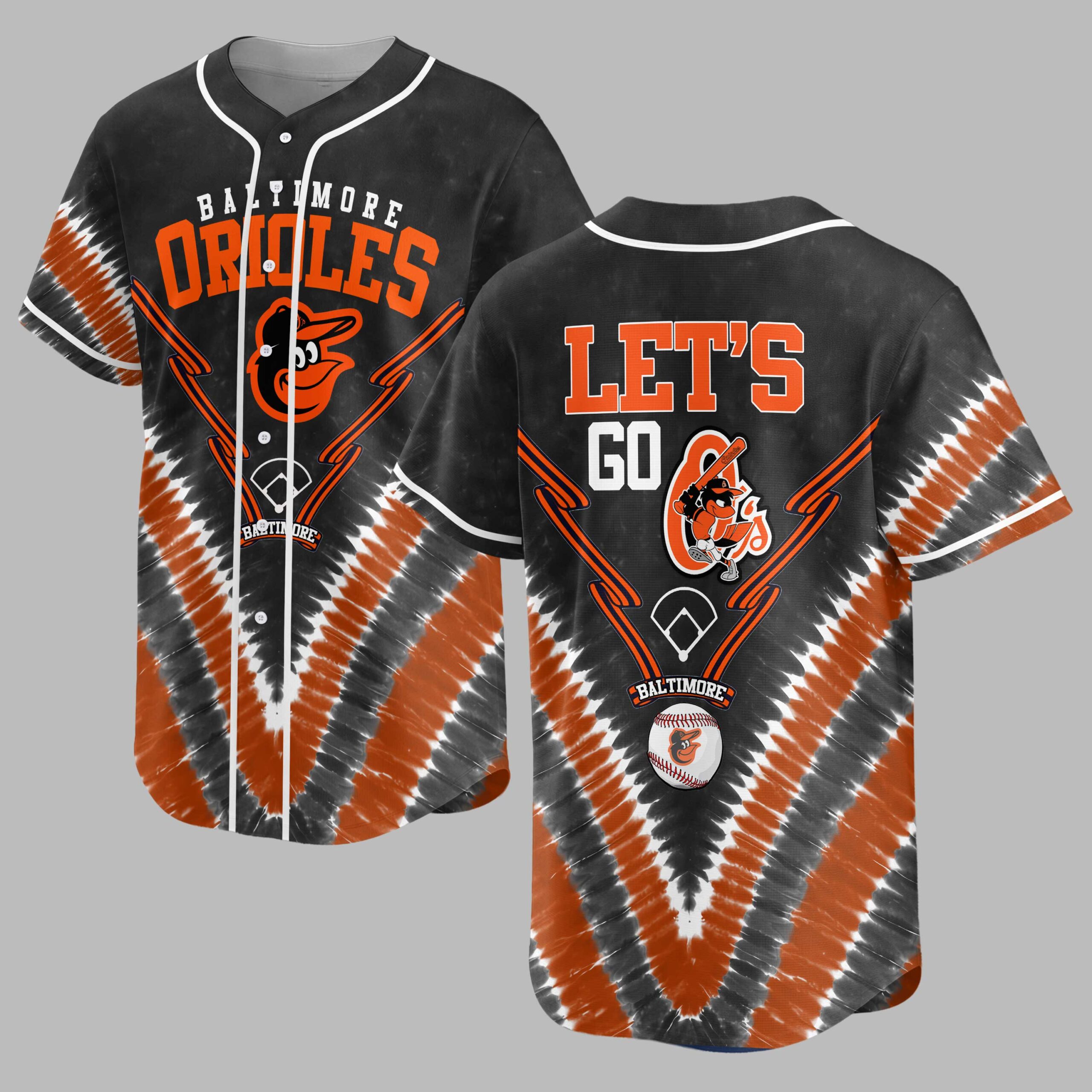 Unleash your team spirit with this dynamic Baltimore Orioles tie-dye baseball jersey! Perfect for showing your unwavering loyalty, this shirt blends classic fandom with a modern, energetic vibe. Cheer on the O’s in style and let everyone know your allegiance. The front features BALTIMORE ORIOLES in bold orange, along with the iconic bird logo and a baseball diamond. Orange and black speed lines enhance the action. The back continues the excitement with a vibrant LET’S GO declaration, showcasing the Orioles bird mascot ready to swing a bat. A distinctive black, orange, and white tie-dye pattern unifies the look. This unique jersey is ideal for game day at the ballpark, spirited watch parties, or any casual outing where you want to represent your favorite team. It’s more than a shirt; it’s a statement of pride, perfect for celebrating every hit, catch, and victory with your fellow Baltimore fans.