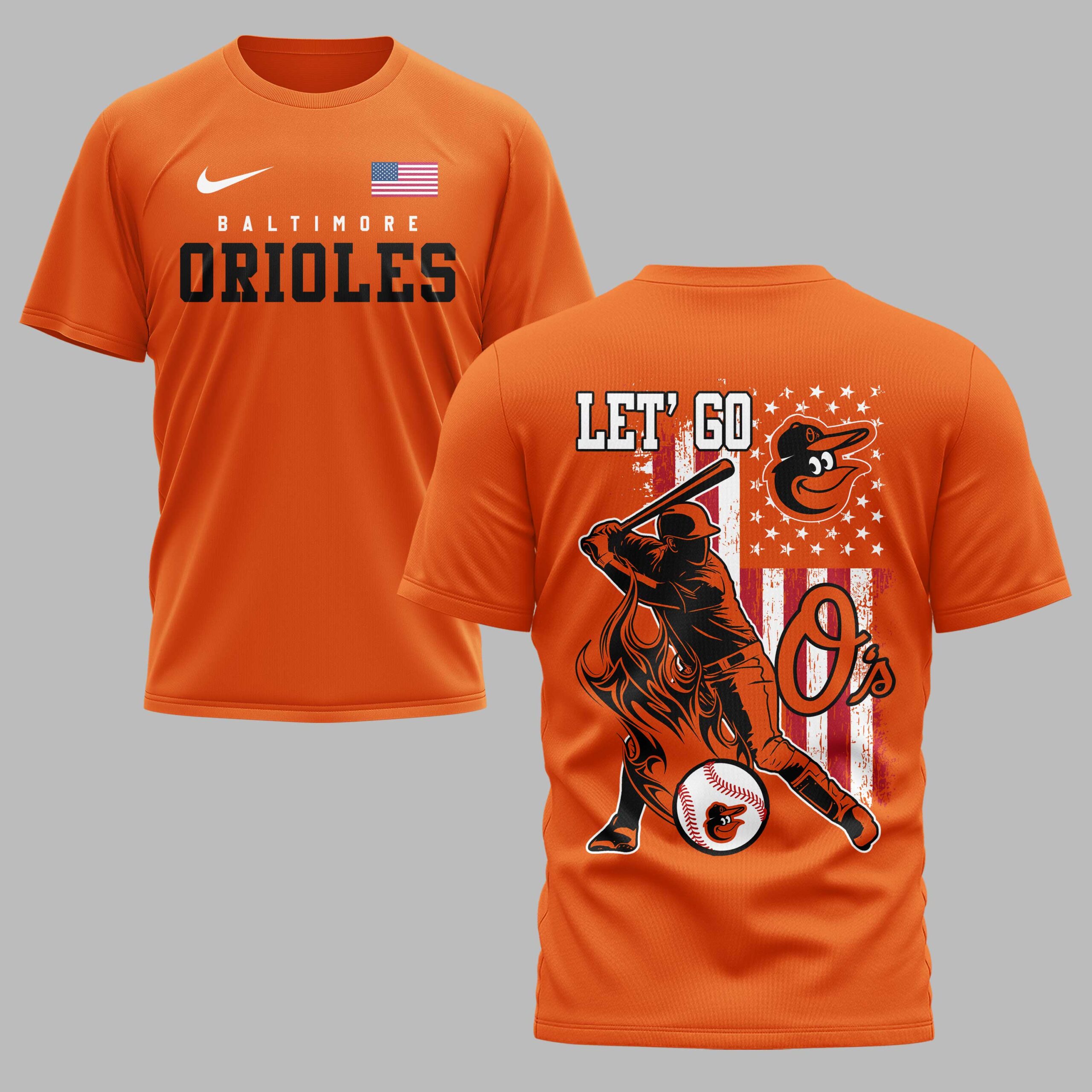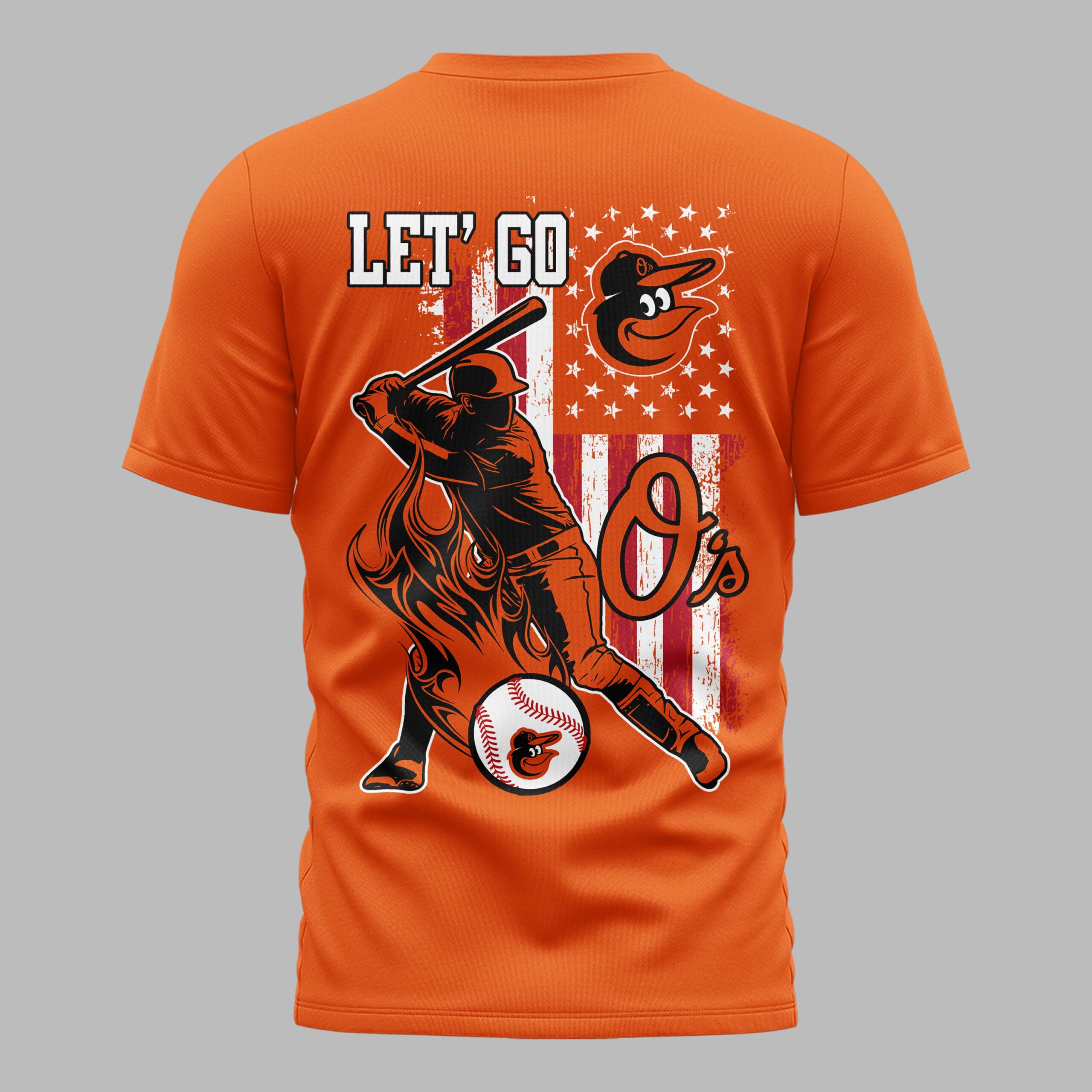 Step up to the plate and show your unwavering support for Baltimore baseball with this dynamic fan tee! Perfectly blending team spirit with a touch of patriotic pride, this shirt is designed for every dedicated Orioles supporter ready to cheer their team to victory. The front of the shirt proudly displays BALTIMORE ORIOLE in bold orange lettering, complemented by a subtle American flag accent. The reverse erupts with energy, featuring a powerful batter mid-swing against a striking, distressed American flag backdrop. LET’ GO rallies above the iconic Orioles bird mascot, while a fiery O’s logo and a baseball graphic complete this spirited design. Whether you’re chanting from the stands at the ballpark, hosting a gameday barbecue, or simply showcasing your devotion around town, this tee is your ultimate expression of fandom. It’s the ideal choice for any true fan looking to celebrate Baltimore baseball with pride and passion.