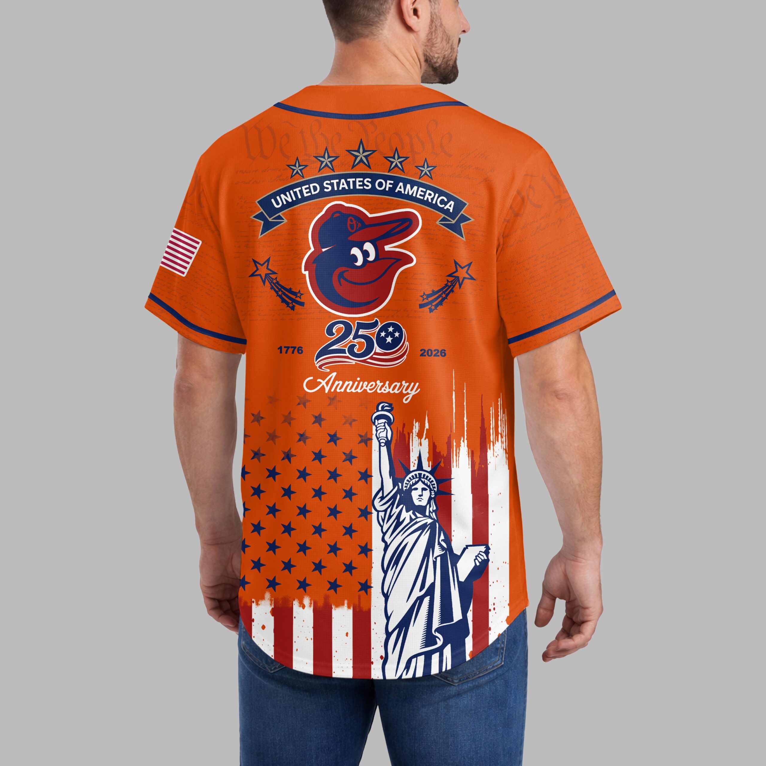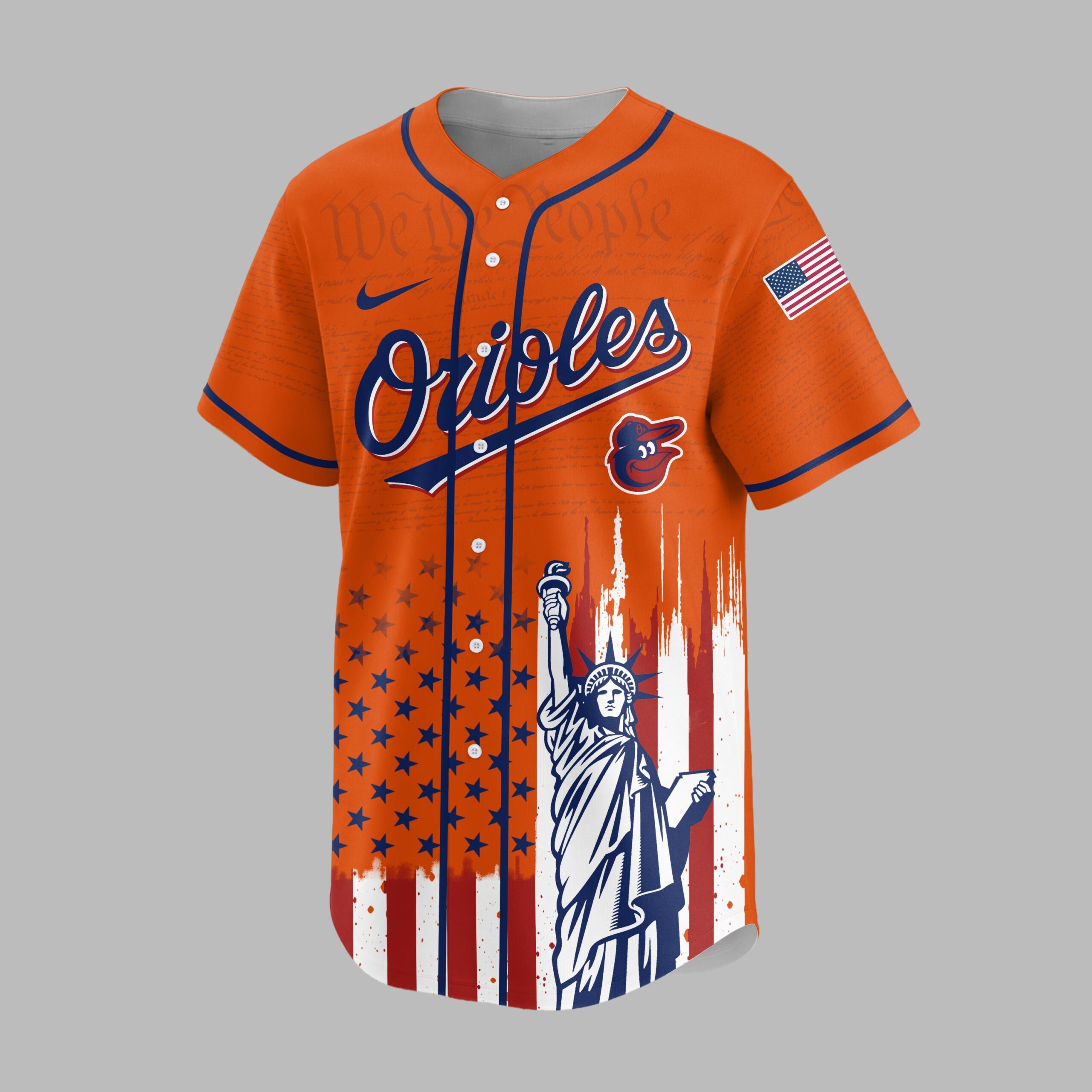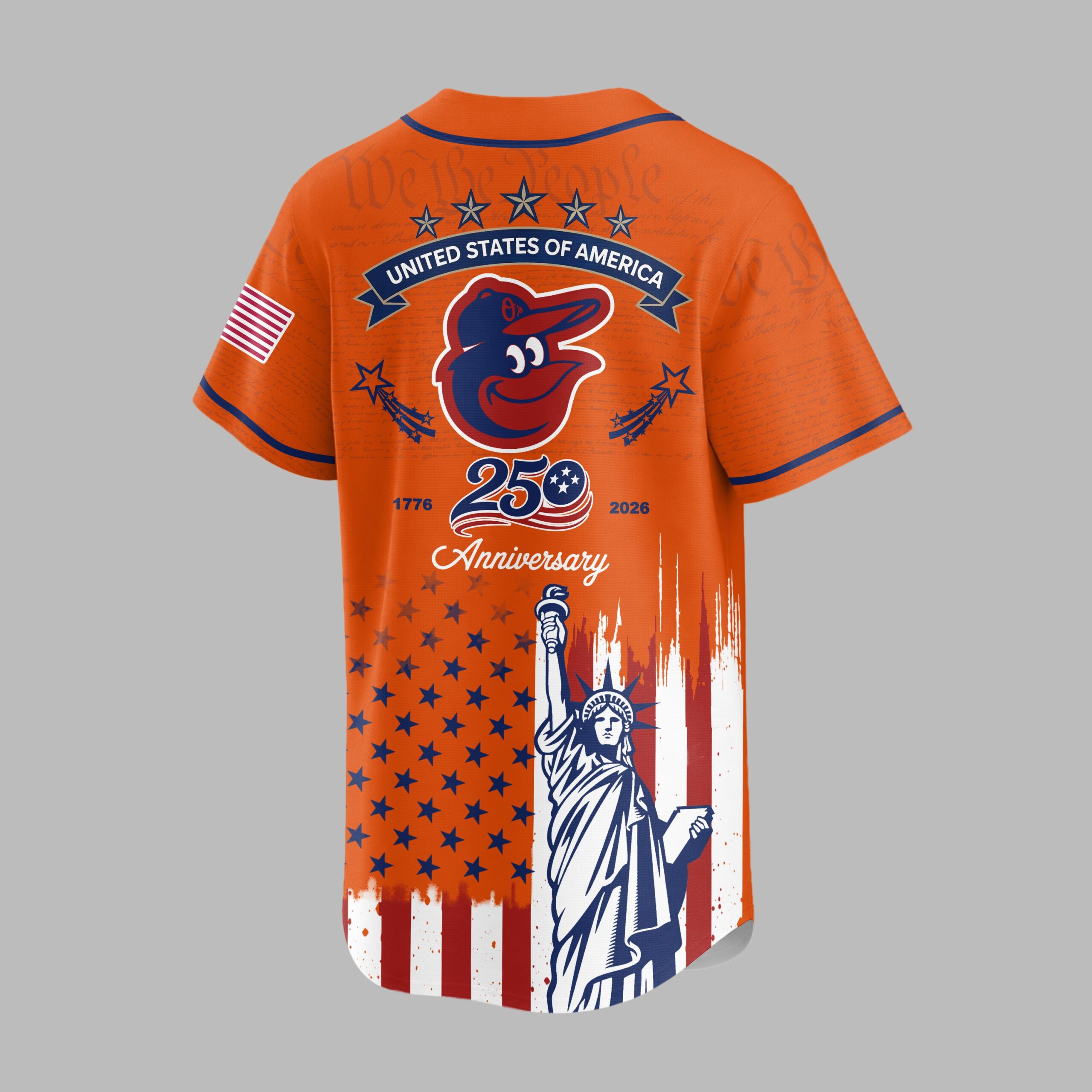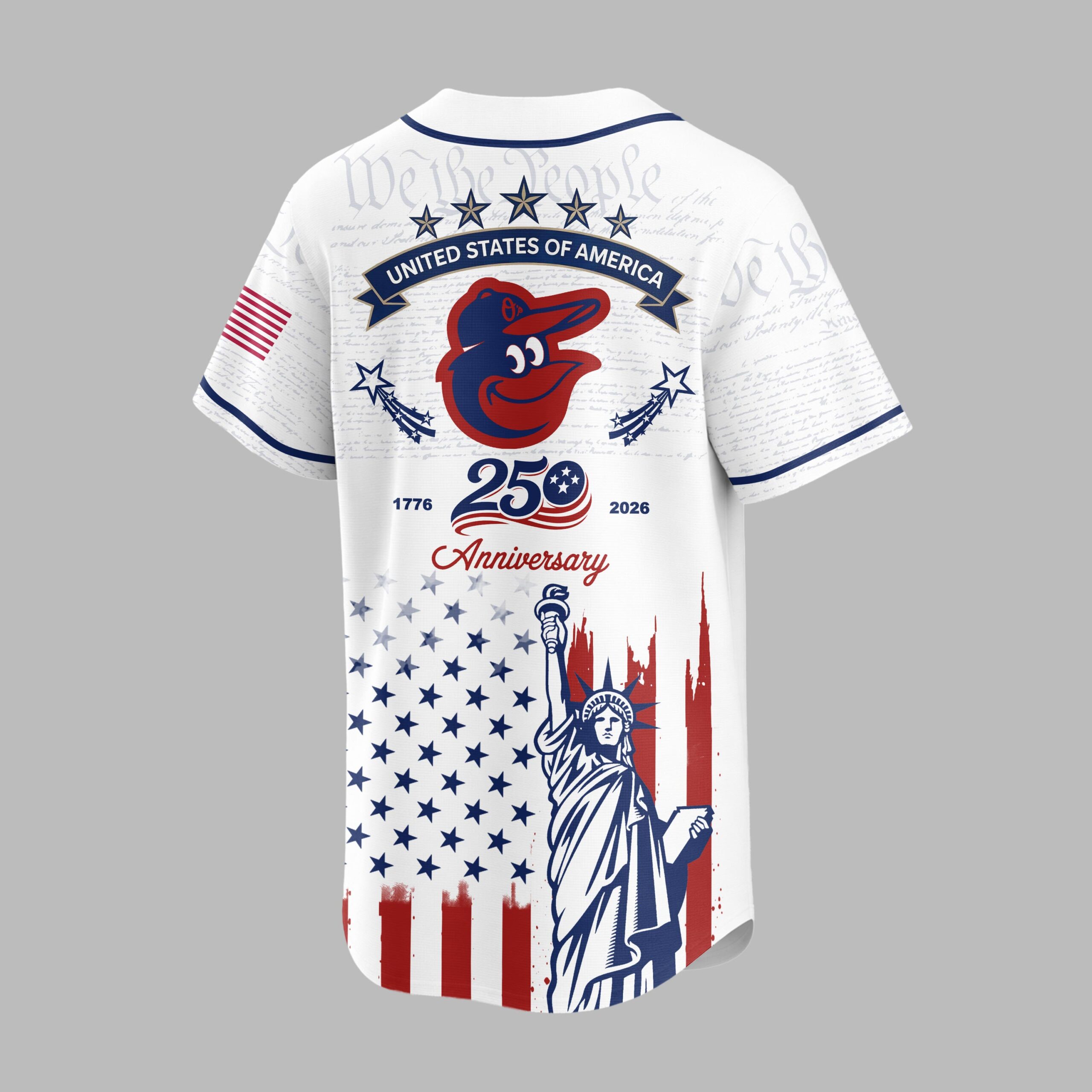 Show your unwavering support for the Baltimore Orioles and a deep reverence for American history with this extraordinary patriotic baseball jersey. This unique design beautifully blends your love for baseball with a profound celebration of the nation’s 250th anniversary, making it a truly special addition for any fan. The front proudly displays the iconic ‘Orioles’ script and cheerful bird logo, subtly layered over historic ‘We the People’ text, representing the foundation of our nation. Below, the distressed Stars and Stripes perfectly frame the majestic Statue of Liberty. Turn around to reveal a powerful tribute on the back: an American flag patch, ‘STATES OF AMERICA’ banner, and the Orioles bird, all commemorating the ‘1776 250 2026 Anniversary’. The same inspiring flag and Statue of Liberty design continue on the back. This unique jersey is ideal for cheering on the Orioles at the ballpark, celebrating patriotic holidays like the Fourth of July and Memorial Day, or simply showcasing your American spirit every day. It’s more than just a jersey; it’s a bold statement of pride for your team and your country.