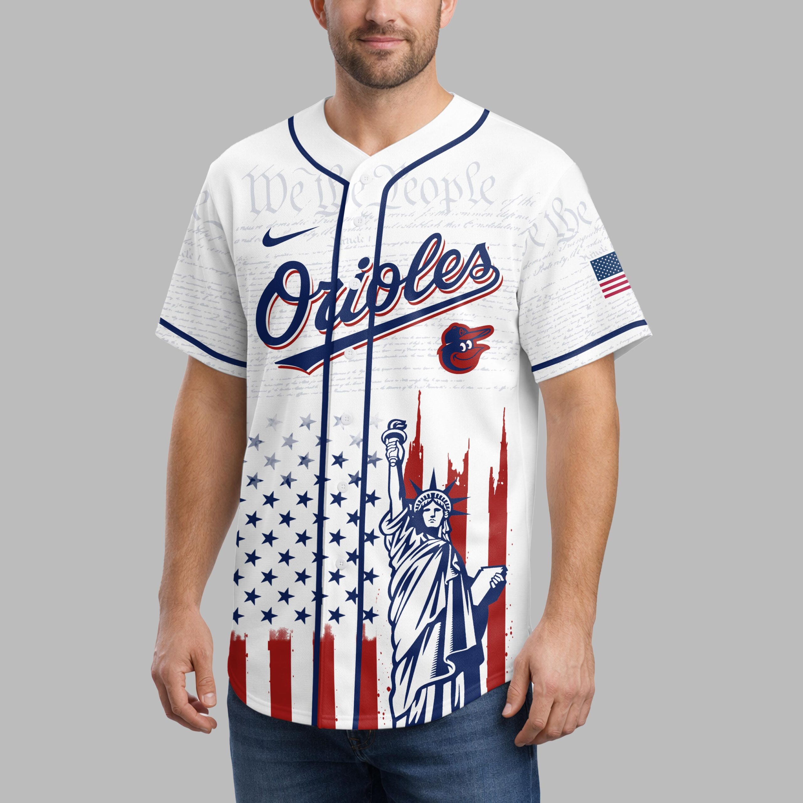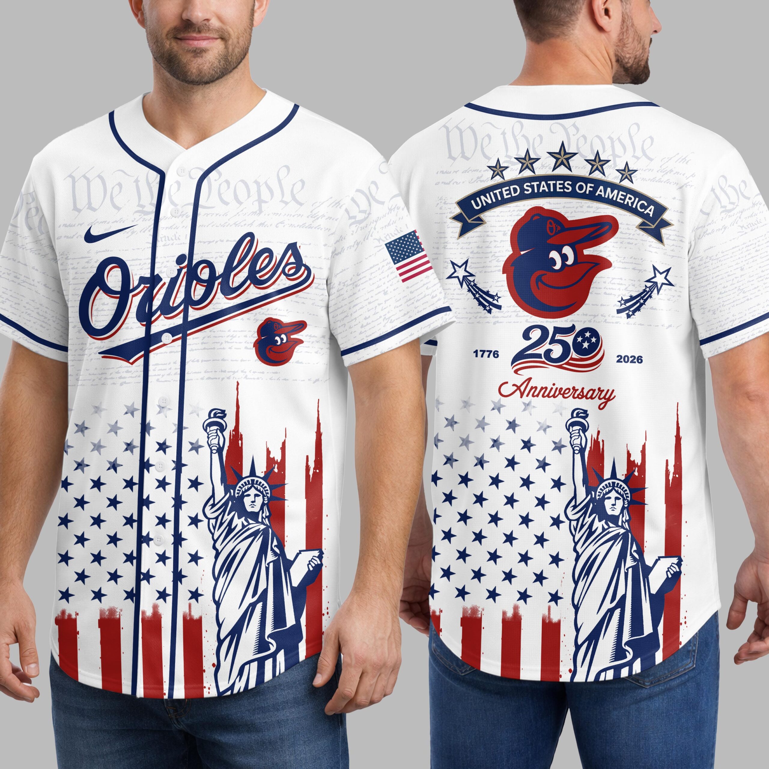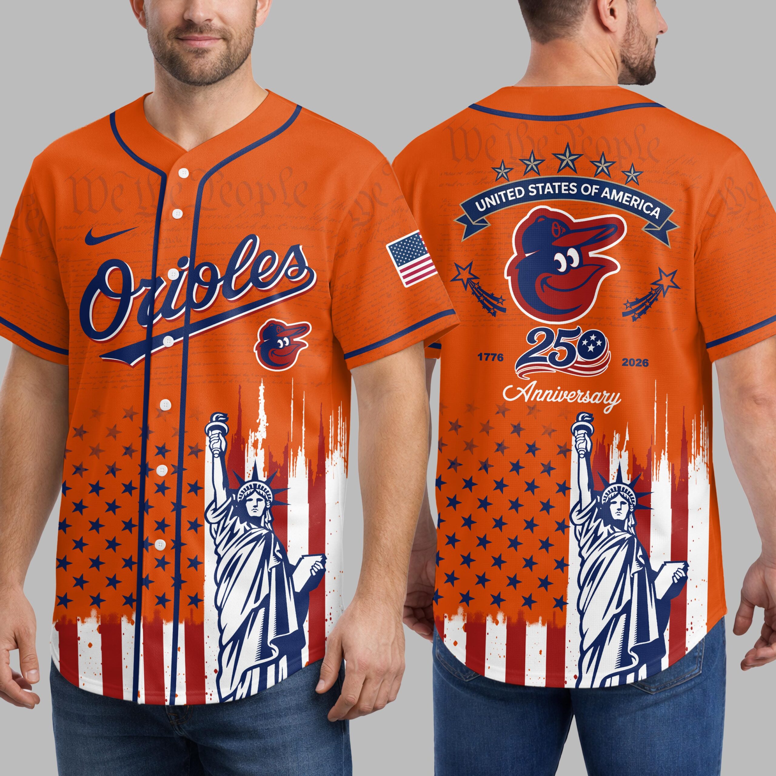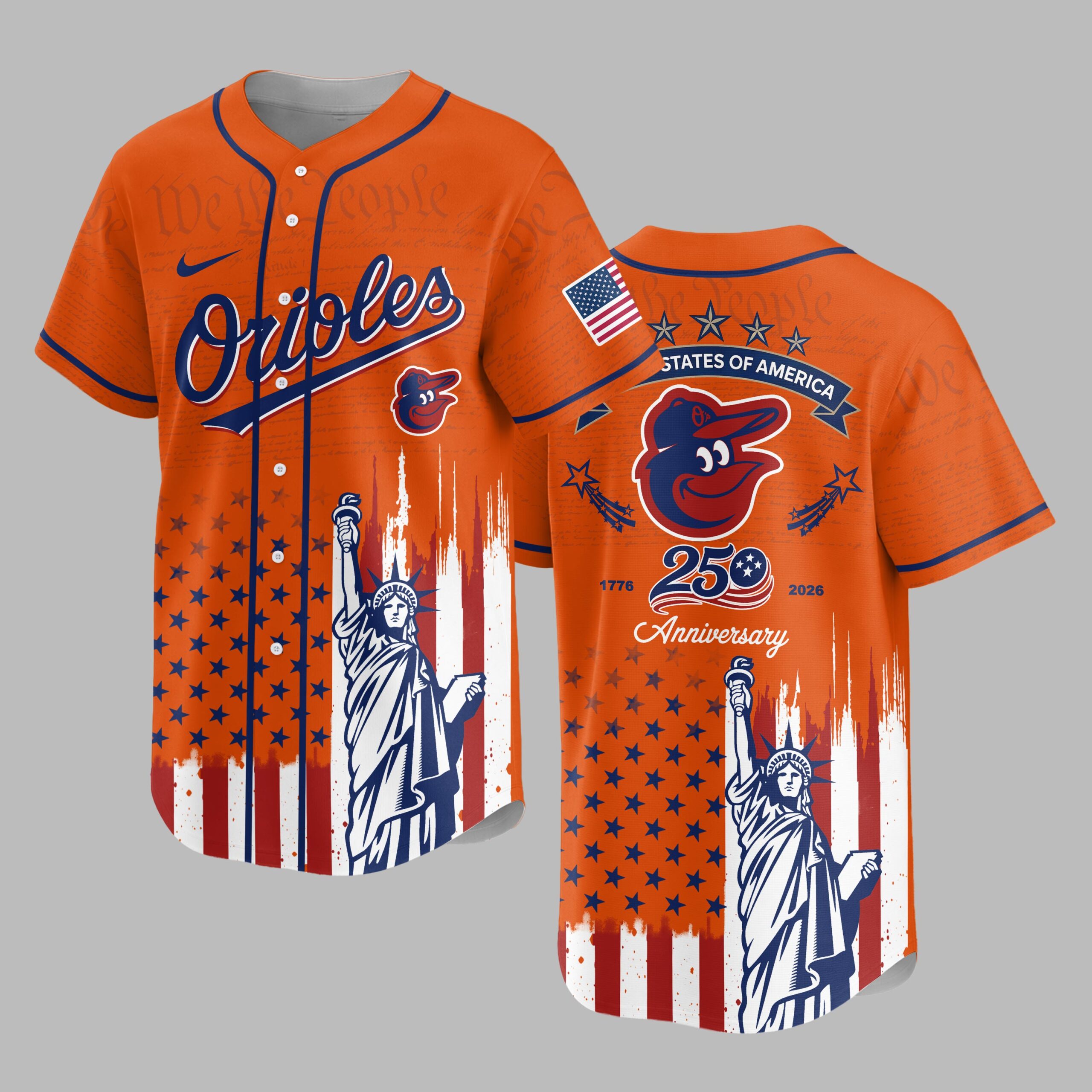 Show your unwavering support for the Baltimore Orioles and a deep reverence for American history with this extraordinary patriotic baseball jersey. This unique design beautifully blends your love for baseball with a profound celebration of the nation’s 250th anniversary, making it a truly special addition for any fan. The front proudly displays the iconic ‘Orioles’ script and cheerful bird logo, subtly layered over historic ‘We the People’ text, representing the foundation of our nation. Below, the distressed Stars and Stripes perfectly frame the majestic Statue of Liberty. Turn around to reveal a powerful tribute on the back: an American flag patch, ‘STATES OF AMERICA’ banner, and the Orioles bird, all commemorating the ‘1776 250 2026 Anniversary’. The same inspiring flag and Statue of Liberty design continue on the back. This unique jersey is ideal for cheering on the Orioles at the ballpark, celebrating patriotic holidays like the Fourth of July and Memorial Day, or simply showcasing your American spirit every day. It’s more than just a jersey; it’s a bold statement of pride for your team and your country.