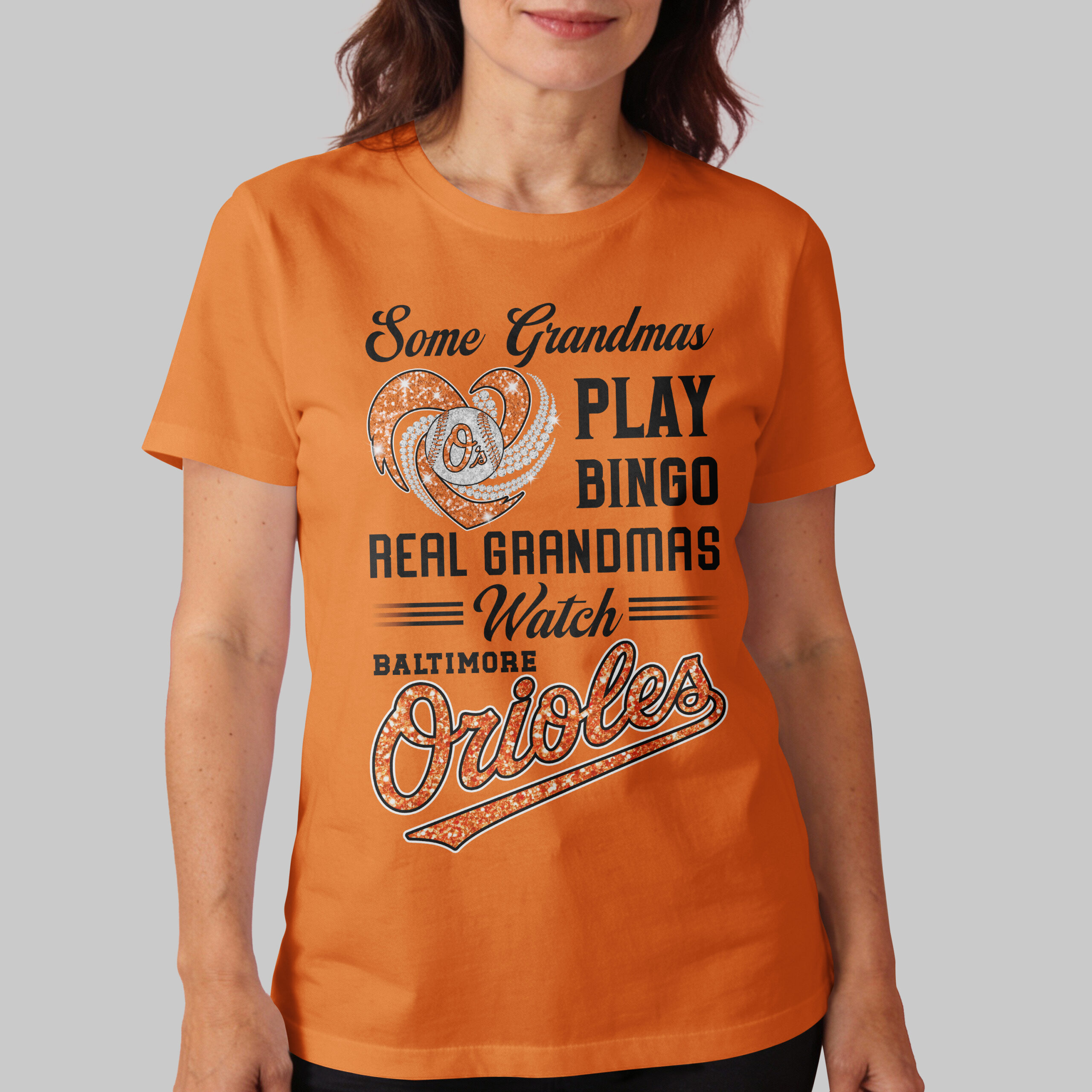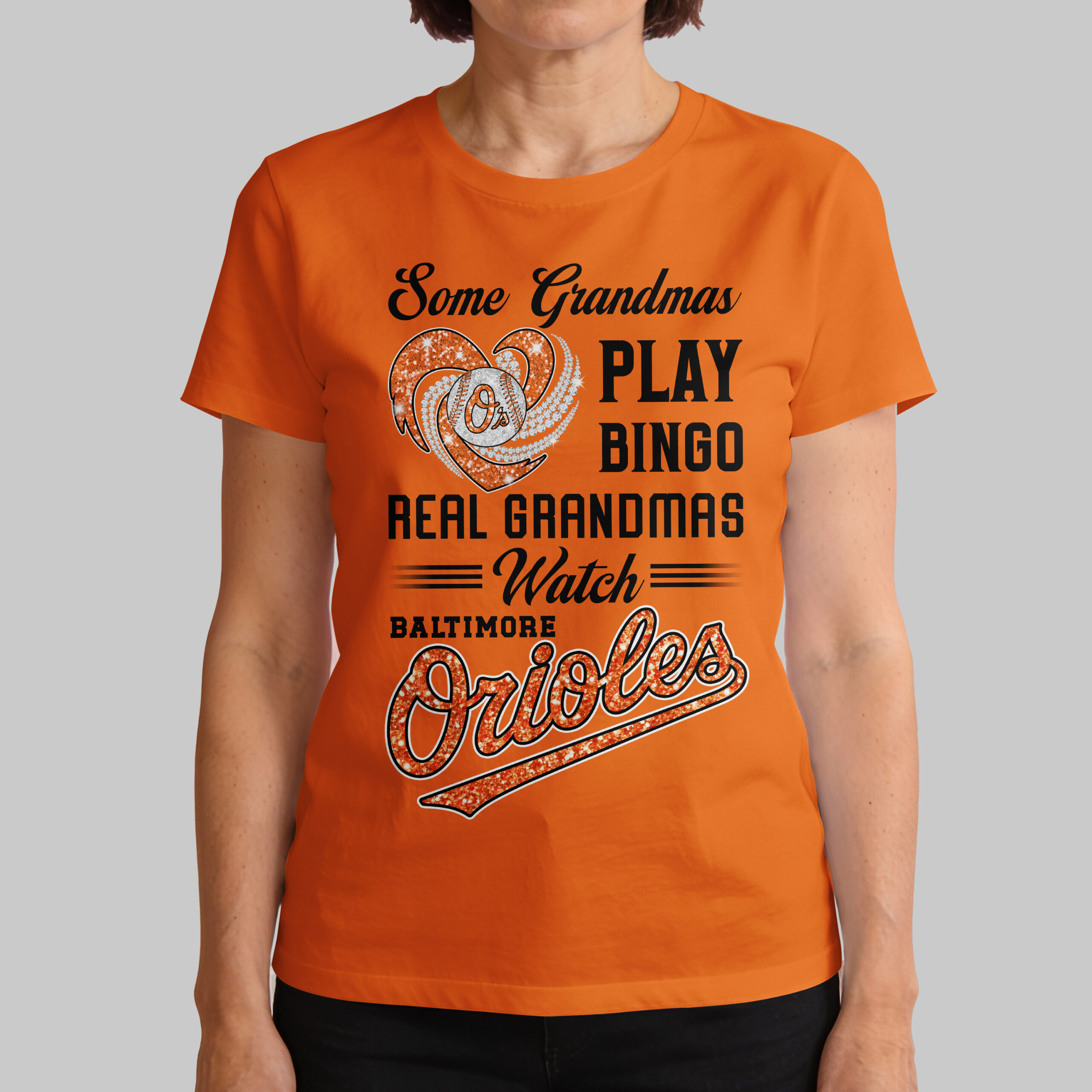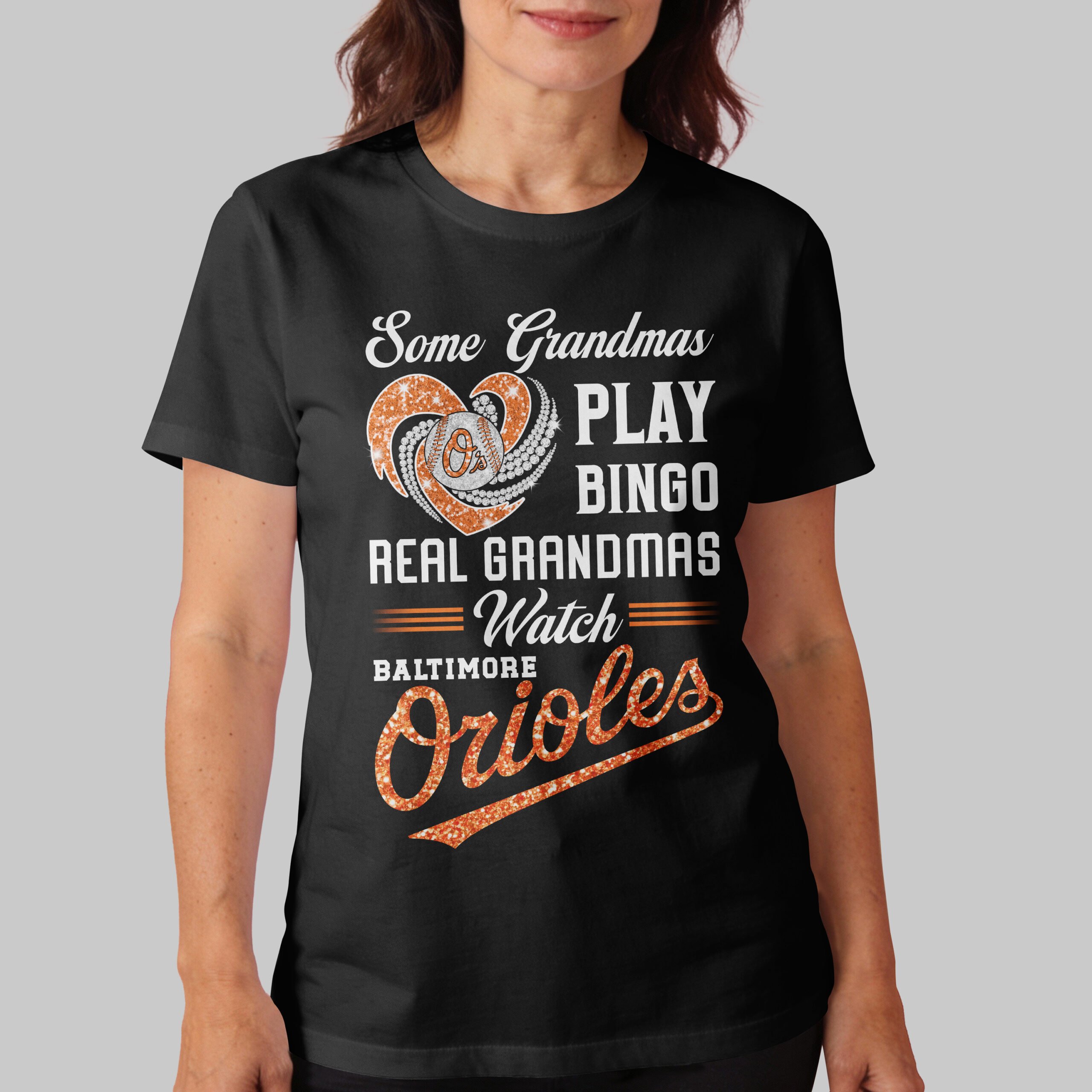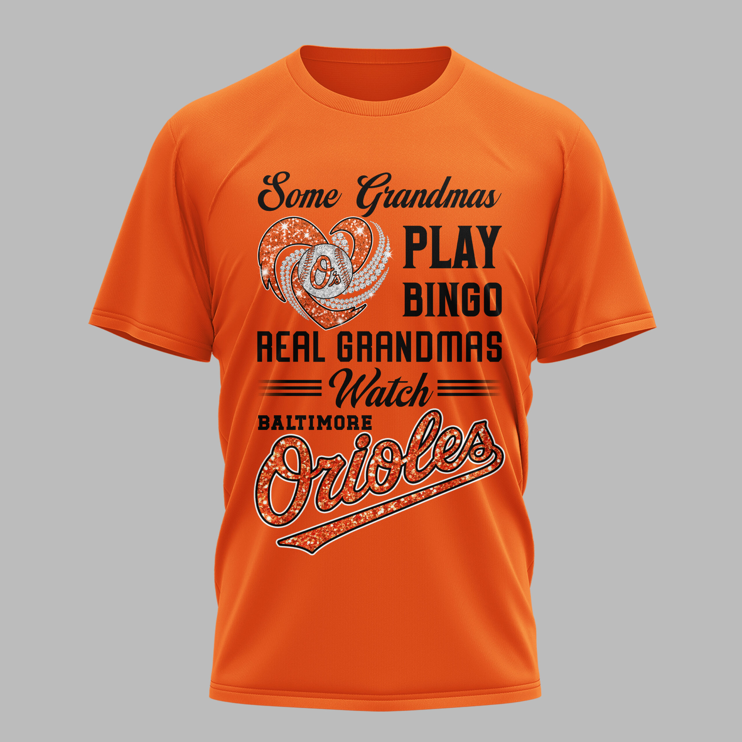 Calling all proud Baltimore Orioles grandmas! If your idea of a good time involves cheering on your favorite baseball team rather than a bingo hall, this spirited tee is tailor-made for you. Show off your unwavering loyalty and playful humor with a design that truly celebrates your dedication to the game. This dazzling black tee proudly features a sparkling heart, bursting with vibrant orange glitter and shimmering silver accents, perfectly framing a classic Orioles baseball. The bold declaration, Some Grandmas PLAY BINGO REAL GRANDMAS Watch BALTIMORE Orioles, is prominently displayed in a mix of elegant white script and eye-catching, glitter-infused orange lettering, making a spirited statement that can’t be missed. Perfect for game day at Oriole Park at Camden Yards, family gatherings, or simply showing off your true team spirit around town. This shirt lets everyone know where your true loyalties lie, celebrating the grandmas who live and breathe Orioles baseball with every play.