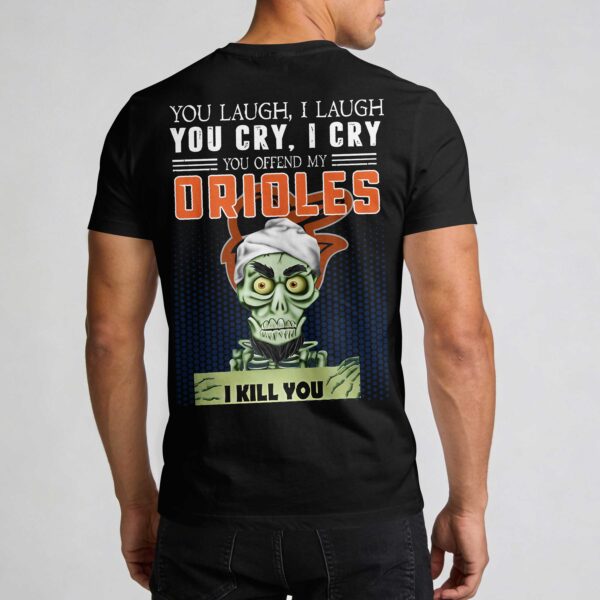 Showcase your unwavering loyalty to Baltimore with a shirt that speaks as loud as the crowd at Camden Yards. This design perfectly captures the fierce spirit of an Orioles fan, blending intense team pride with a bold theme that stands out during any patriotic gathering or national holiday celebration. The front displays a sharp O’s logo in classic orange on the chest. The back makes a powerful statement with a humorous graphic featuring an iconic skeleton character. Accompanied by the text You offend my Orioles, I kill you and the team name in vibrant block letters, your dedication to the team is unmistakable. Perfect for cheering at the ballpark, attending Independence Day festivities, or hanging out with fellow fans, this shirt is a must-have. It’s a fun, high-energy way to represent the Birds while showing off your unique sense of humor and love for Baltimore baseball every day.