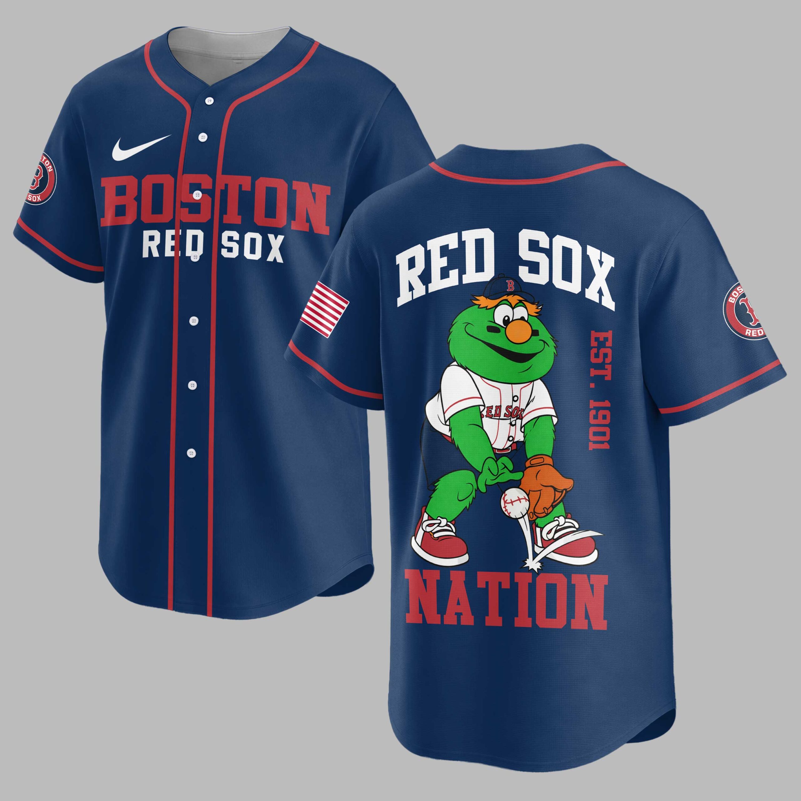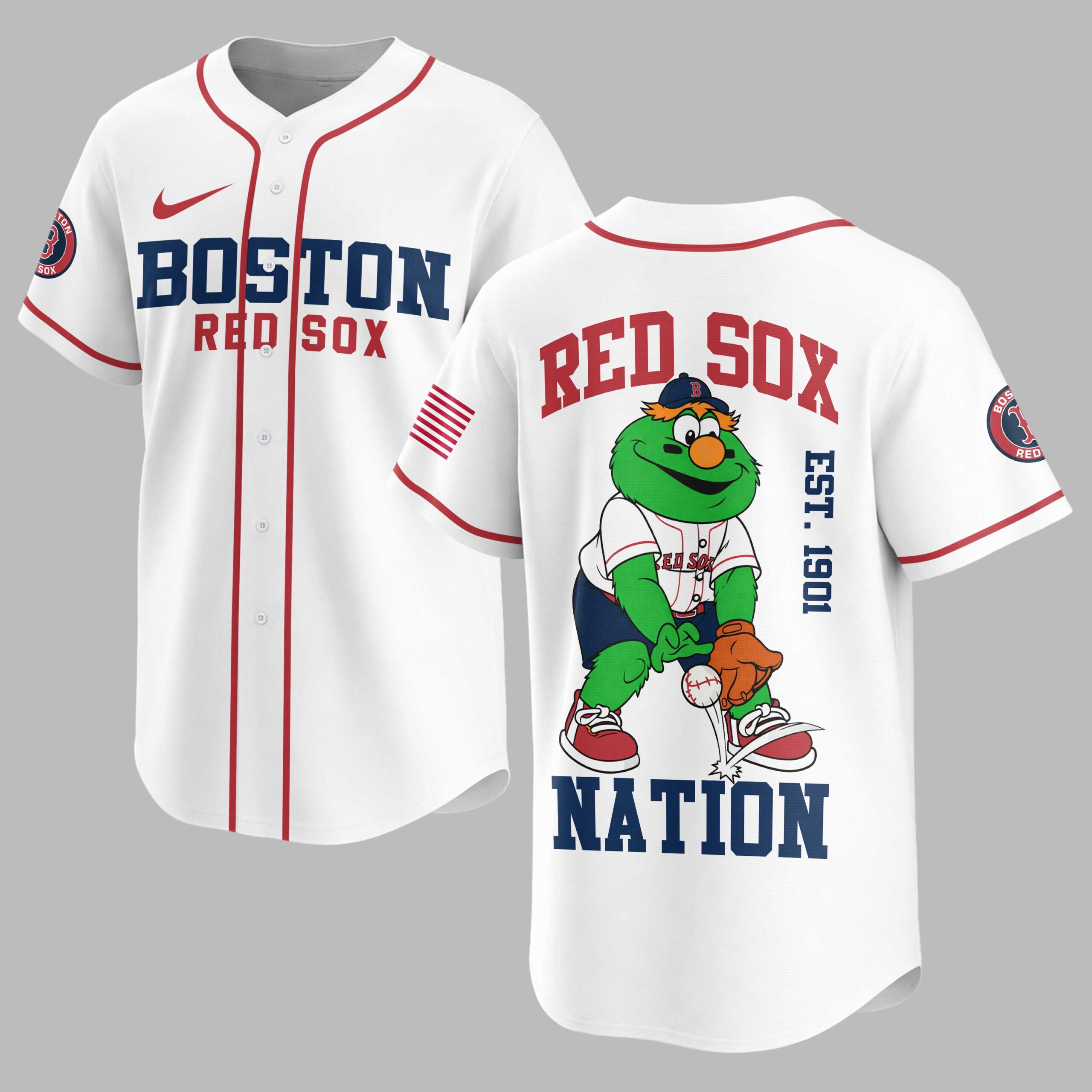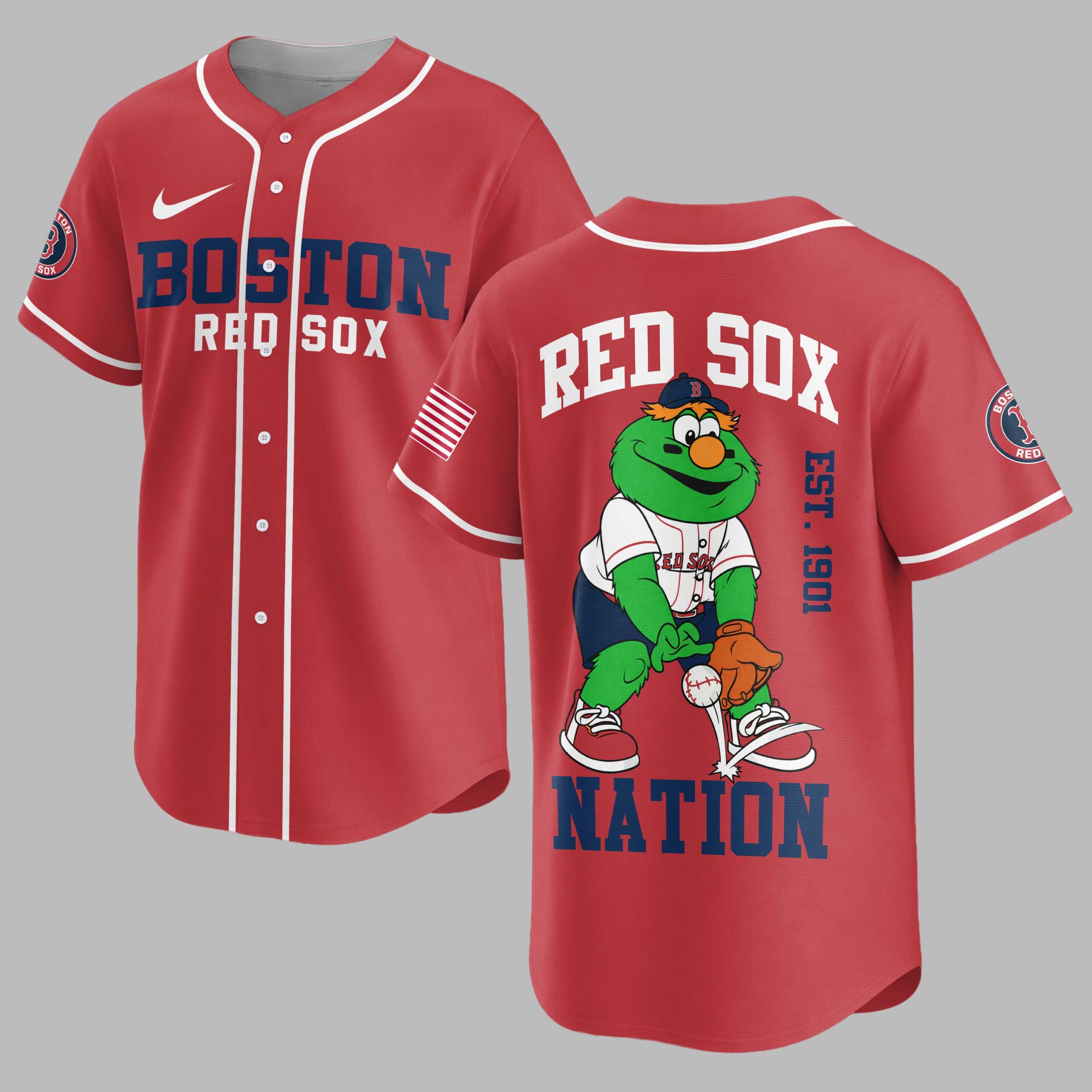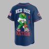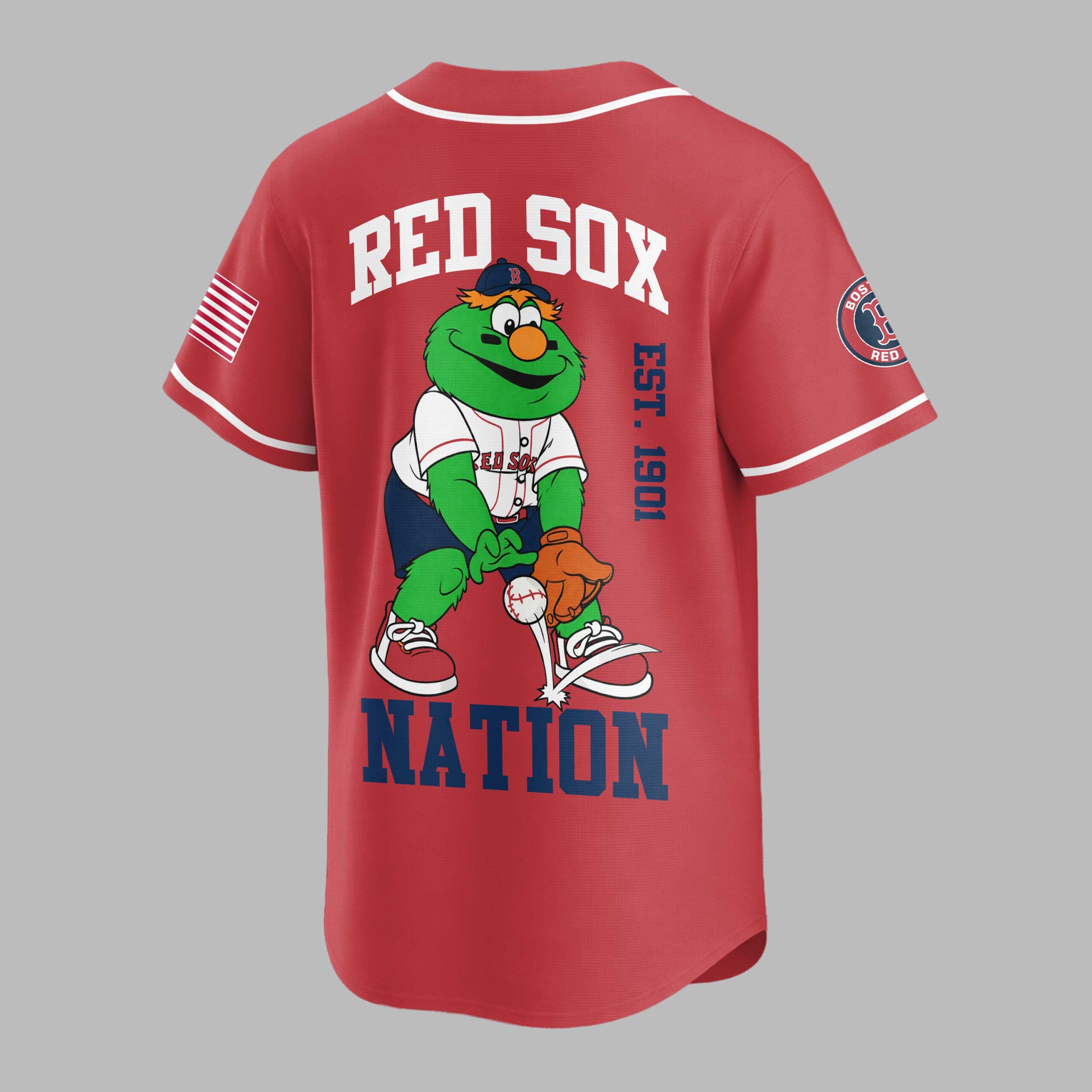 Step up to the plate and show your unwavering loyalty to the Boston Red Sox with this vibrant baseball jersey! Perfect for any devoted fan, this shirt proudly displays your team pride and celebrates the rich history of one of baseball’s most iconic franchises. The front features BOSTON in bold blue letters with a red outline, underscored by RED SOX in classic red, alongside the iconic Red Sox B logo on the sleeve. Turn around and cheer on your team with RED SOX arching across the back, above a playful graphic of Wally the Green Monster in his uniform, ready to catch. EST. 1901 boldly marks the team’s founding year, with NATION completing the spirited design at the bottom. Whether you’re catching a game at Fenway Park, gathering with friends for a watch party, or simply heading out for a casual day, this jersey is your go-to. It’s the ideal way to represent your favorite team and share your passion for Boston baseball with the world, making every day feel like game day.