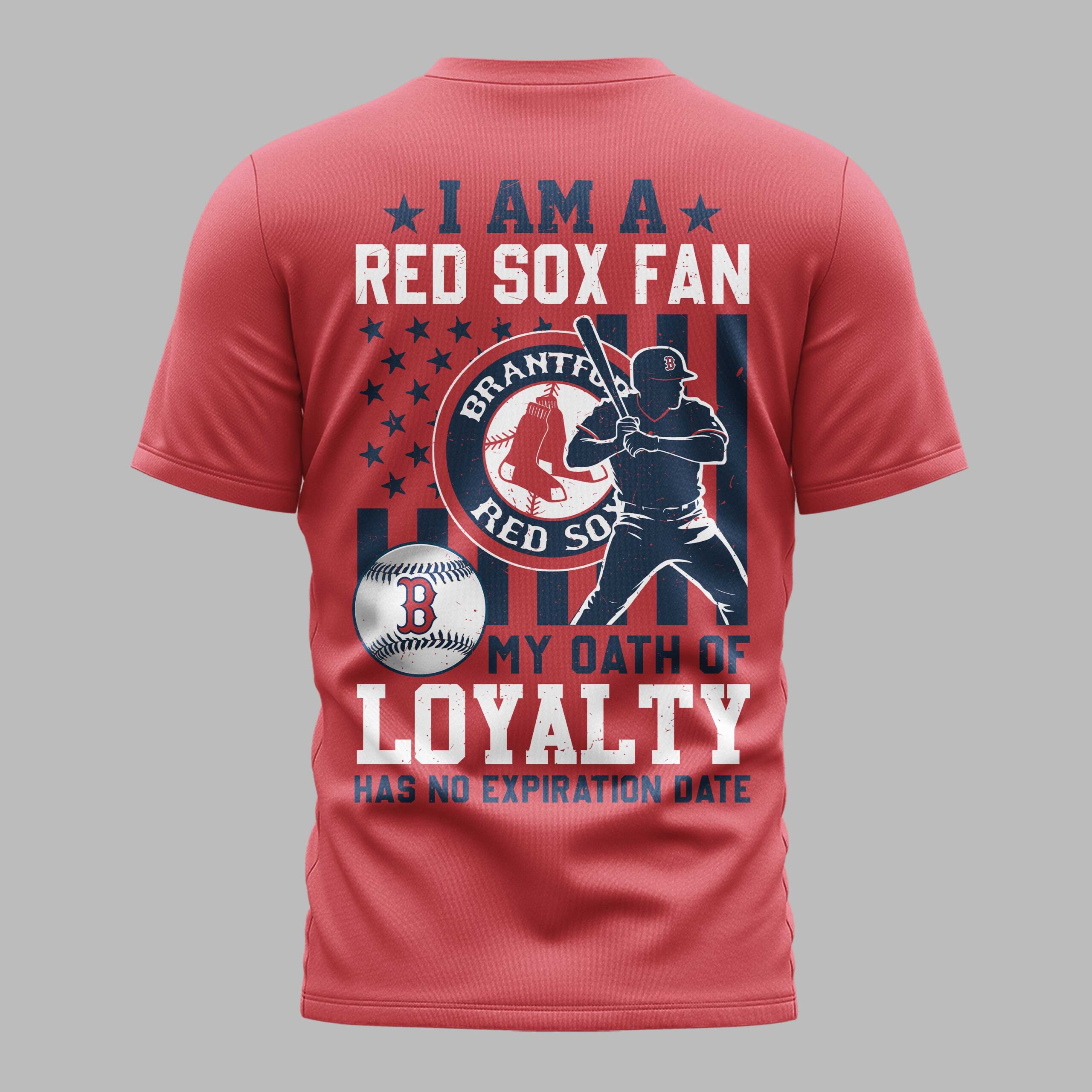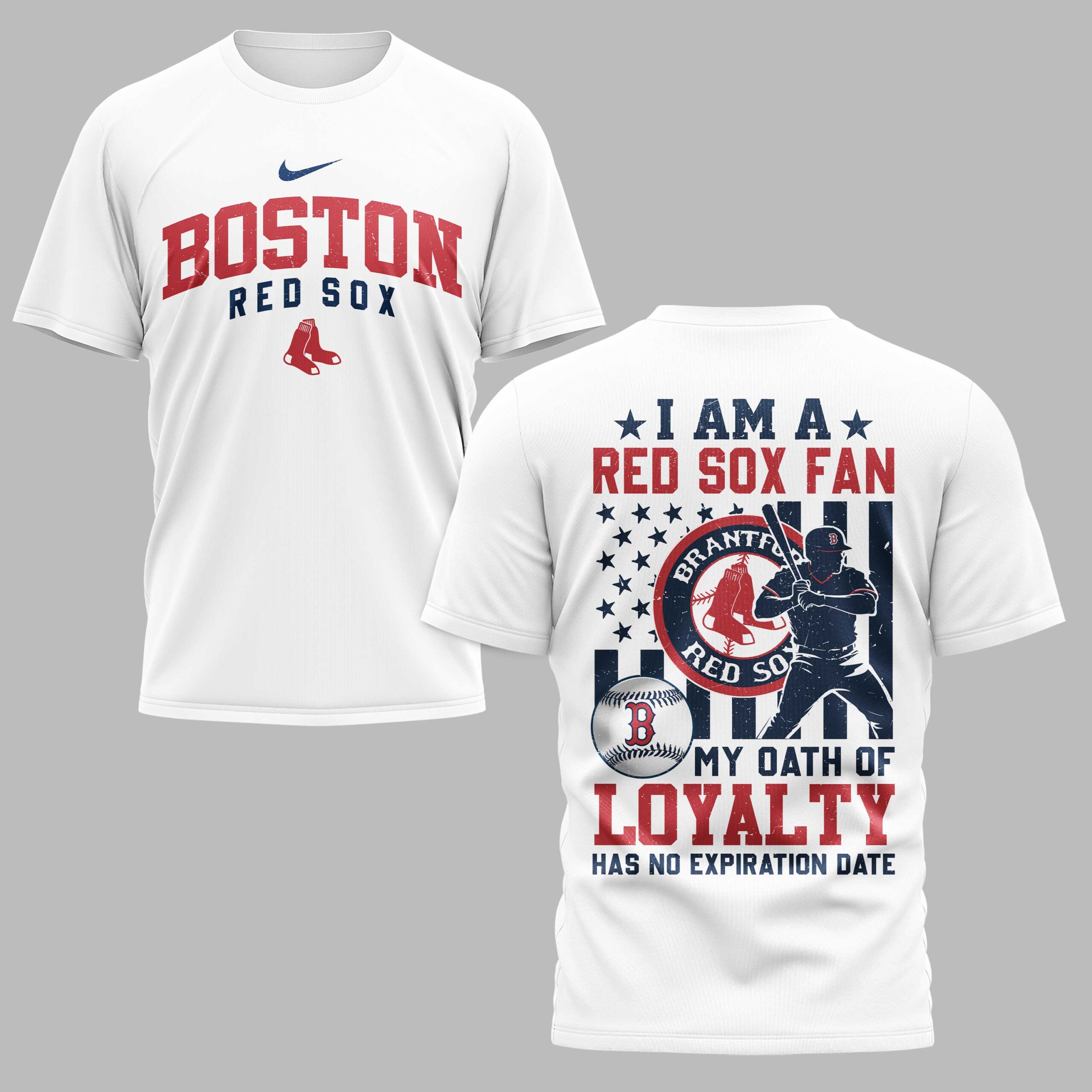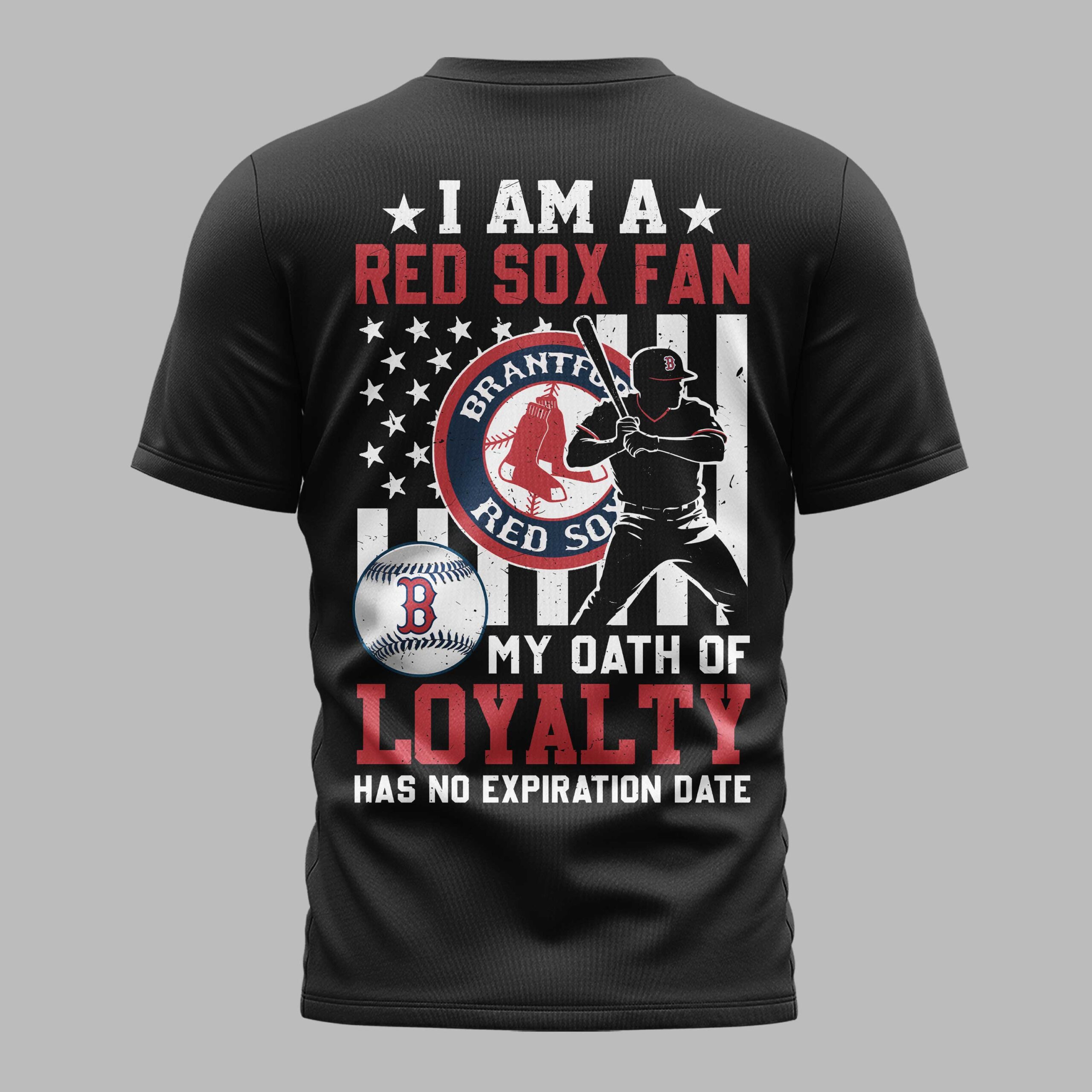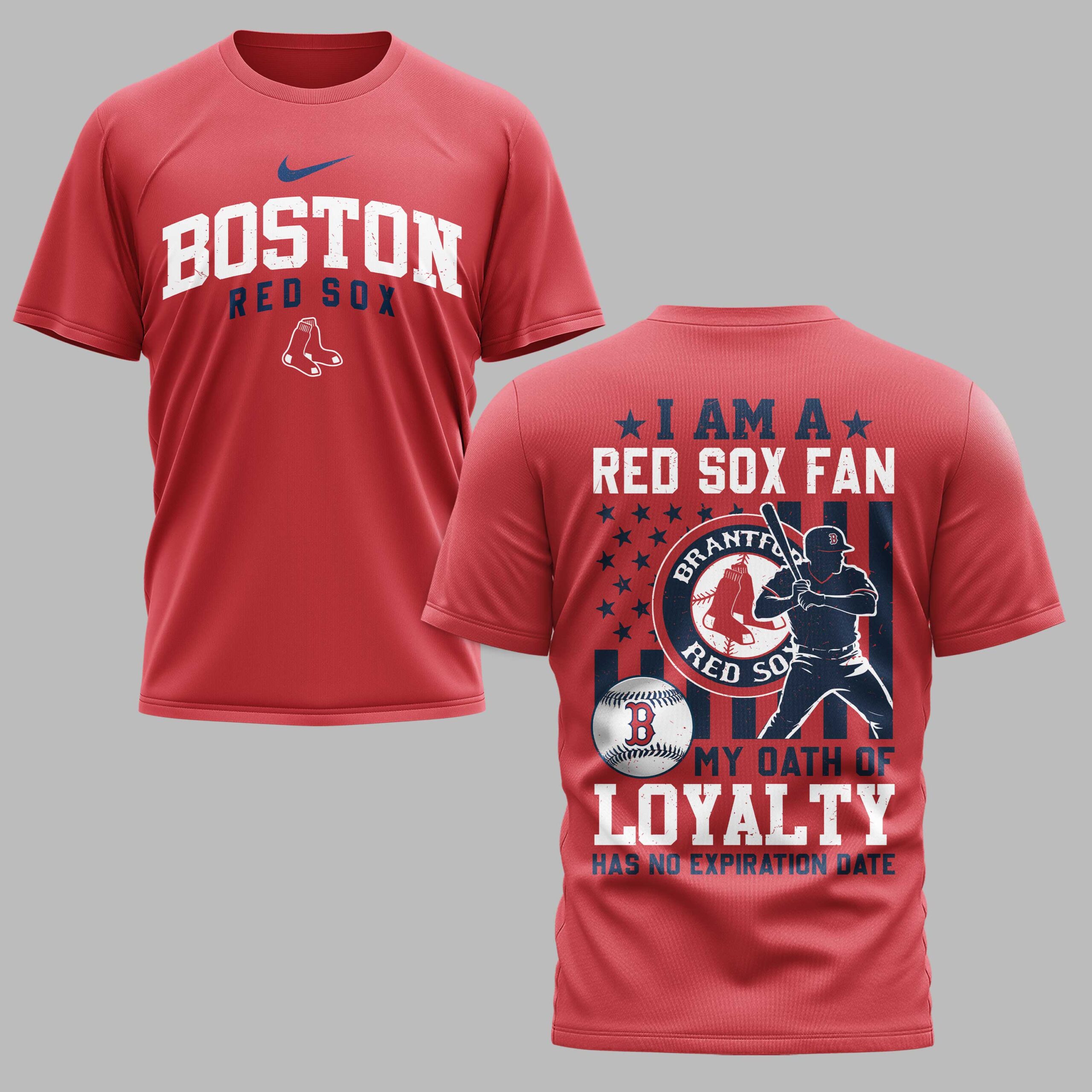 Declare your unwavering devotion to the Boston Red Sox with this striking tee, designed for the ultimate fan. This shirt isn’t just apparel; it’s a bold statement of allegiance to your favorite team, celebrating the spirit of baseball and true loyalty. The front features the iconic BOSTON RED SOX text with the classic red sock logo, complemented by a subtle Nike swoosh. The back is a powerful tribute, showcasing a distressed American flag backdrop behind a batting baseball player silhouette. Above, I AM A RED SOX FAN stands proud, while below, MY OATH OF LOYALTY HAS NO EXPIRATION DATE is boldly emblazoned alongside a baseball featuring the B logo. Perfect for cheering from the stands at Fenway Park, gathering with friends for a watch party, or simply showing your Red Sox pride in everyday life. This shirt is an essential for any fan whose heart beats for Boston baseball, a testament to a loyalty that truly never ends.