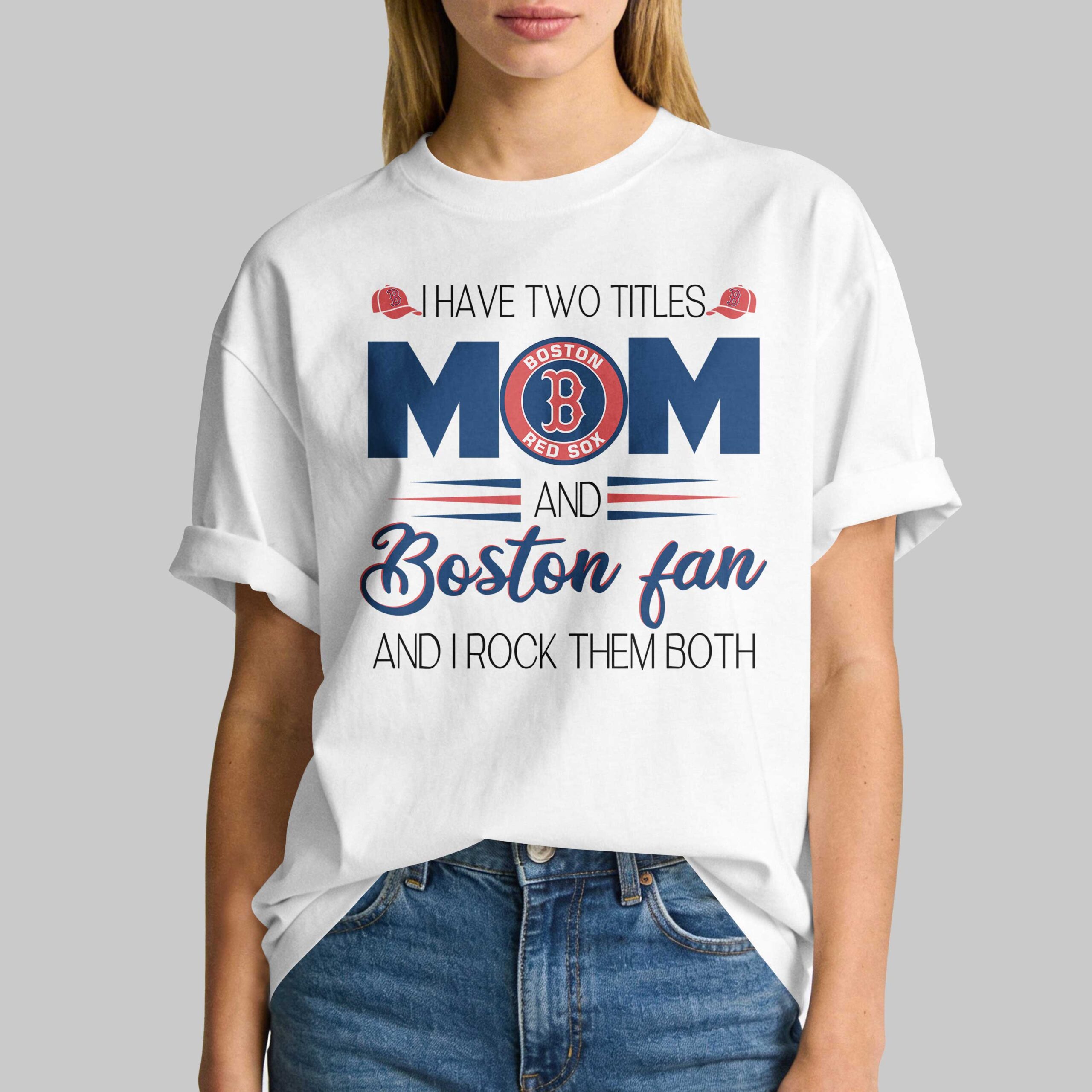 Showcase your ultimate pride with this Boston Red Sox Mom fan tee! For the dedicated mother balancing family and fiercely cheering her beloved team, this shirt celebrates your cherished motherhood and unwavering Red Sox loyalty. The design boldly proclaims I HAVE TWO TITLES, flanked by red baseball caps. MOM stands out in blue, with the iconic Boston Red Sox logo forming the O. AND Boston fan in elegant script concludes with AND I ROCK THEM BOTH. Wear this essential tee for game days, watch parties, or daily outings. Display your mom status and true Boston fan spirit at school events, family gatherings, or any casual occasion.