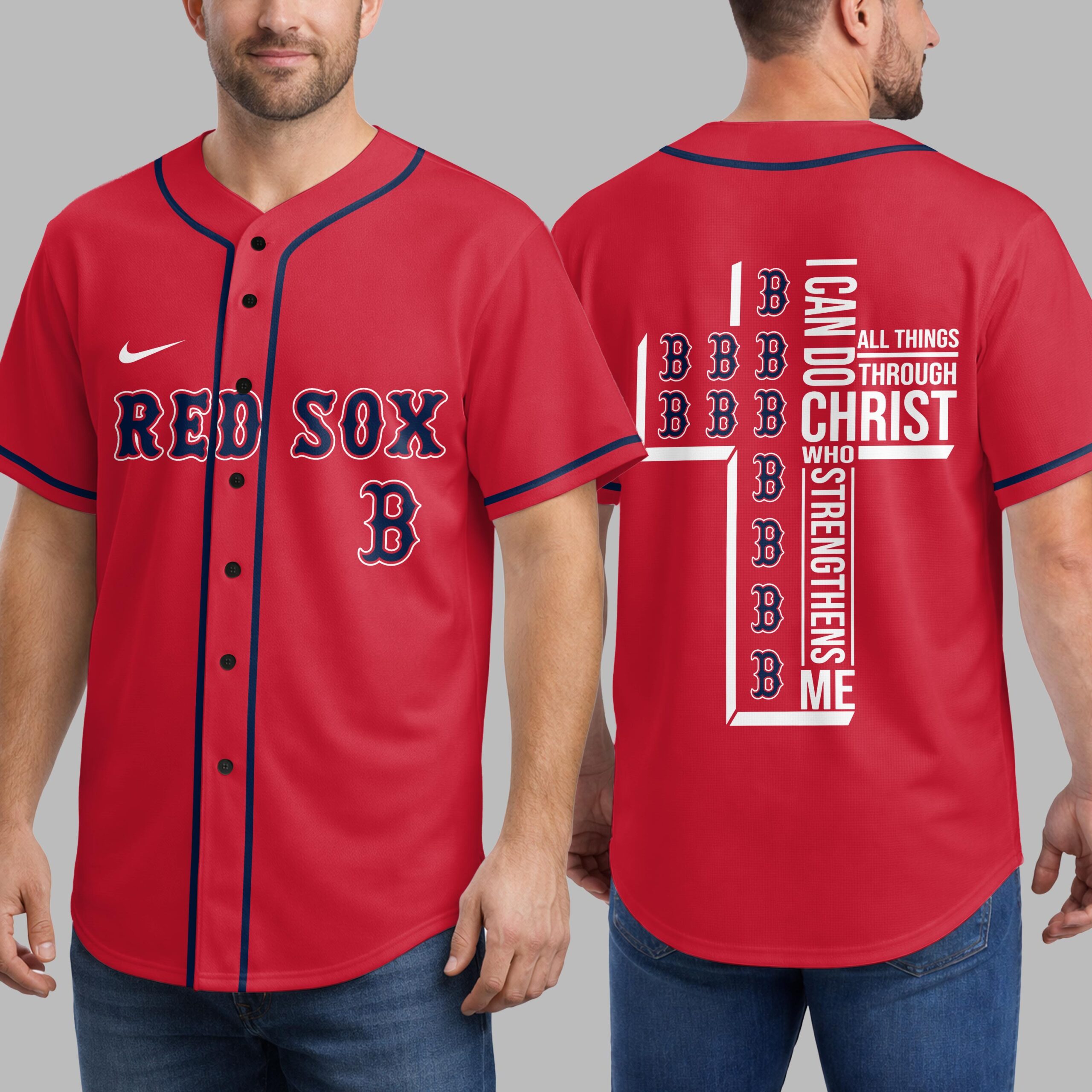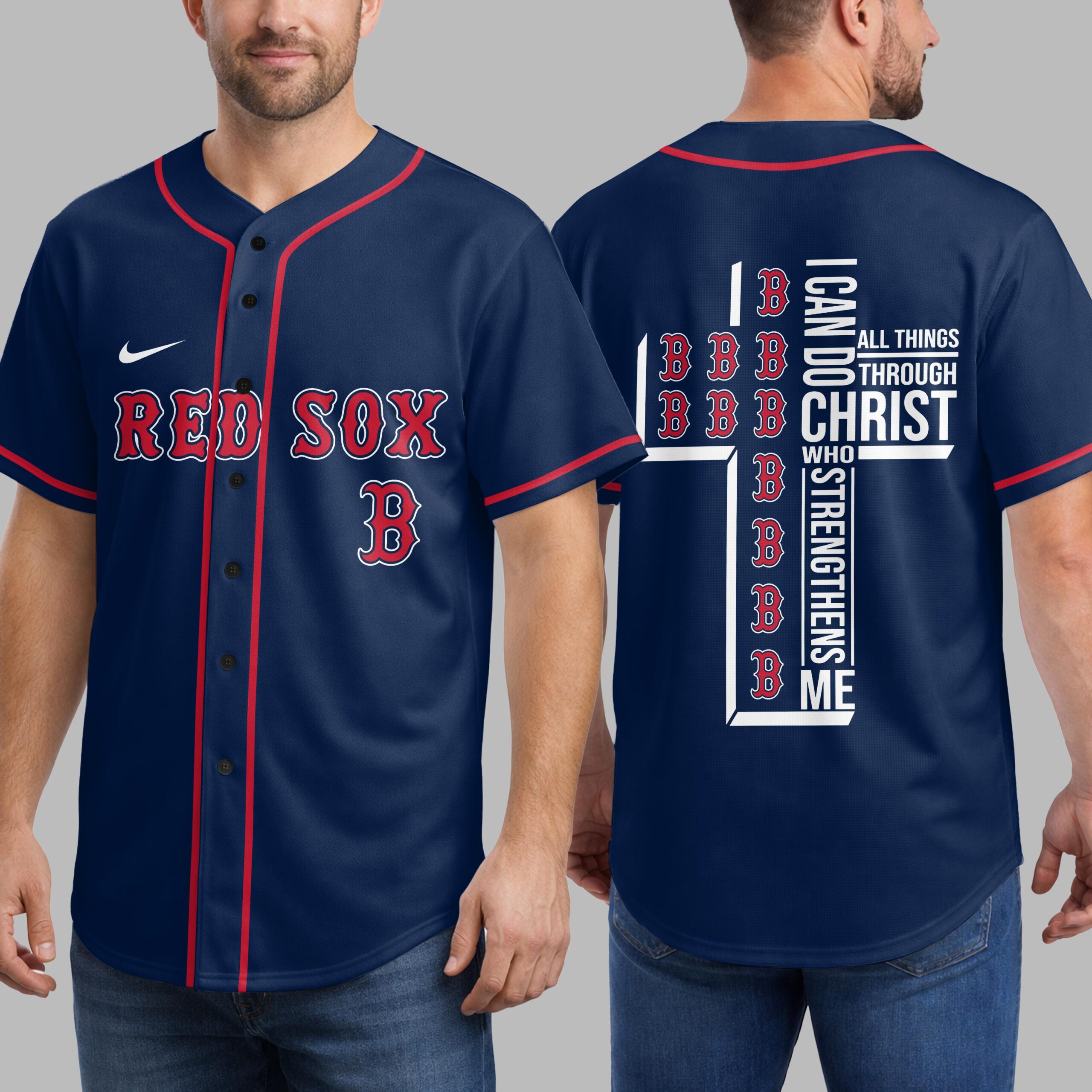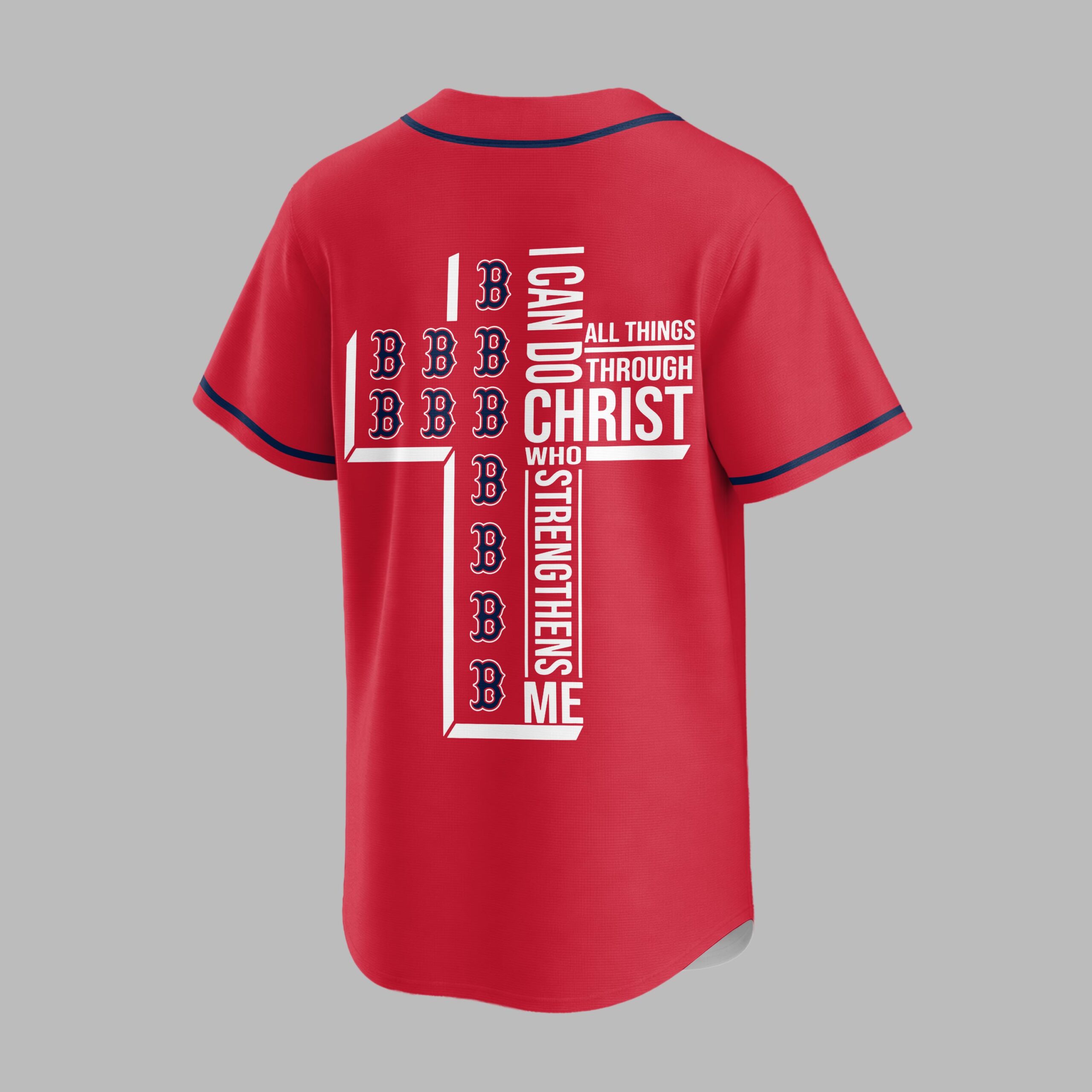 Show your unwavering spirit both on and off the field with this unique Boston Red Sox-themed jersey. Perfect for fans who carry their faith and team pride in equal measure, this shirt is a powerful statement of belief and dedication. The front proudly displays RED SOX in classic red and blue lettering, complemented by the iconic B logo and a crisp white swoosh, capturing the essence of game day excitement. Turn around to reveal an inspiring message on the back: I CAN DO ALL THINGS THROUGH CHRIST WHO STRENGTHENS ME, boldly arranged to form a cross. This powerful scripture is accentuated by a vertical line of familiar Red Sox B logos, creating a design that’s both spiritual and spirited. Whether you’re cheering at Fenway Park, attending a church gathering, or simply going about your day, this jersey lets you express your passions with conviction. It’s an ideal way to celebrate your favorite team and your faith, bringing together community and personal strength in one compelling design.