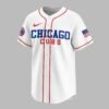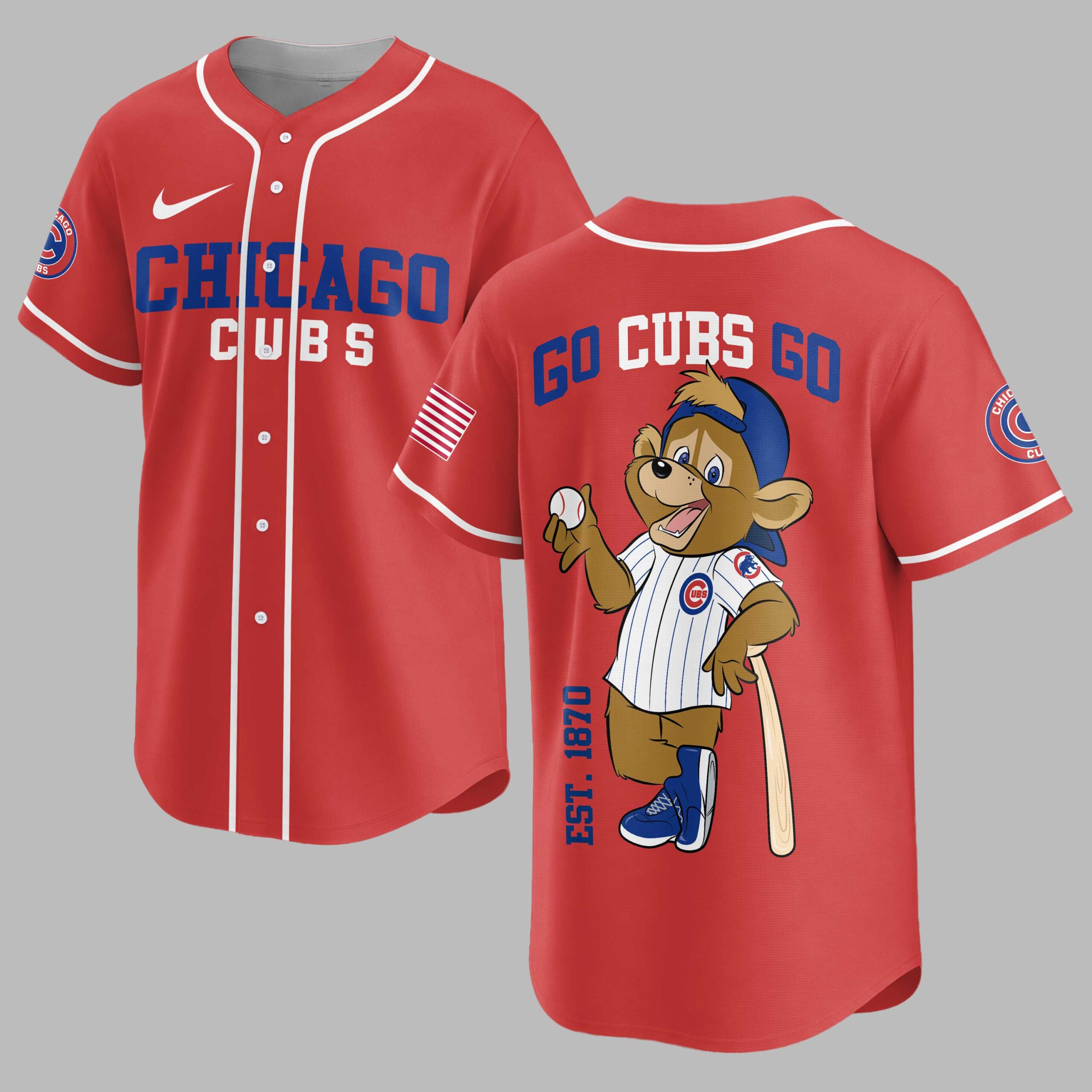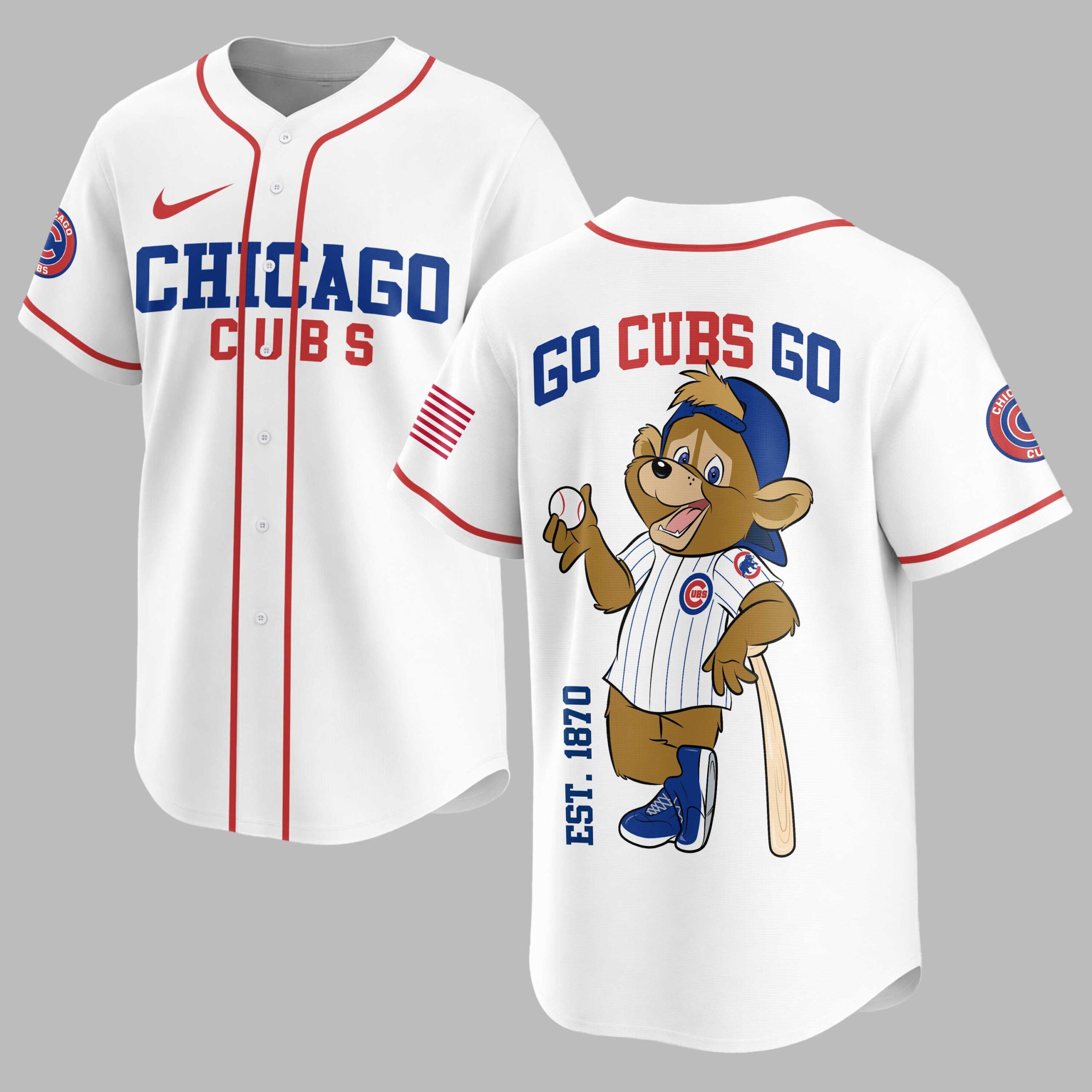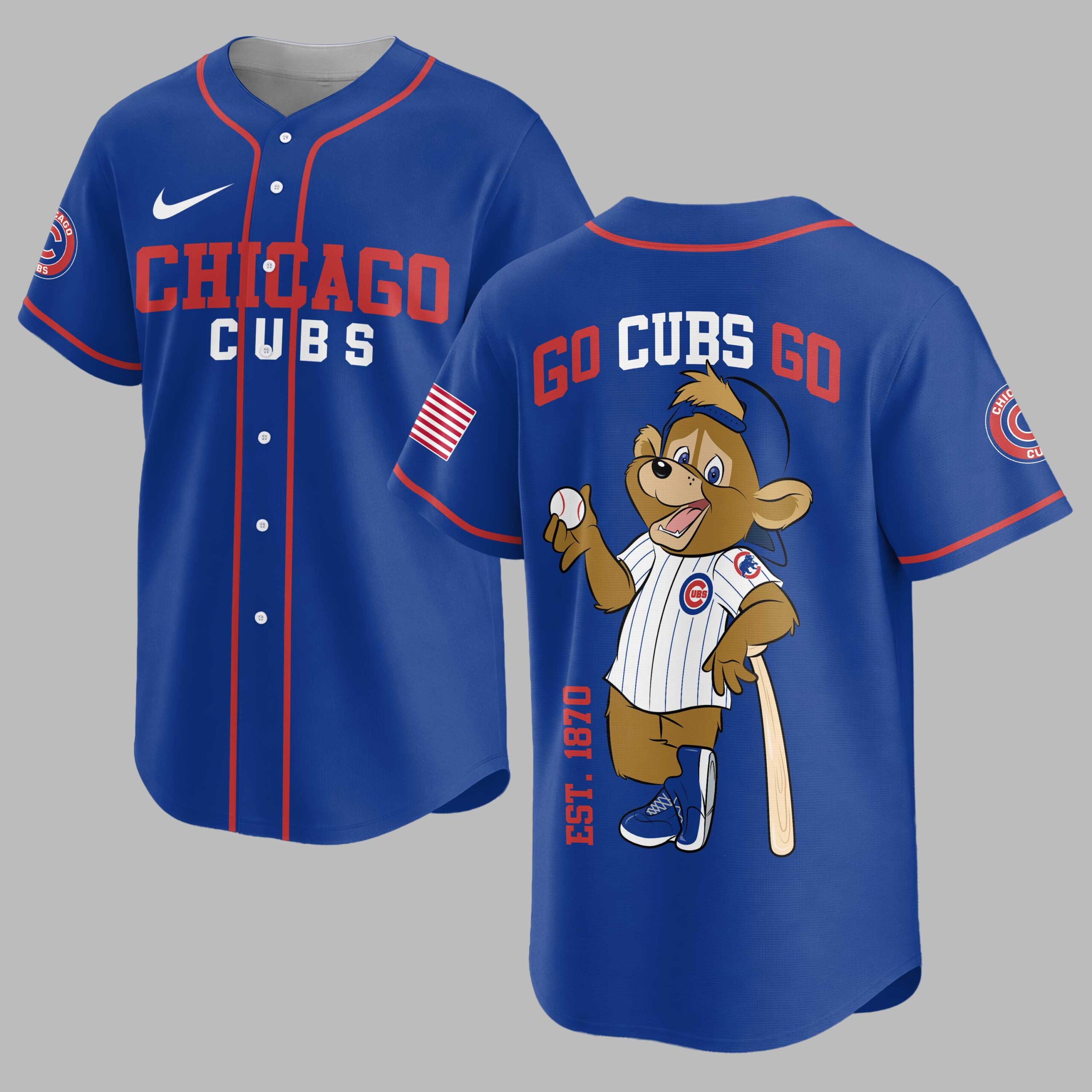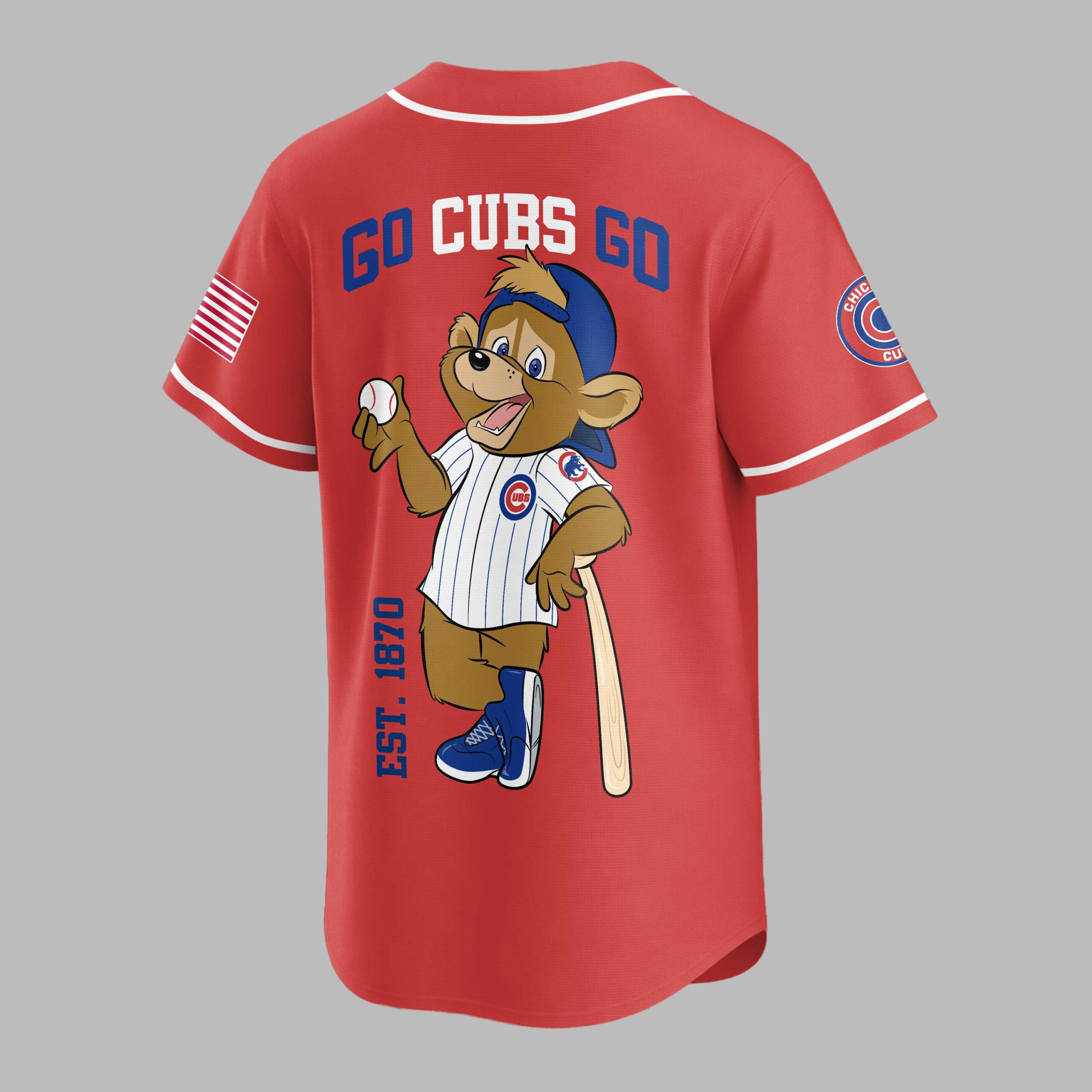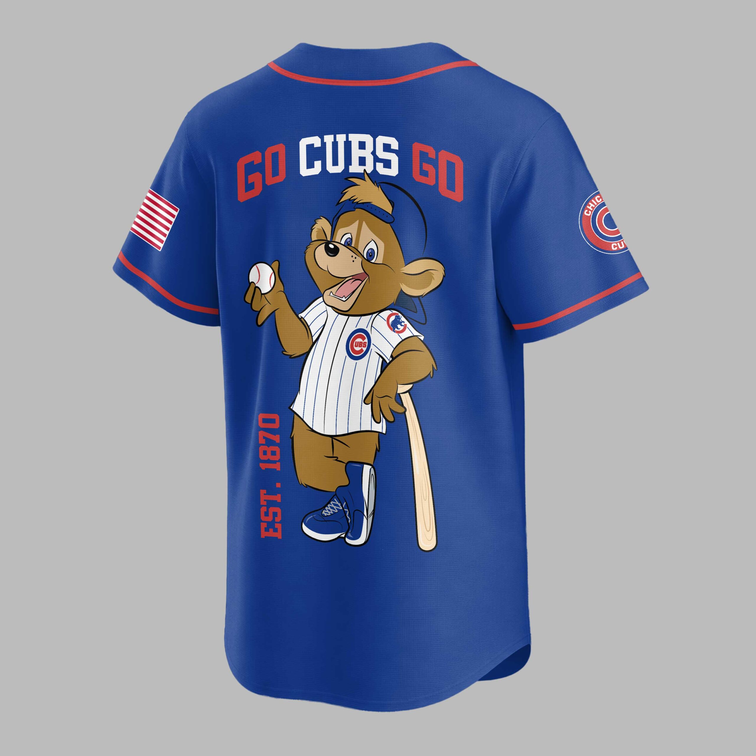 Show your unwavering Chicago Cubs pride with this vibrant baseball jersey, designed for the ultimate fan! Perfect for cheering on your favorite team, this shirt captures the true spirit of game day and the rich legacy of the Cubs. The front proudly displays CHICAGO in bold blue lettering with CUBS in striking red beneath, complemented by the iconic circular Cubs logo on the sleeve and an American flag detail. Turn around to reveal the energetic GO CUBS GO slogan, alongside a charming cartoon bear mascot in a pinstripe uniform, holding a baseball and bat. The EST. 1870 subtly reminds everyone of the team’s long-standing history. Whether you’re catching a game at Wrigley Field, hosting a watch party, or simply showing your team allegiance around town, this jersey is your go-to for celebrating every home run and victory. Join the roar of the crowd and wear your Cubs passion on your sleeve!