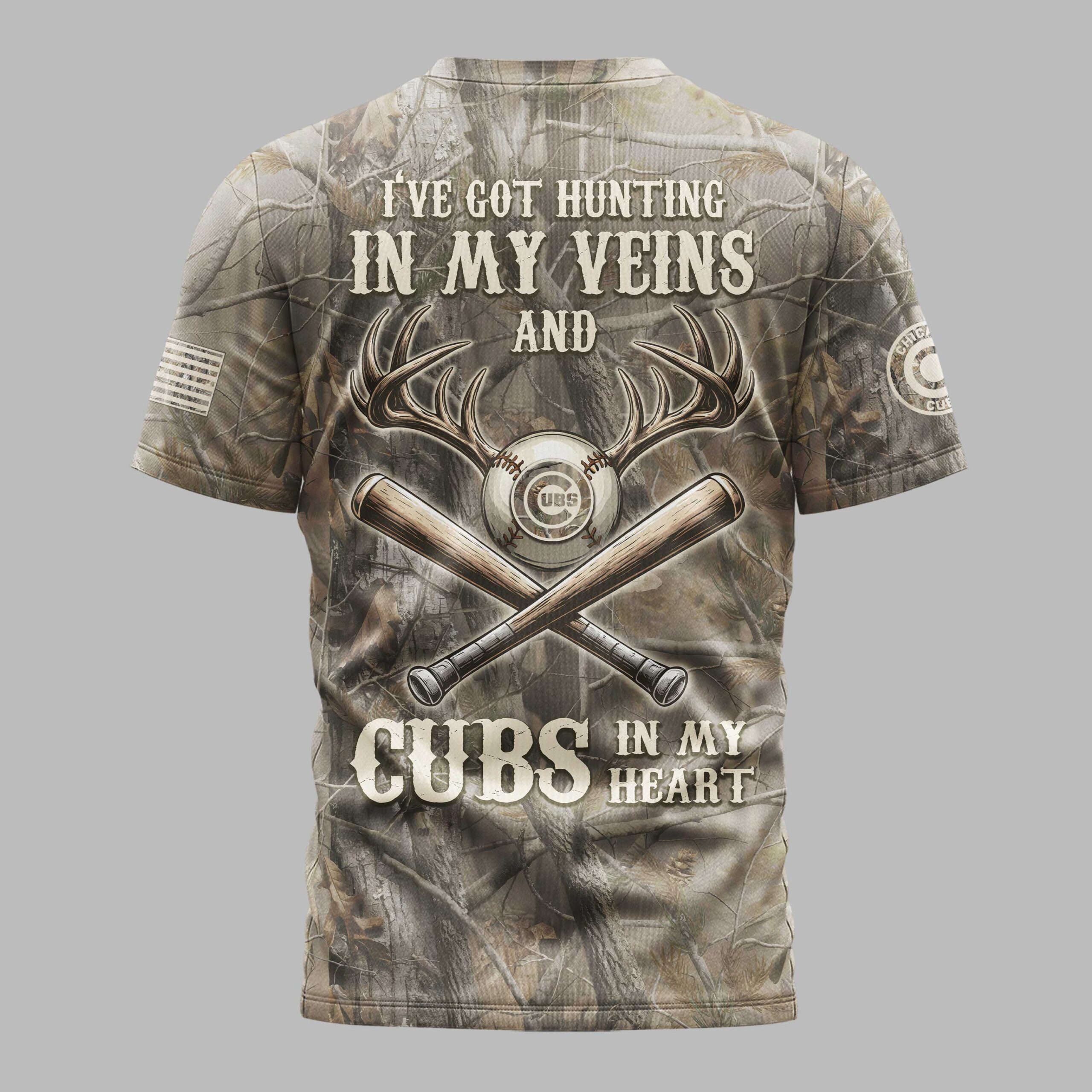 Showcase your dual passion for the Chicago Cubs and the great outdoors with this distinctive hunting camouflage tee. This shirt is for fans who embrace game day thrills and the call of the wild, boldly declaring your unique loyalties. The front features CHICAGO CUBS in a distressed font against a realistic camo pattern. A team patch and distressed American flag adorn the sleeves. The back declares: I’VE GOT HUNTING IN MY VEINS AND CUBS IN MY HEART, showcased with deer antlers, crossed baseball bats, and the iconic Cubs logo baseball. Perfect for cheering at the stadium, venturing into the wilderness, or casual wear, this versatile tee celebrates your dual dedication. It’s ideal for game days, hunting trips, or any occasion to proudly display your spirit.