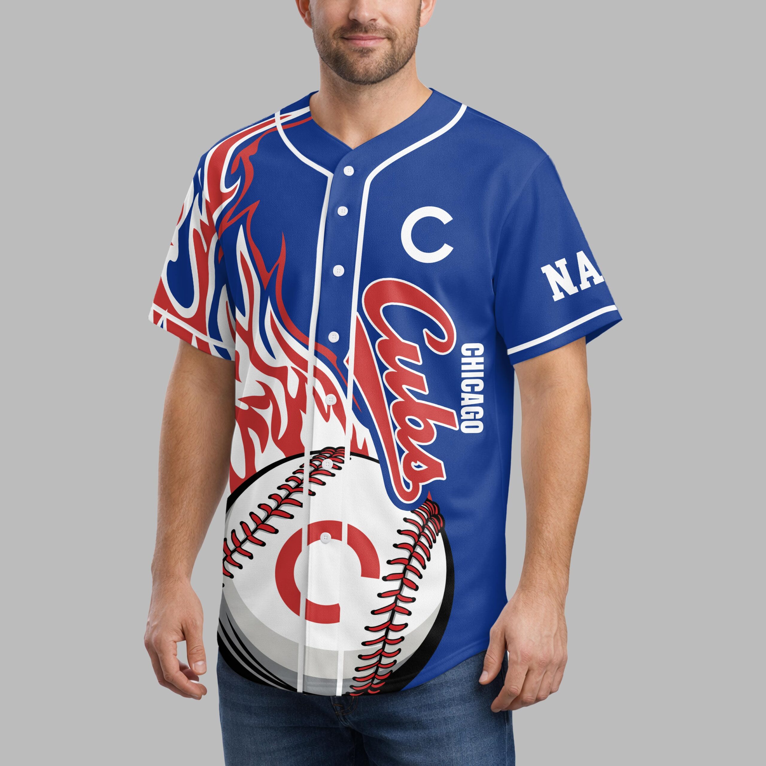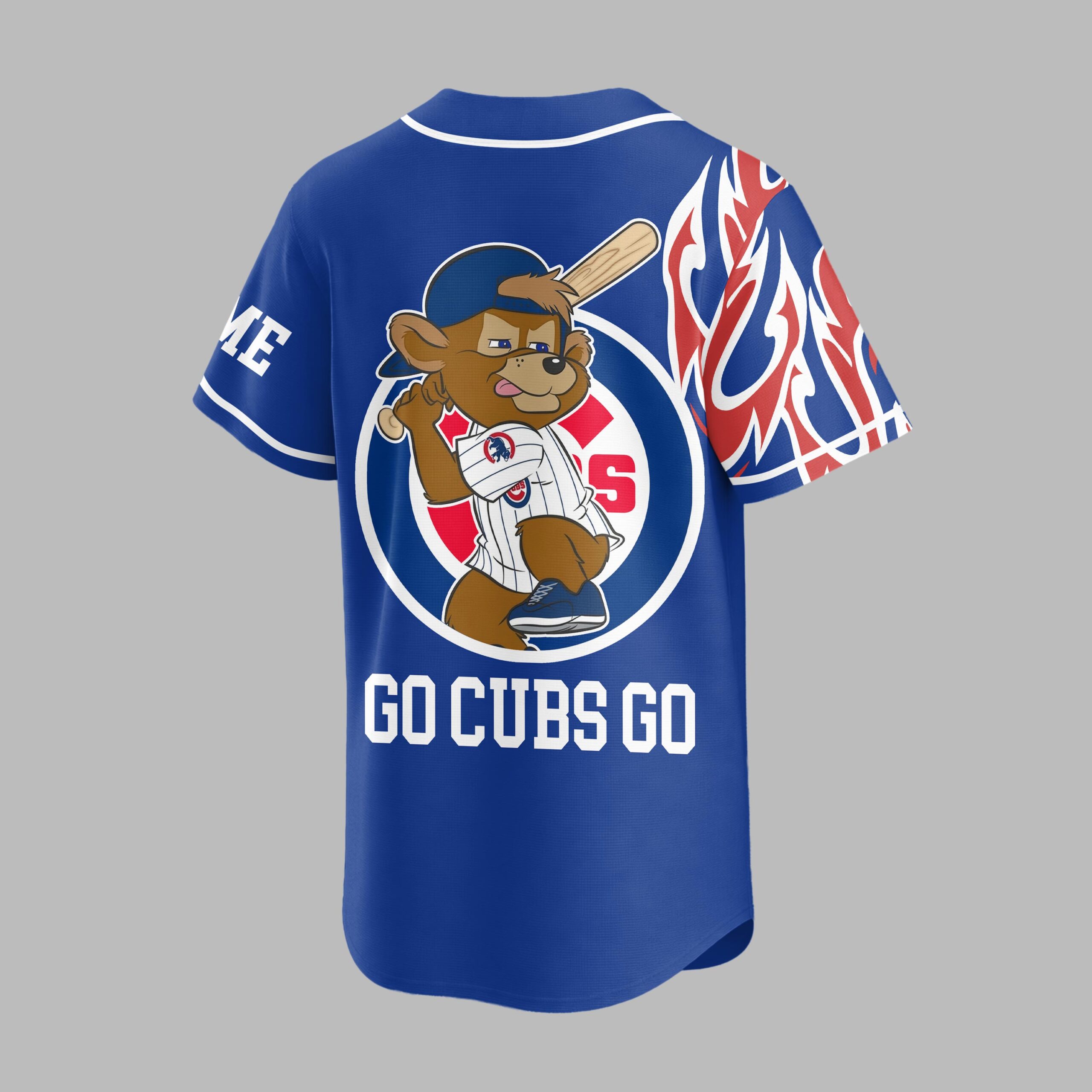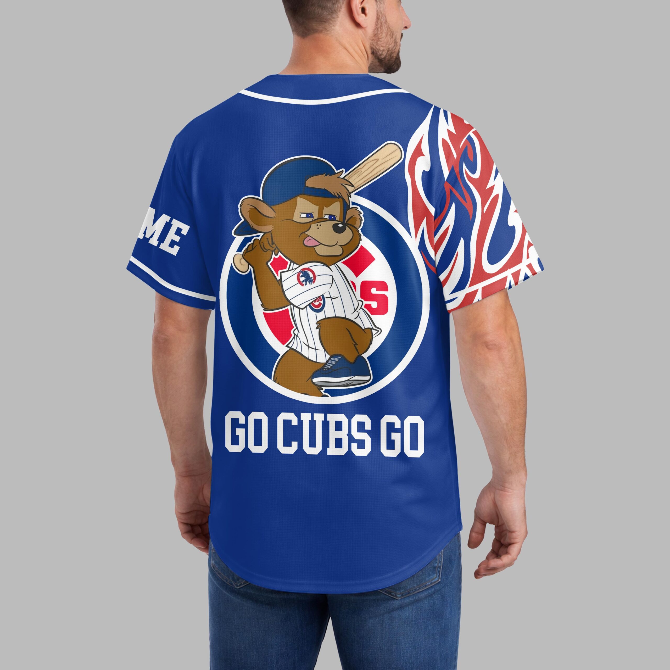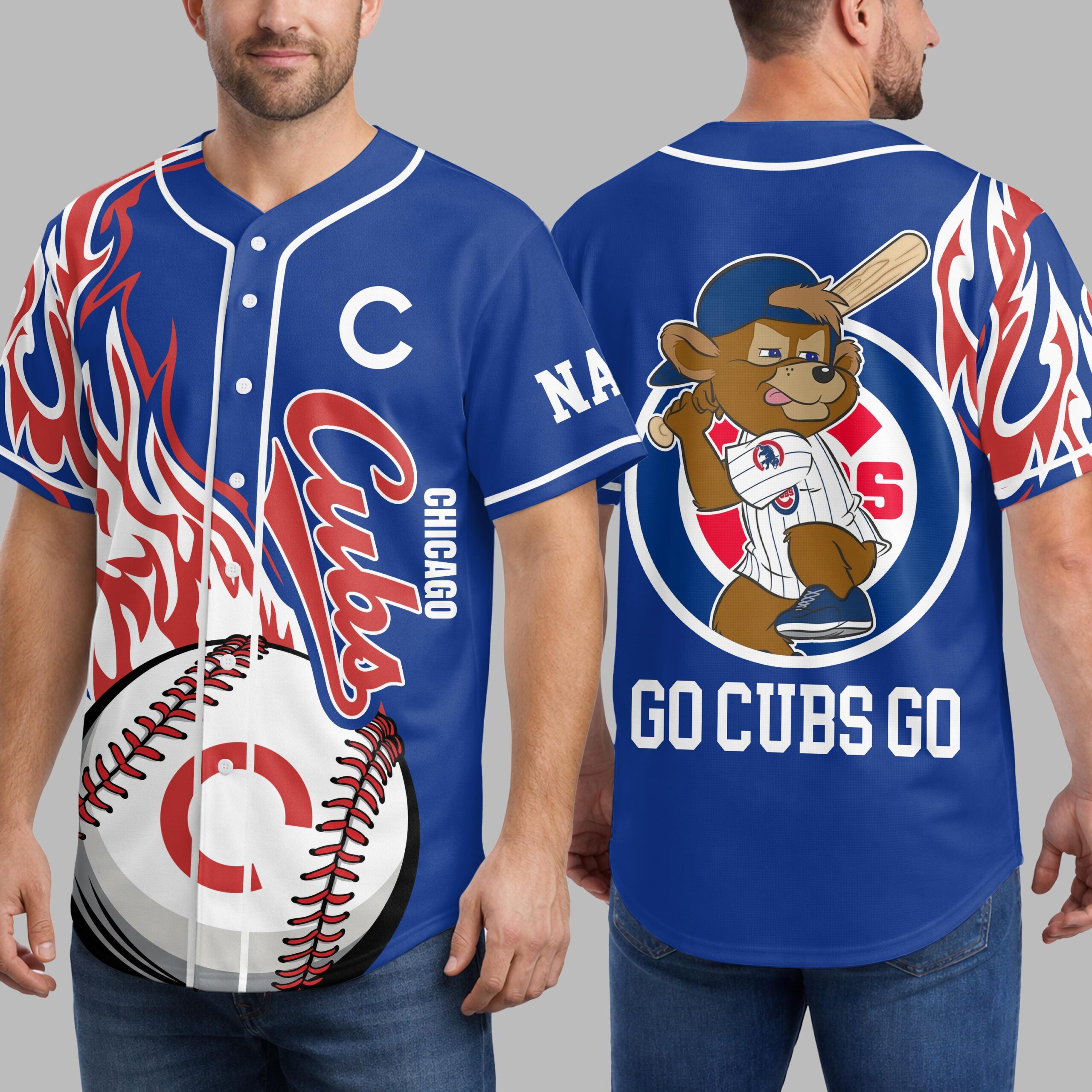 Ignite your game day spirit with this dynamic Chicago Cubs jersey! Perfect for dedicated fans, it lets you proudly wear your passion for the Cubbies. This shirt is a bold declaration of loyalty and enthusiasm for your favorite team. The striking blue jersey features fierce red and white flame graphics on the sleeves and sides. The front displays a baseball design with the iconic red C and Cubs script with CHICAGO. The back showcases an energetic bear mascot, bat in hand, within a circular emblem, highlighted by GO CUBS GO! Whether at Wrigley Field, a watch party, or around town, this jersey is perfect for showcasing your unwavering Cubs pride. It’s the ideal way to celebrate your team, keeping your spirit burning bright all season.