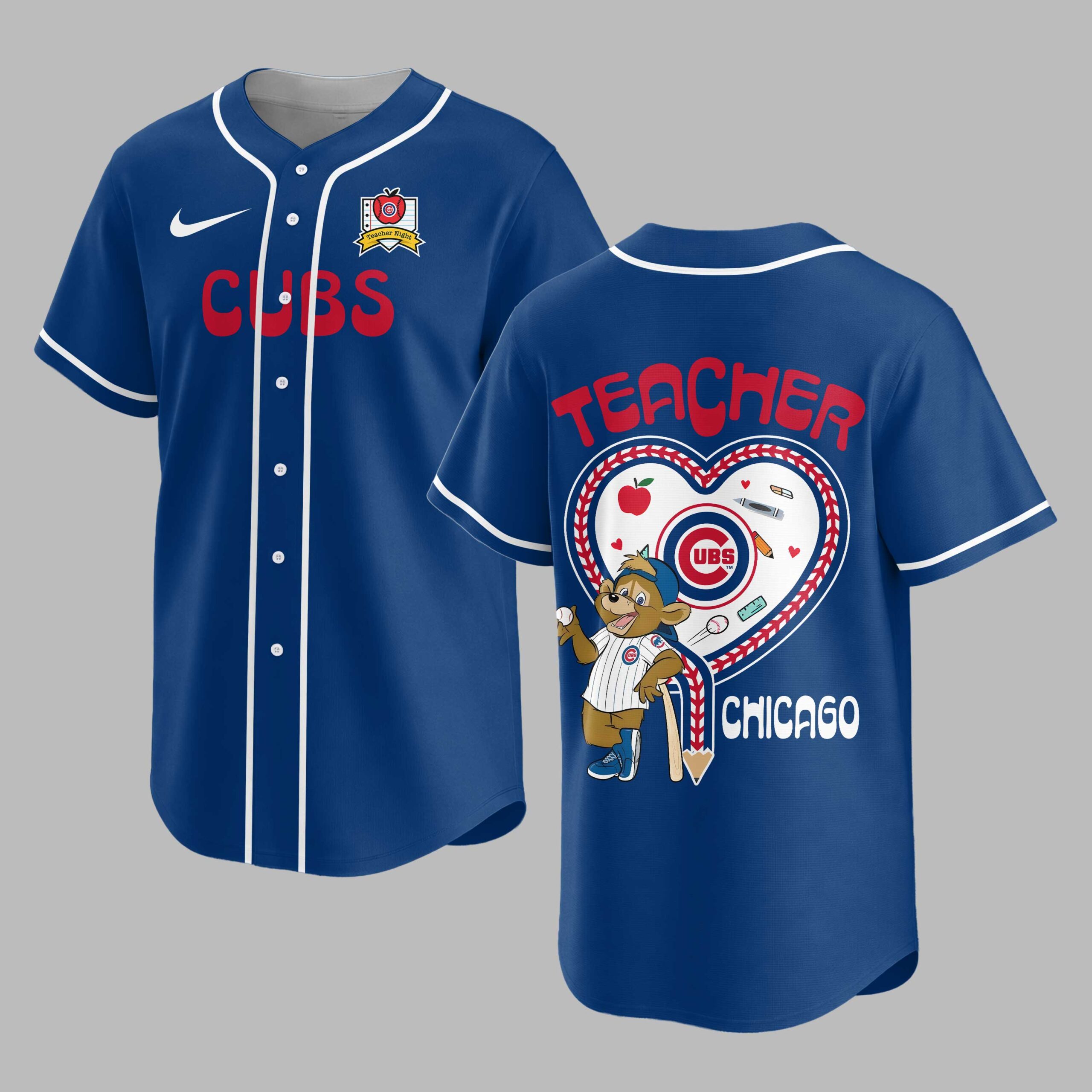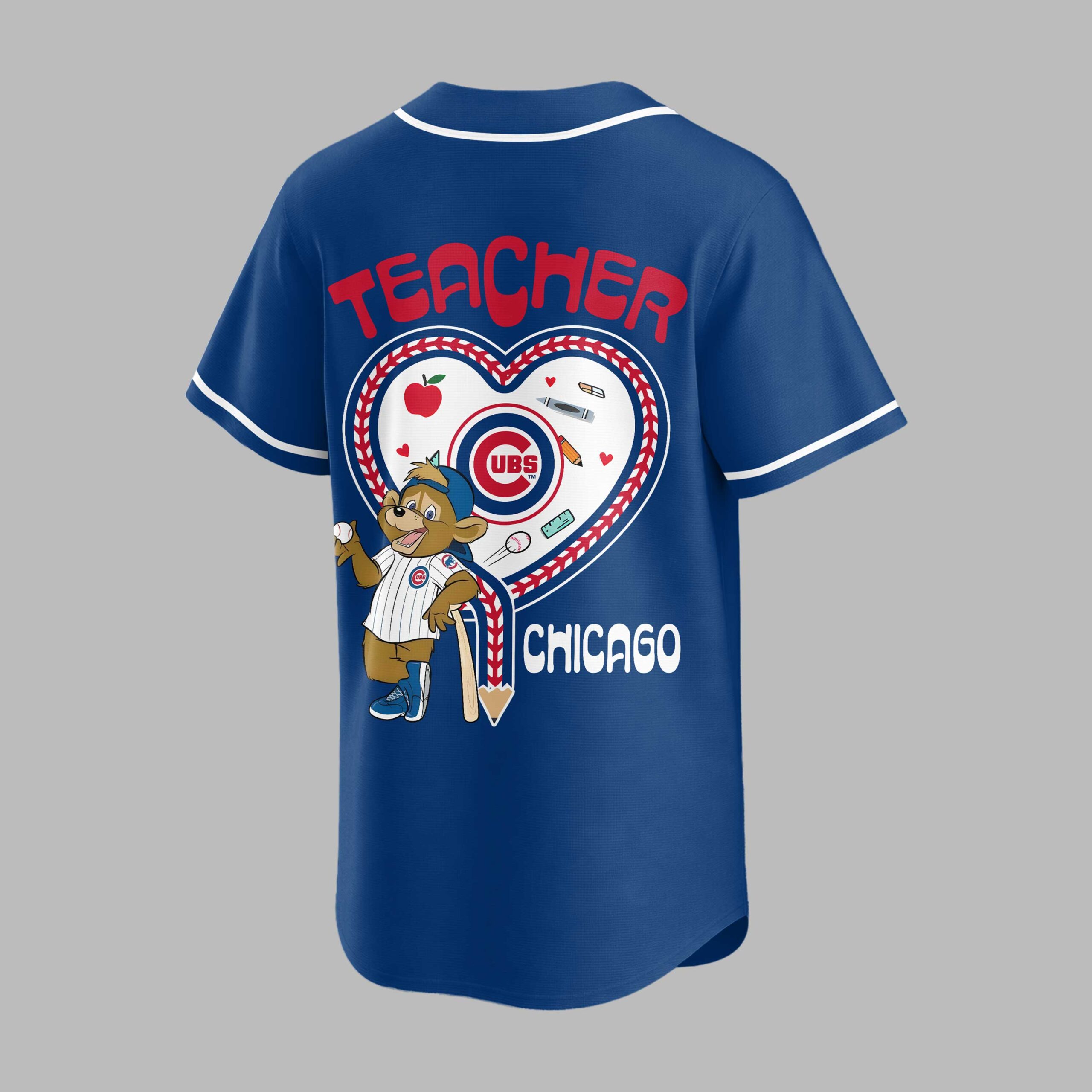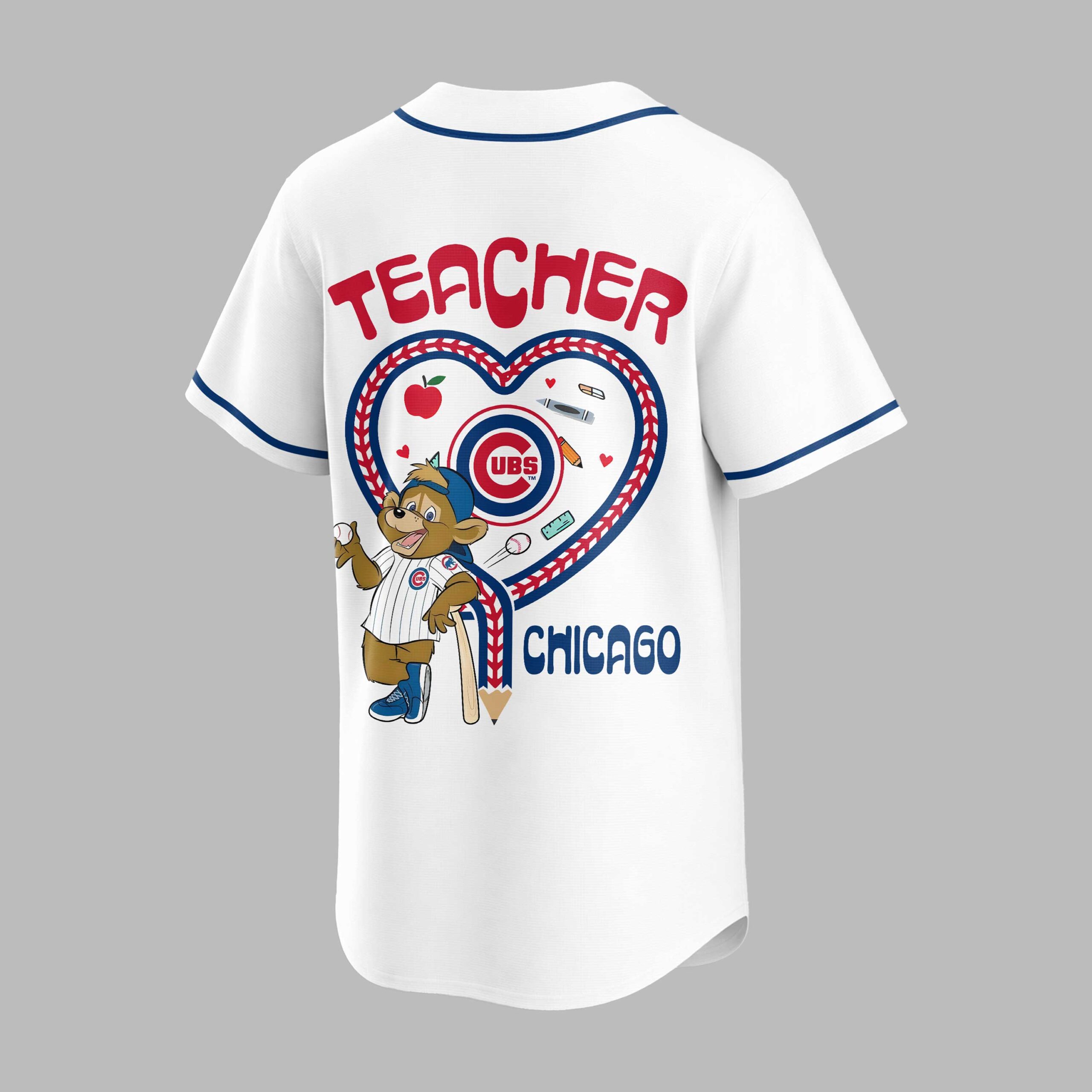 Celebrate your love for the Chicago Cubs and the incredible work of teachers with this special edition baseball jersey! Perfect for educators who are also die-hard Cubs fans, this shirt beautifully blends team spirit with a heartfelt tribute to the teaching profession. Show your pride and dedication to both the ballpark and the classroom. The front proudly displays CUBS in bold red lettering, complemented by a charming Teacher Night emblem featuring an apple and the iconic Cubs logo. The back is a true standout, showcasing TEACHER in vibrant red above a unique heart-shaped design. This heart is stitched with baseball seams and filled with school essentials like an apple, ruler, crayon, eraser, and a playful Cubs bear mascot holding a baseball-bat pencil, all finished with CHICAGO below. Whether you’re cheering from the stands at Wrigley Field, heading to a special Teacher Appreciation game, or simply want to display your dual passions in everyday life, this jersey is a home run. It’s an ideal way for teachers to express their team loyalty and pride in their profession, making it perfect for casual outings, school events, or game day festivities.