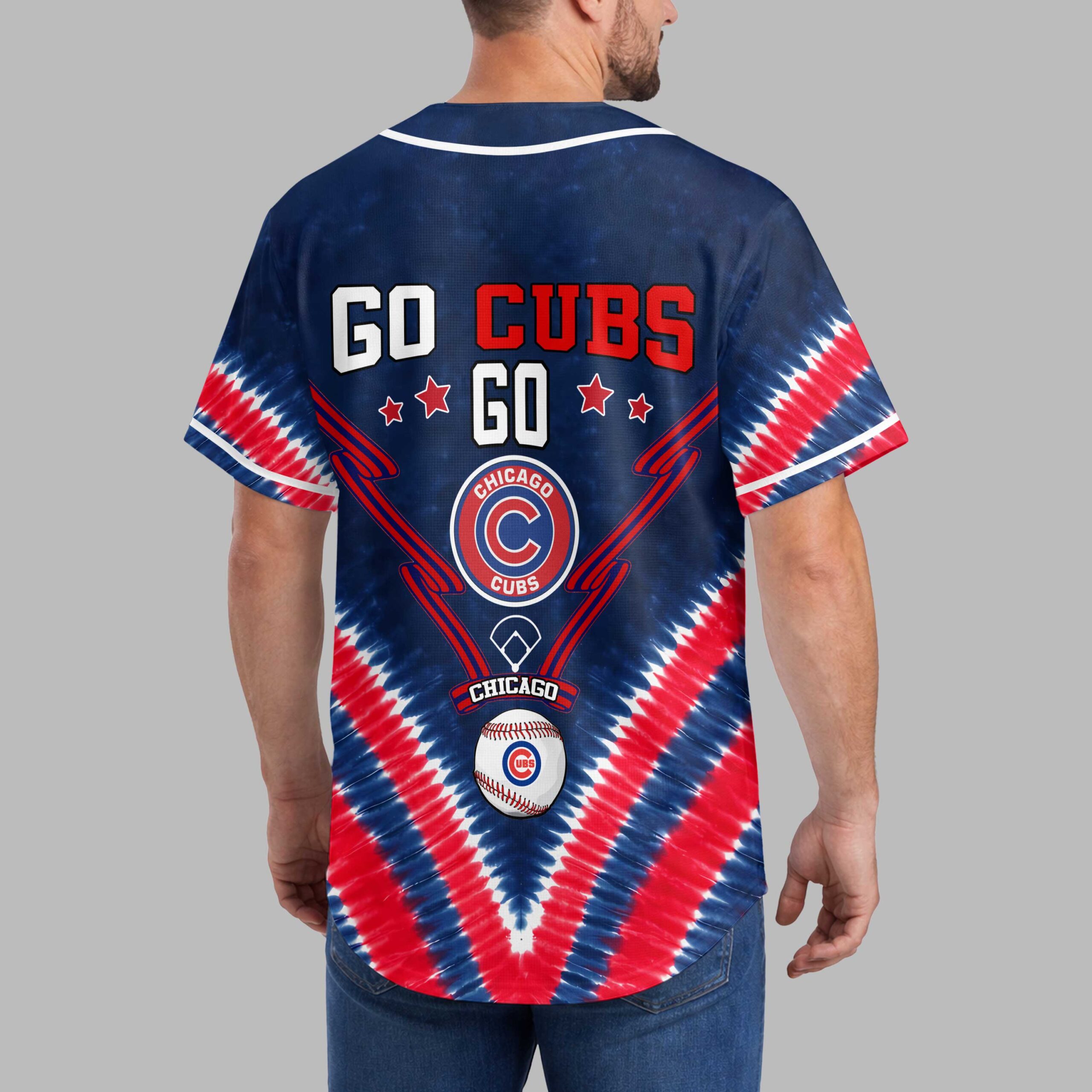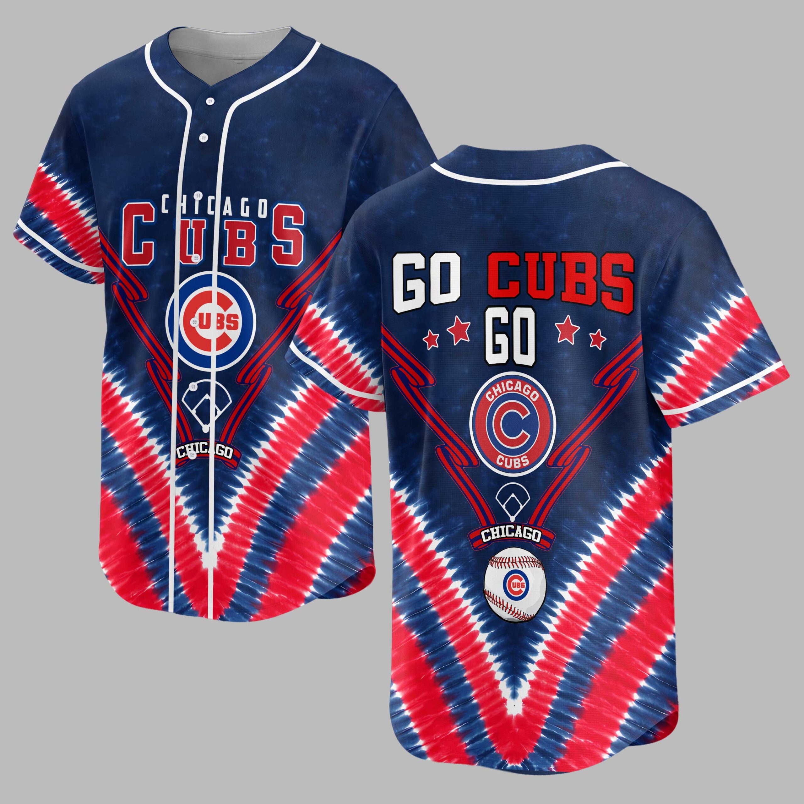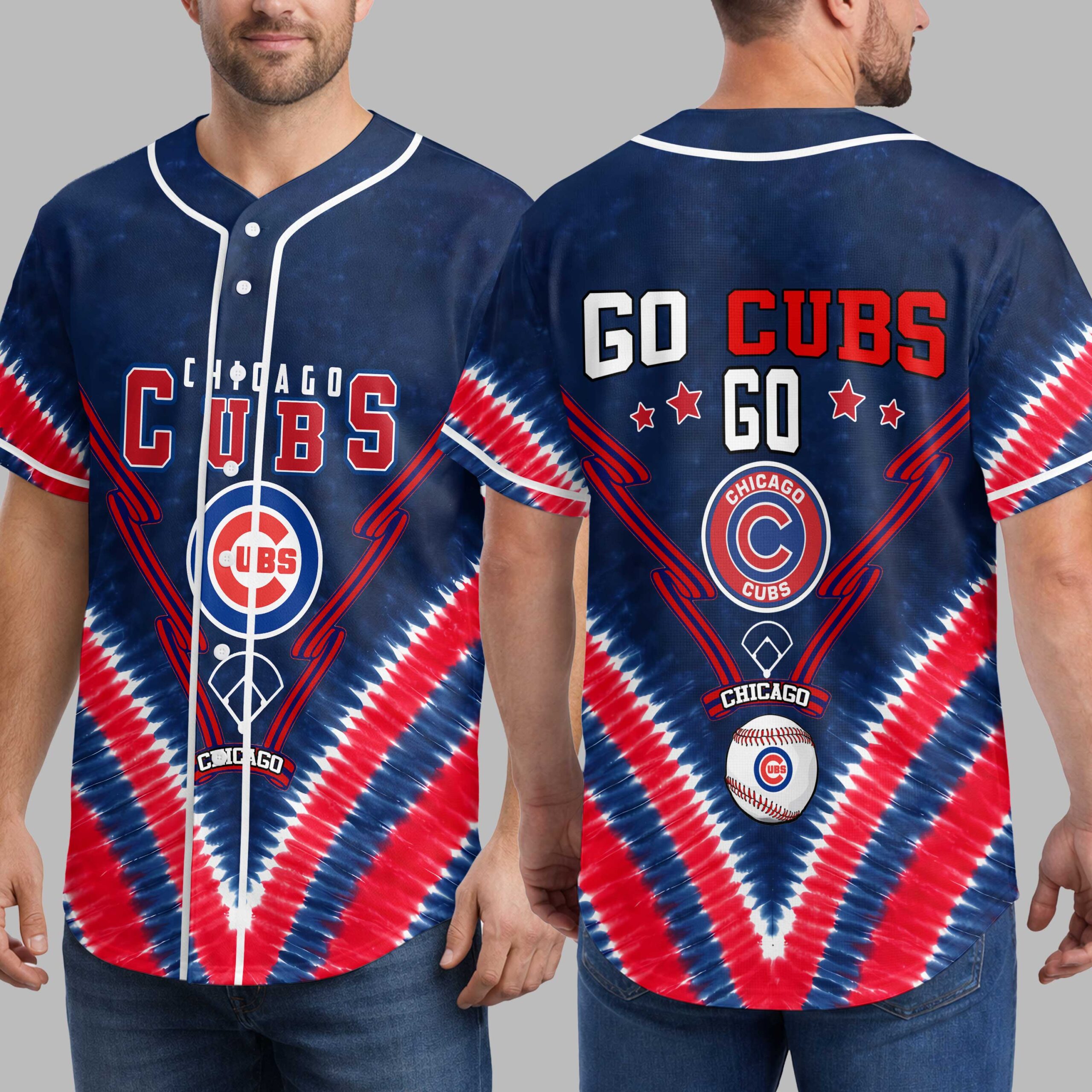 Show your Chicago Cubs pride with this vibrant, tie-dye baseball jersey! Perfect for devoted fans, this shirt combines retro style with undeniable team spirit. Get ready to bring that iconic Wrigleyville energy to every game day and gathering. The front proudly features CHICAGO CUBS in bold red lettering, alongside the classic circular team logo. A dynamic red, white, and blue tie-dye pattern splashes across the sleeves and lower body. The back rallies with GO CUBS GO, accented by stars, another team logo, and a baseball graphic, ensuring your fandom shines. This spirited jersey is ideal for game days at Wrigley Field, watch parties, or casual events. It’s ultimate gear for celebrating every home run and victory, making you stand out as a true Cubbies supporter.