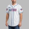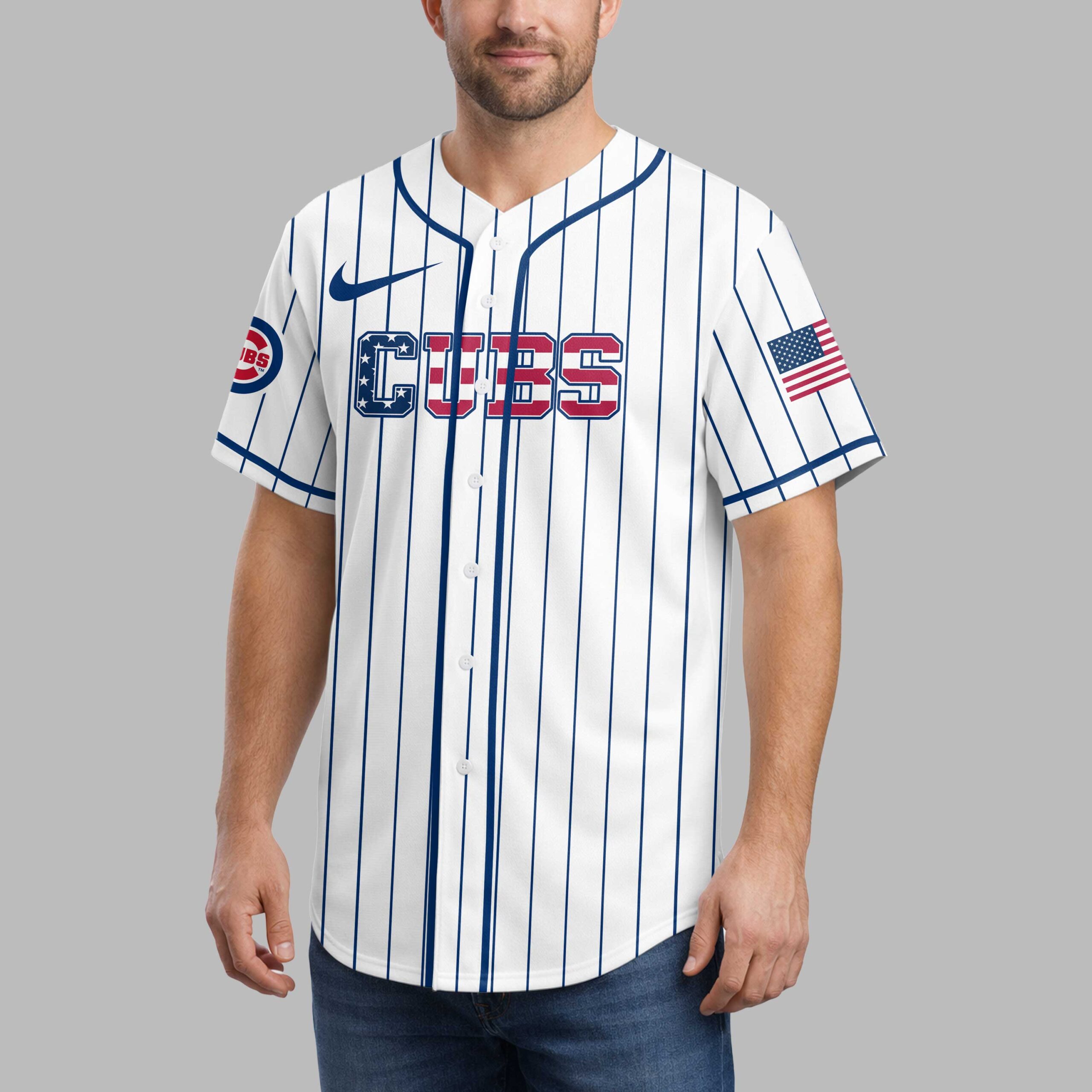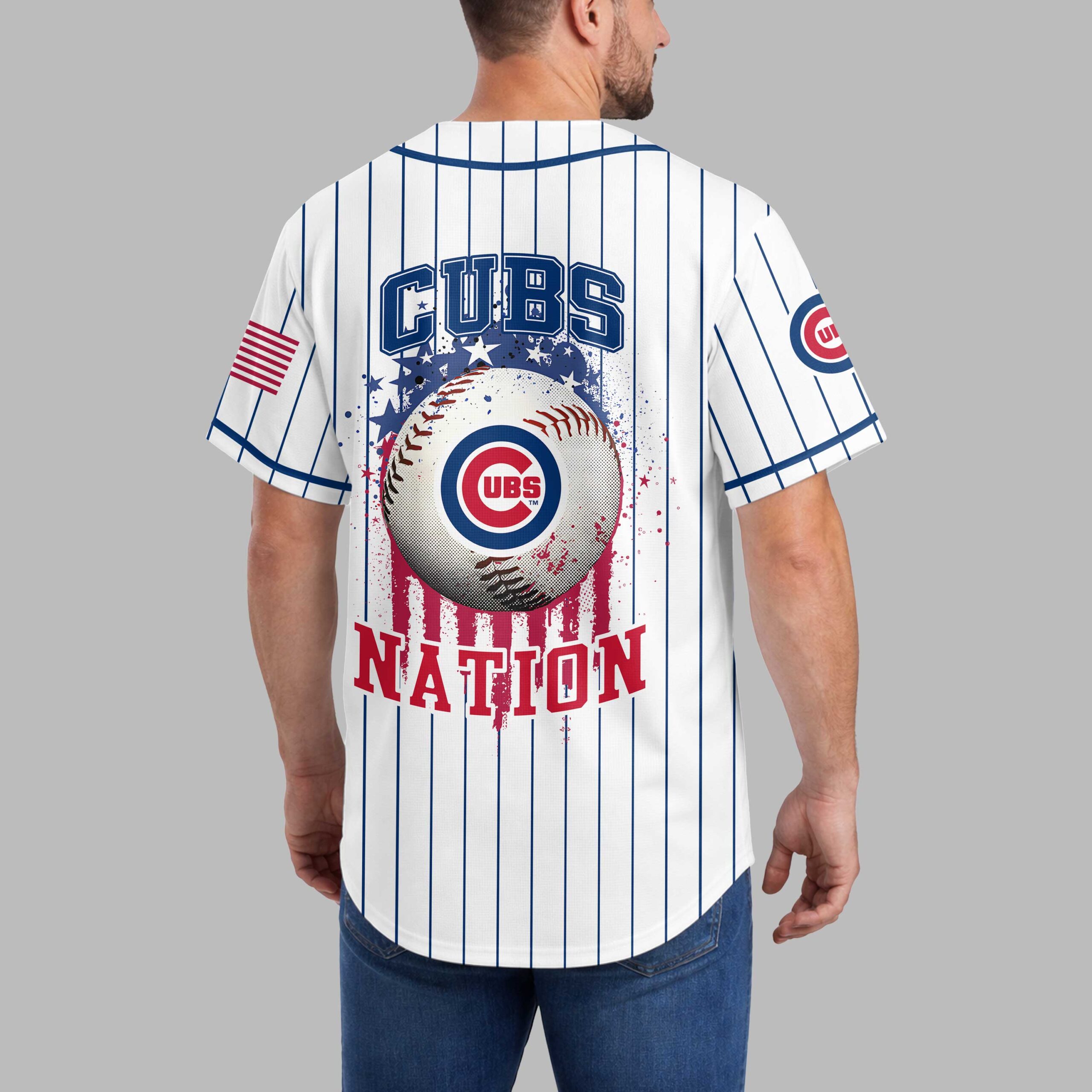 Show your unwavering Chicago Cubs pride with this vibrant patriotic baseball jersey! Designed for the ultimate fan, this shirt perfectly blends your love for the game with a bold display of American spirit, making it an essential addition to any Cubs enthusiast’s wardrobe. The front features the iconic CUBS text emblazoned across the chest, rendered with a striking stars and stripes pattern, complemented by the classic UBS logo on the sleeve. Turn around to reveal an impressive back design: a detailed baseball featuring the UBS logo, set against a dynamic backdrop of blue stars and a striking red, paint-splatter effect. CUBS NATION proudly declares your allegiance below, with an American flag patch on the shoulder. Perfect for cheering at Wrigley Field, celebrating the Fourth of July, or simply enjoying a summer BBQ, this jersey is your go-to for game days, national holidays, and everyday wear. Stand out in the crowd and let everyone know you’re part of the Cubs Nation!