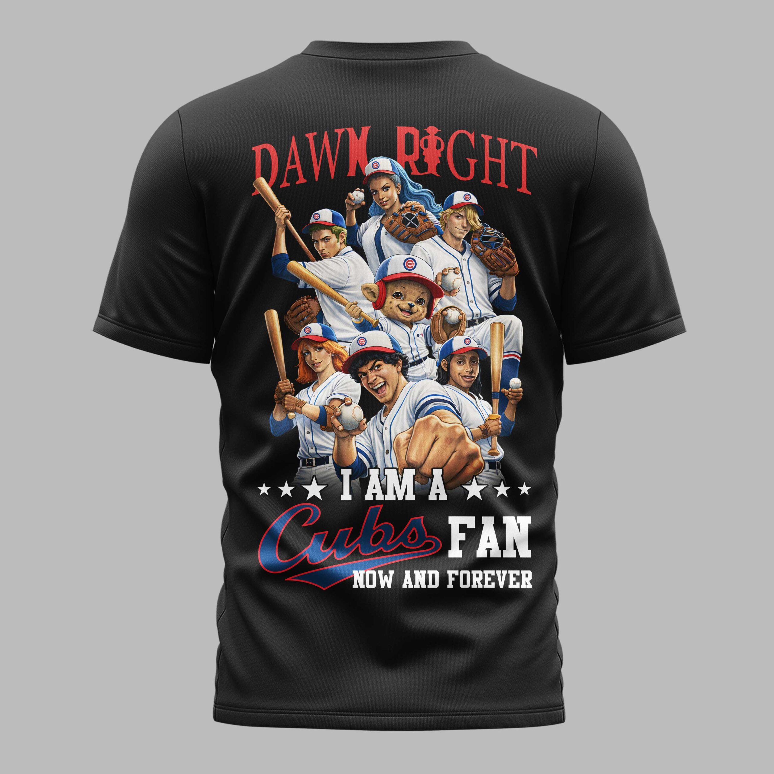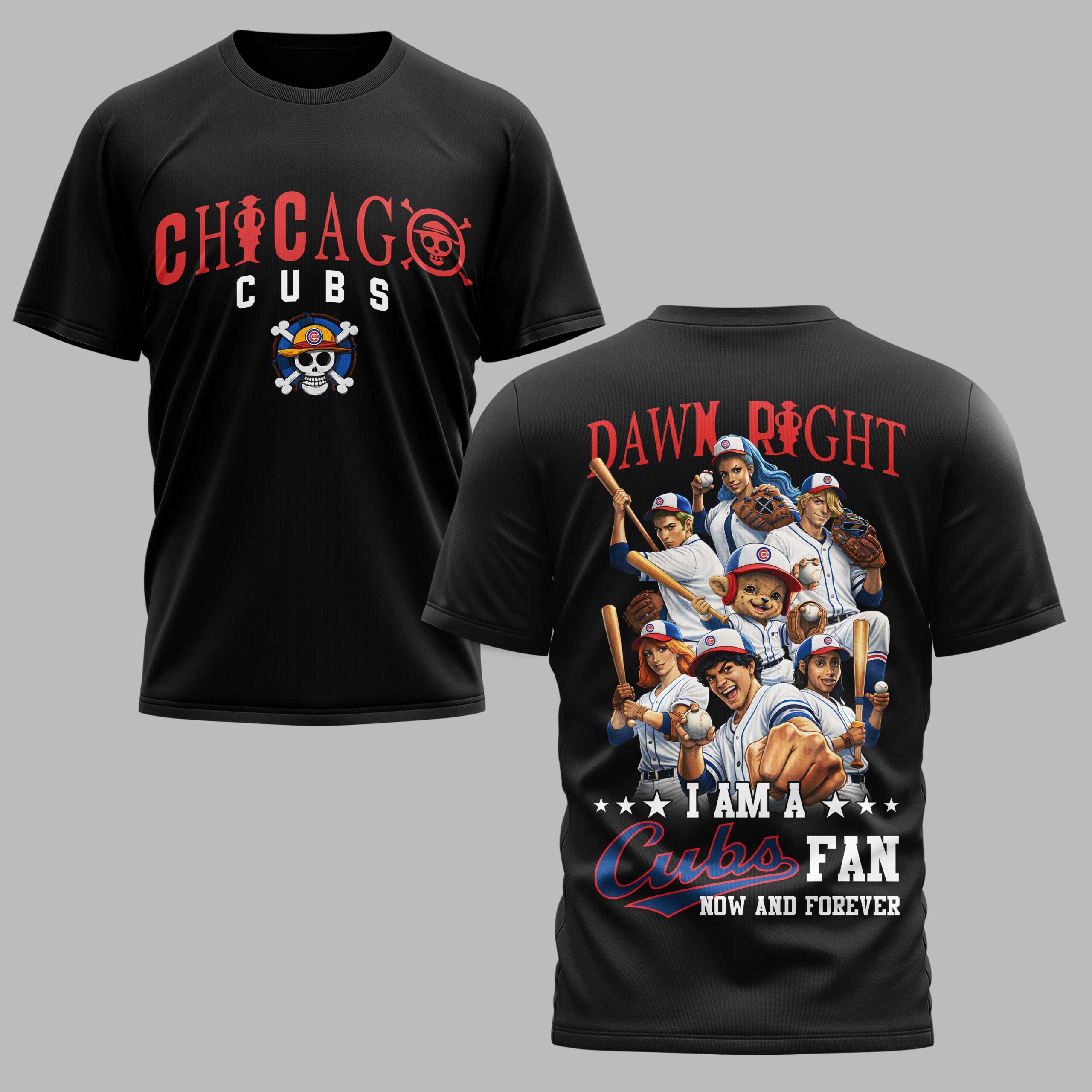 Show your unwavering loyalty with this spirited Chicago Cubs fan shirt! Ideal for game days or watching from home, this tee boldly captures the essence of a devoted Cubbies supporter, making a clear statement about your lasting team pride. The front displays CHICAGO CUBS in red and white, alongside a skull and crossbones graphic with a Cubs-themed cap. The back features a detailed illustration of diverse fans and players in classic Cubs gear. Above them, DAWN RIGHT (or DAMN RIGHT) in red leads to I AM A ⭐⭐⭐ CUBS FAN NOW AND FOREVER, proclaiming your dedication. Perfect for cheering at Wrigley Field, watch parties, or casual wear. This shirt is a badge of honor for anyone who lives and breathes Chicago Cubs baseball. Grab yours and let your team spirit shine!