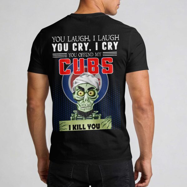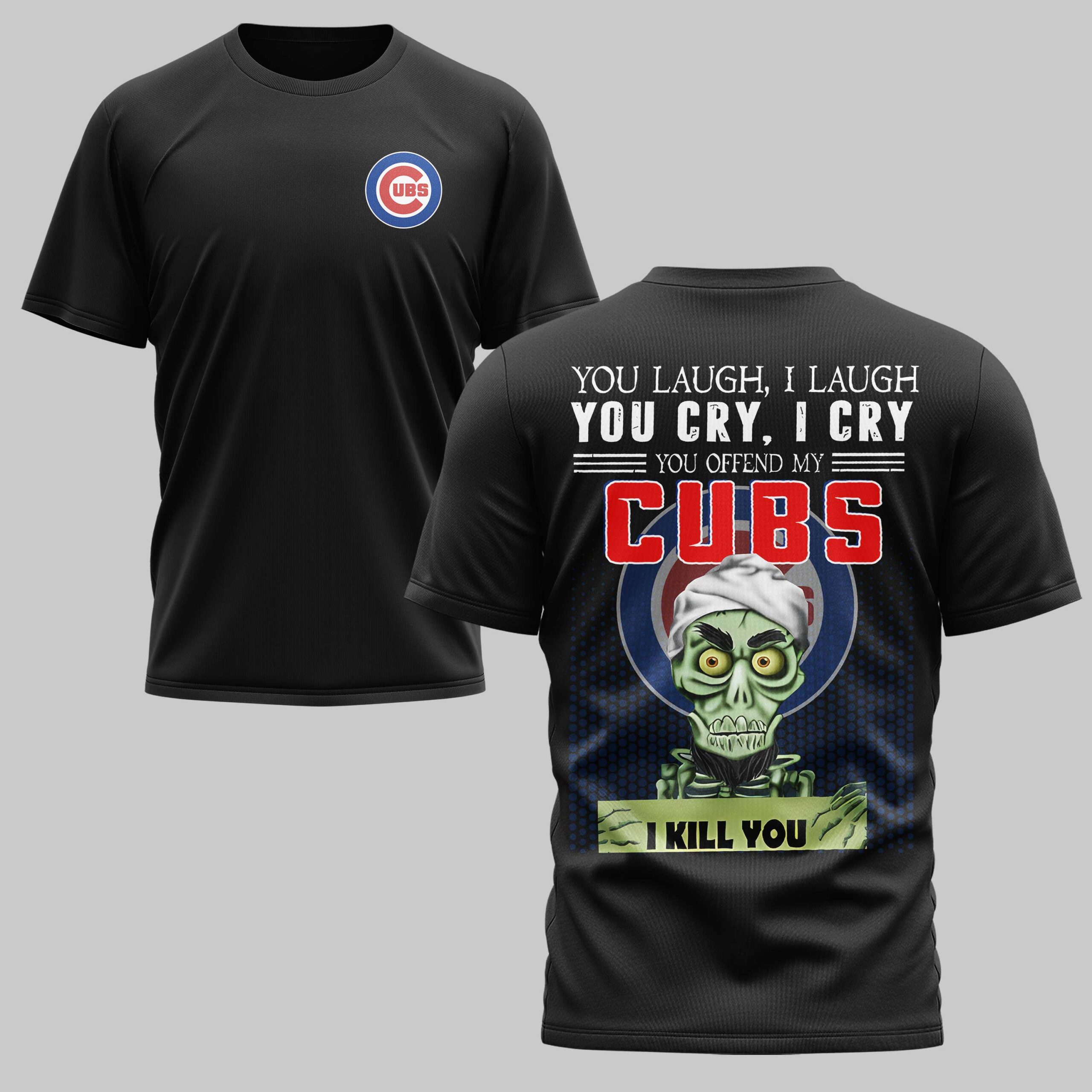 Show off your Chicago loyalty with a piece that honors the deep-rooted American tradition of the game. This shirt is designed for die-hard fans who want to blend their unwavering Cubs pride with a bold patriotic spirit, celebrating the legacy of one of baseball’s most iconic franchises. It is the perfect way to represent the North Side while honoring the national pastime. The design features a classic Chicago Cubs logo on the front chest for a sharp look. The back makes a loud statement with a detailed skeleton character graphic and humorous text that reads, You offend my Cubs, I kill you, layered over a large team crest. It’s a bold way to show everyone you’re a serious member of the faithful. This versatile tee is perfect for cheering at the ballpark or showing your colors during Independence Day festivities. It’s a standout choice for game day or everyday fan wear, letting you carry your team spirit and American pride wherever you go.