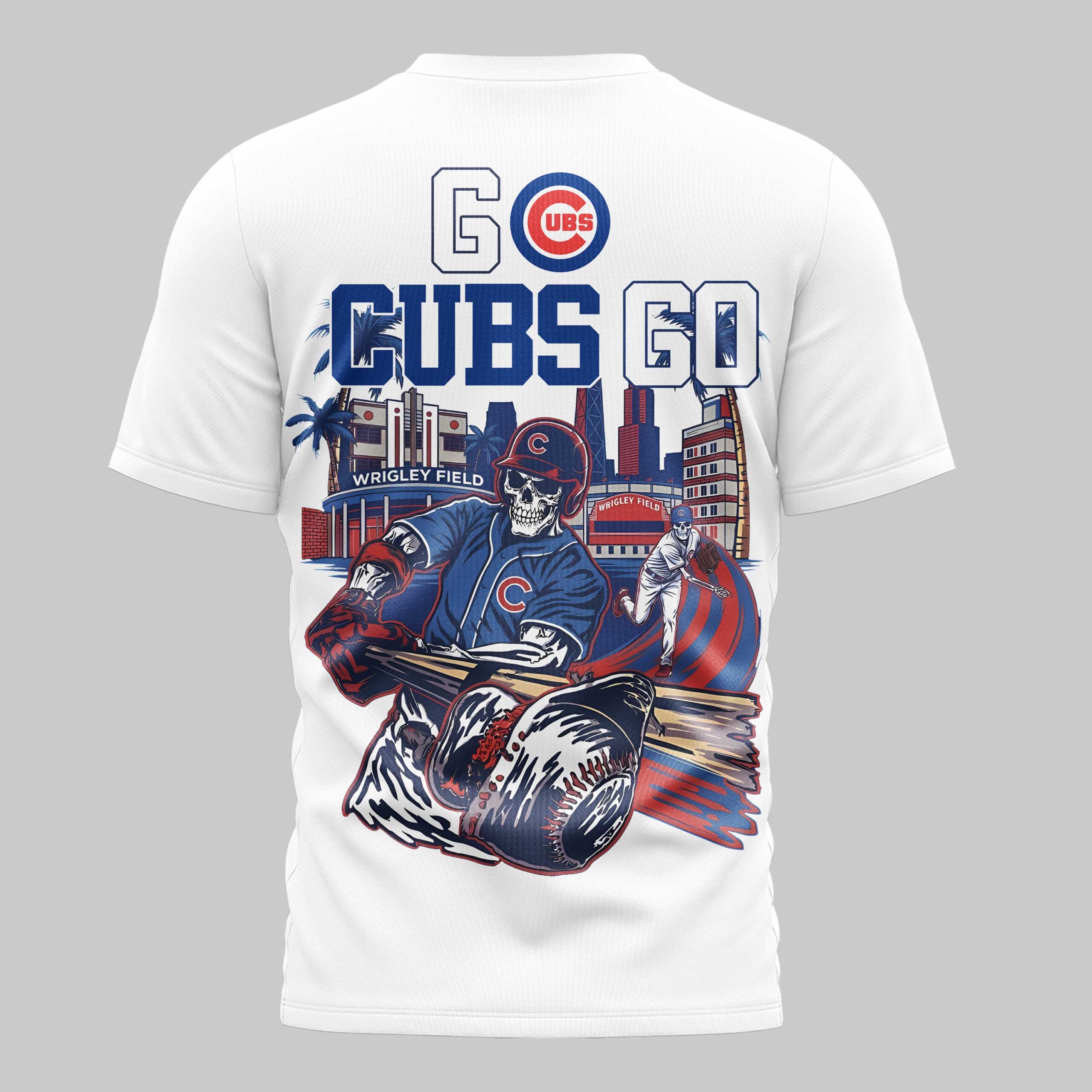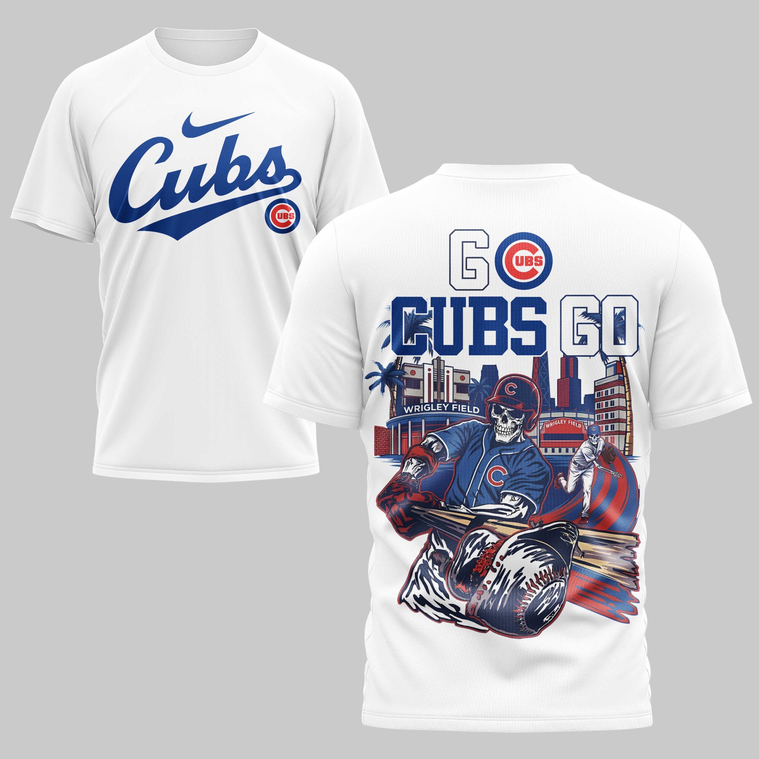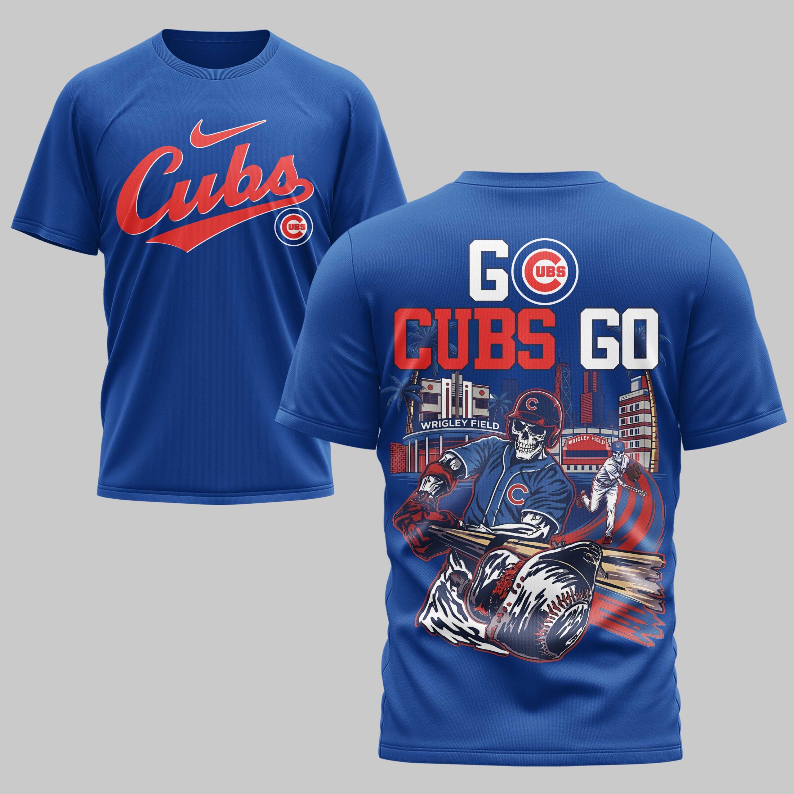 Unleash your ultimate team spirit with this dynamic Chicago Cubs t-shirt! Perfect for the dedicated fan, this tee captures the electrifying energy of game day, celebrating your beloved Cubs with a unique, bold artistic flair. Show your unwavering loyalty and passion for Chicago baseball. The front features the timeless red script Cubs logo, accented by a subtle Nike swoosh and the iconic circular UBS emblem, all set against a vibrant blue backdrop. Turn heads with the back design, screaming GO CUBS GO above a captivating illustration of skeleton baseball players in action at a stylized Wrigley Field, surrounded by city lights and palm trees. It’s a powerful tribute to both your team and your city. Whether you’re cheering from the bleachers at Wrigley, hosting a watch party, or simply showing off your Cubs pride around town, this shirt is a home run. It’s the perfect gear for any fan ready to rally their team to victory and make a statement with their game-day style.