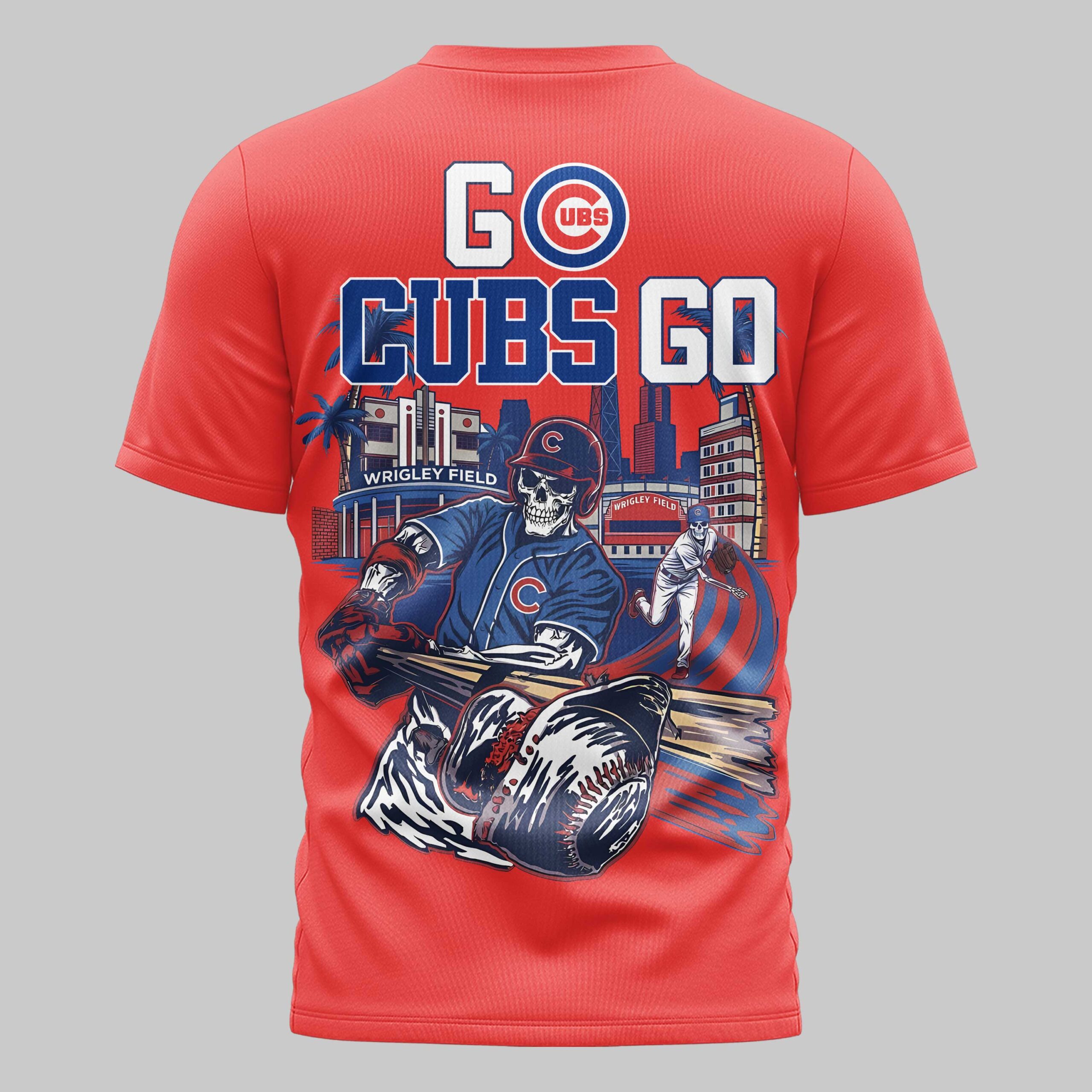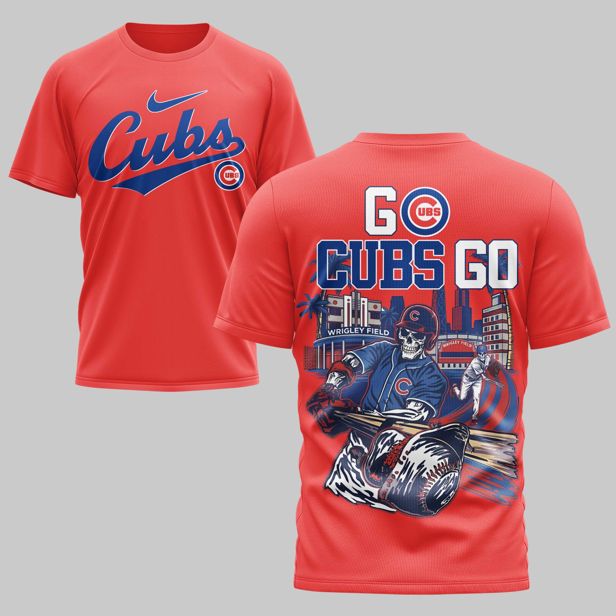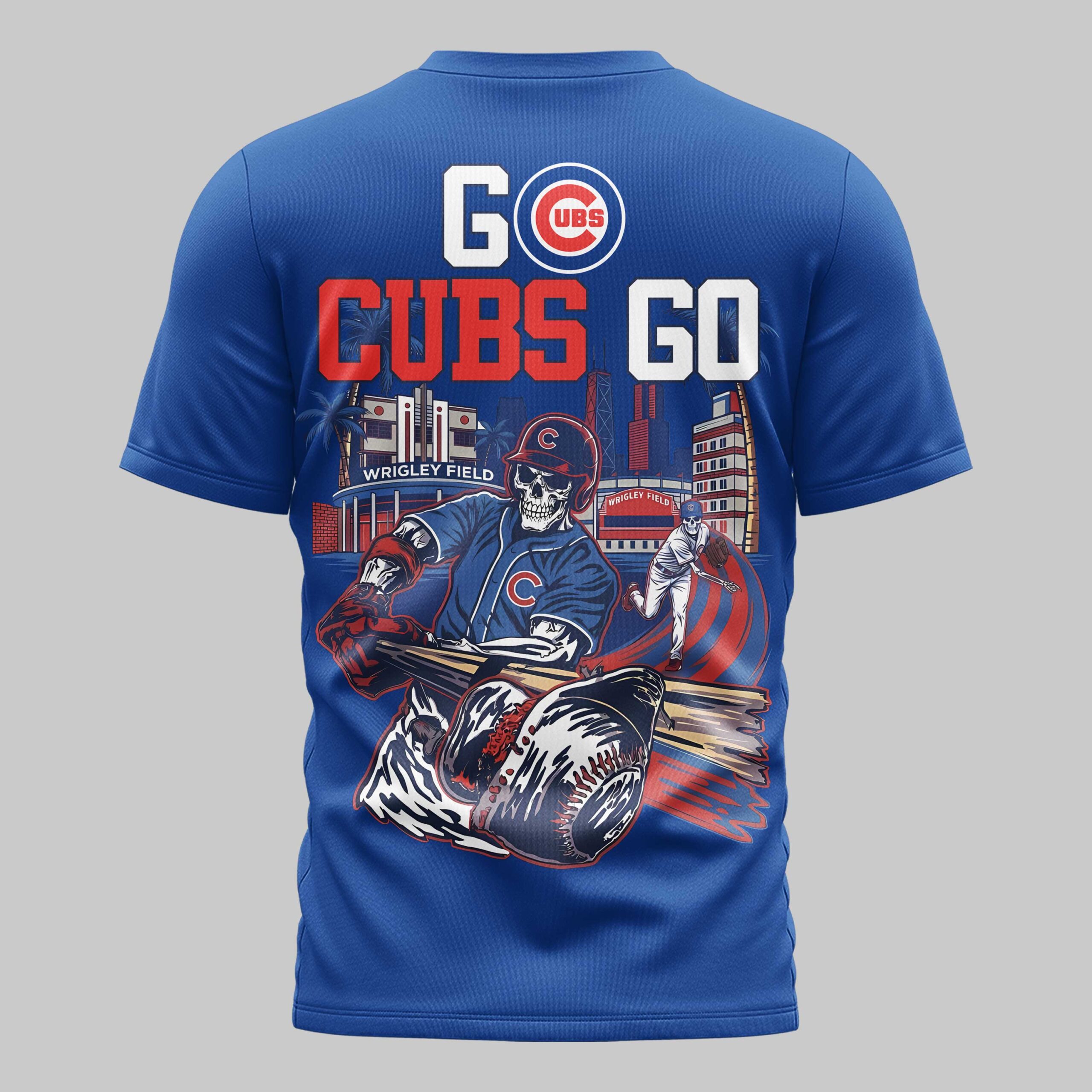 Unleash your ultimate team spirit with this dynamic Chicago Cubs t-shirt! Perfect for the dedicated fan, this tee captures the electrifying energy of game day, celebrating your beloved Cubs with a unique, bold artistic flair. Show your unwavering loyalty and passion for Chicago baseball. The front features the timeless red script Cubs logo, accented by a subtle Nike swoosh and the iconic circular UBS emblem, all set against a vibrant blue backdrop. Turn heads with the back design, screaming GO CUBS GO above a captivating illustration of skeleton baseball players in action at a stylized Wrigley Field, surrounded by city lights and palm trees. It’s a powerful tribute to both your team and your city. Whether you’re cheering from the bleachers at Wrigley, hosting a watch party, or simply showing off your Cubs pride around town, this shirt is a home run. It’s the perfect gear for any fan ready to rally their team to victory and make a statement with their game-day style.
