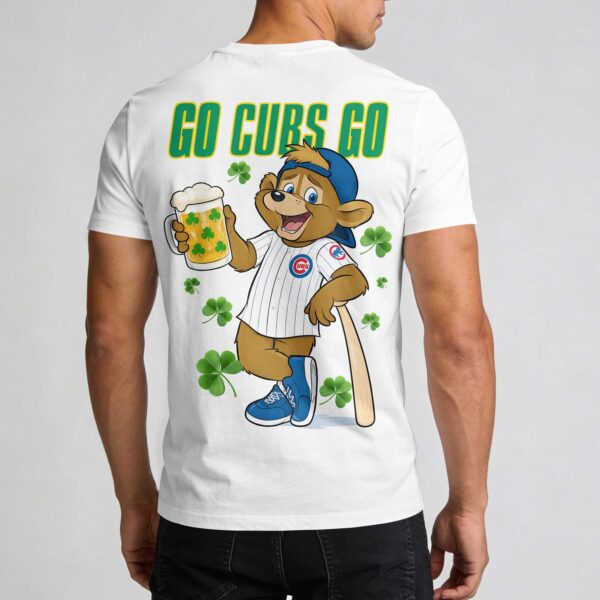 Get ready to celebrate St. Patrick’s Day with a double dose of team spirit in this festive Chicago Cubs tee! Perfect for fans who live for game day and love a bit of Irish luck, this shirt is your ultimate way to showcase your passion for the Cubs with a vibrant, holiday twist. The front of the shirt proudly features Cubs in a dynamic green script with yellow accents, accompanied by the iconic circular UBS logo. The back comes alive with a charming cartoon bear mascot, decked out in a full Cubs uniform and cap, holding a baseball bat and a frothy mug of green beer adorned with lucky shamrocks. GO CUBS GO is boldly emblazoned above the cheerful bear, surrounded by scattered green clovers. This spirited shirt is ideal for cheering on the Cubs at the ballpark, joining St. Patrick’s Day festivities, or simply adding a fun, spirited touch to your everyday wear. It’s a perfect blend of baseball pride and holiday cheer, ensuring you stand out in the crowd while supporting your favorite team!