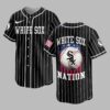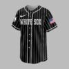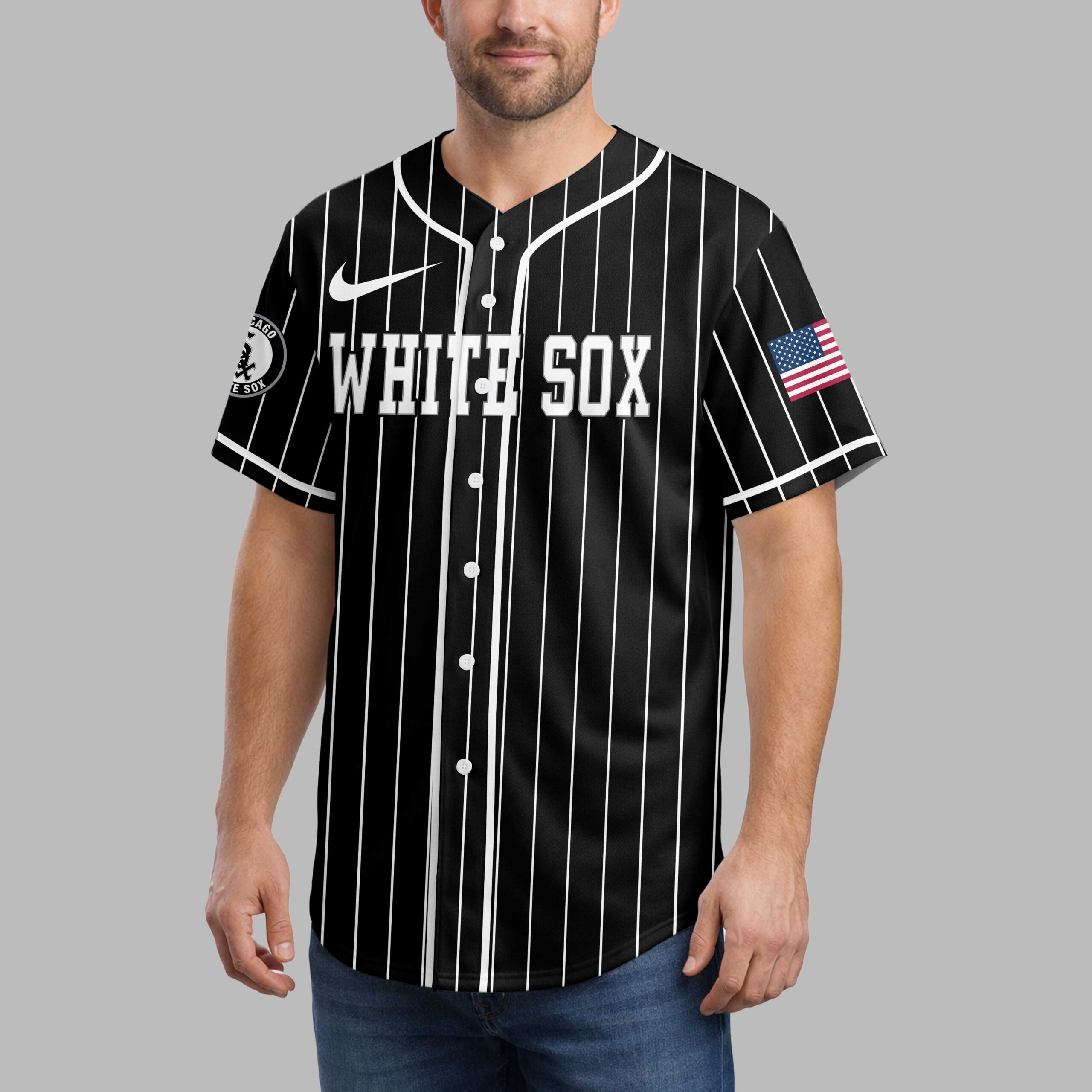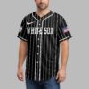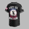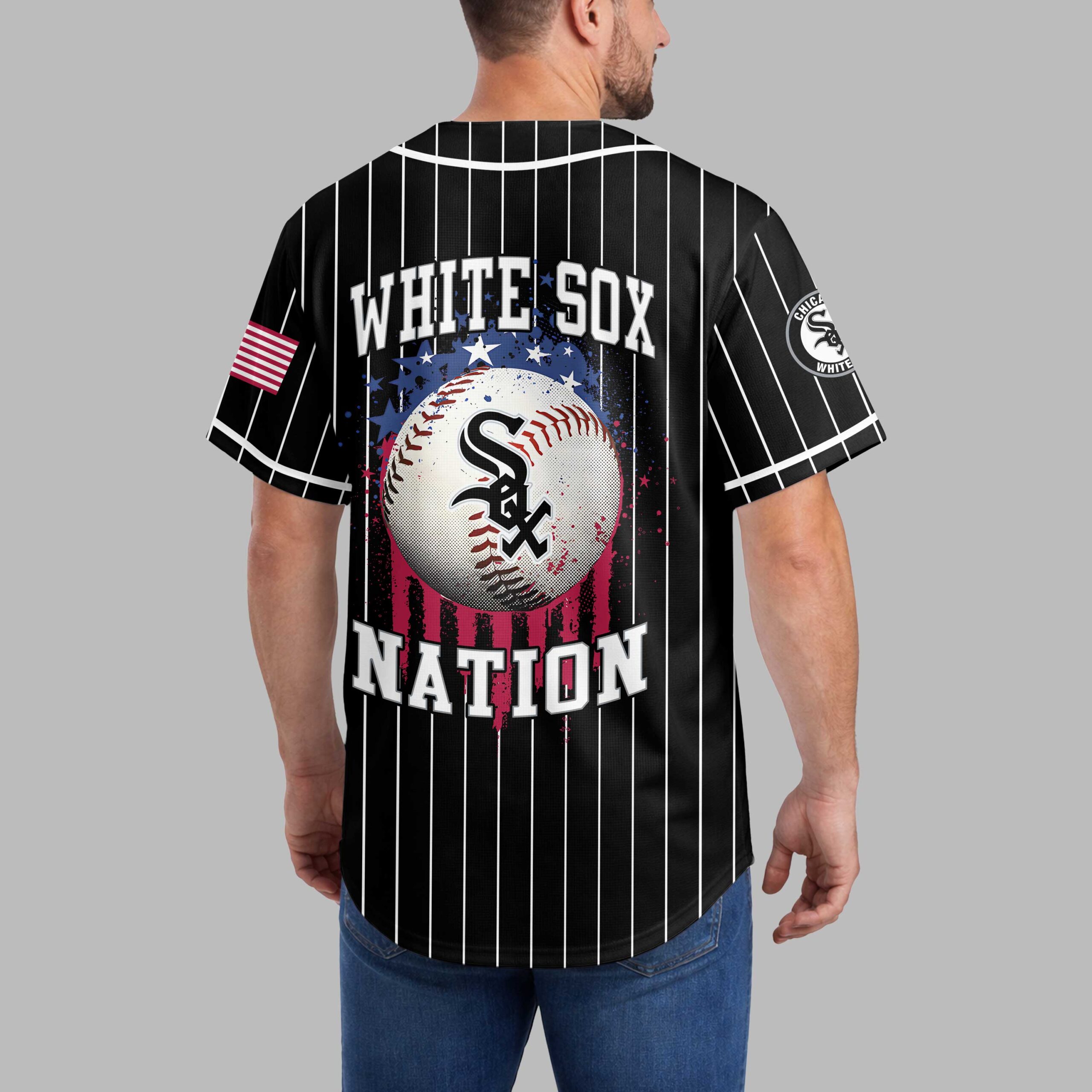 Display your Chicago White Sox loyalty with this spirited pinstripe baseball jersey! It’s the perfect blend of classic team pride and patriotic fervor for devoted fans to represent their beloved team and country. The front features WHITE SOX in white lettering on black pinstripes, with the team logo on the sleeve. The back makes a powerful statement: a baseball with the SOX emblem over a distressed American flag, accented with red, white, and blue paint splatters. WHITE SOX NATION is boldly displayed, completing the patriotic design. Wear this distinctive jersey to the ballpark, national celebrations, or everyday. It’s the ultimate way to showcase your White Sox passion and national pride with undeniable style.