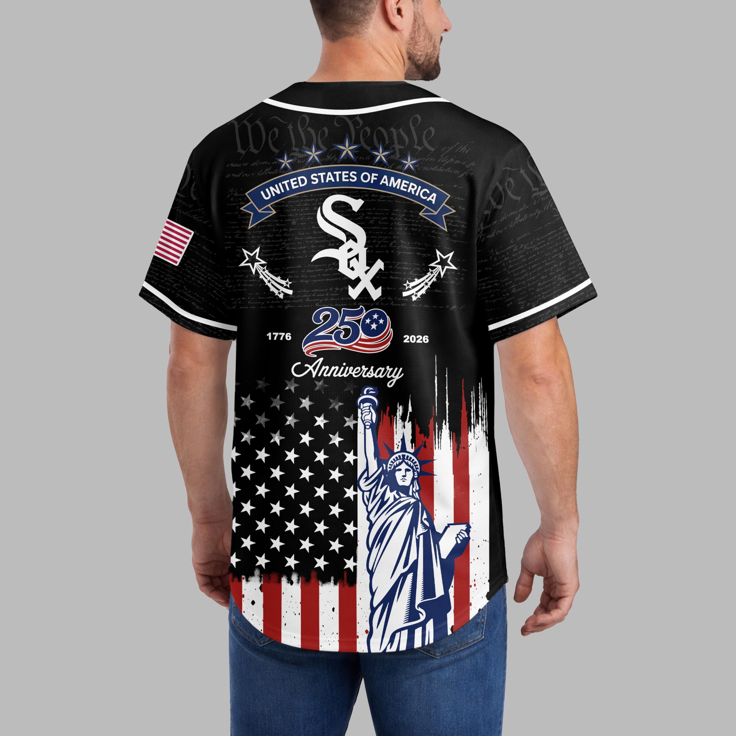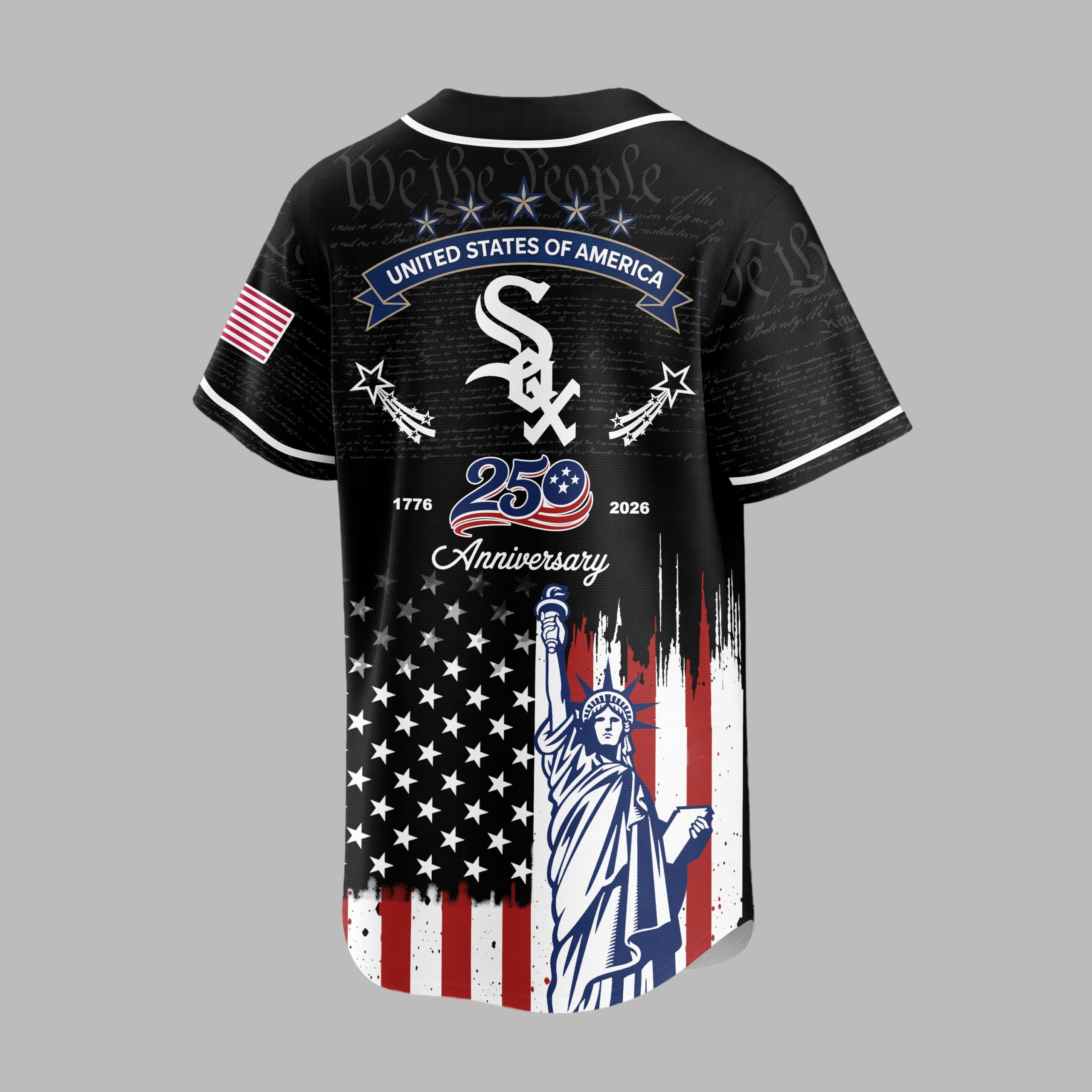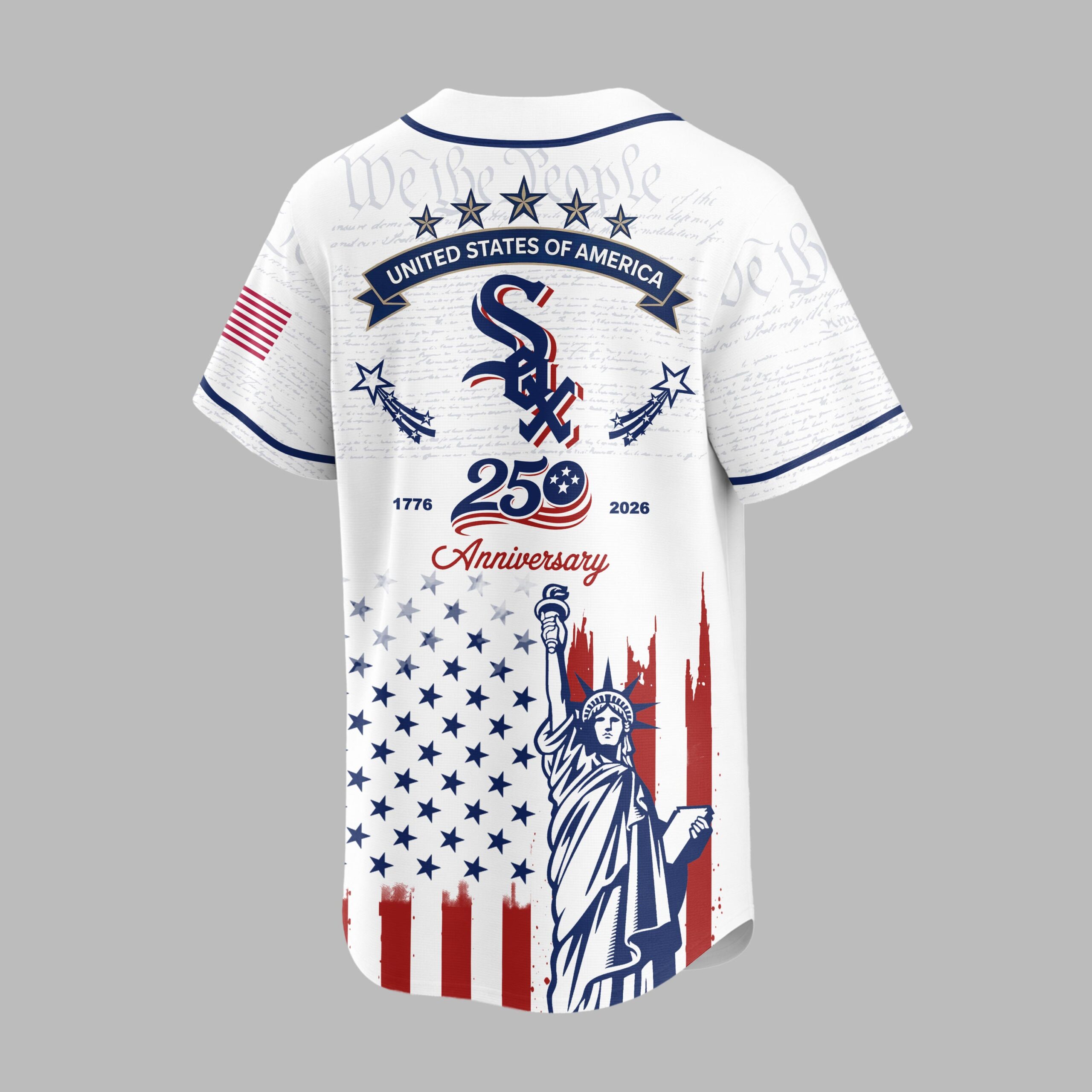 Embrace your dual passion for the White Sox and the USA with this patriotic baseball jersey! Commemorating a special 250th anniversary, this design brilliantly merges team loyalty with national heritage. It’s the ultimate statement for fans. The front displays White Sox and the iconic Sox logo over subtle We the People text, with a distressed American flag and Statue of Liberty below. The back features an American flag patch, STATES OF AMERICA banner, and the Sox logo, highlighting 1776 250 Anniversary 2026 seamlessly flowing into the matching patriotic flag and Statue of Liberty graphic. Ideal for gamedays, Fourth of July, Memorial Day, or any event to proudly display your spirit. This jersey lets you honor both the game and the nation, an essential piece for ultimate pride.