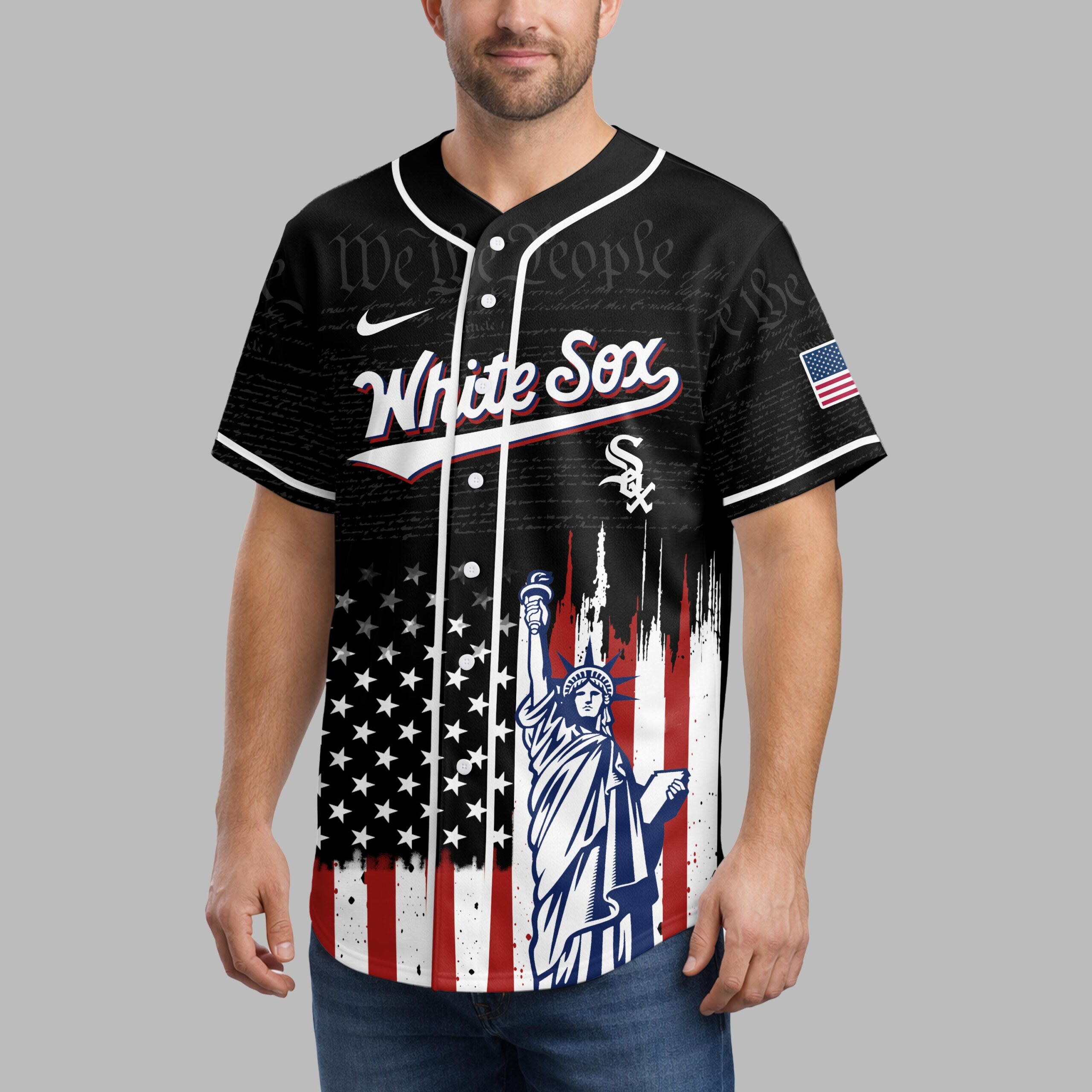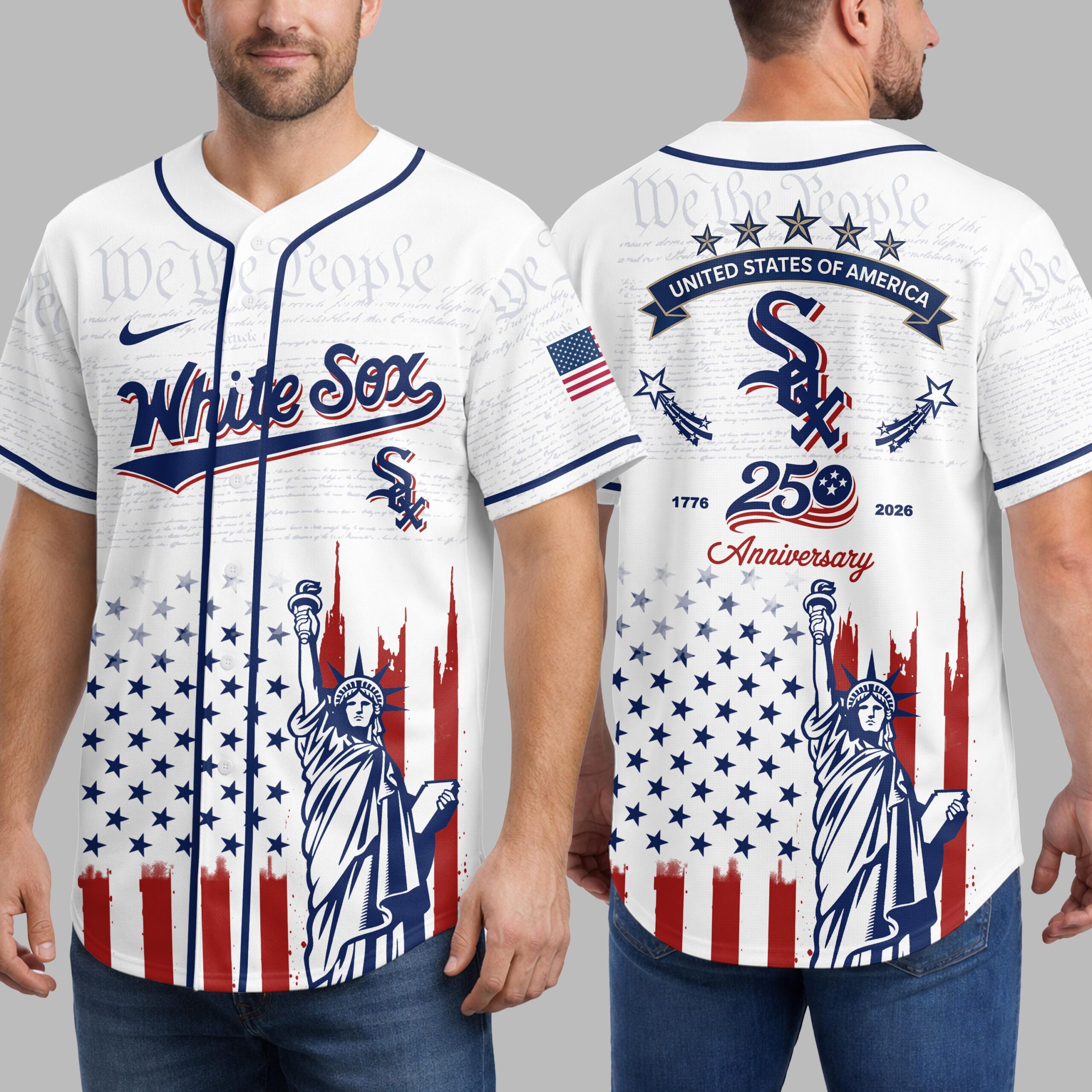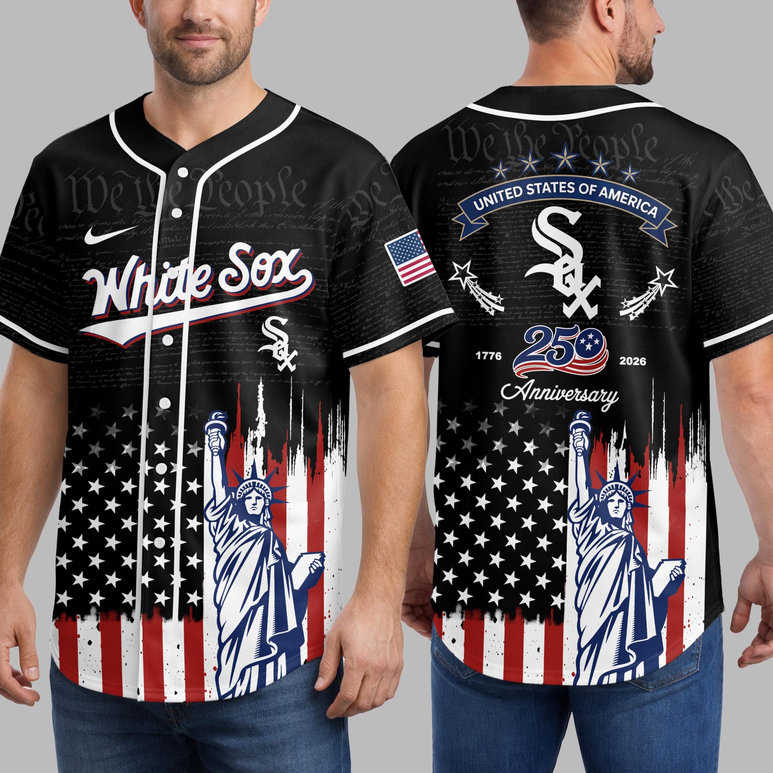 Embrace your dual passion for the White Sox and the USA with this patriotic baseball jersey! Commemorating a special 250th anniversary, this design brilliantly merges team loyalty with national heritage. It’s the ultimate statement for fans. The front displays White Sox and the iconic Sox logo over subtle We the People text, with a distressed American flag and Statue of Liberty below. The back features an American flag patch, STATES OF AMERICA banner, and the Sox logo, highlighting 1776 250 Anniversary 2026 seamlessly flowing into the matching patriotic flag and Statue of Liberty graphic. Ideal for gamedays, Fourth of July, Memorial Day, or any event to proudly display your spirit. This jersey lets you honor both the game and the nation, an essential piece for ultimate pride.
