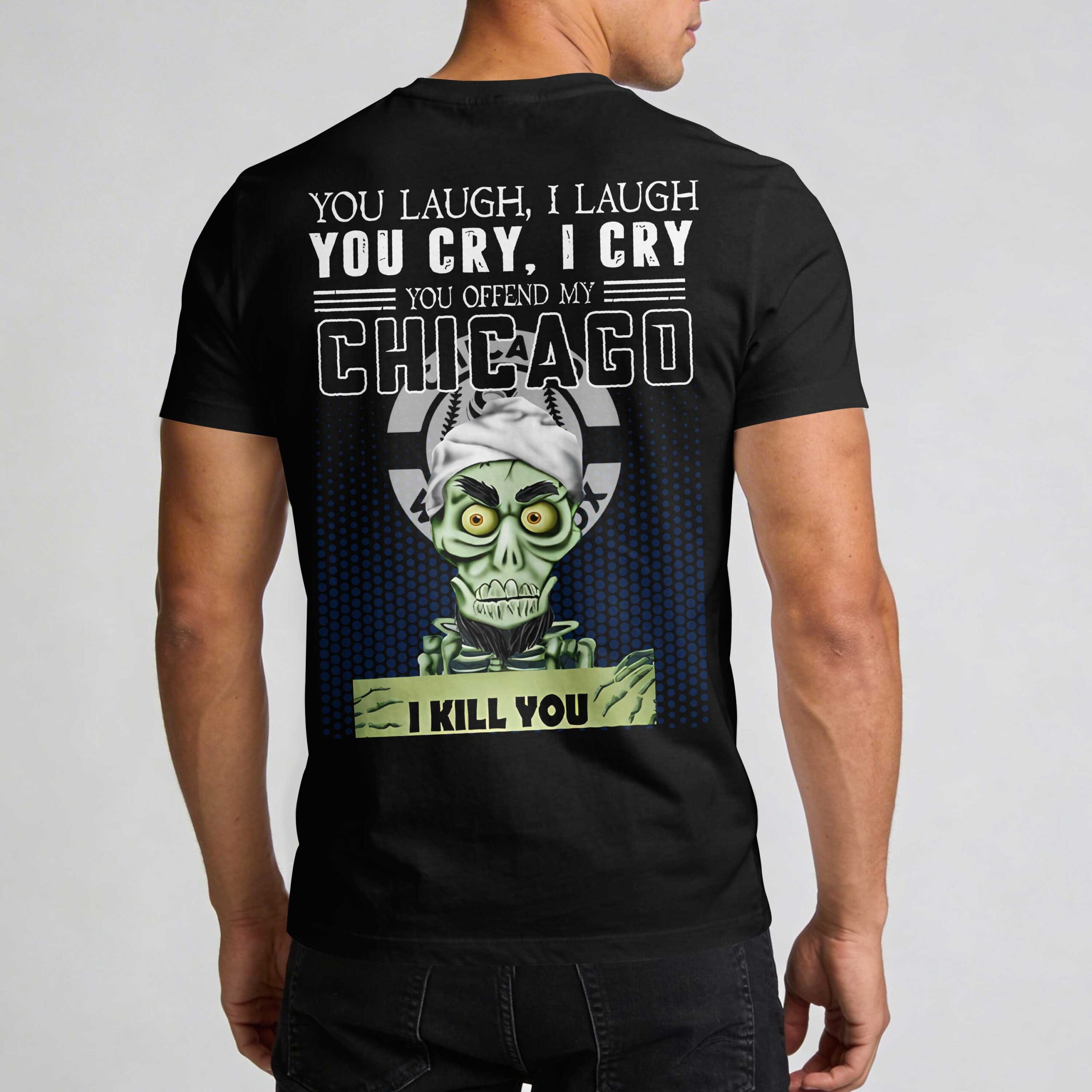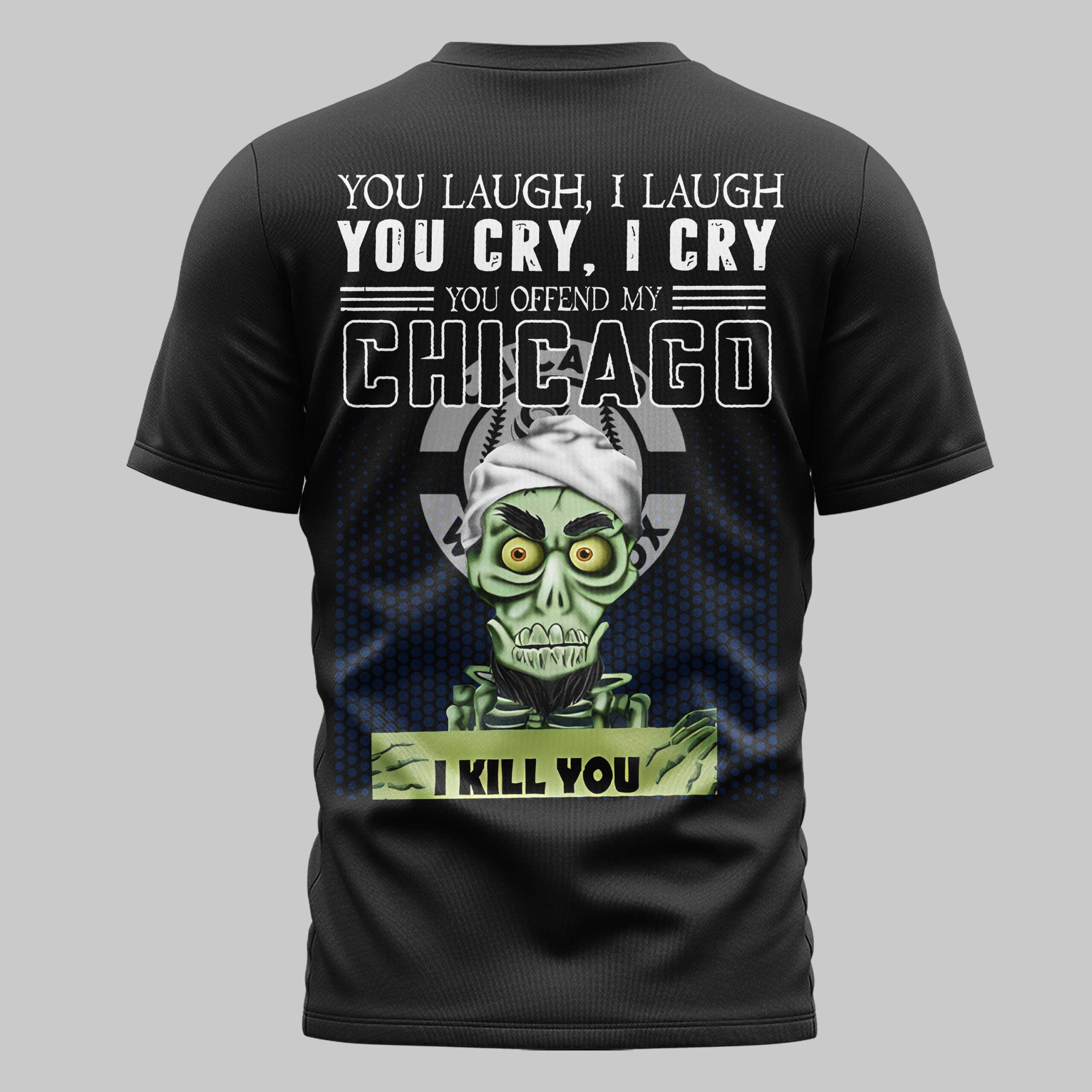 Show your unwavering allegiance to the Chicago White Sox with a bold statement that leaves no doubt! This striking tee is for the fan who lives and breathes White Sox baseball, offering a blend of fierce loyalty and a touch of dark humor that truly sets you apart from the crowd. The front proudly displays the iconic White Sox Sox logo, subtle yet instantly recognizable. The back explodes with personality, featuring a ghoulish green zombie wearing a baseball cap and holding a sign that reads I KILL YOU, all set against a baseball-stitched background. Above this unique character, the powerful text declares: YOU LAUGH, I LAUGH YOU CRY, I CRY YOU OFFEND MY CHICAGO I KILL YOU. Perfect for game days at Guaranteed Rate Field, spirited watch parties, or simply making a statement around town, this shirt is ideal for showing off your uncompromising Chicago White Sox pride. Wear it to express your passion and let everyone know where your loyalties lie.
