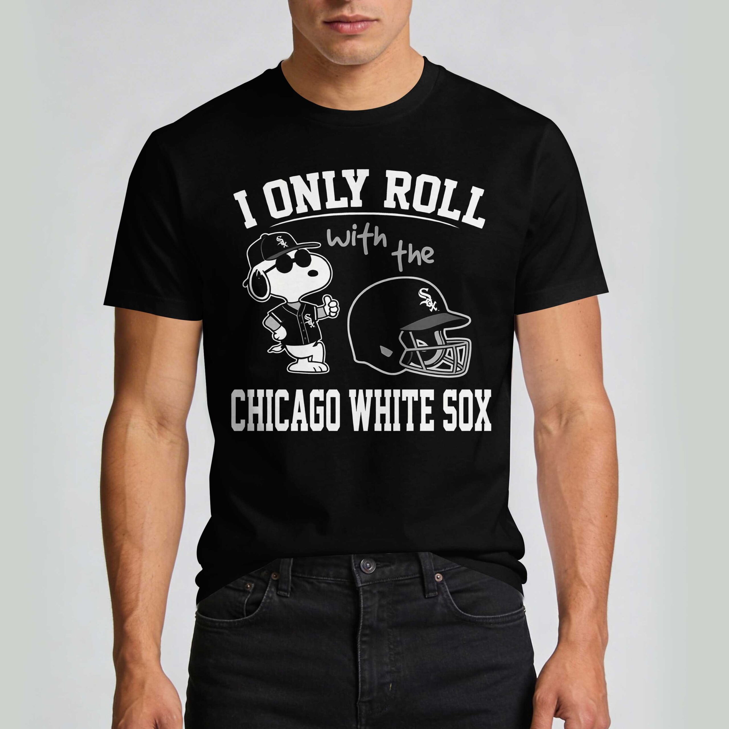 Declare your ultimate loyalty to the Chicago White Sox with this energetic fan t-shirt! It’s the perfect way to combine your passion for baseball with a beloved classic character, showcasing your team spirit in a fun and stylish way. This tee is designed for every dedicated fan who lives and breathes South Side baseball. The front of this bold black shirt features an iconic design: Snoopy, looking cool in a Chicago White Sox cap and jersey, giving a confident thumbs-up. Beside him, a classic baseball helmet proudly displays the famous SOX logo. The clear, impactful text, I ONLY ROLL with the CHICAGO WHITE SOX, leaves no doubt about where your allegiance lies. Ideal for cheering on your team at Guaranteed Rate Field, gathering with fellow fans for a watch party, or simply representing your favorite MLB squad every day. This shirt is a must-have for showcasing your unwavering White Sox pride at any casual occasion or game-day event.