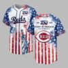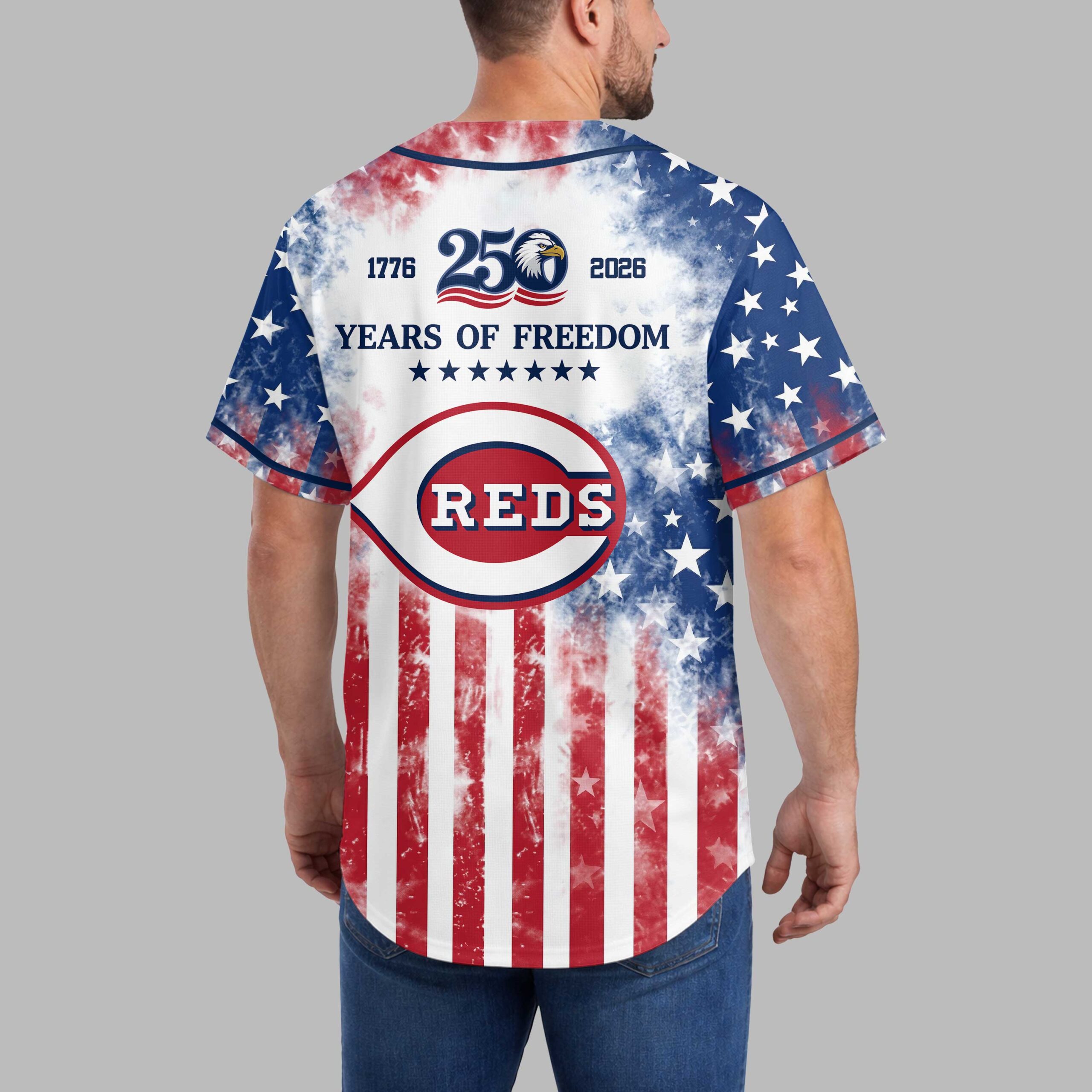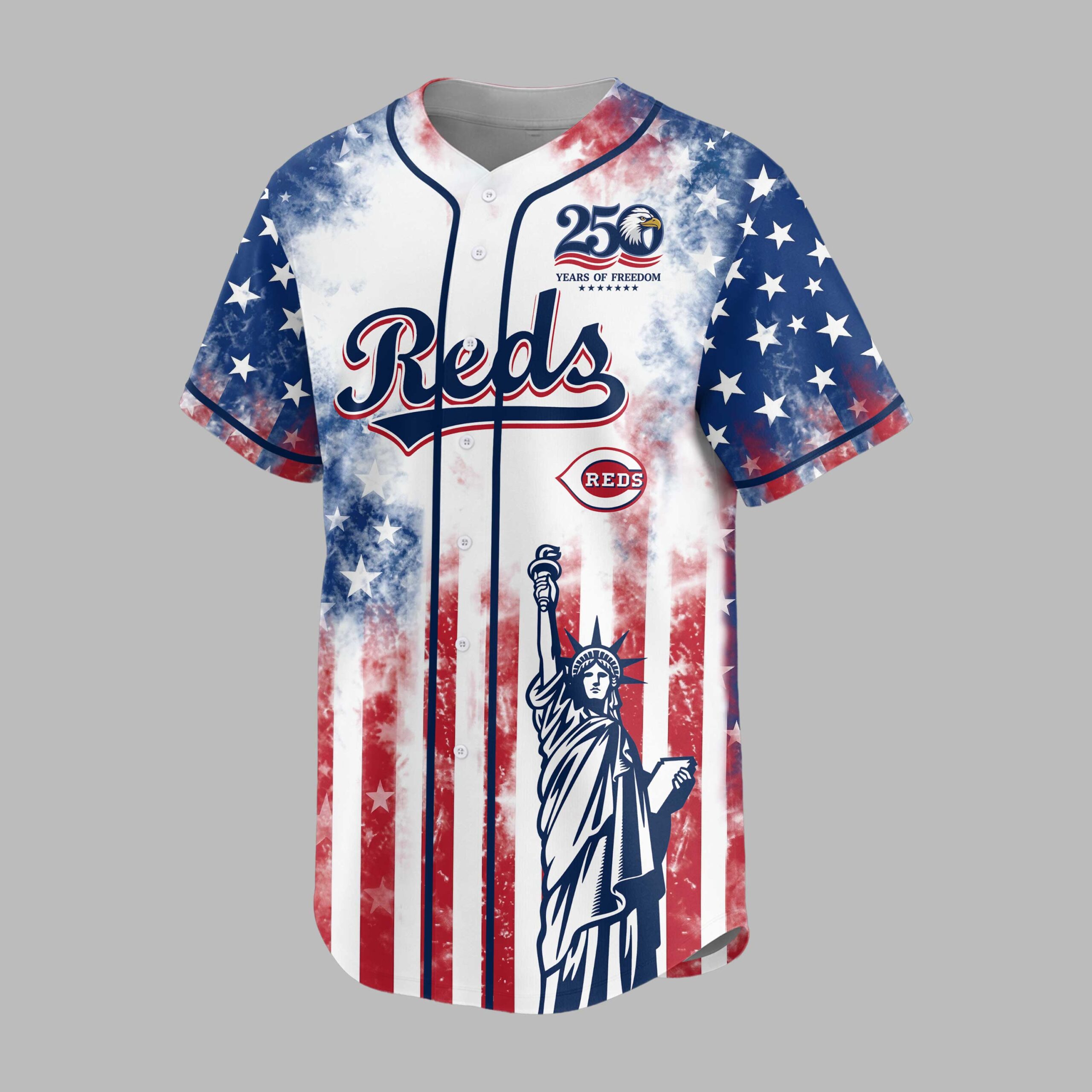 Show your Cincinnati Reds pride and celebrate 250 years of American freedom with this striking patriotic baseball jersey! It’s the perfect way to blend your love for America’s favorite pastime with a deep appreciation for the nation’s enduring liberty. The front features the classic Reds script, the C team logo, and the majestic Statue of Liberty, all over a dynamic, distressed American flag of stars and stripes. 250 Years of Freedom is boldly displayed. The back echoes this vibrant theme with the C Reds logo and prominent 1776 250 2026 YEARS OF FREEDOM text, accented by an eagle graphic. Ideal for cheering on the Reds, celebrating national holidays like the Fourth of July or Memorial Day, or simply expressing your American spirit. This jersey ensures you make a bold statement of loyalty and patriotism.